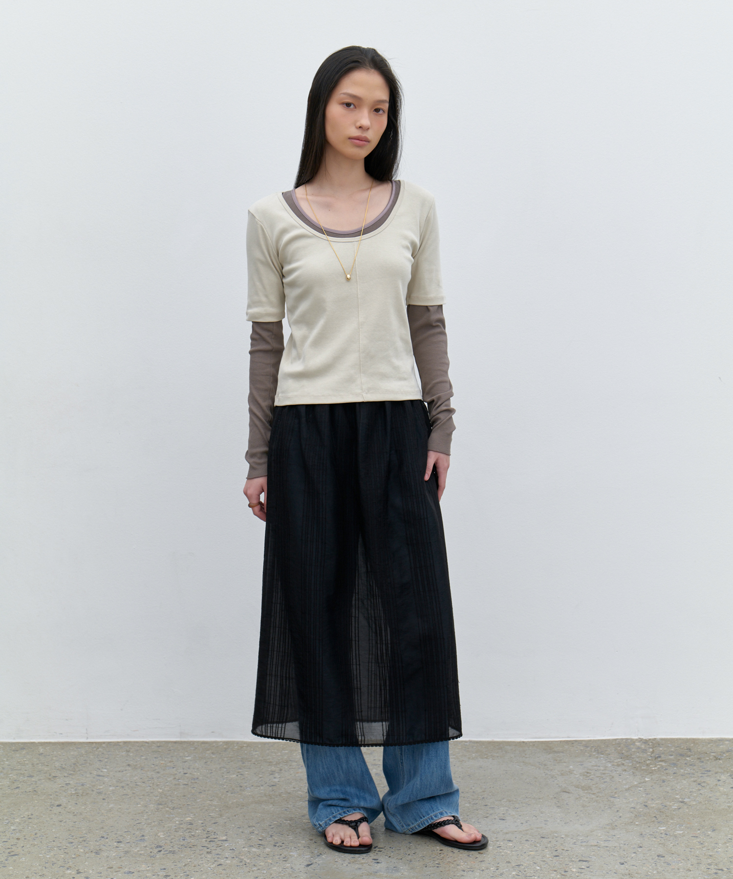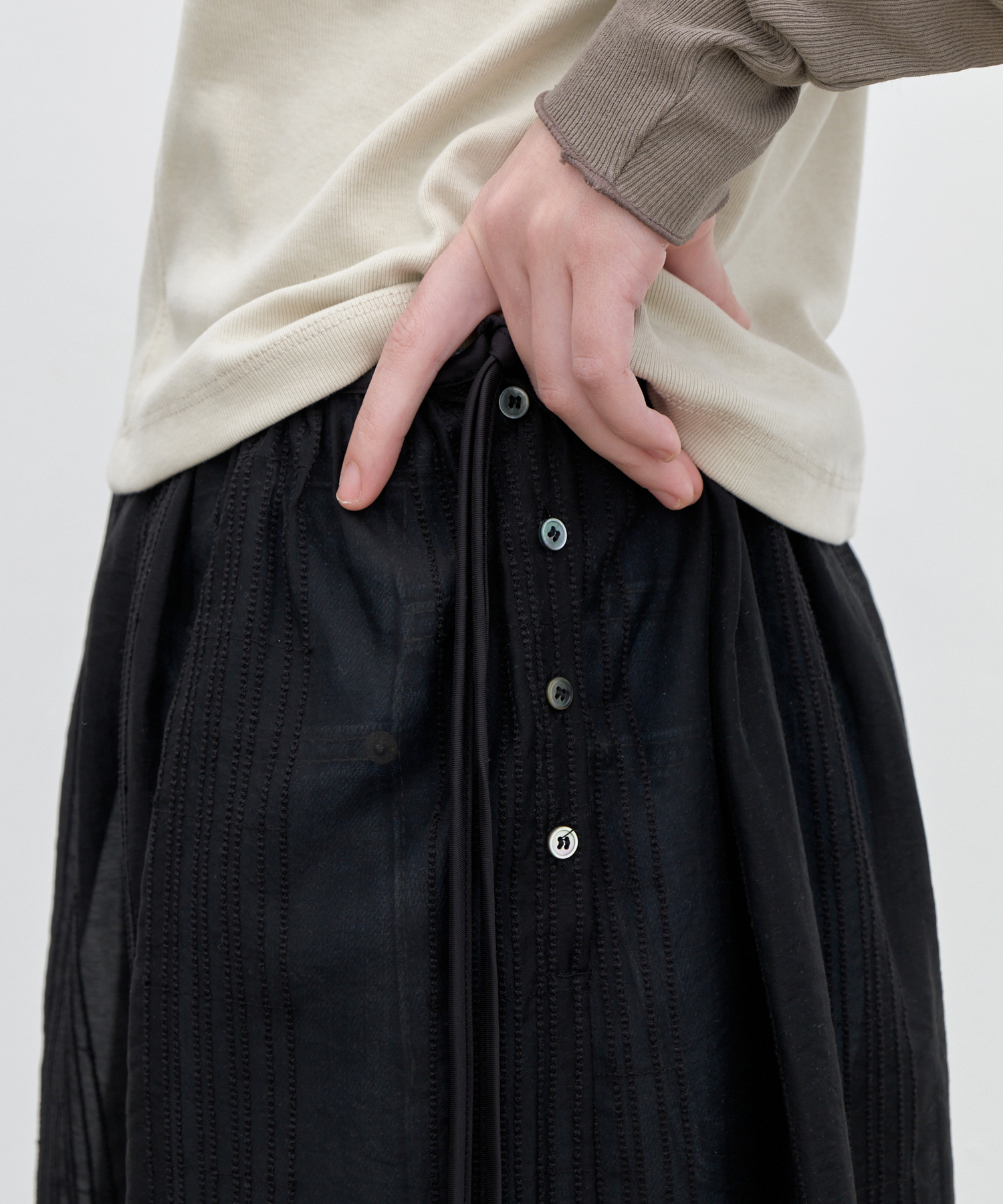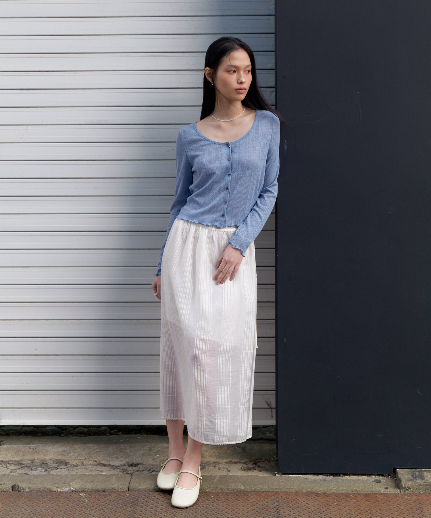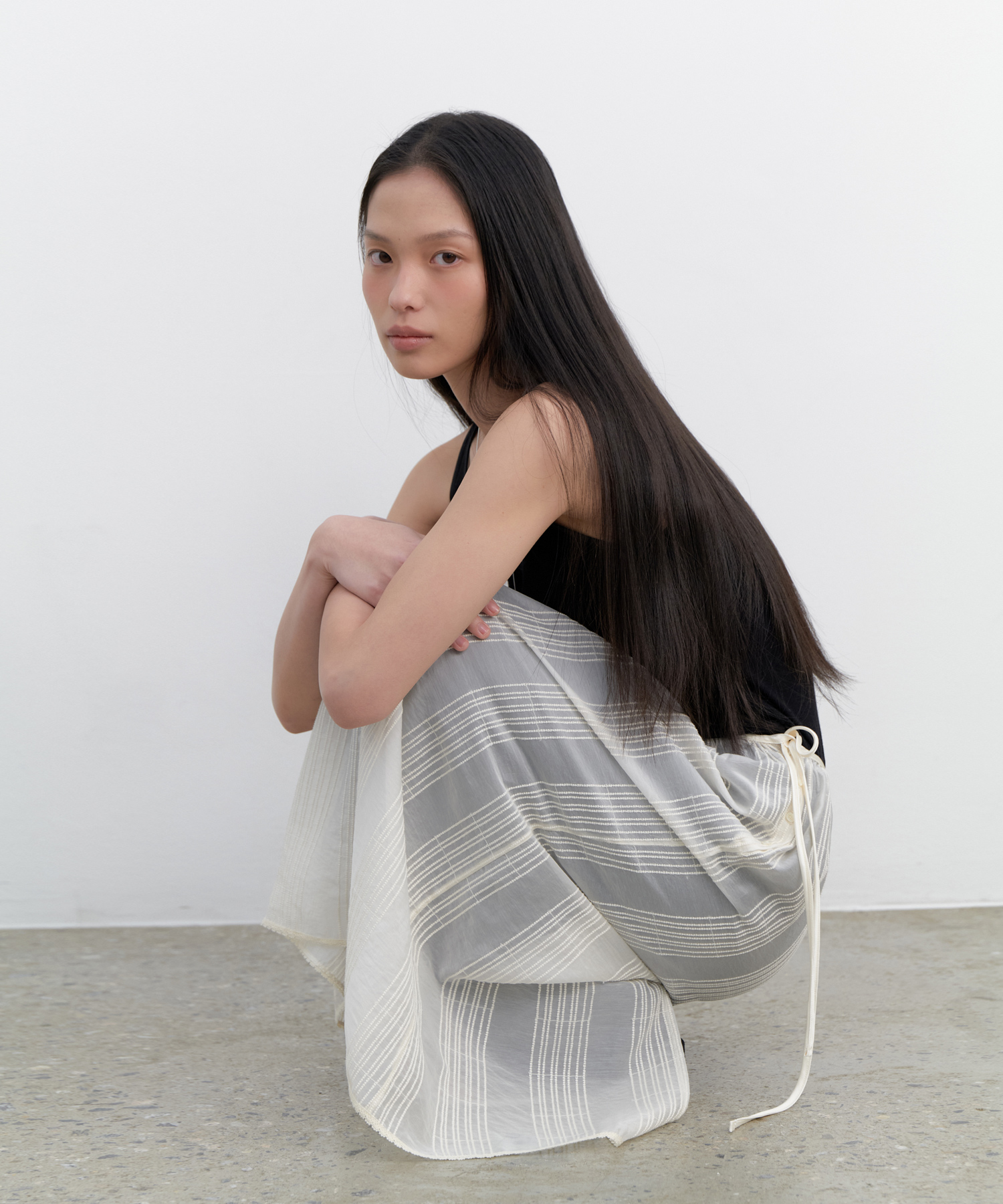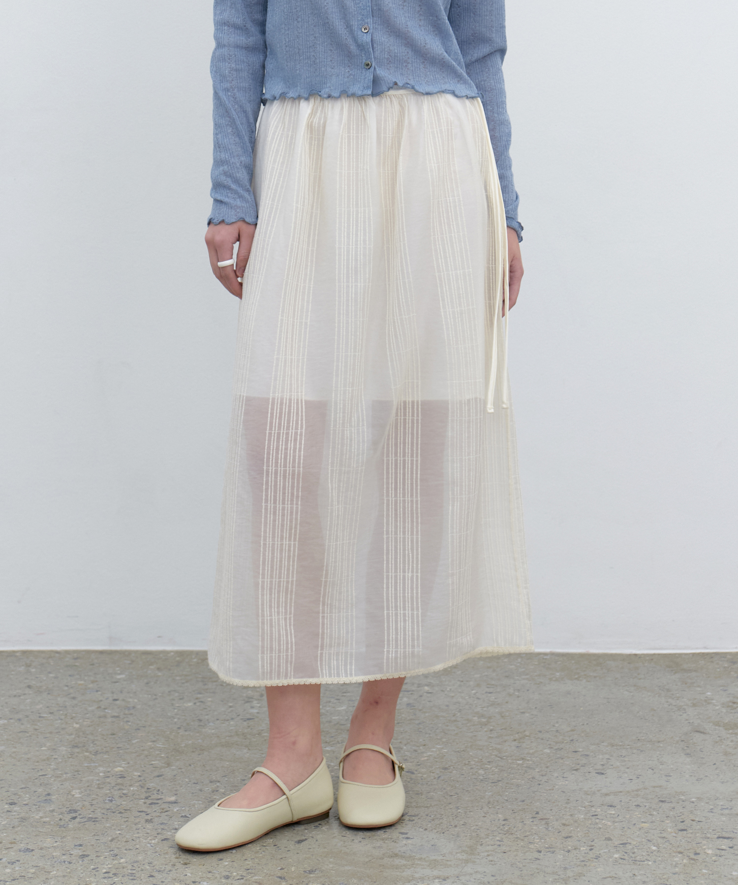 コットン混紡ジャカード素材で製作されたスカートです。 規則的な縦ストライプディテールが引き立てられ、軽くて薄い生地でシースを活用したレイヤードスタイリングが可能です。ナチュラルなシアーなスカートで演出でき、シルキーな生地特有のほのかな光沢感がお洒落な雰囲気を加えてくれます。 ウエストにはストラップを加えて様々なスタイリングが可能になるようにデザインしました。