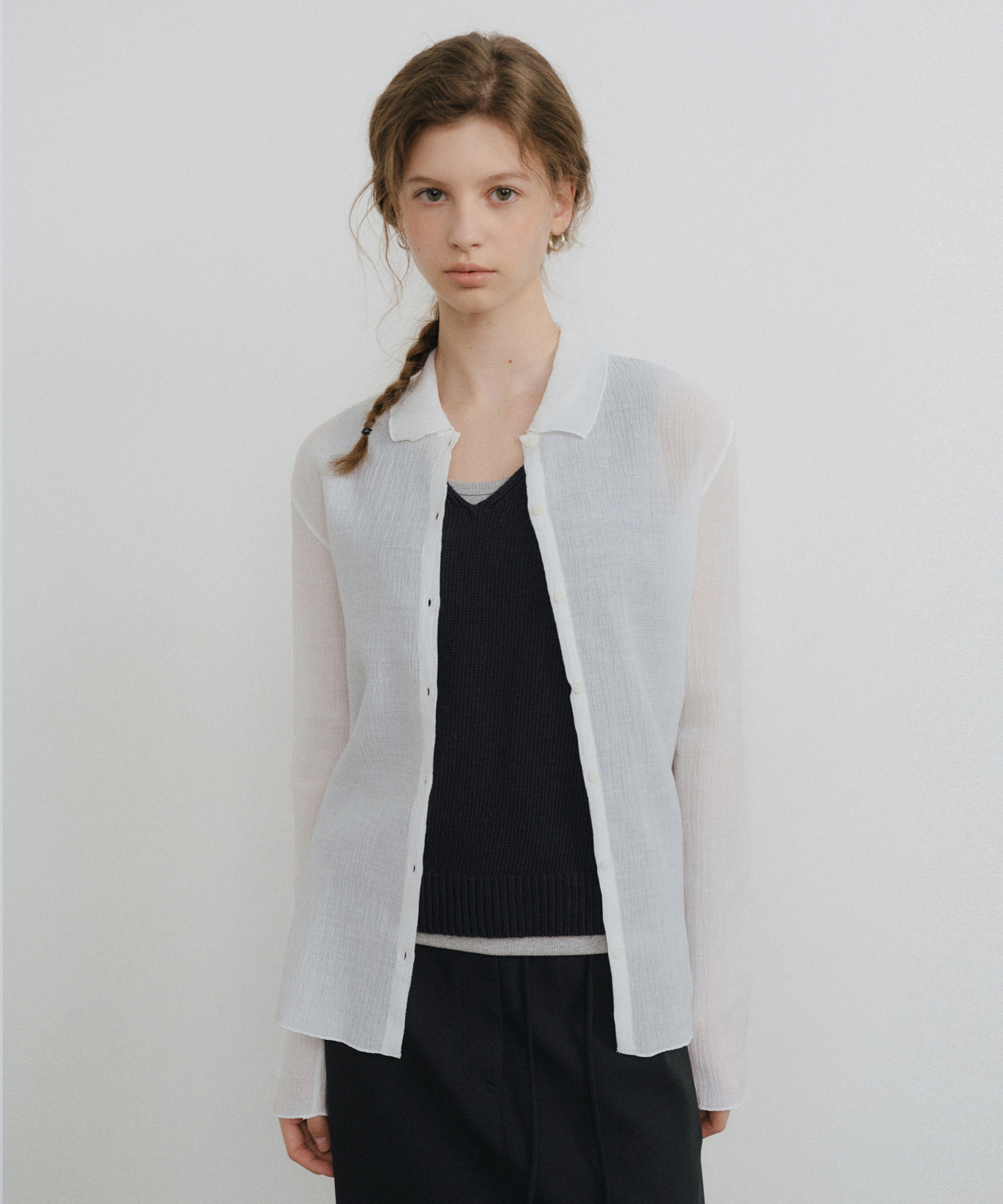 薄くて軽い生地で透け感があり、立体的なシワが入った独特のテクスチャのブラウスです。曲げが魅力的な刺繍ディテールで仕上げられ、自然なウェーブが形成されます。