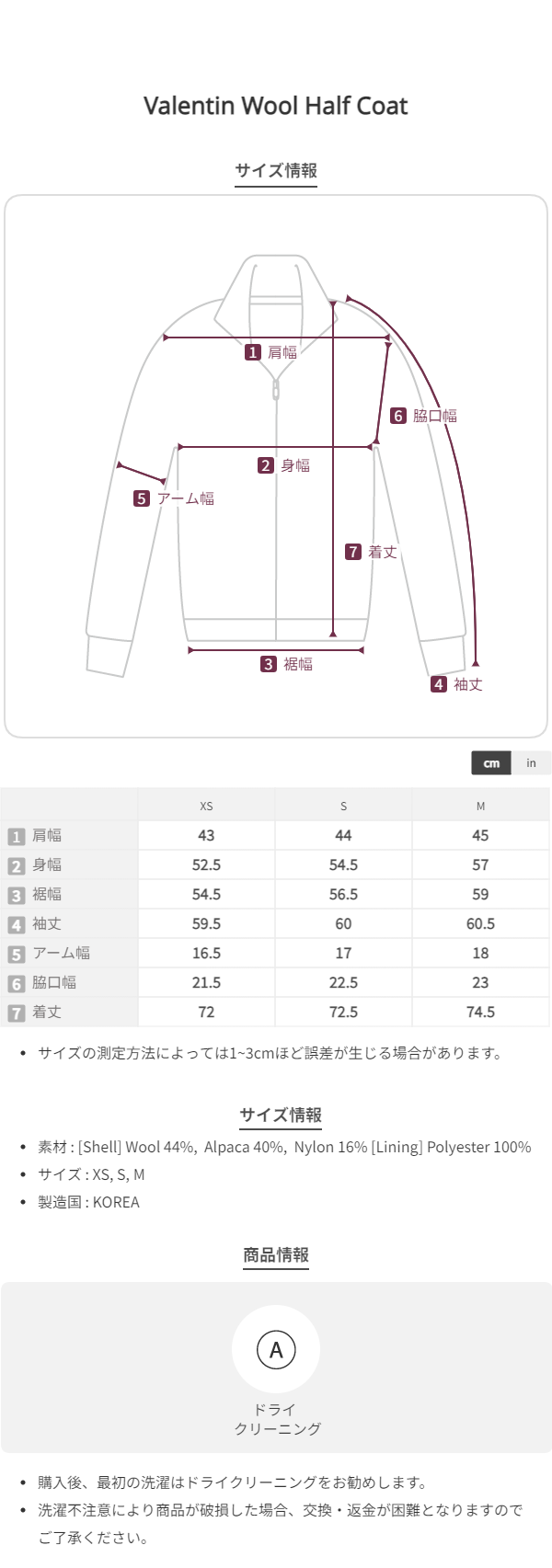 MATERIALS| [Shell] Wool 44%、Alpaca 40%、Nylon 16% [Lining] Polyester 100%