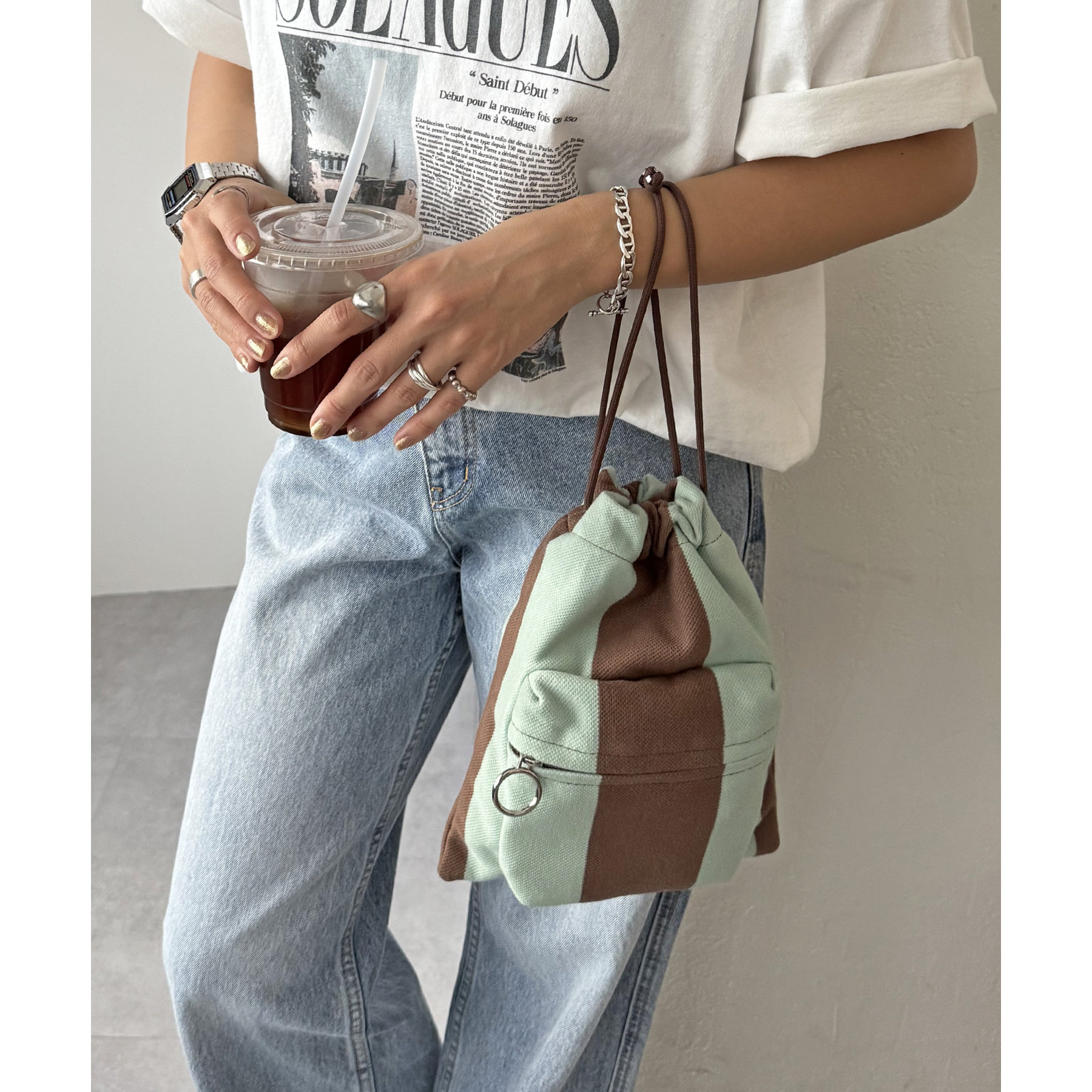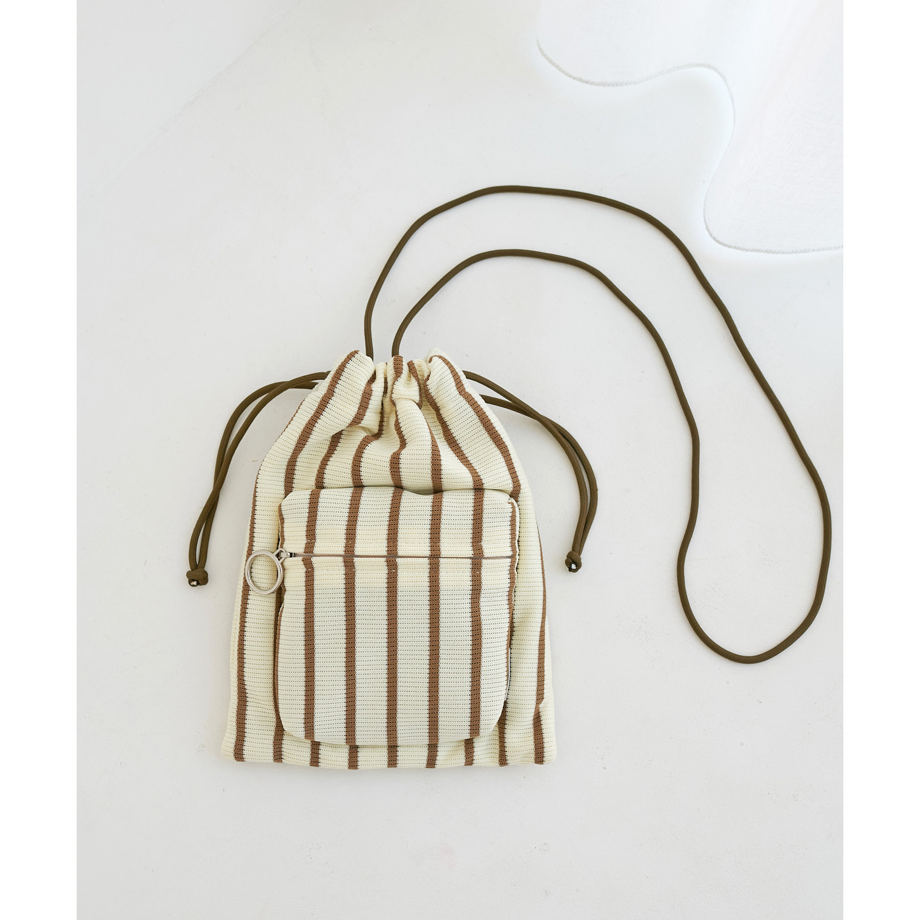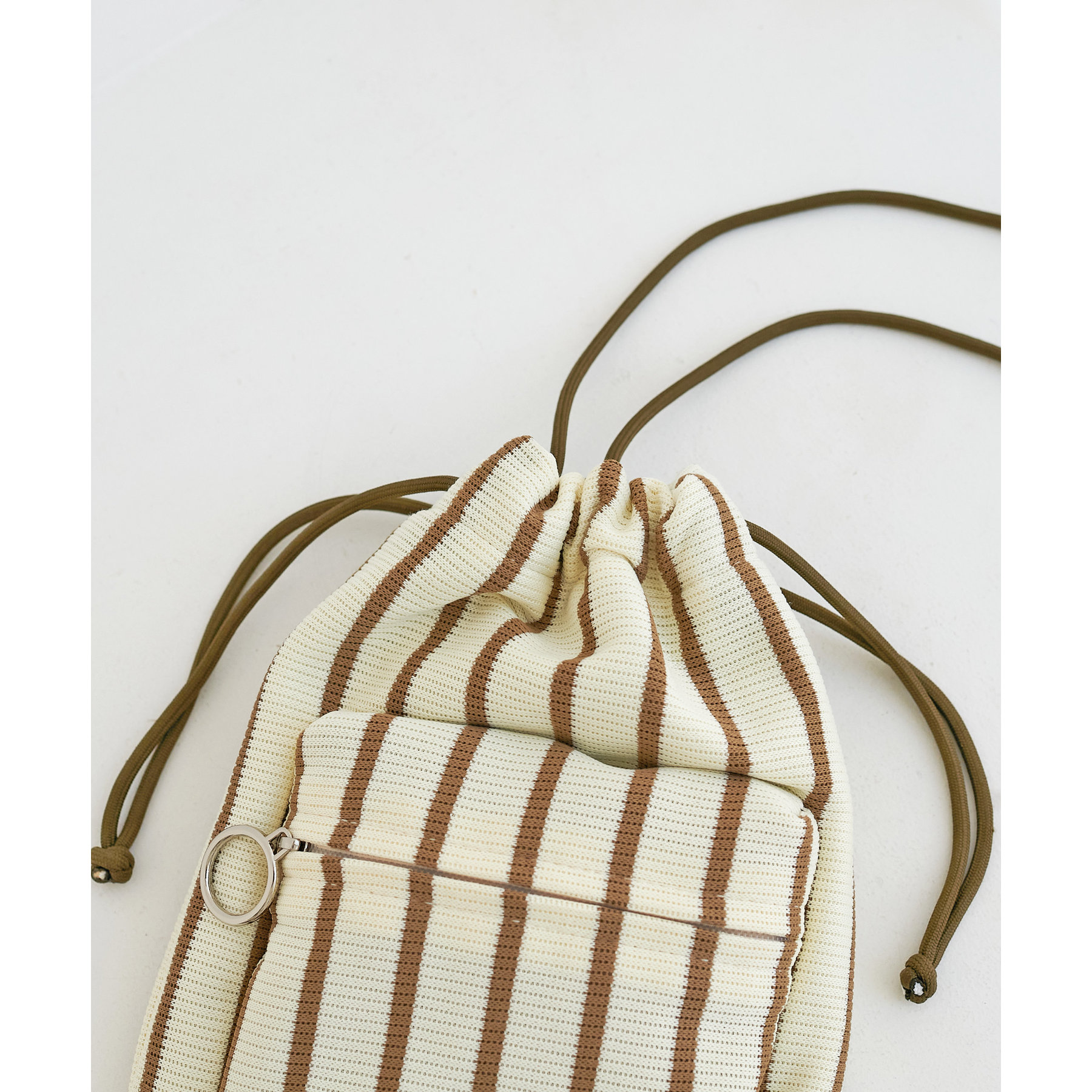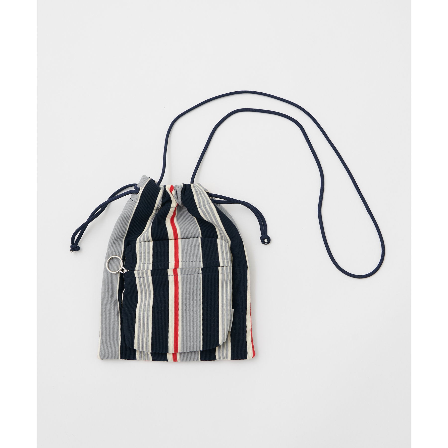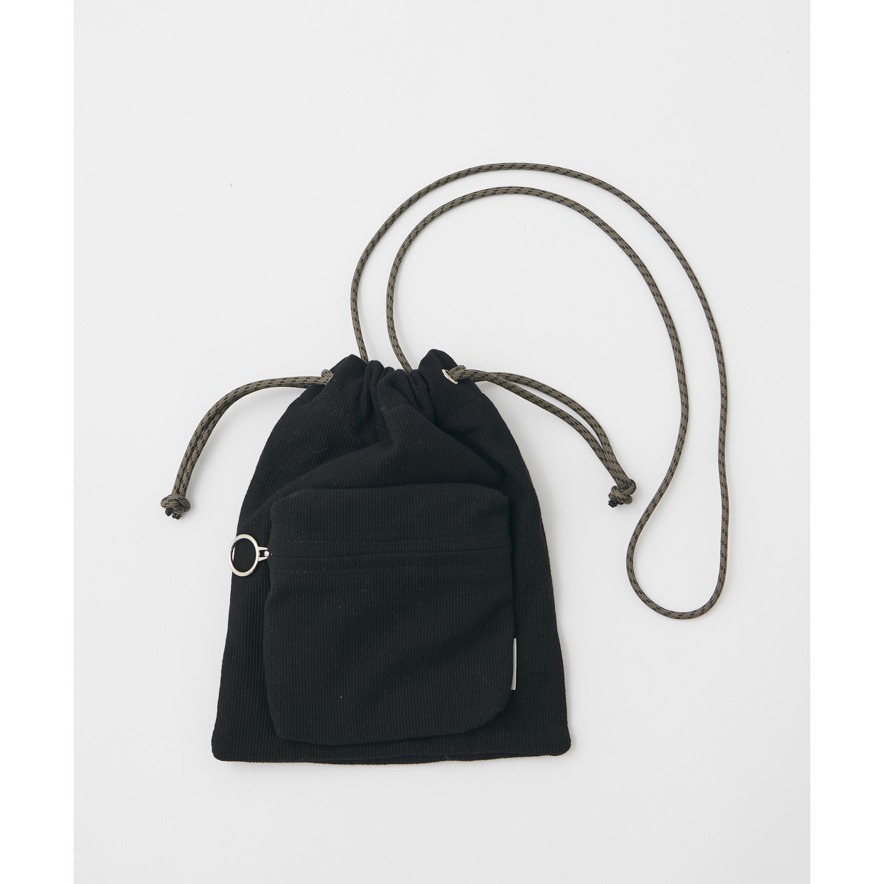 コンパクトな見た目ですが、必要最低限の荷物が収まるちょうどいいサイズ感の巾着ショルダーバッグ。内・外側にポケットがあるので、ワイヤレスイヤフォンやリップなどの小物を整理しながら収納できます◎また、付属のショルダー紐は、取り外し可能かつ、結び目で長さを自由に調整できます!さらに、軽く柔らかい素材で、コンパクトに折りたためるので旅行時のバッグにもオススメです♪カラーは定番のブラックと、春夏らしいカラーリングのミント、アイボリー、少しシックな印象のネイビーの4色展開です。