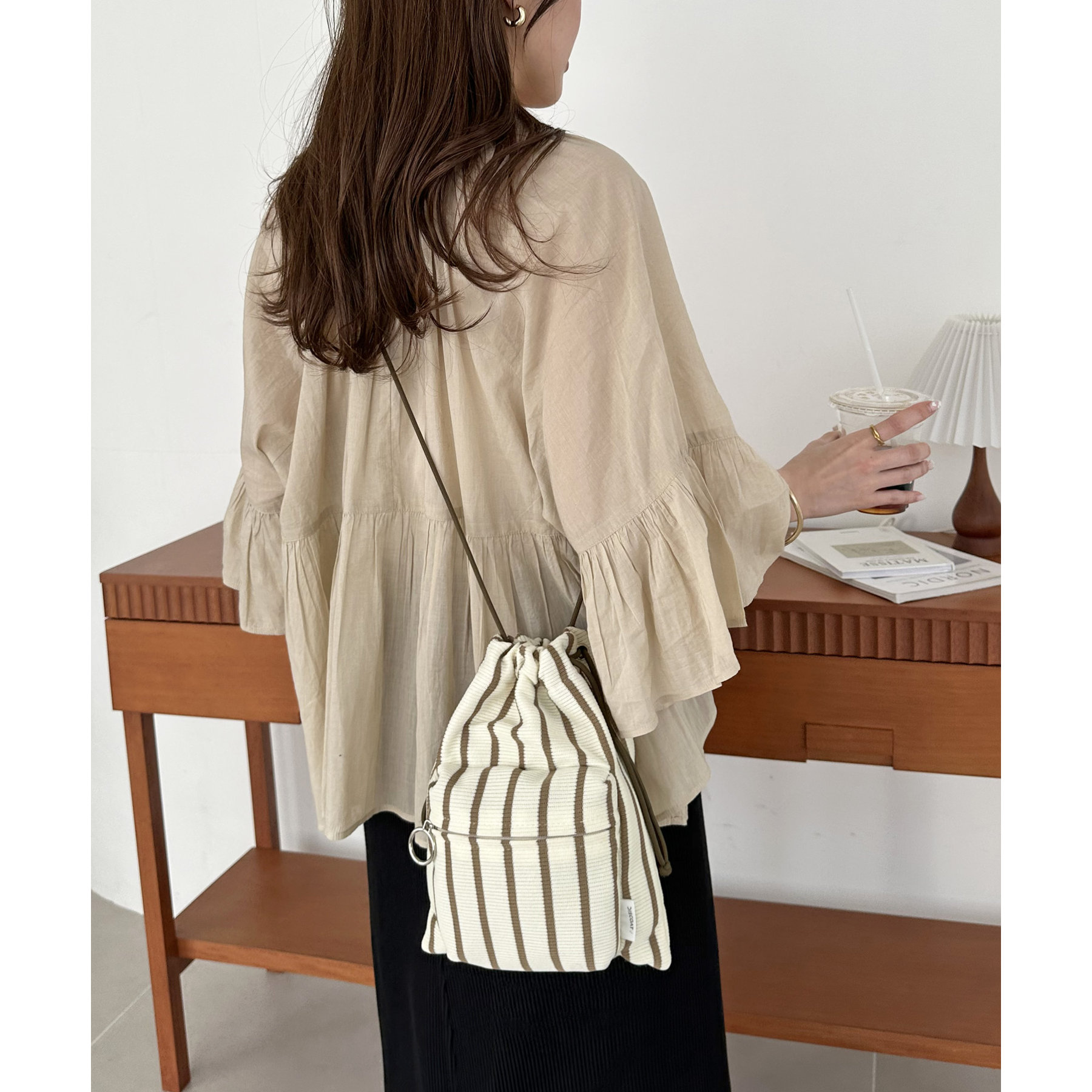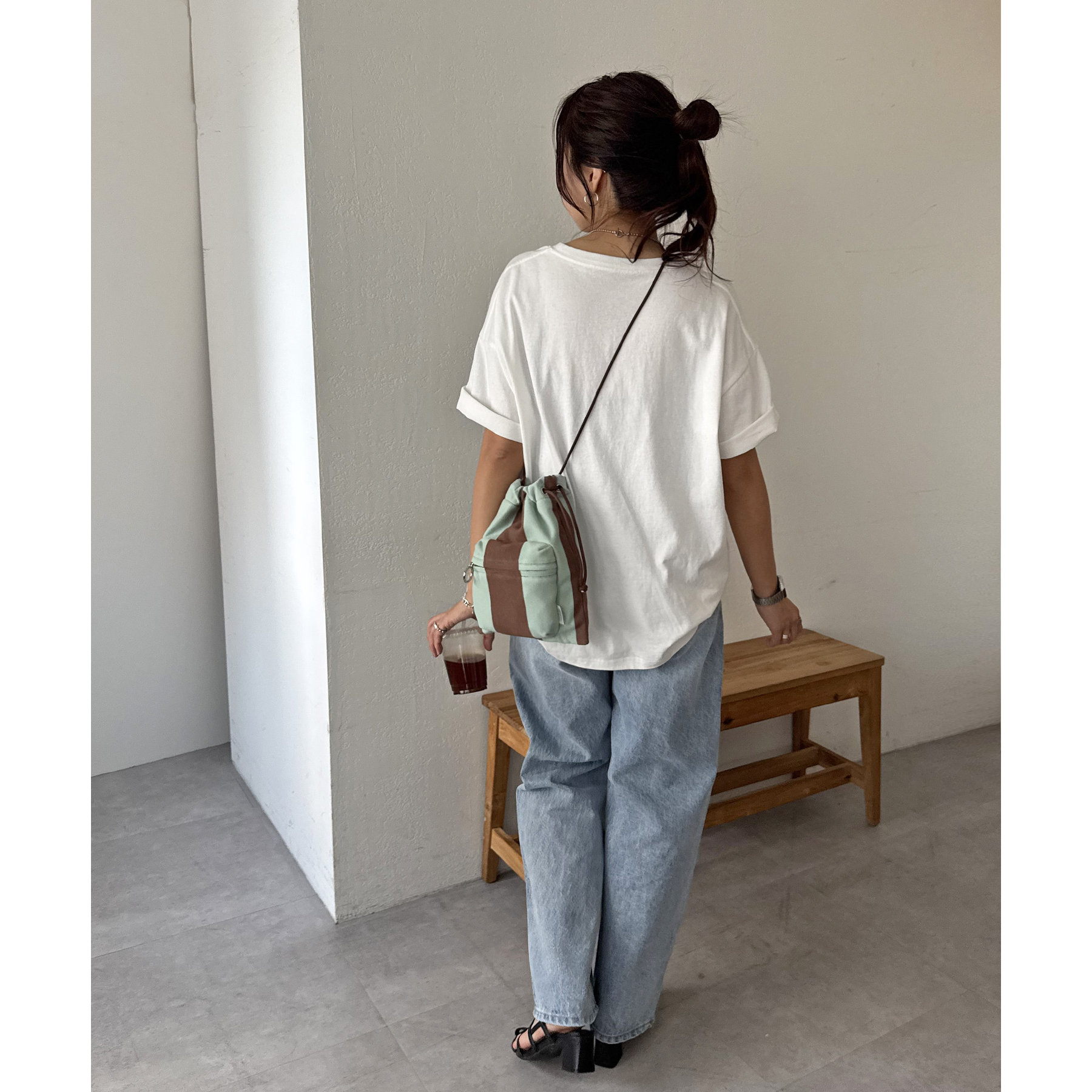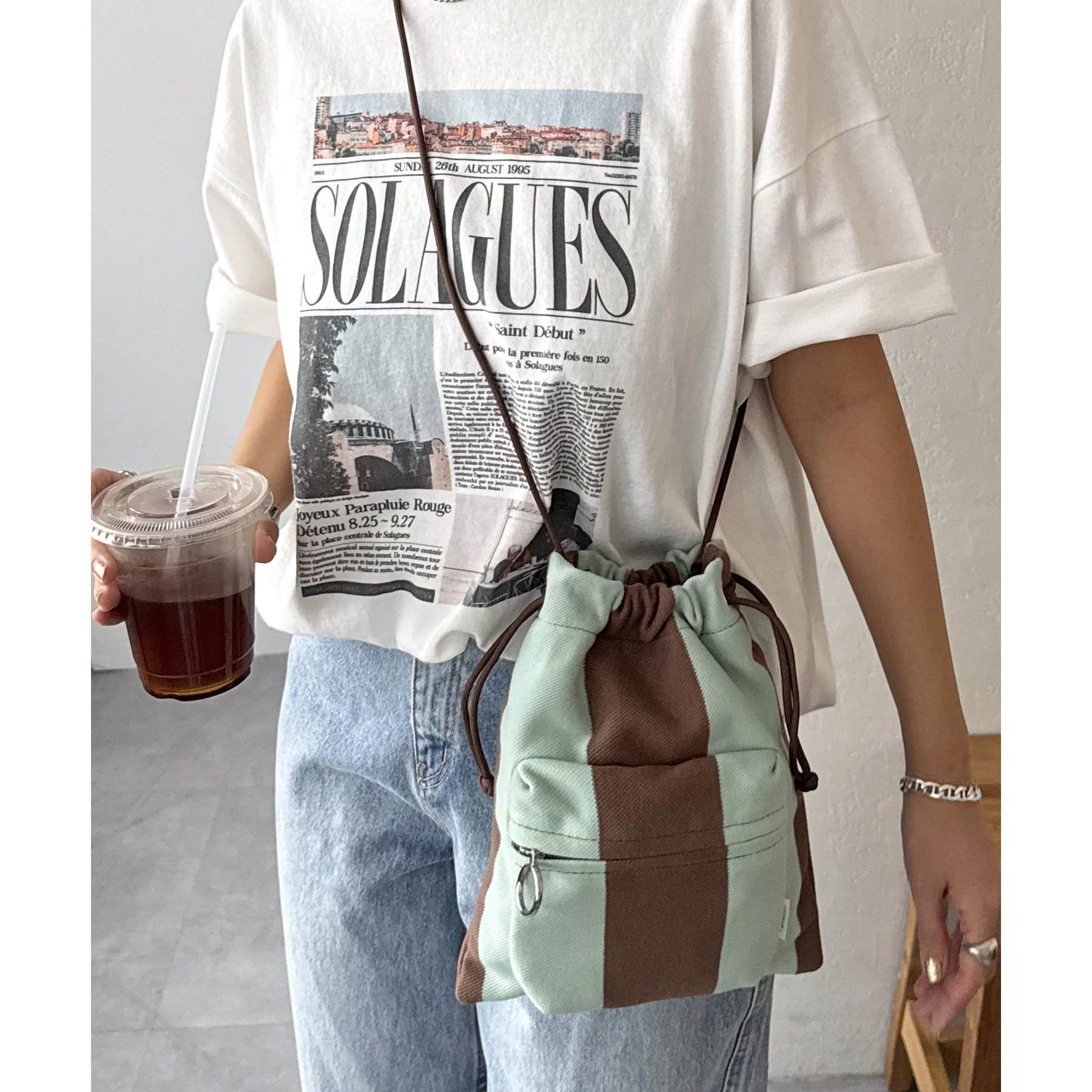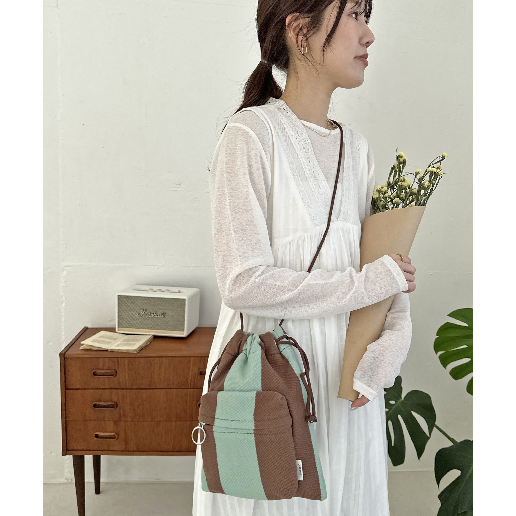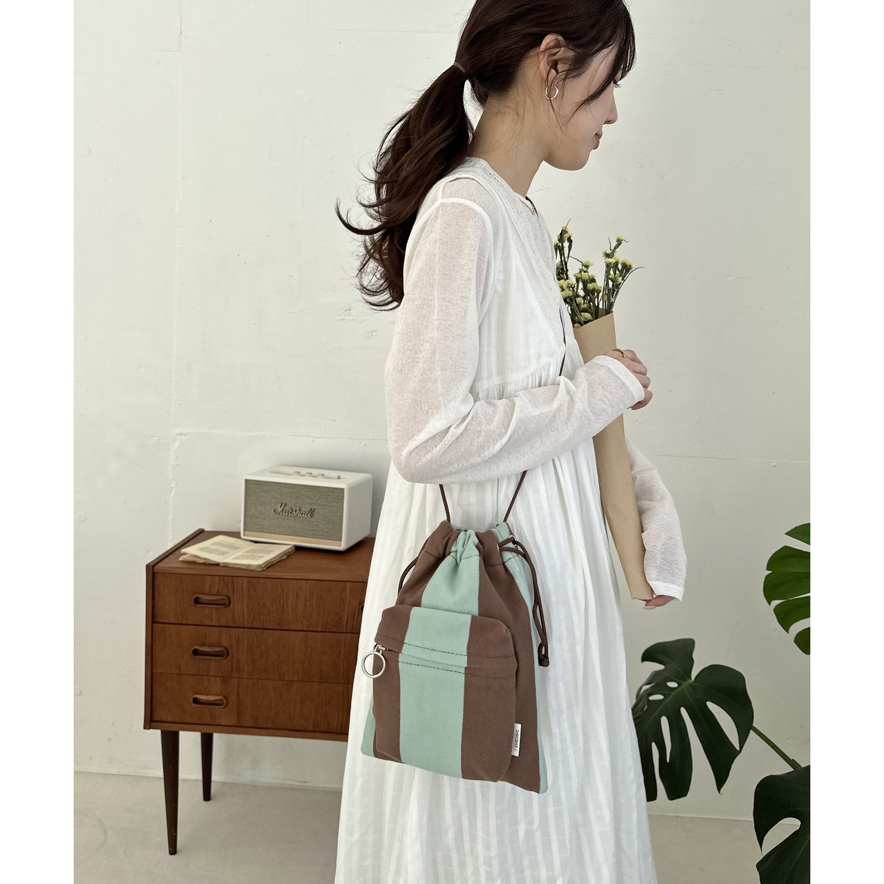 コンパクトな見た目ですが、必要最低限の荷物が収まるちょうどいいサイズ感の巾着ショルダーバッグ。内・外側にポケットがあるので、ワイヤレスイヤフォンやリップなどの小物を整理しながら収納できます◎また、付属のショルダー紐は、取り外し可能かつ、結び目で長さを自由に調整できます!さらに、軽く柔らかい素材で、コンパクトに折りたためるので旅行時のバッグにもオススメです♪カラーは定番のブラックと、春夏らしいカラーリングのミント、アイボリー、少しシックな印象のネイビーの4色展開です。