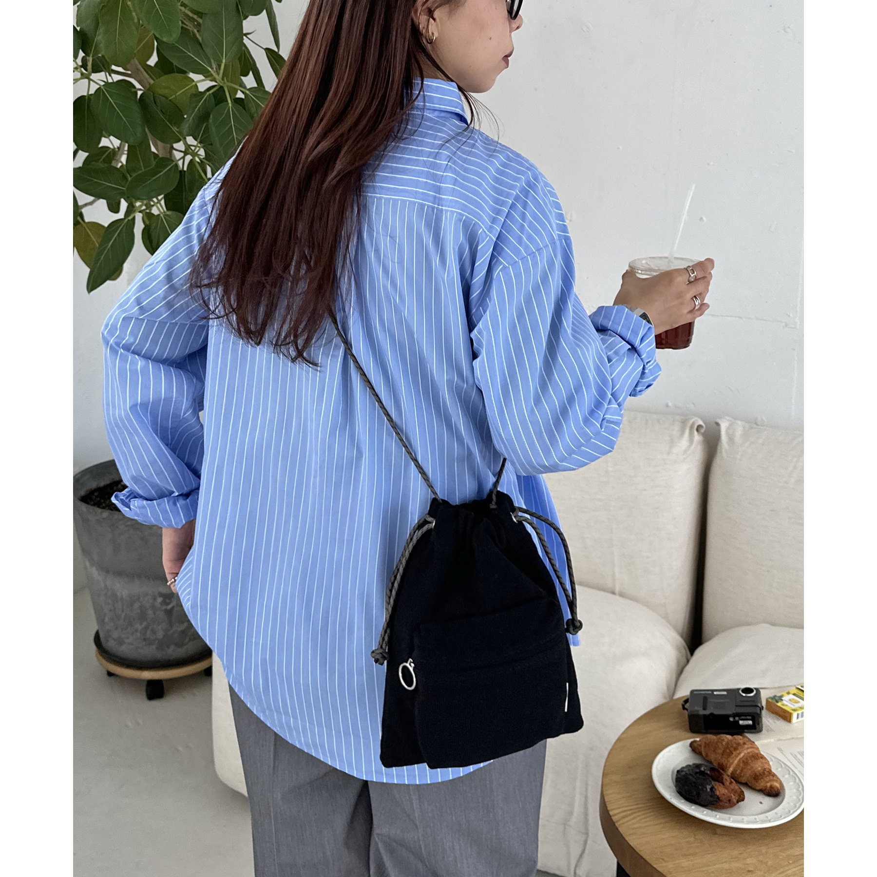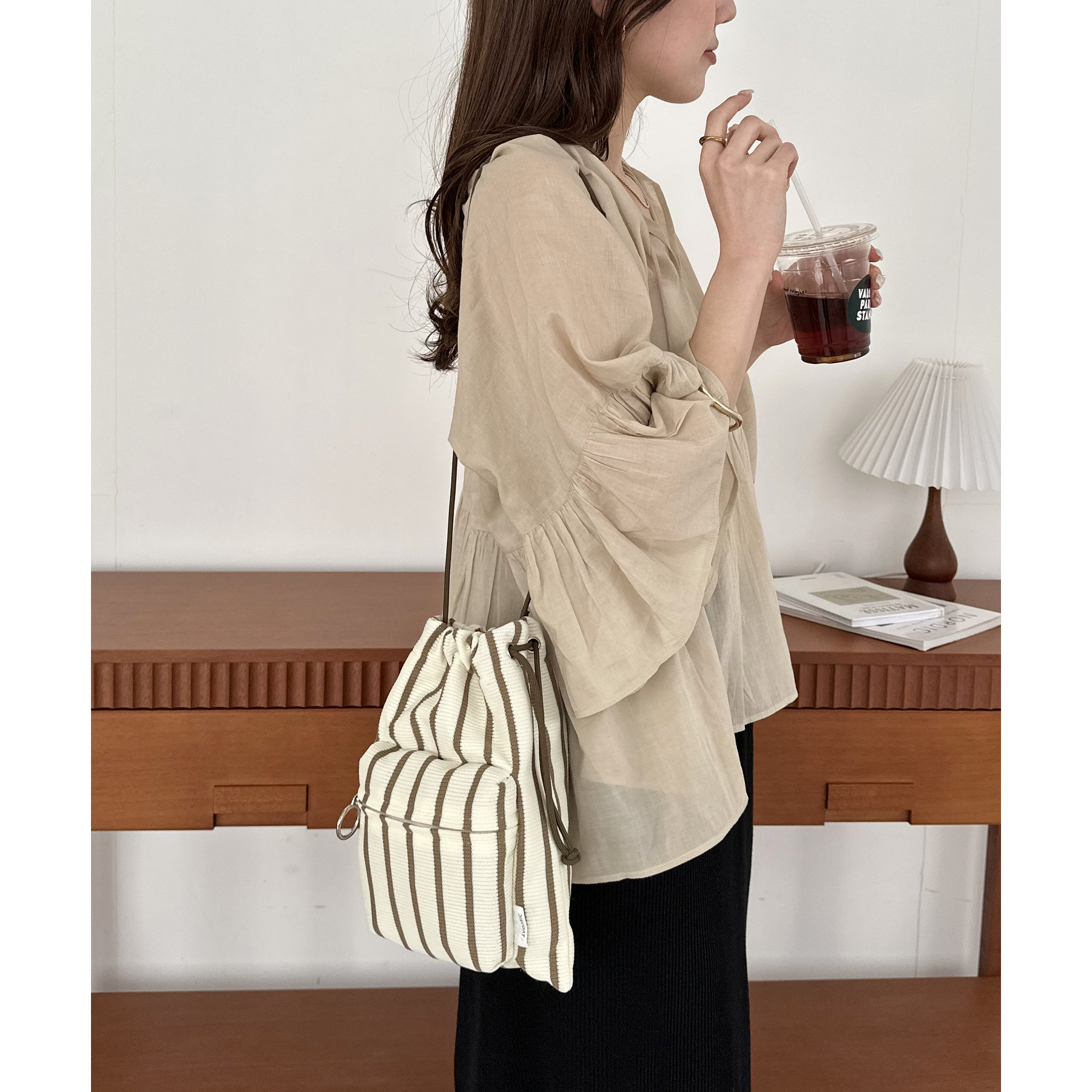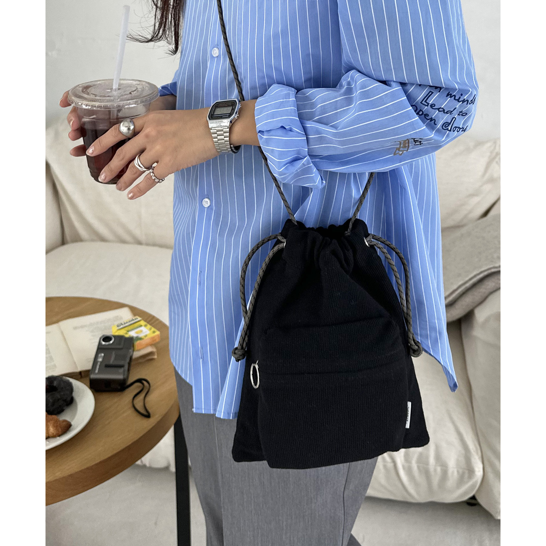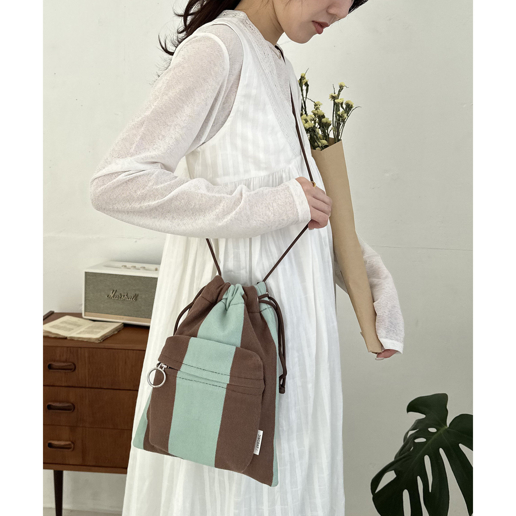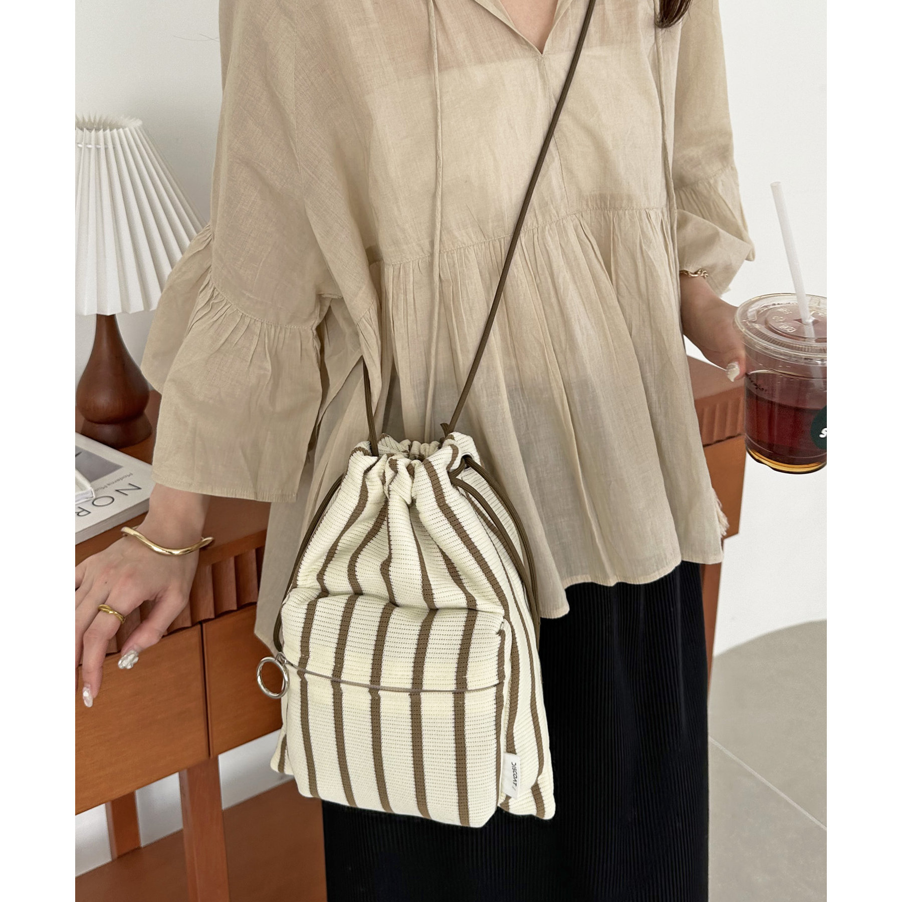 コンパクトな見た目ですが、必要最低限の荷物が収まるちょうどいいサイズ感の巾着ショルダーバッグ。内・外側にポケットがあるので、ワイヤレスイヤフォンやリップなどの小物を整理しながら収納できます◎また、付属のショルダー紐は、取り外し可能かつ、結び目で長さを自由に調整できます!さらに、軽く柔らかい素材で、コンパクトに折りたためるので旅行時のバッグにもオススメです♪カラーは定番のブラックと、春夏らしいカラーリングのミント、アイボリー、少しシックな印象のネイビーの4色展開です。