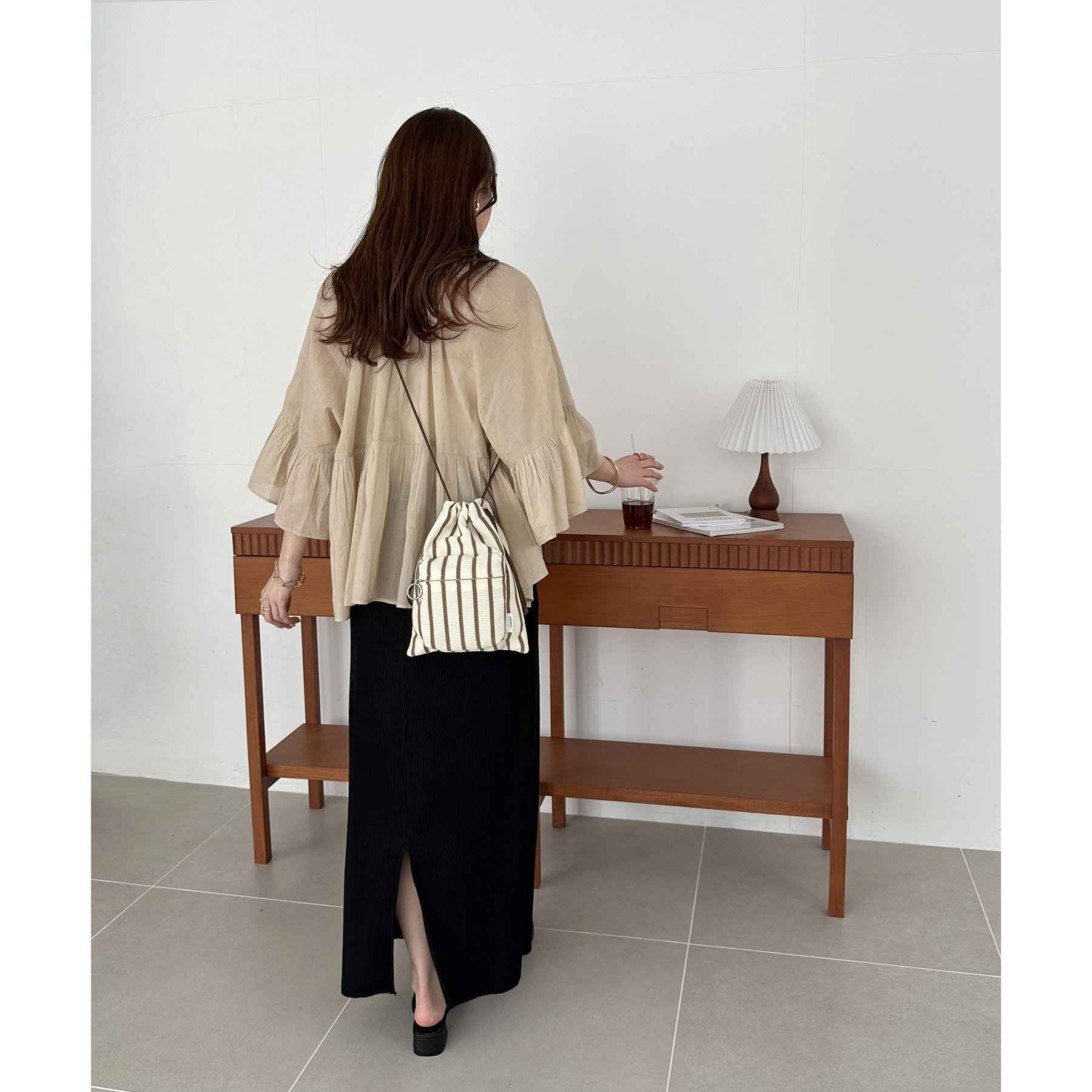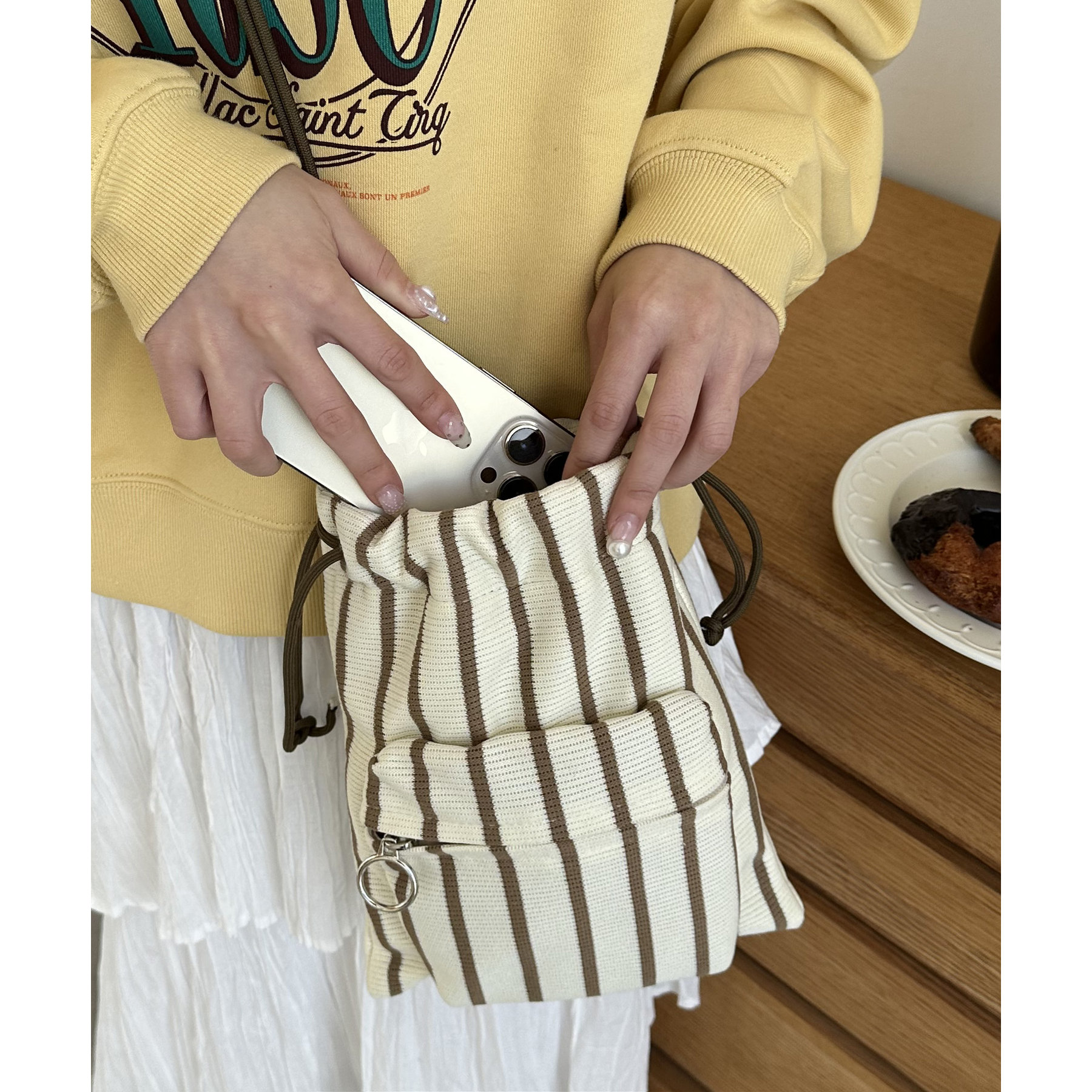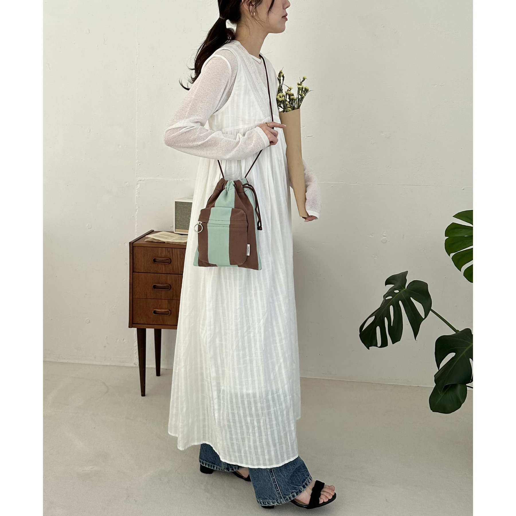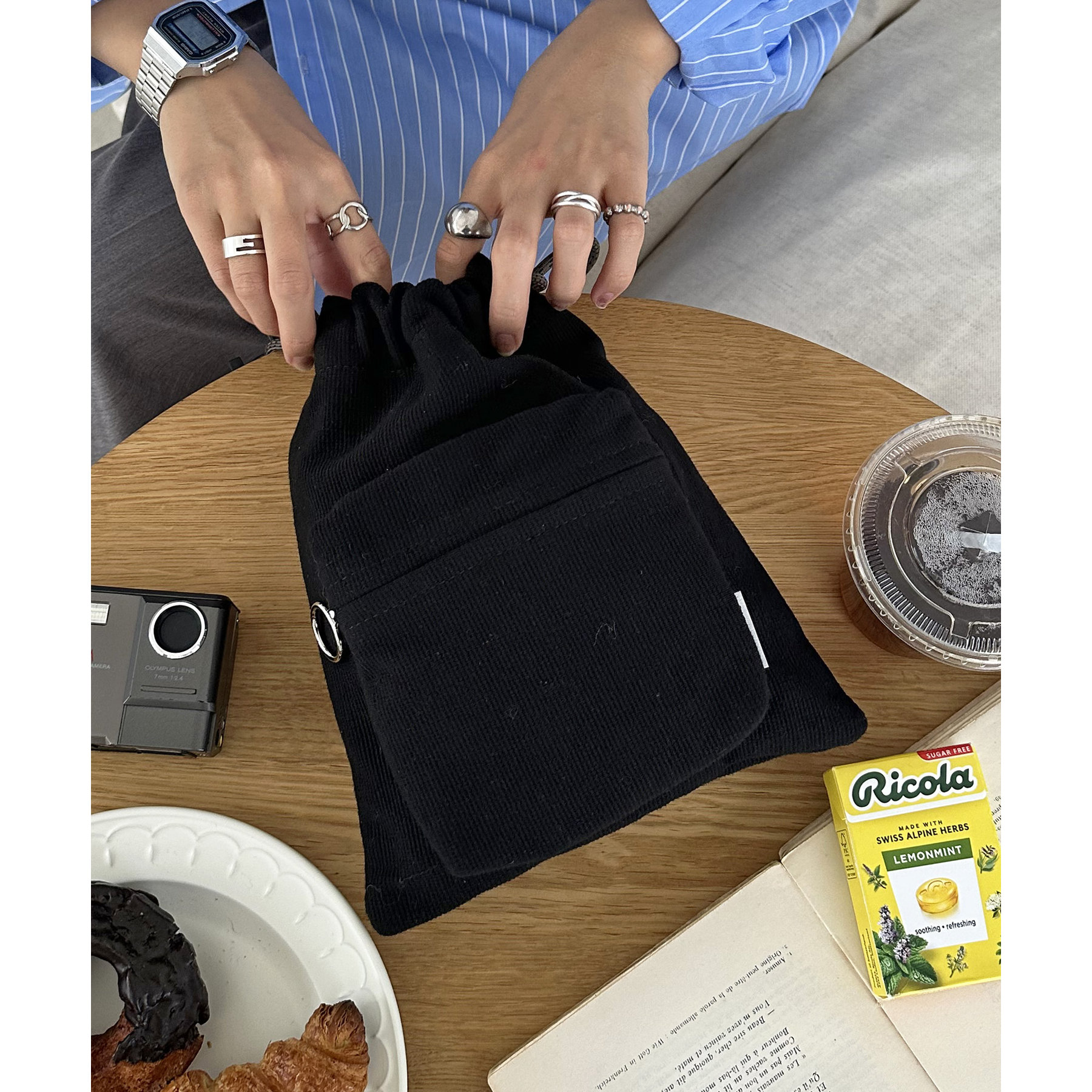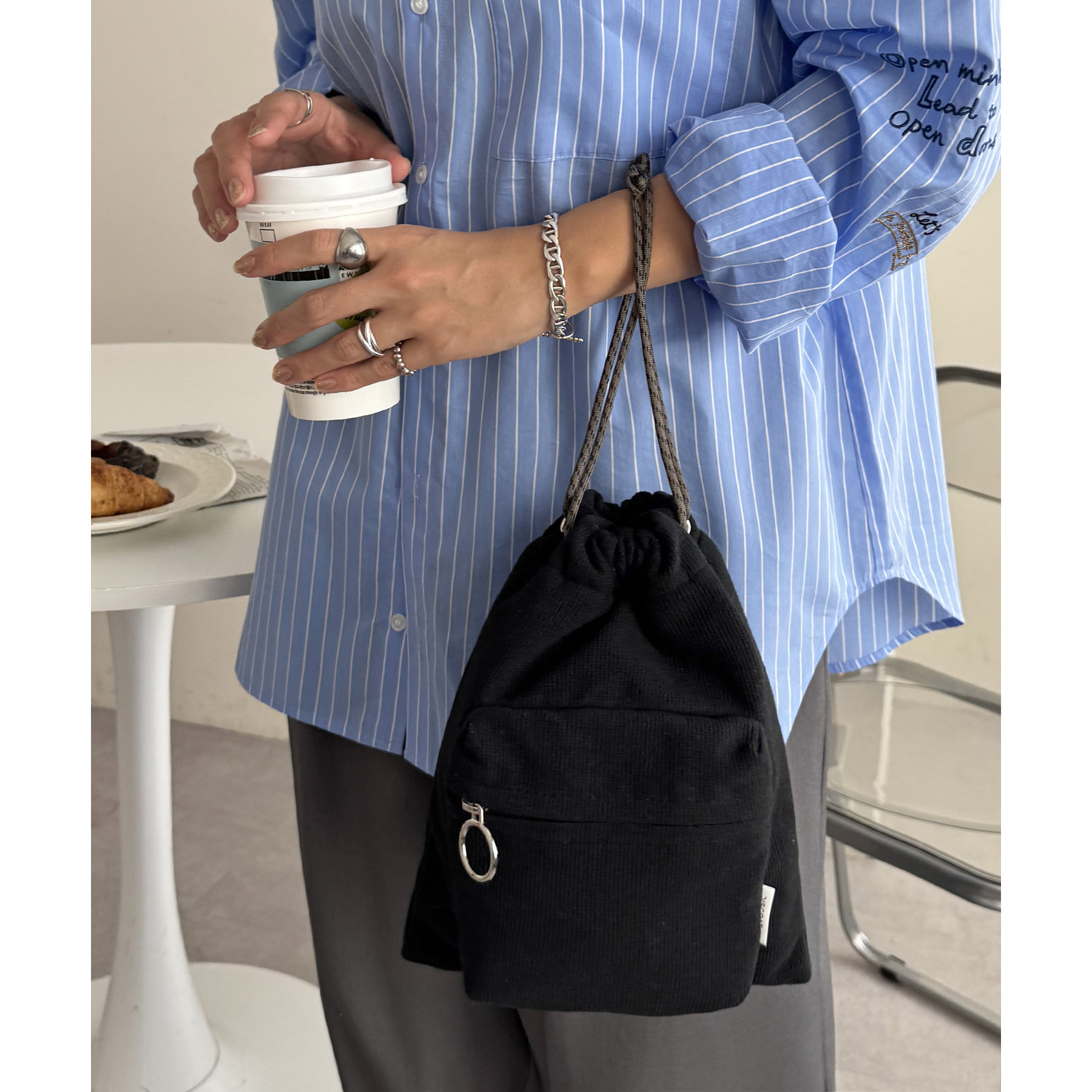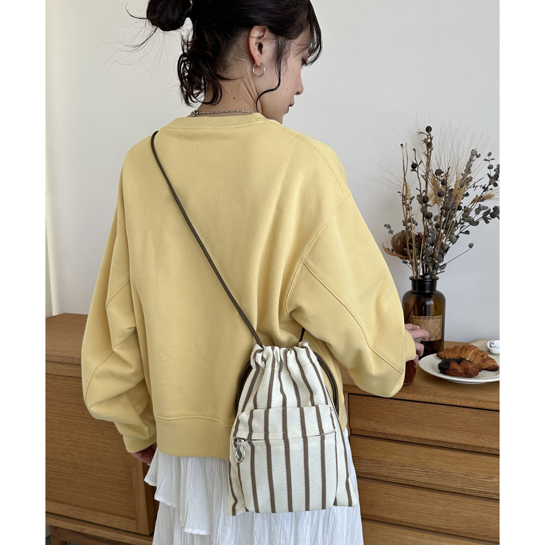 コンパクトな見た目ですが、必要最低限の荷物が収まるちょうどいいサイズ感の巾着ショルダーバッグ。内・外側にポケットがあるので、ワイヤレスイヤフォンやリップなどの小物を整理しながら収納できます◎また、付属のショルダー紐は、取り外し可能かつ、結び目で長さを自由に調整できます!さらに、軽く柔らかい素材で、コンパクトに折りたためるので旅行時のバッグにもオススメです♪カラーは定番のブラックと、春夏らしいカラーリングのミント、アイボリー、少しシックな印象のネイビーの4色展開です。