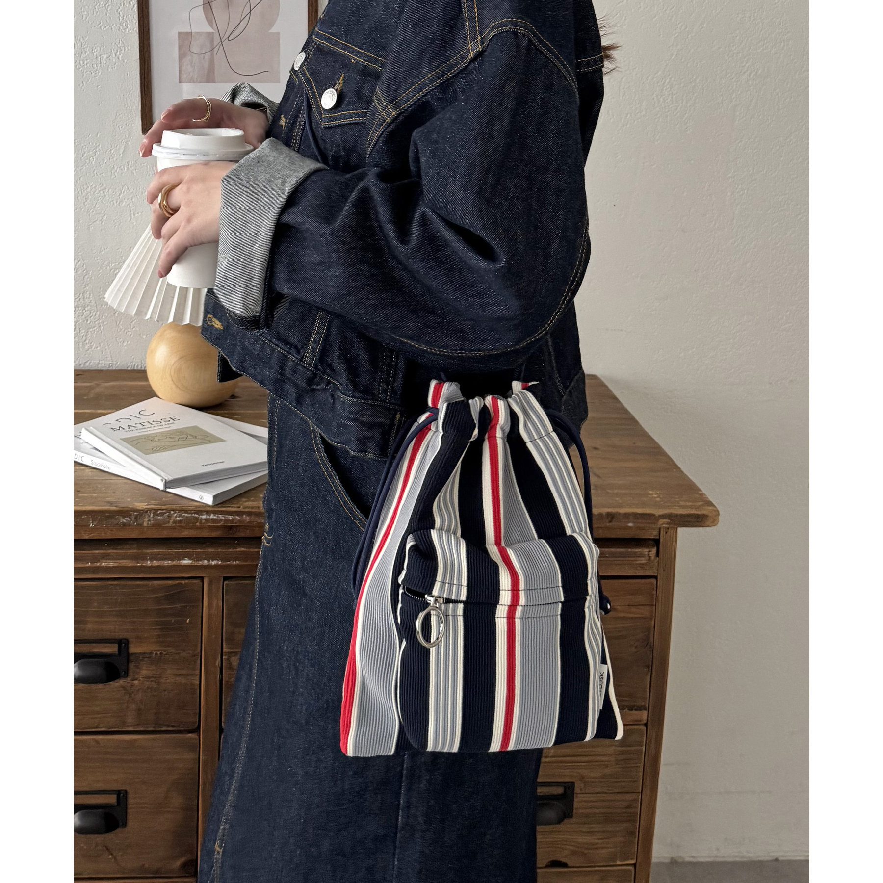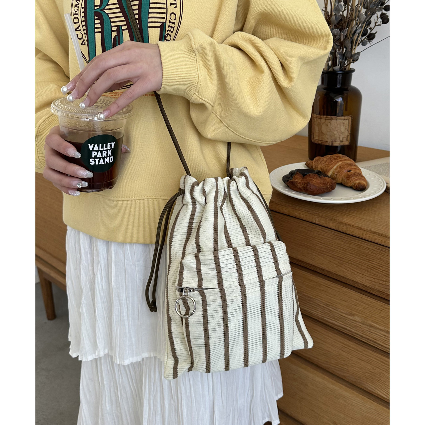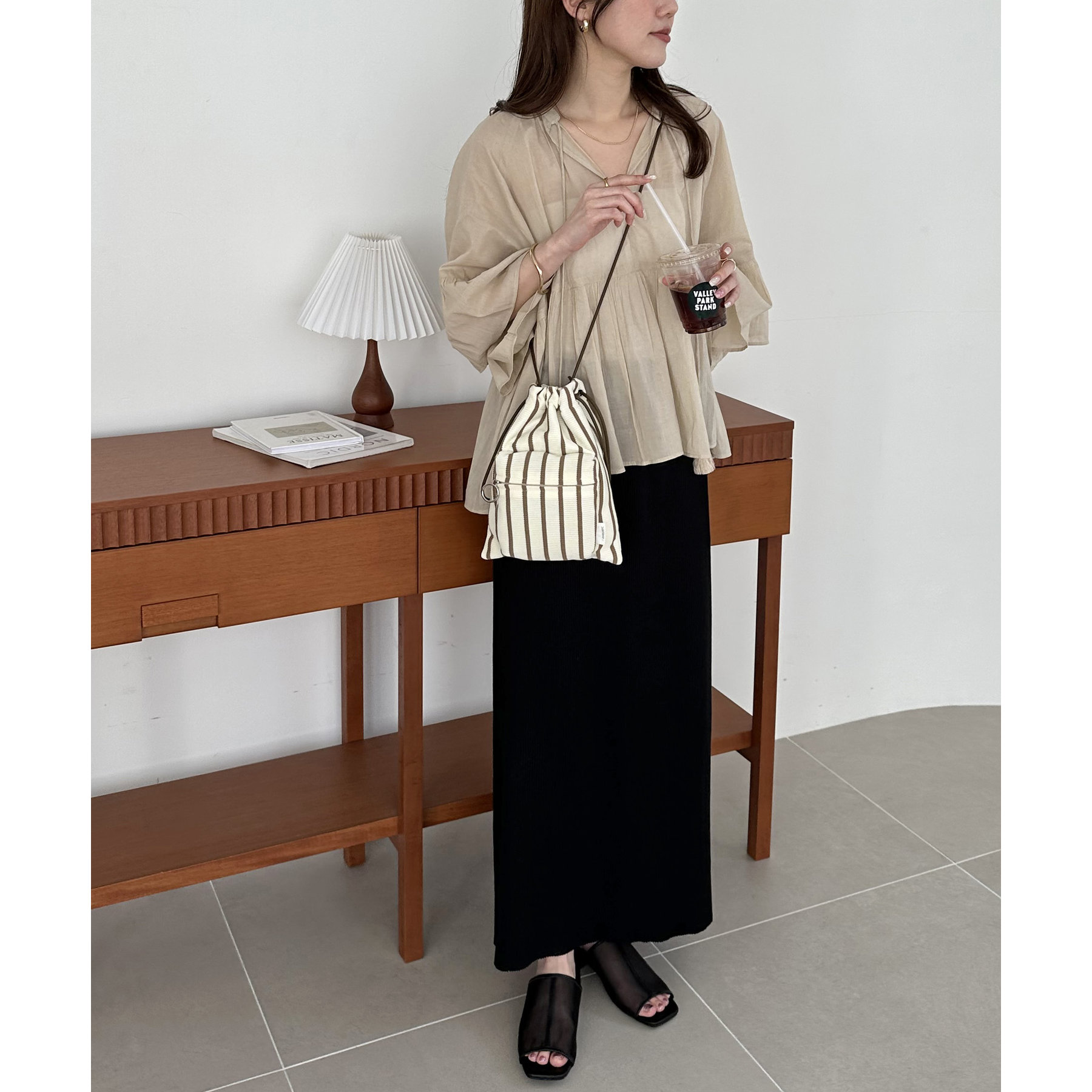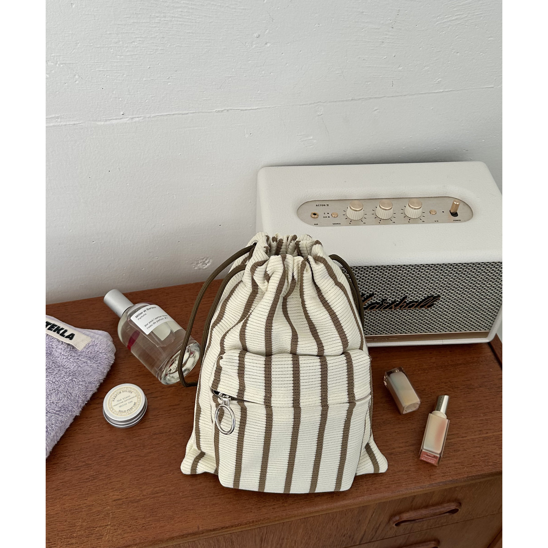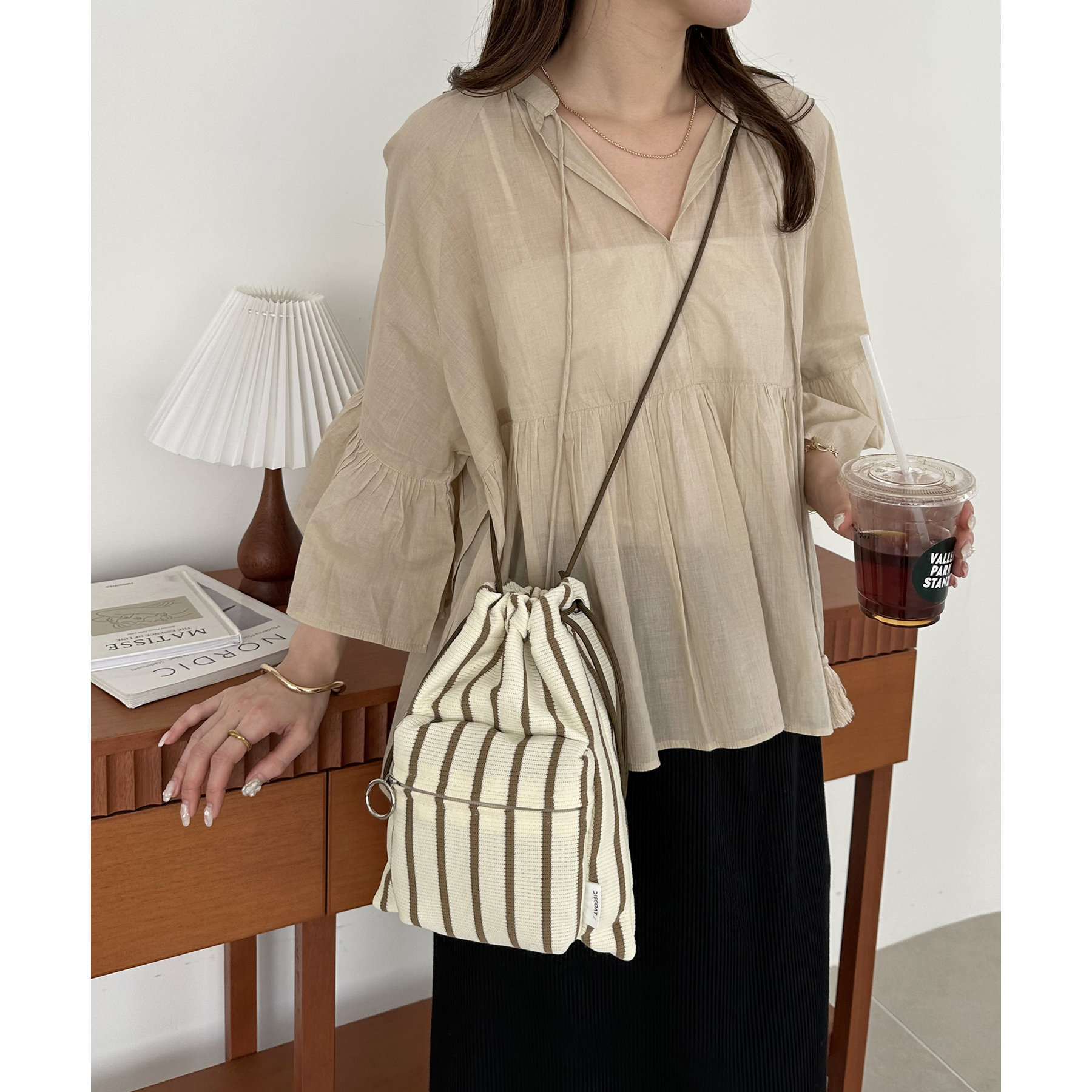 コンパクトな見た目ですが、必要最低限の荷物が収まるちょうどいいサイズ感の巾着ショルダーバッグ。内・外側にポケットがあるので、ワイヤレスイヤフォンやリップなどの小物を整理しながら収納できます◎また、付属のショルダー紐は、取り外し可能かつ、結び目で長さを自由に調整できます!さらに、軽く柔らかい素材で、コンパクトに折りたためるので旅行時のバッグにもオススメです♪カラーは定番のブラックと、春夏らしいカラーリングのミント、アイボリー、少しシックな印象のネイビーの4色展開です。