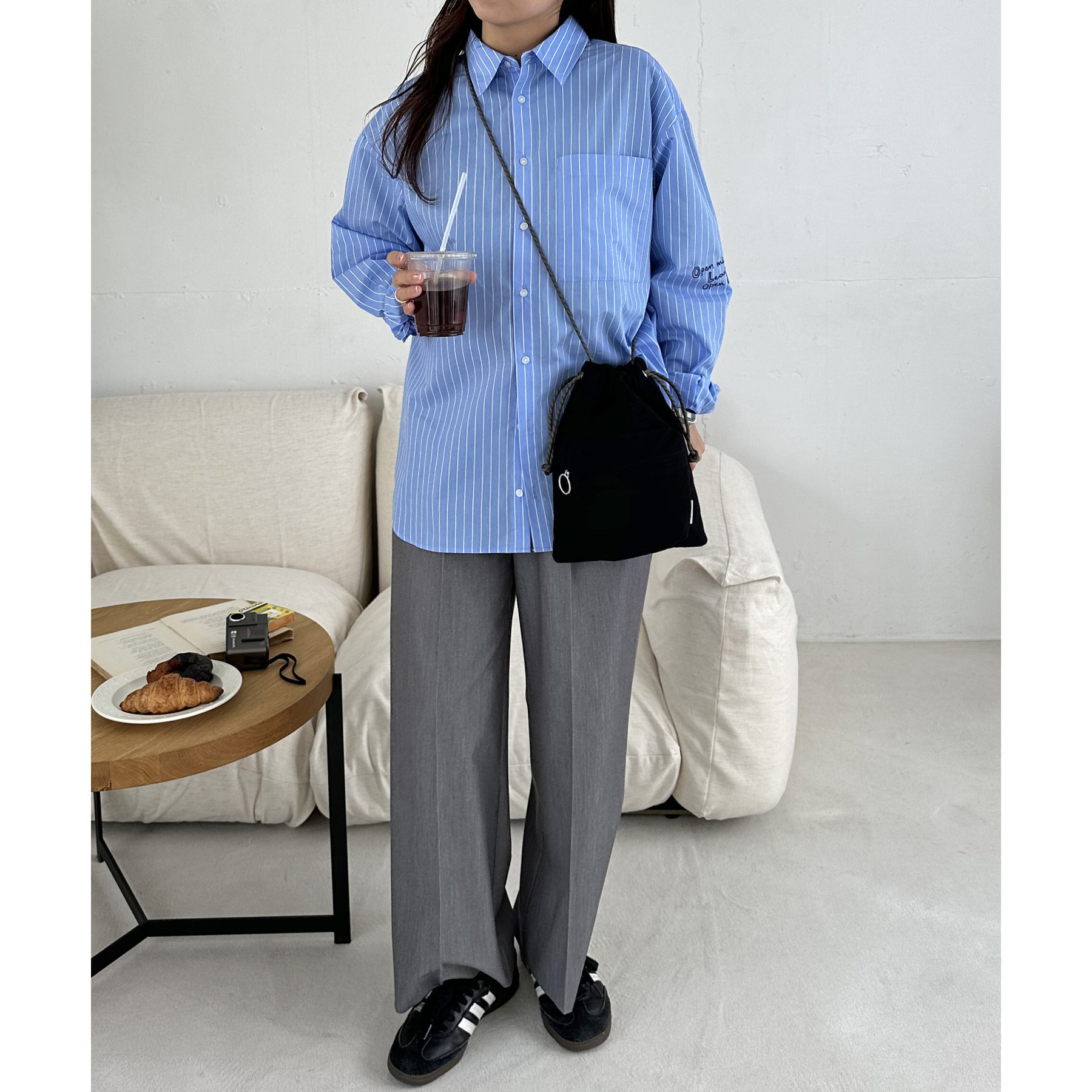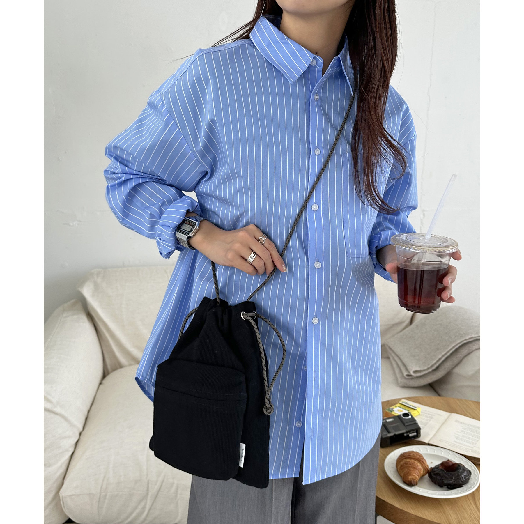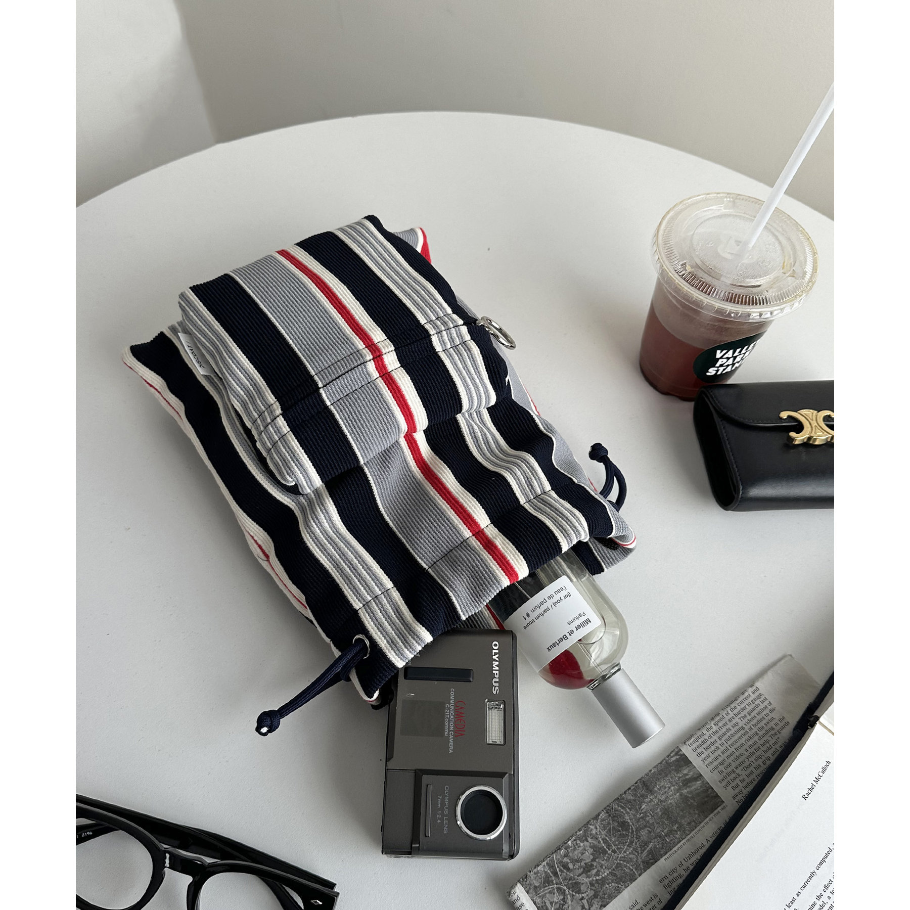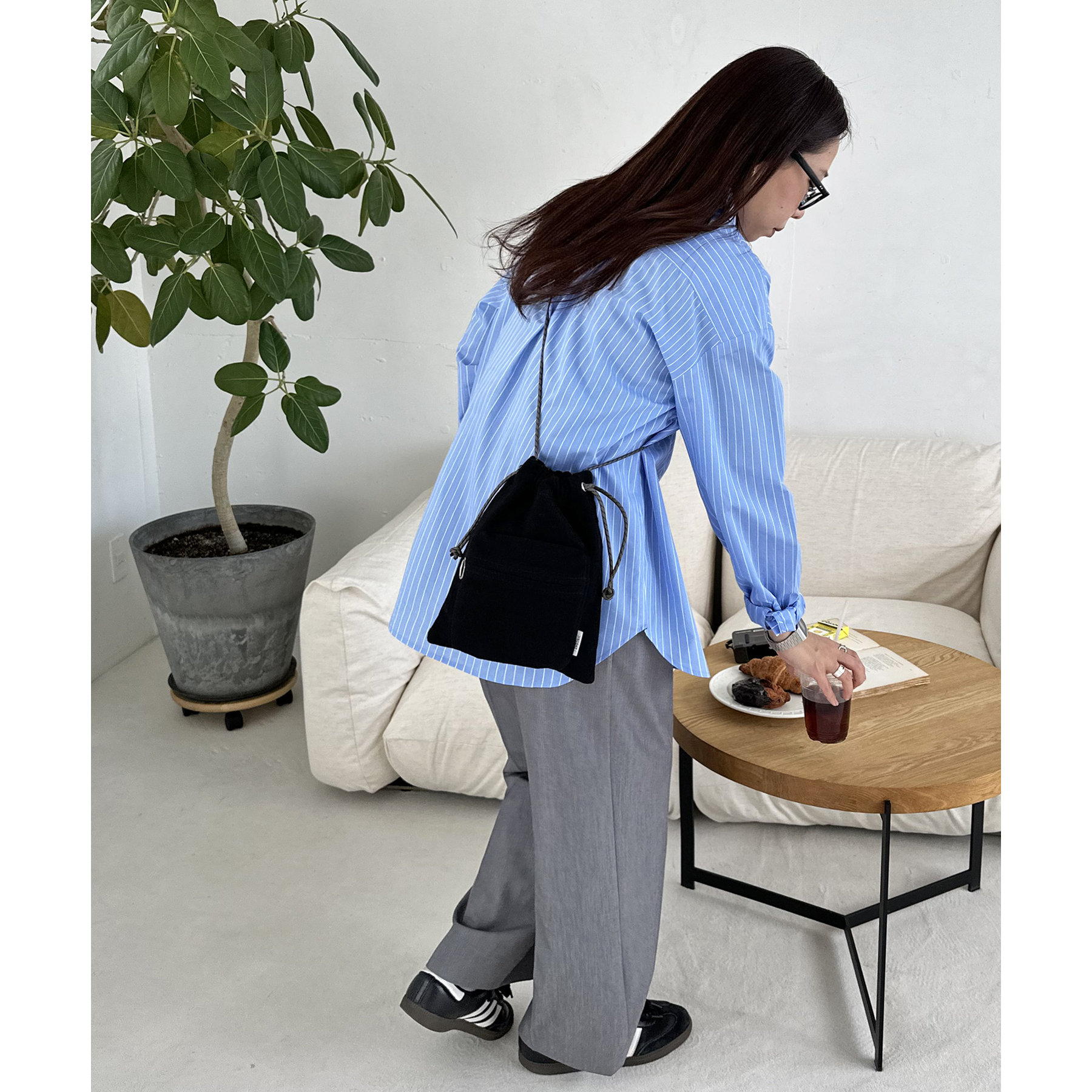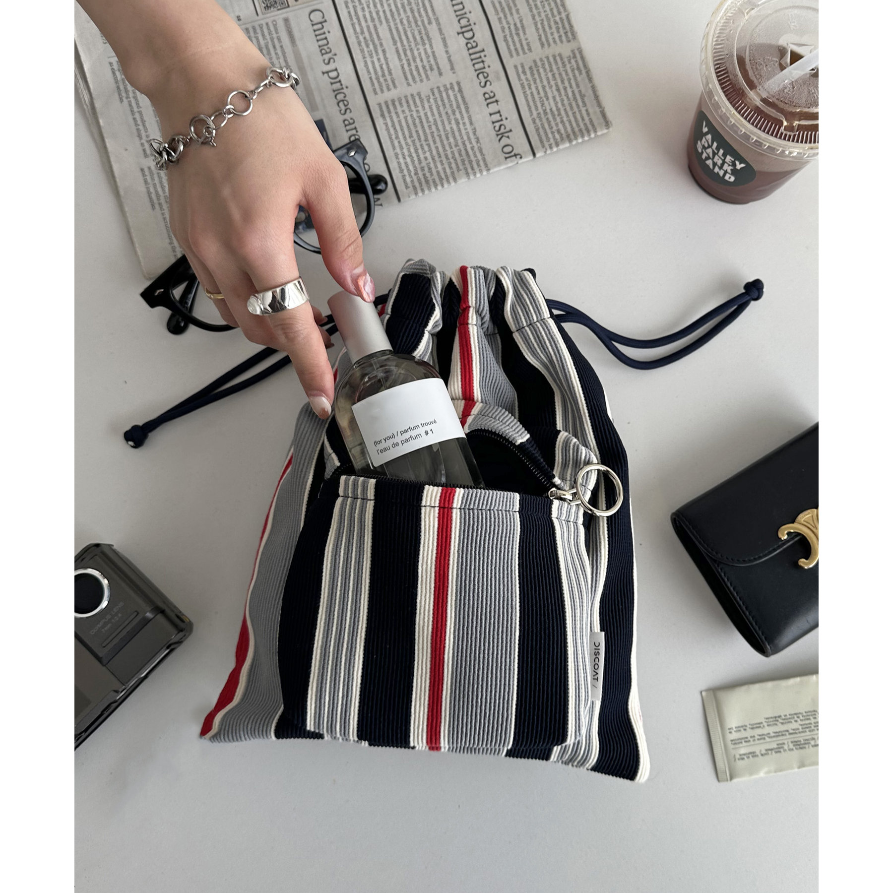 コンパクトな見た目ですが、必要最低限の荷物が収まるちょうどいいサイズ感の巾着ショルダーバッグ。内・外側にポケットがあるので、ワイヤレスイヤフォンやリップなどの小物を整理しながら収納できます◎また、付属のショルダー紐は、取り外し可能かつ、結び目で長さを自由に調整できます!さらに、軽く柔らかい素材で、コンパクトに折りたためるので旅行時のバッグにもオススメです♪カラーは定番のブラックと、春夏らしいカラーリングのミント、アイボリー、少しシックな印象のネイビーの4色展開です。