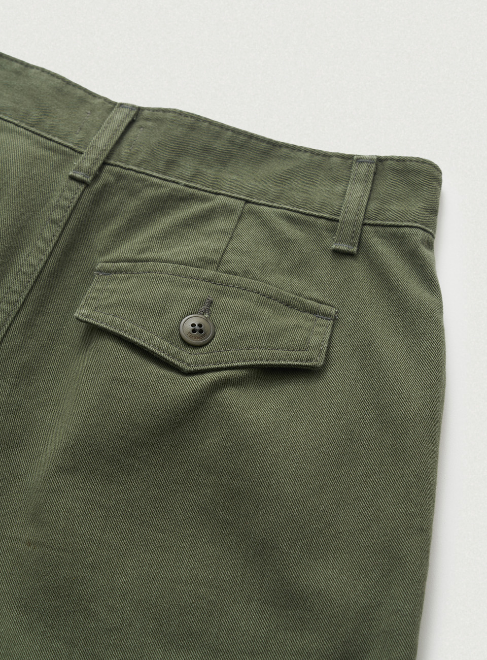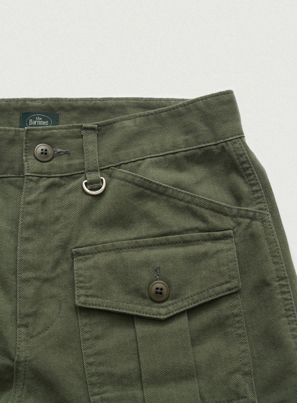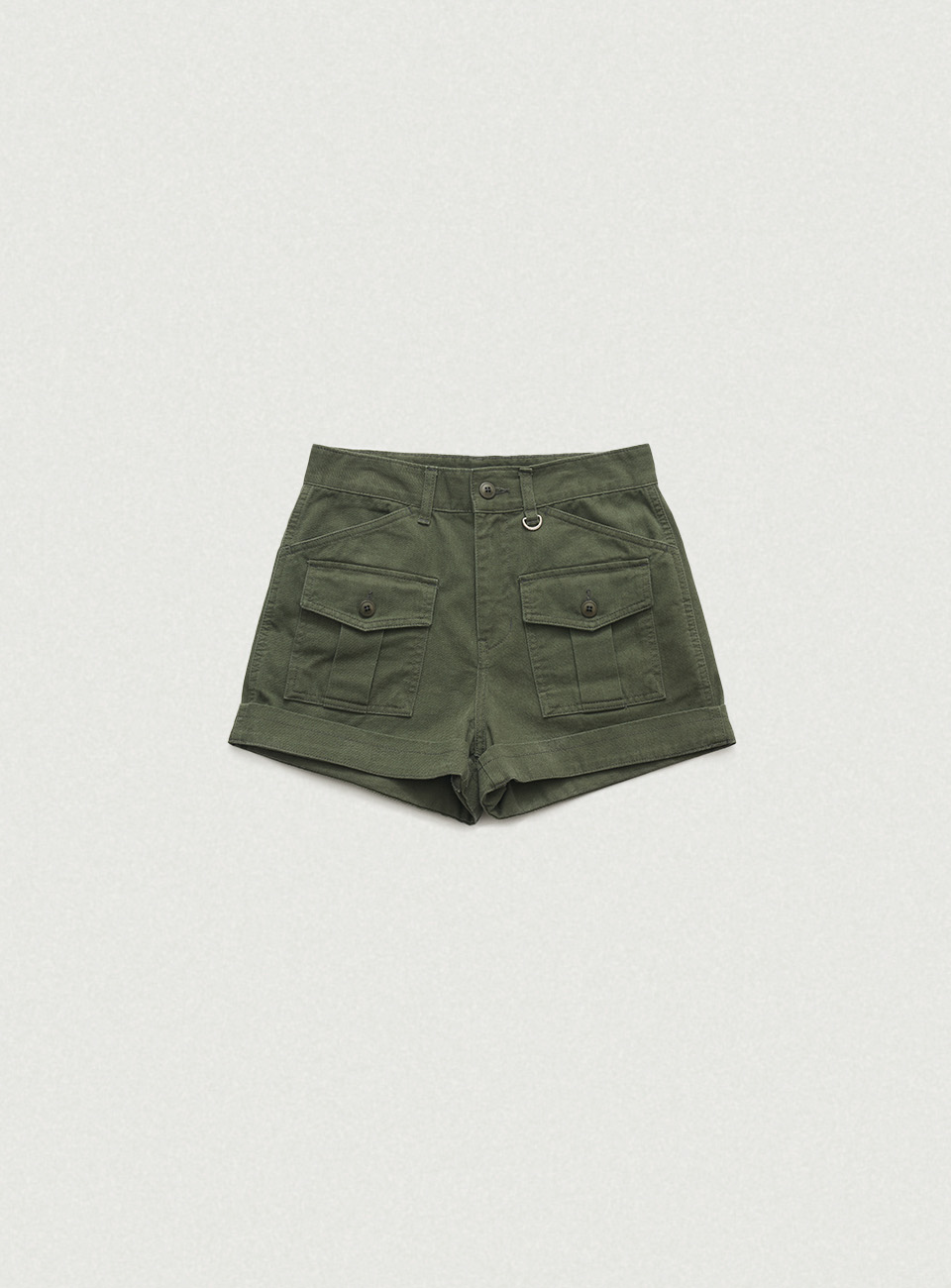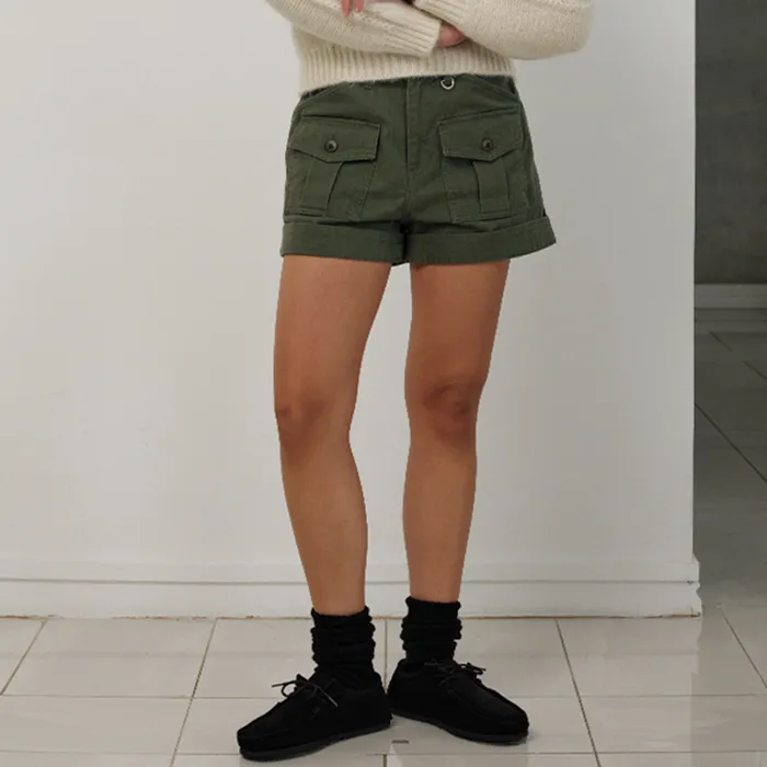 カーキカラーの洗濯感が際立つ、しっかりしたコットン生地 太ももくらいの長さとファスナーロック方式仕様のショーツタイプ 両フラップポケットとベルトループ、Dリングの装飾が加わり、実用性とディテールを備えたアイテム ※カチオン染料加工した生地特性上、ウォッシング度合いにより個体ごとに色が若干異なる場合があります。 これは悪い理由にはなりません。 コットン100% Khaki Cotton Thigh length Zipper Fastening スラントポケット Belt Loop フラップポケット