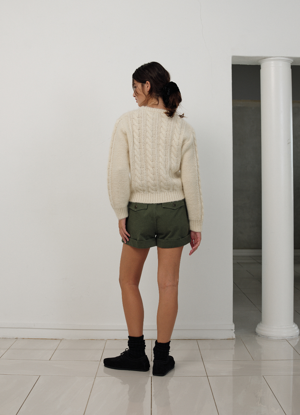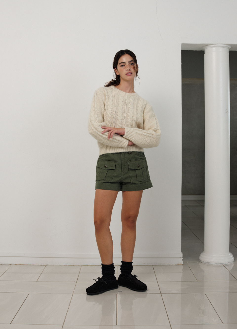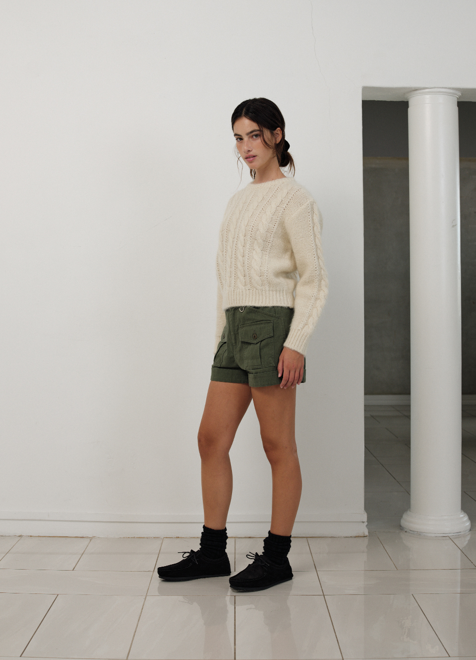 カーキカラーの洗濯感が際立つ、しっかりしたコットン生地 太ももくらいの長さとファスナーロック方式仕様のショーツタイプ 両フラップポケットとベルトループ、Dリングの装飾が加わり、実用性とディテールを備えたアイテム ※カチオン染料加工した生地特性上、ウォッシング度合いにより個体ごとに色が若干異なる場合があります。 これは悪い理由にはなりません。 コットン100% Khaki Cotton Thigh length Zipper Fastening スラントポケット Belt Loop フラップポケット