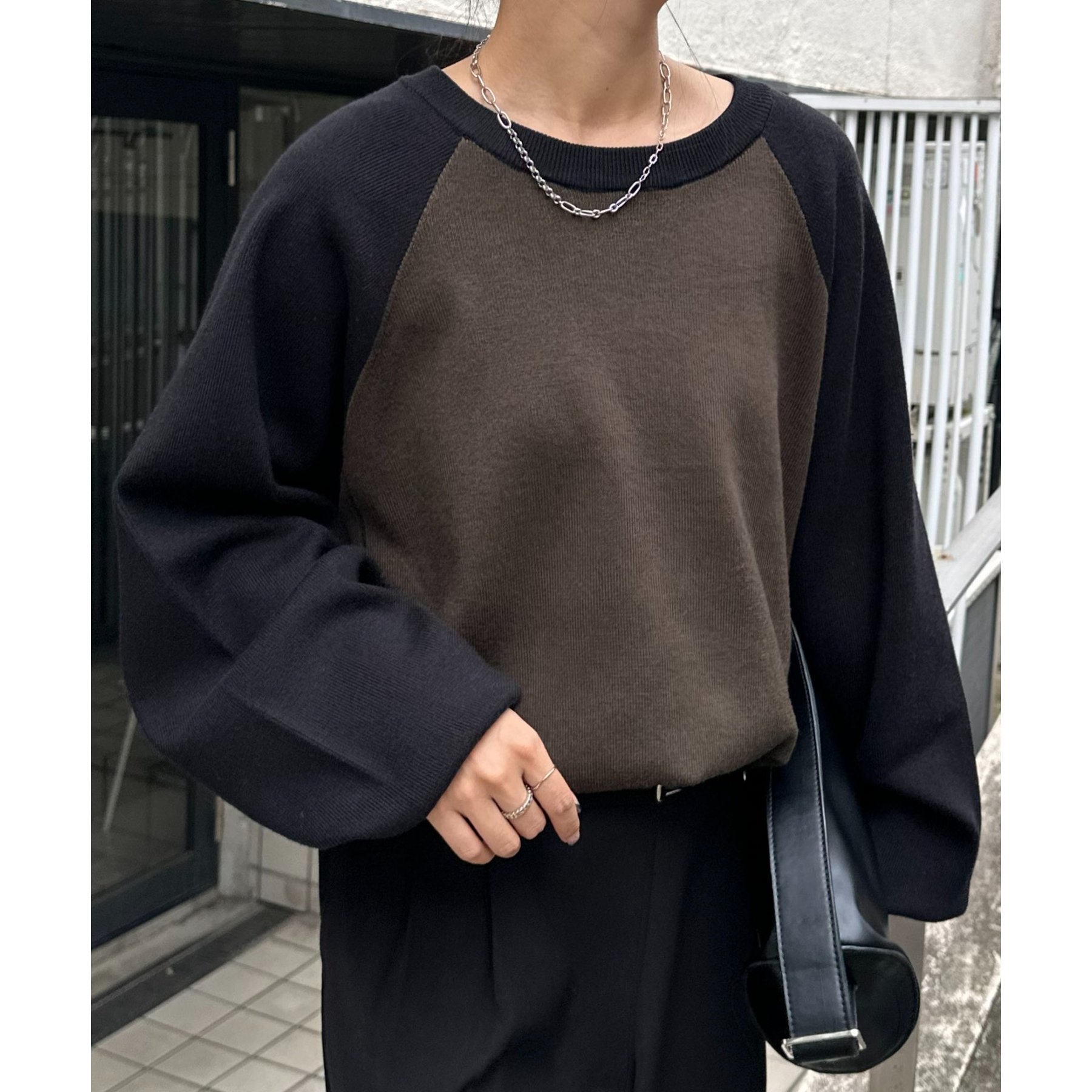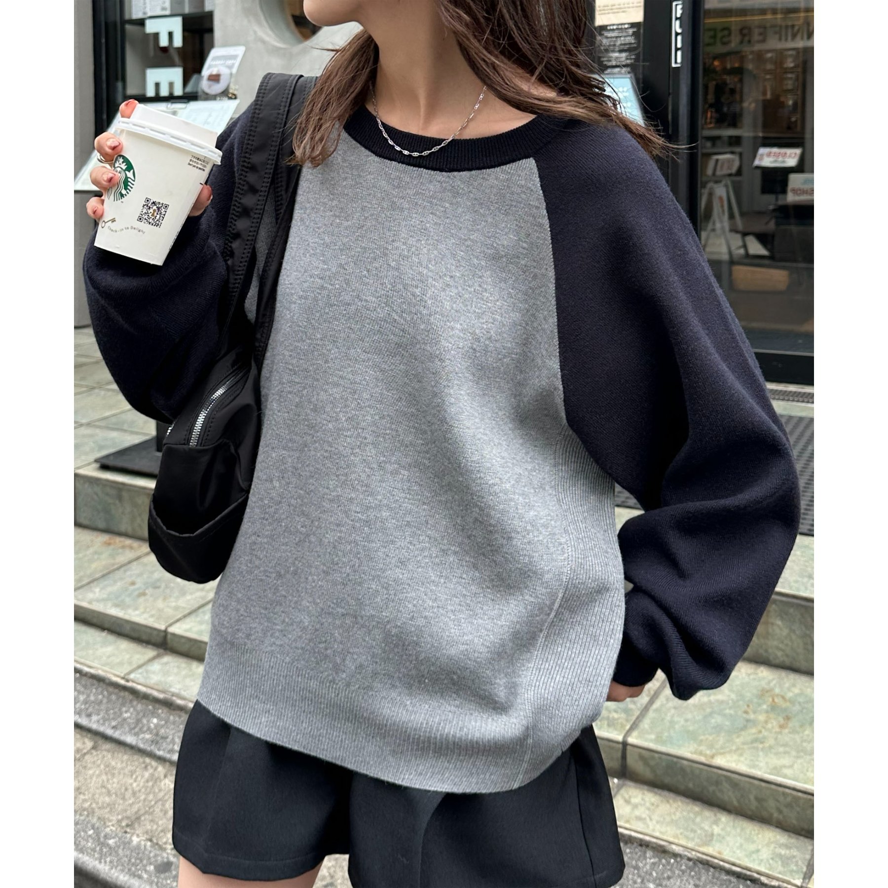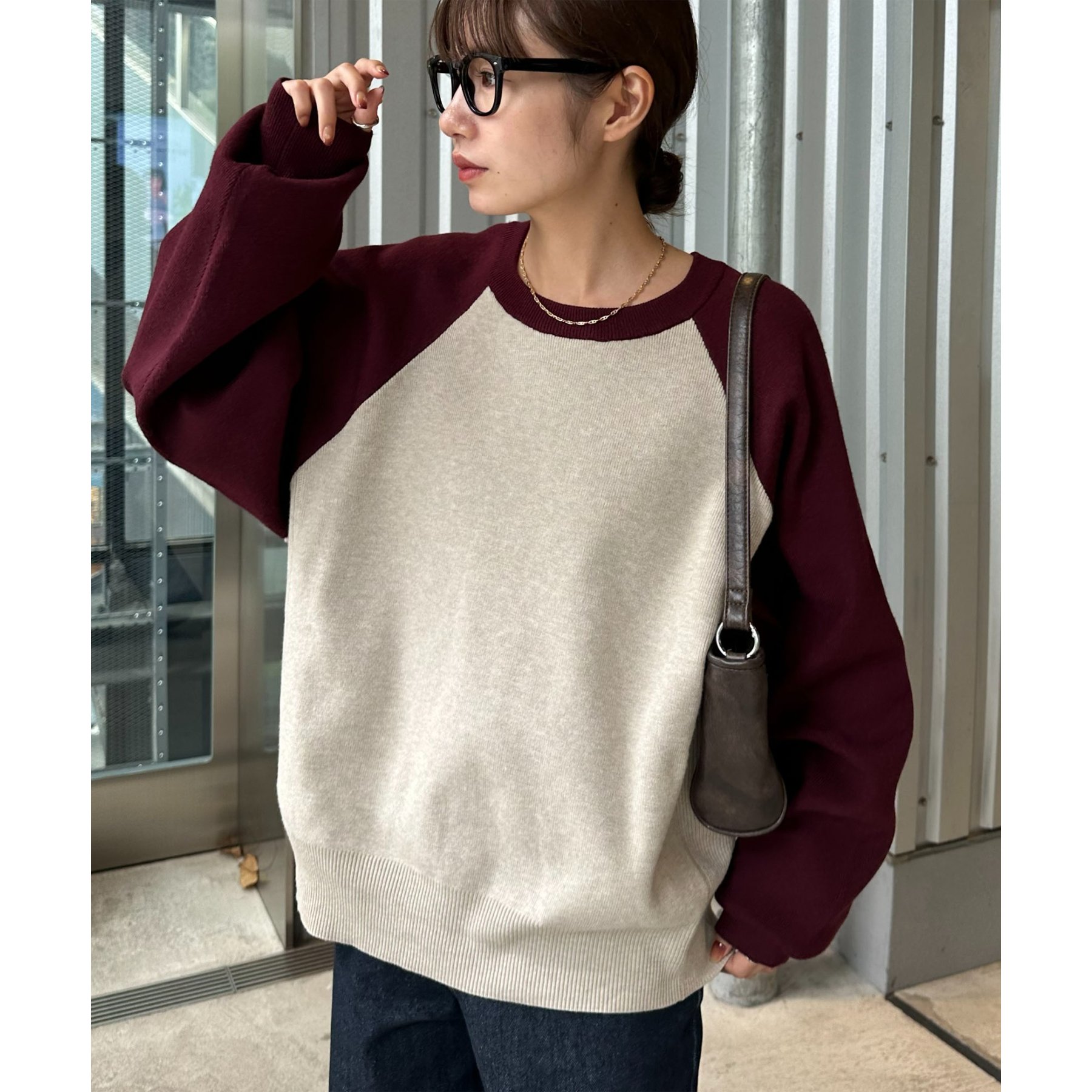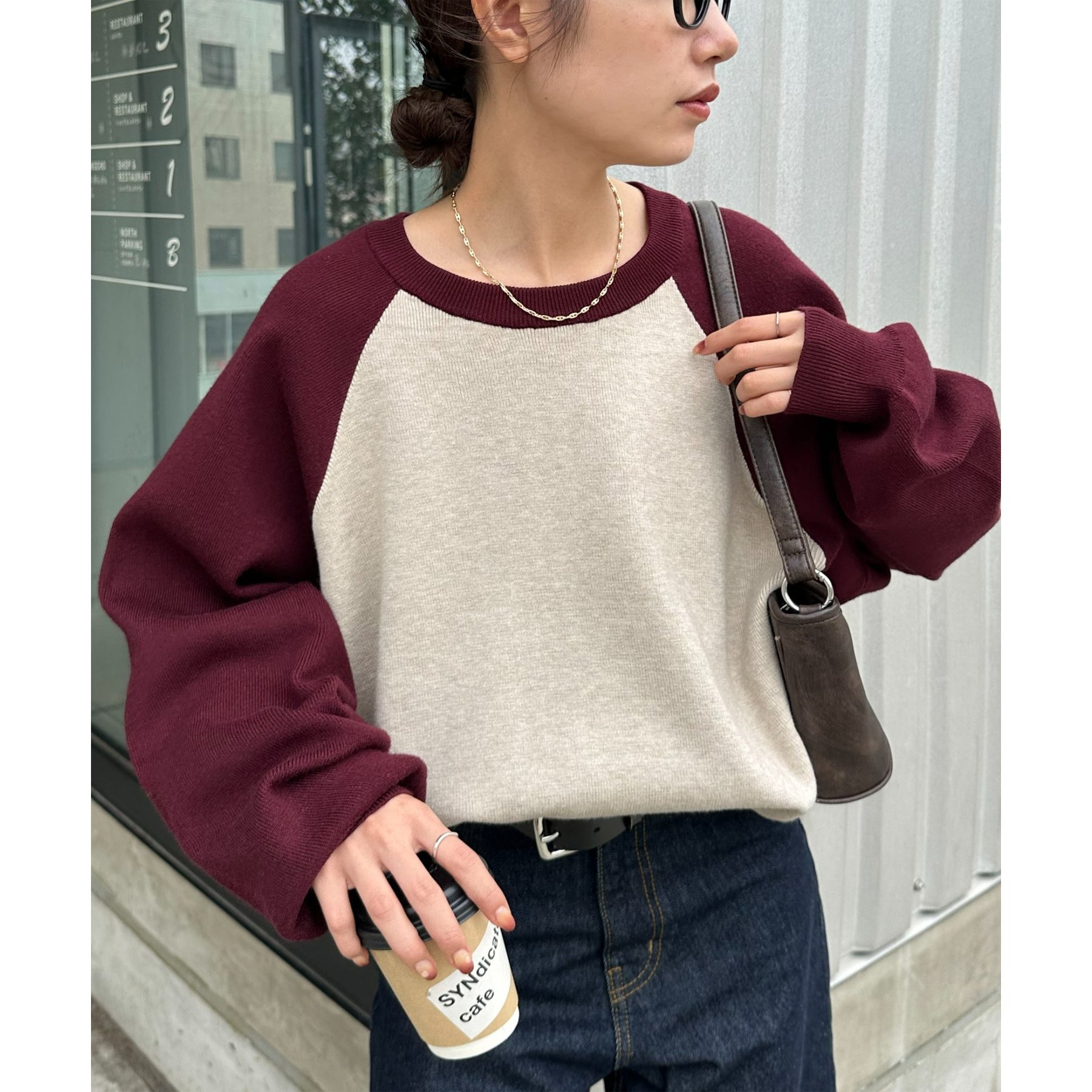 配色の切り替えが目を引く、ラグランスリーブデザインのニットプルオーバー。