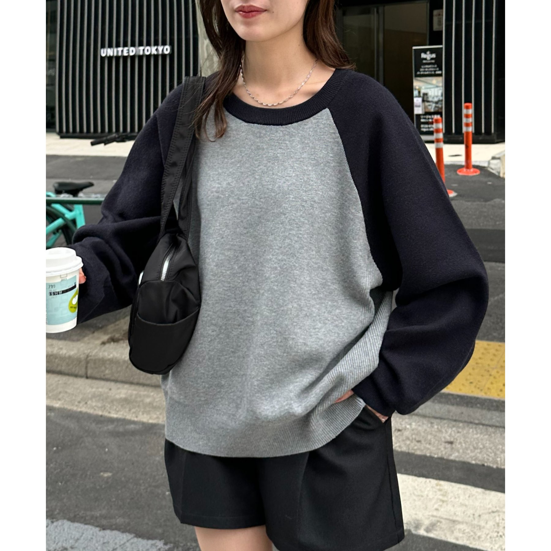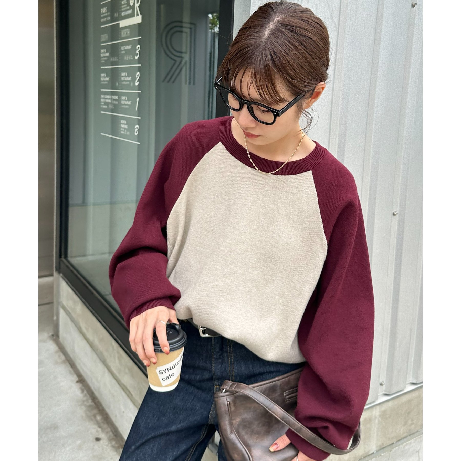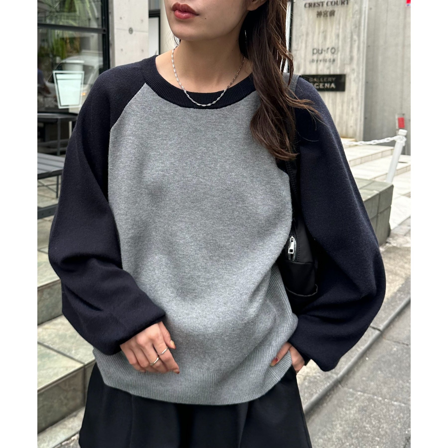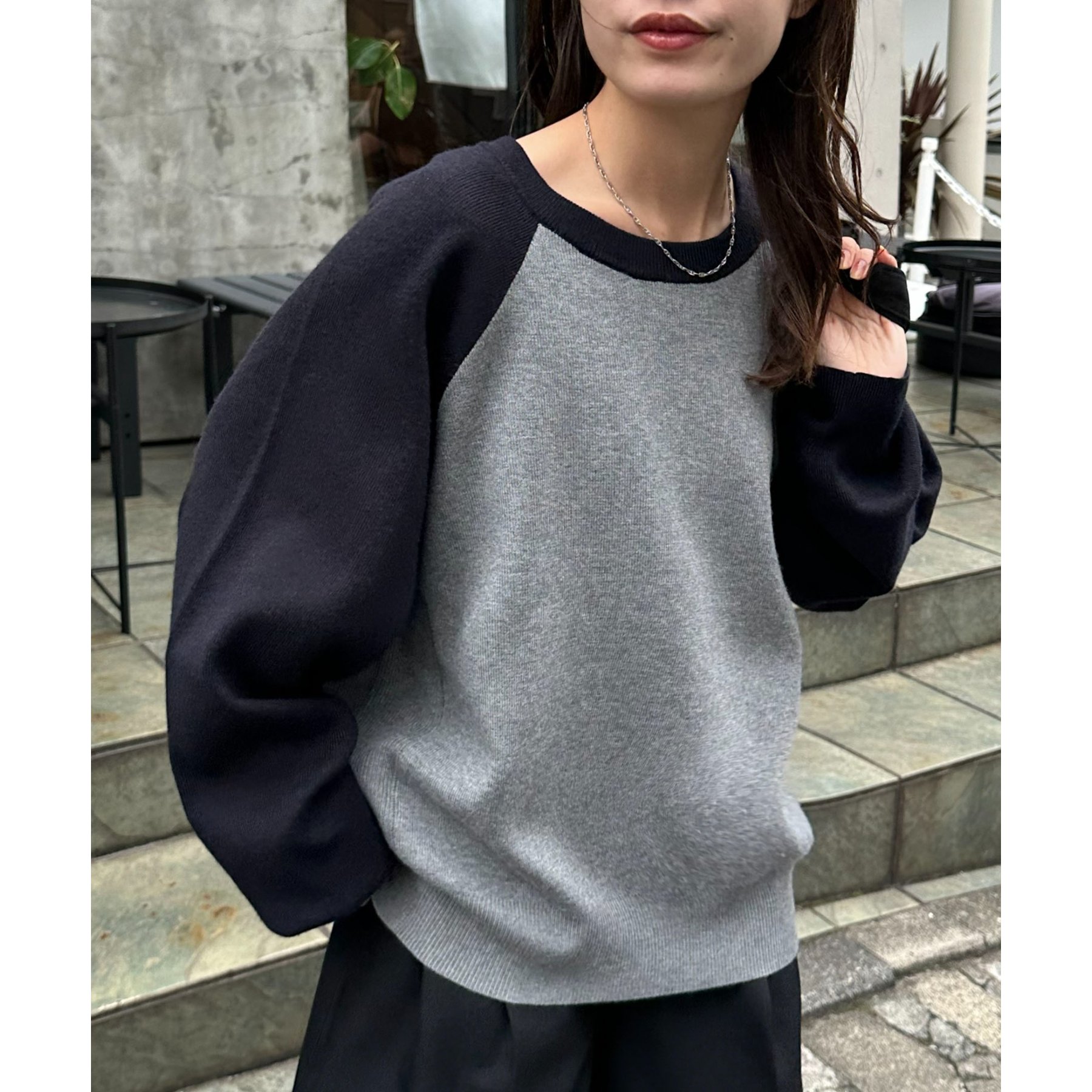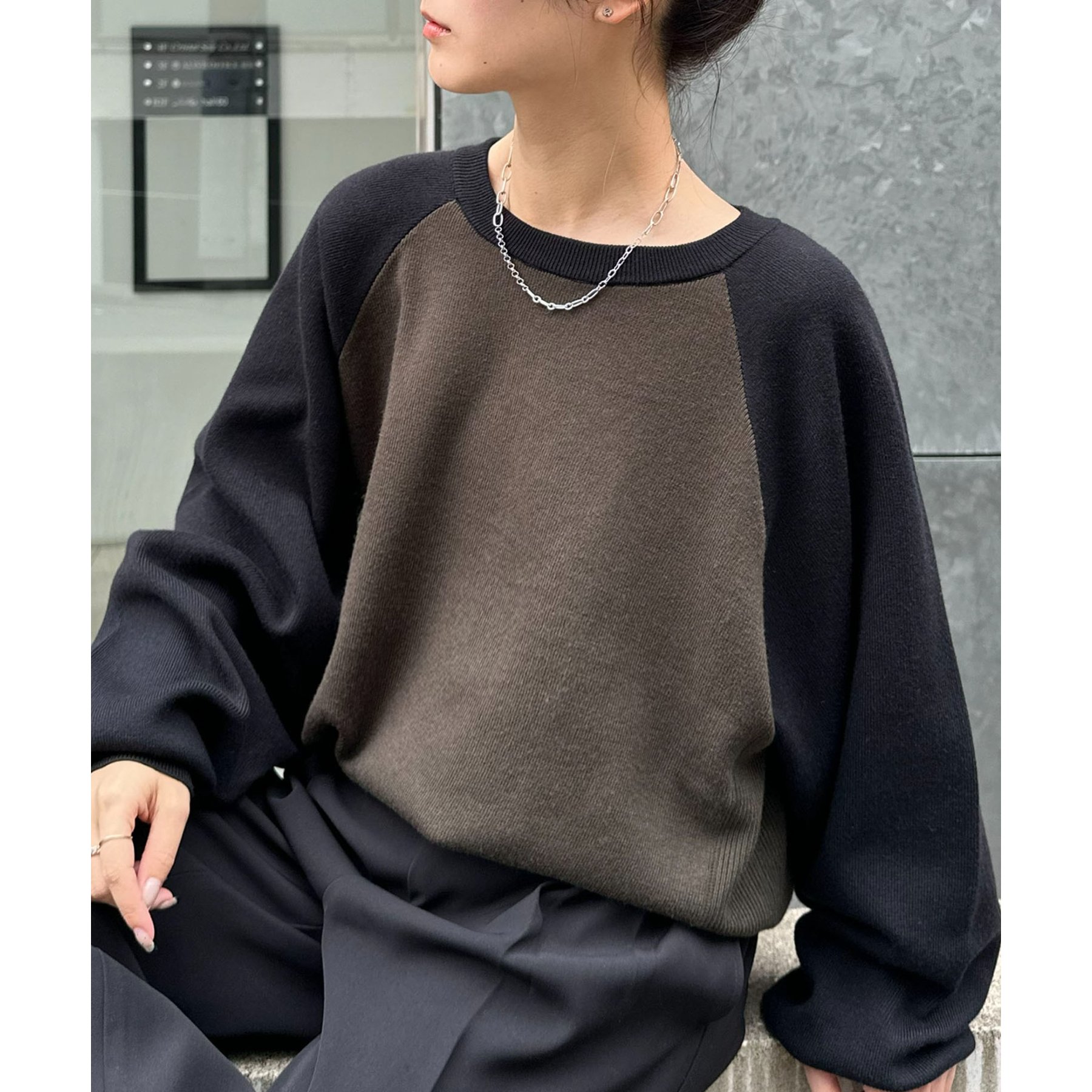 配色の切り替えが目を引く、ラグランスリーブデザインのニットプルオーバー。