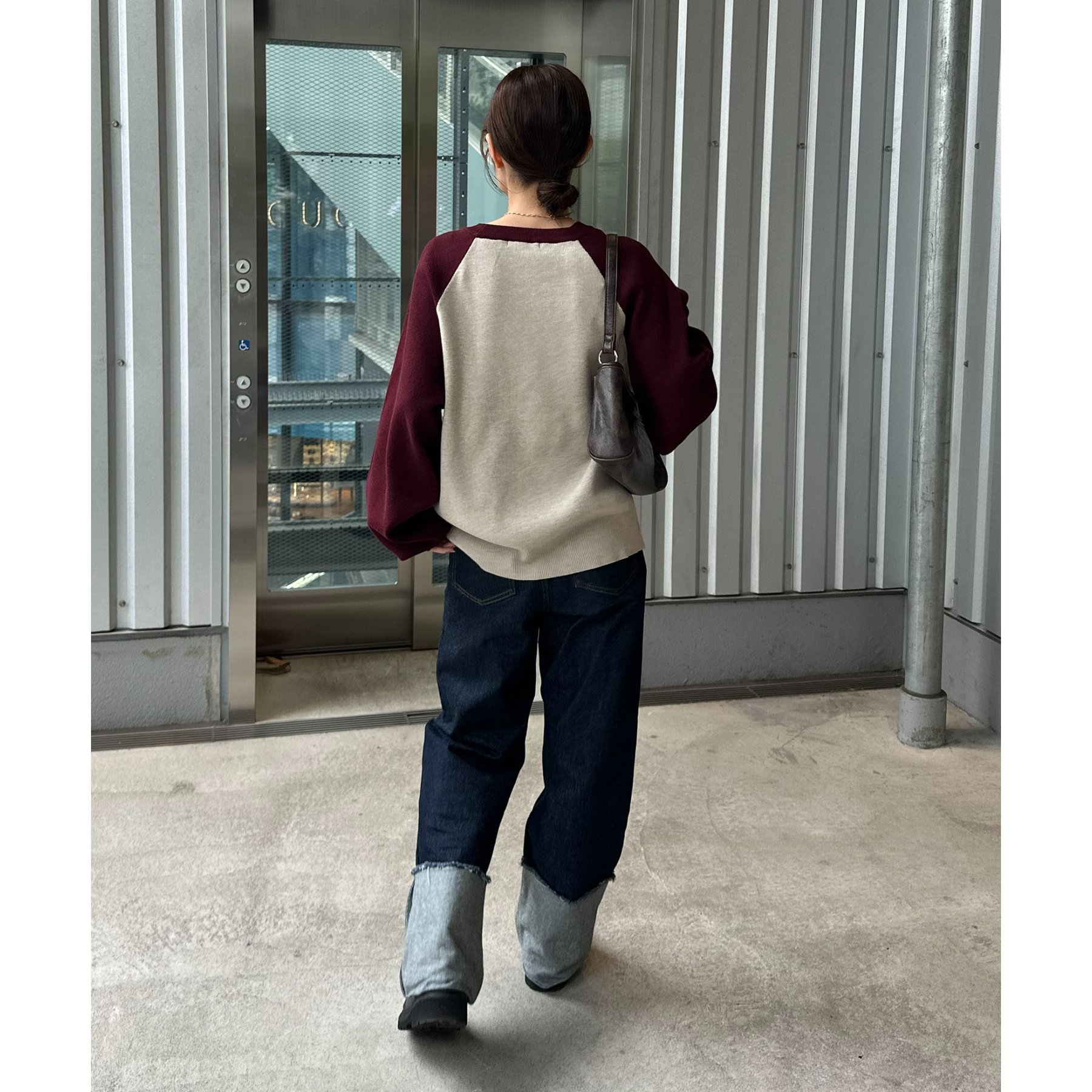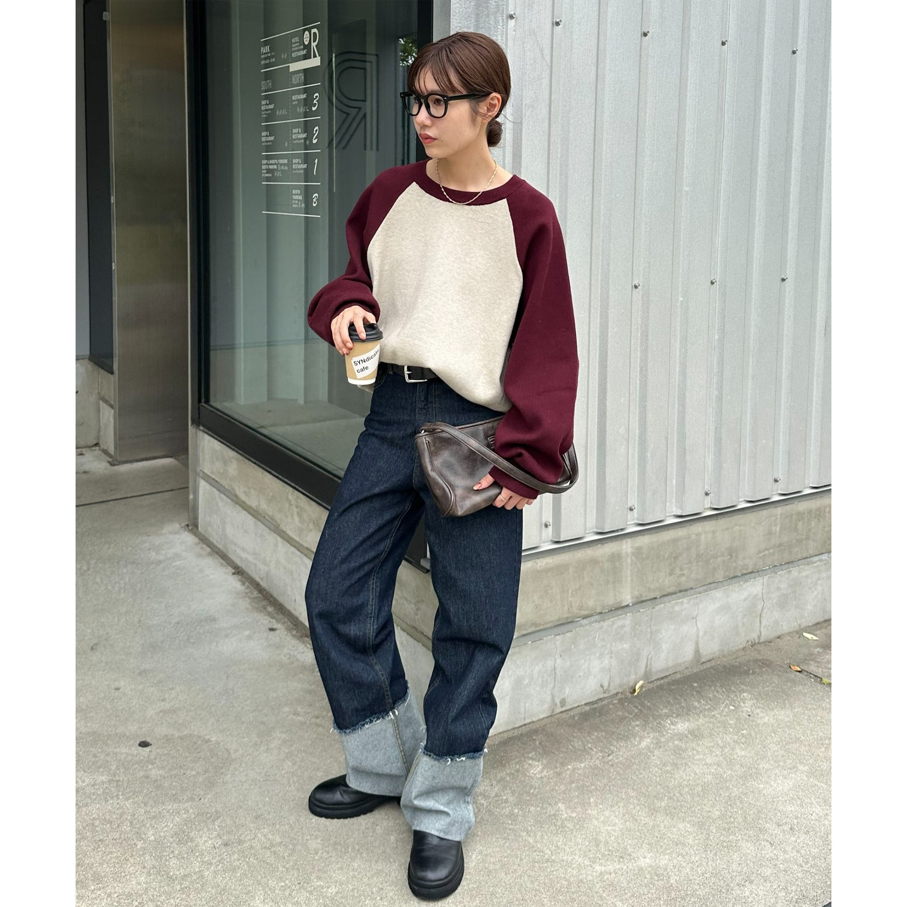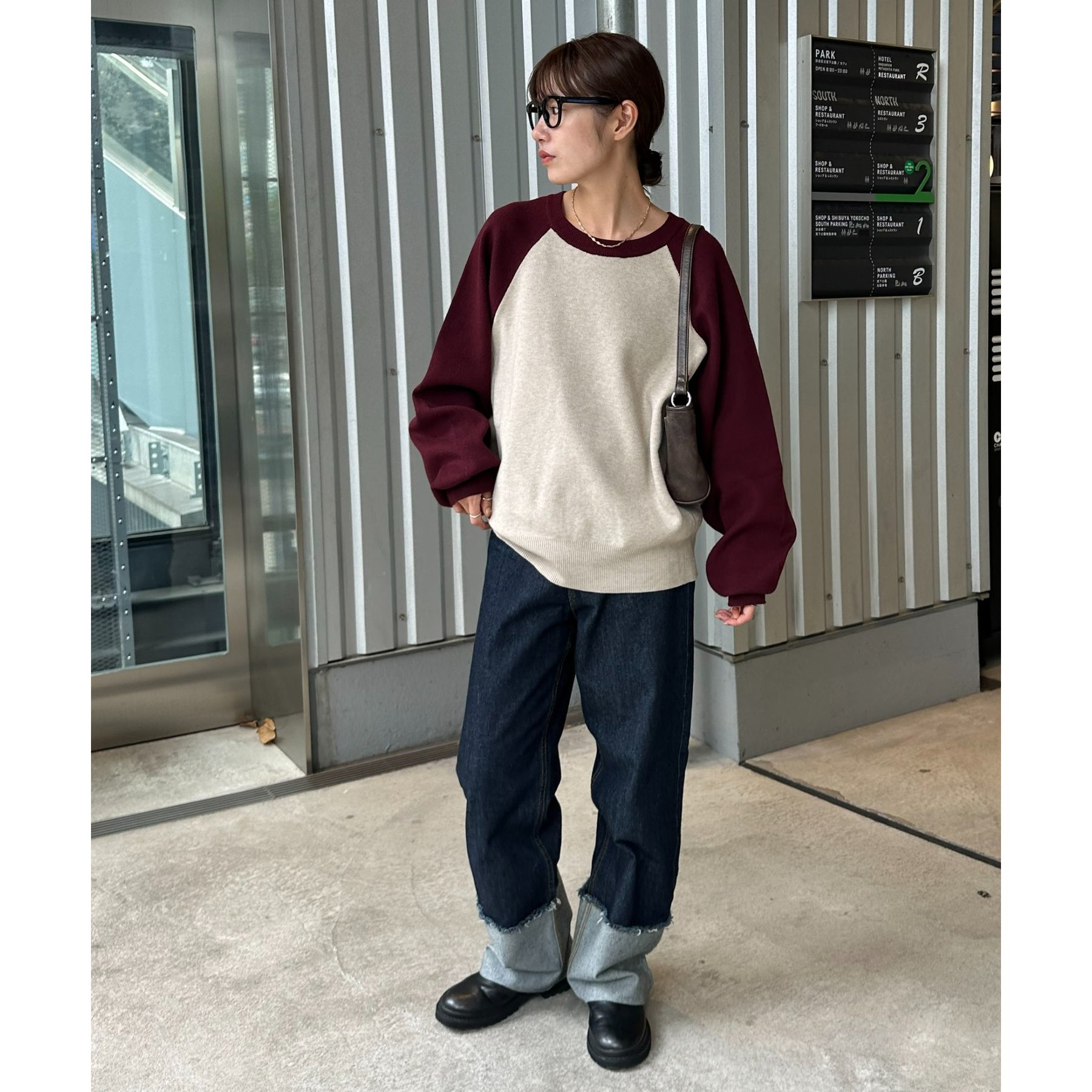 170cmメンズスタッフ:ゆったりとした着心地です。ラグランの配色デザインがポイントになるので、シンプルにデニム合わせやスラックス合わせでトップスを主役にしたコーデにしたいです。