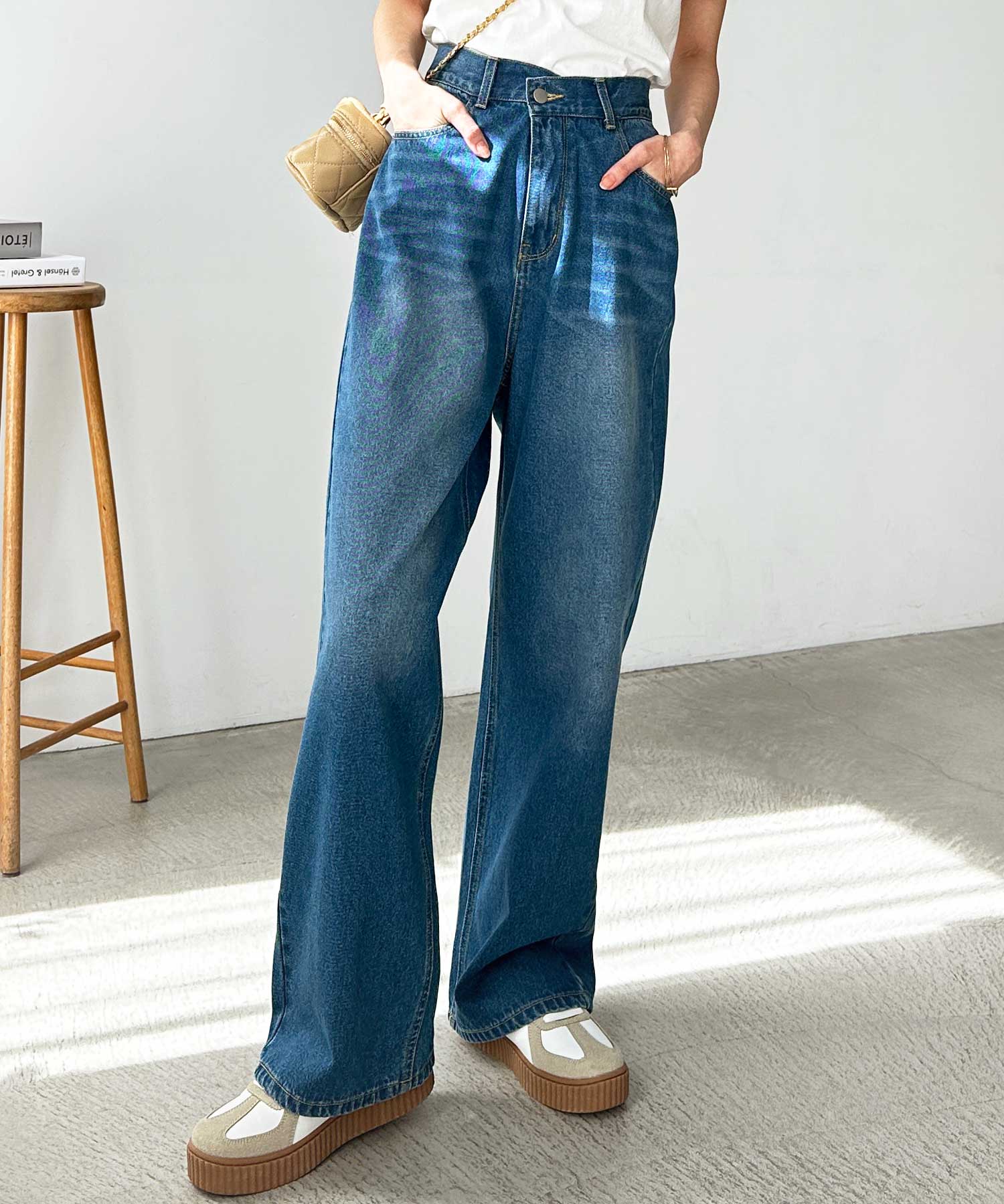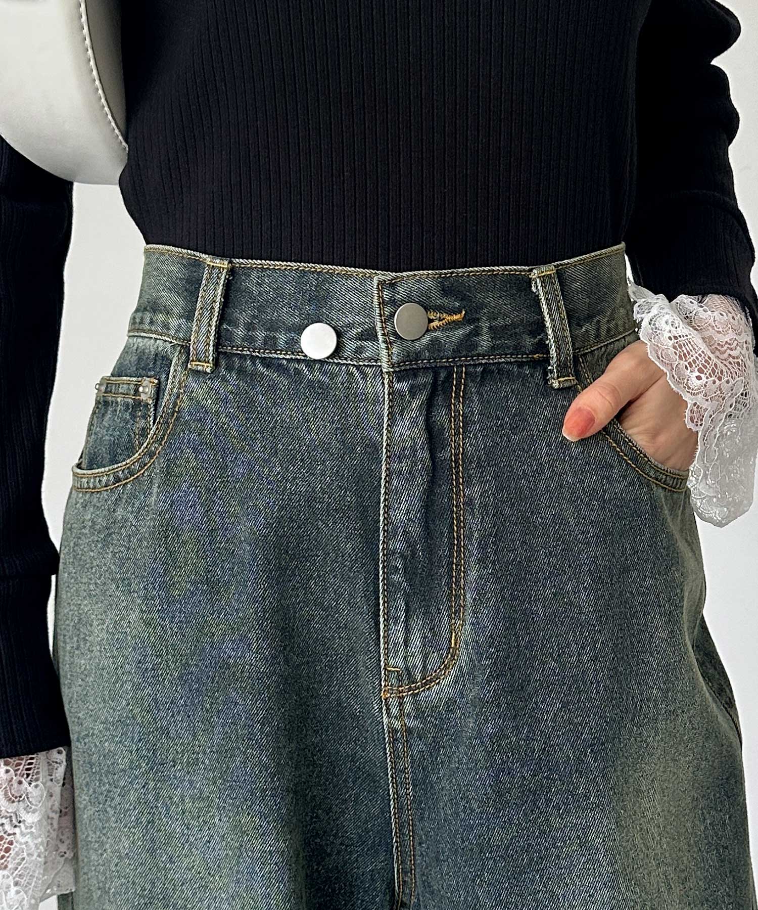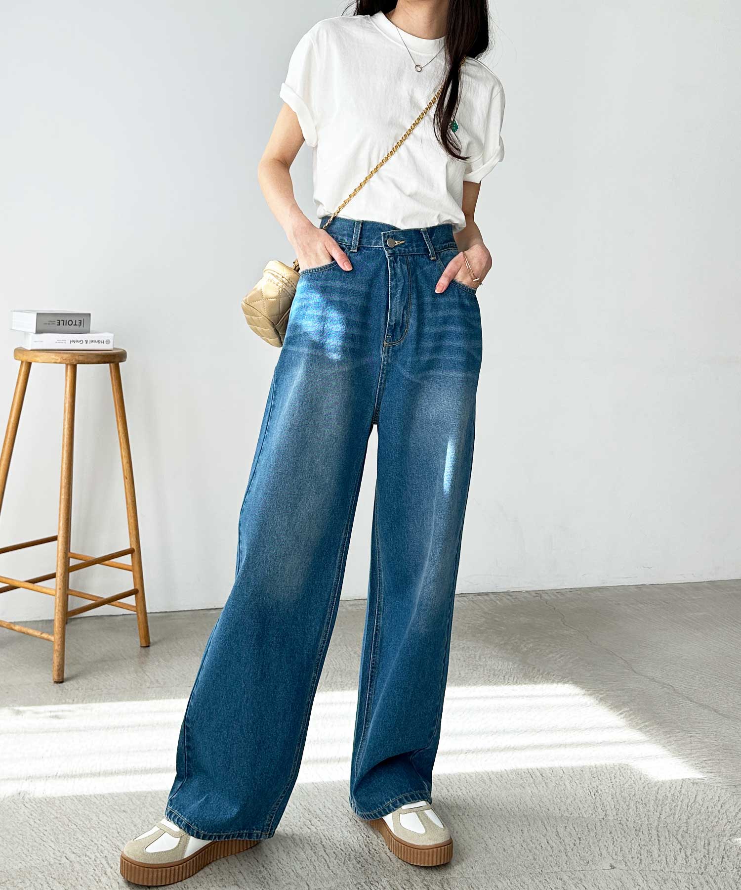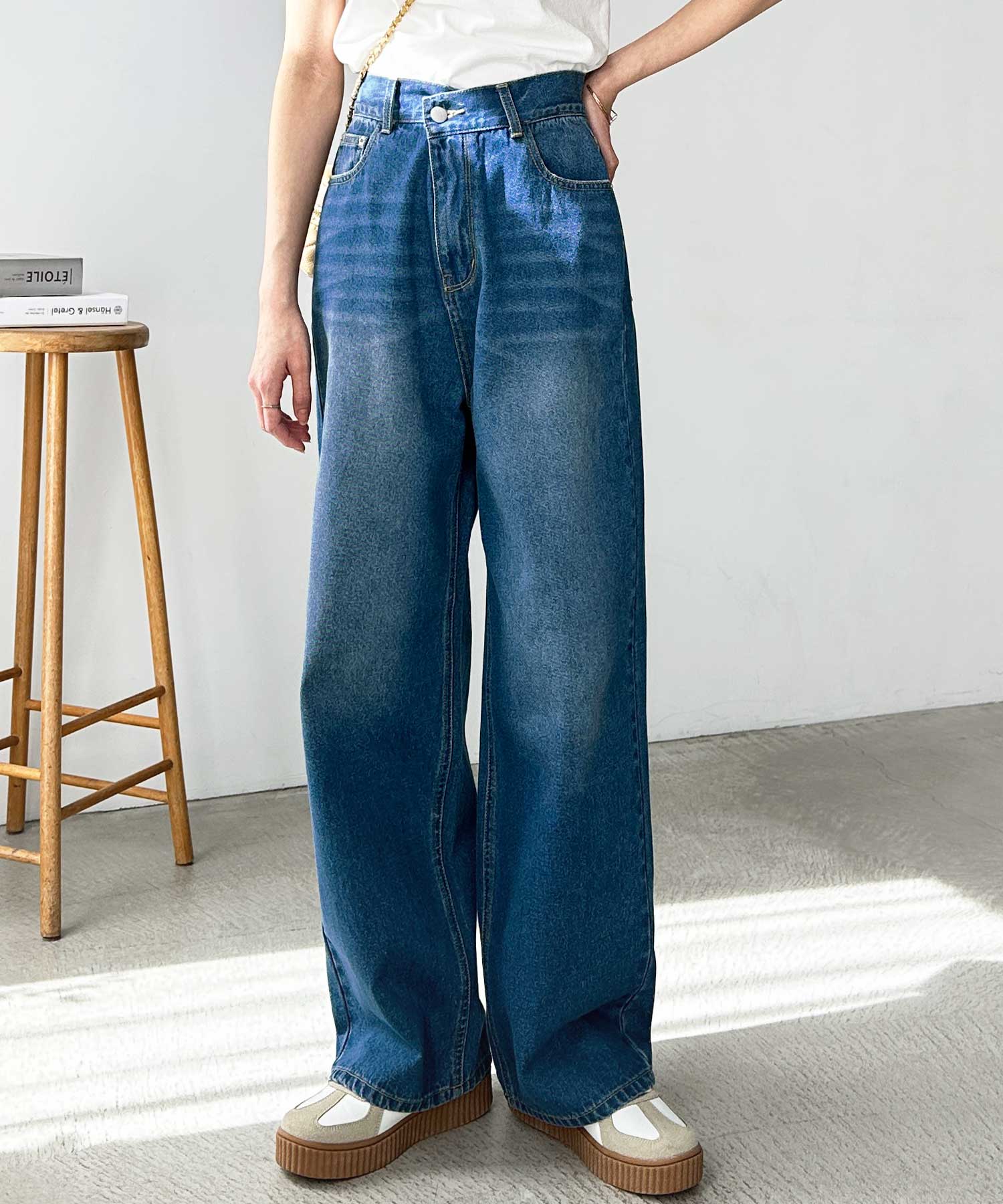 【ウエスト調節可】ウエスト2ボタンワイドストレートデニムパンツ