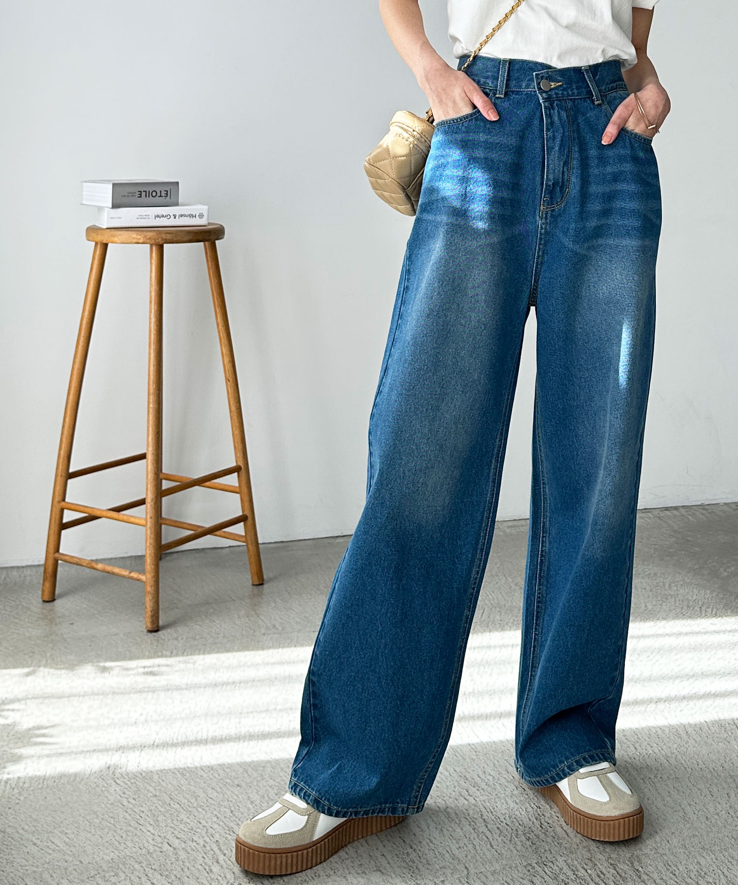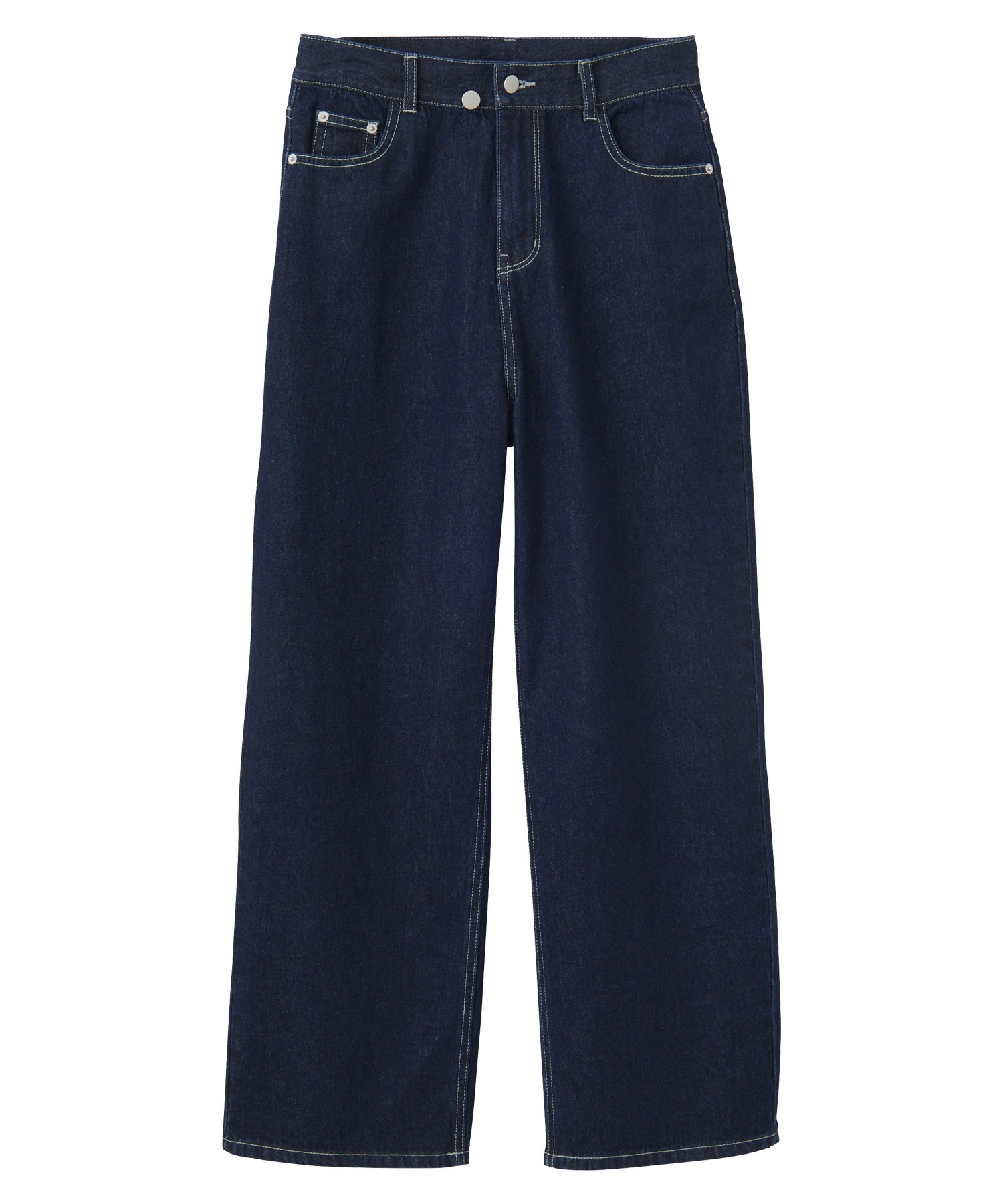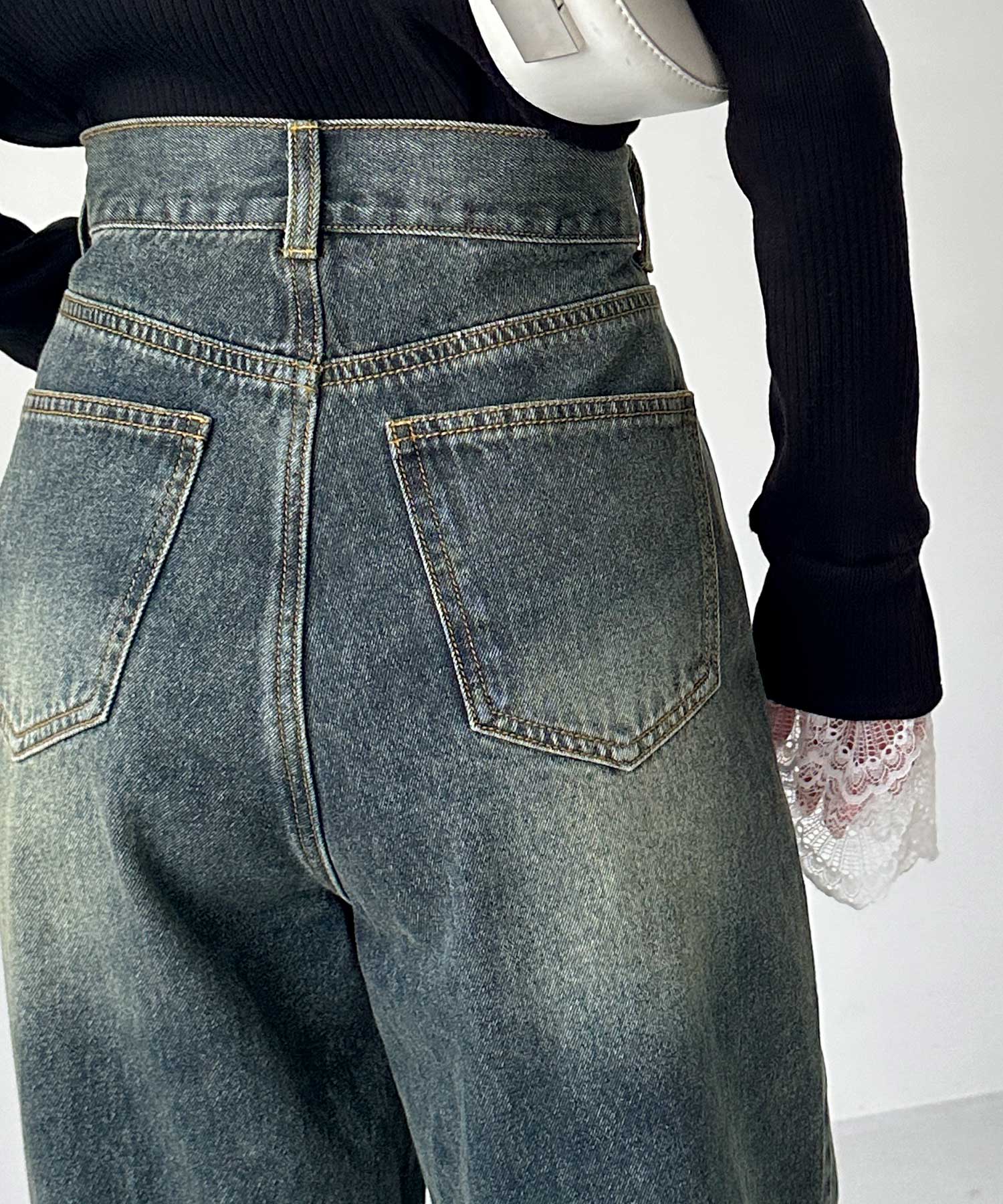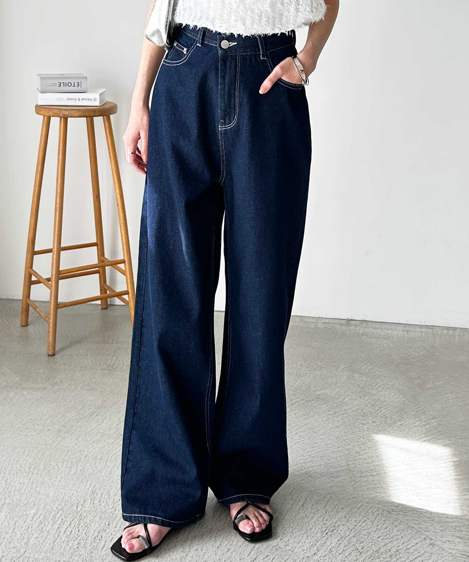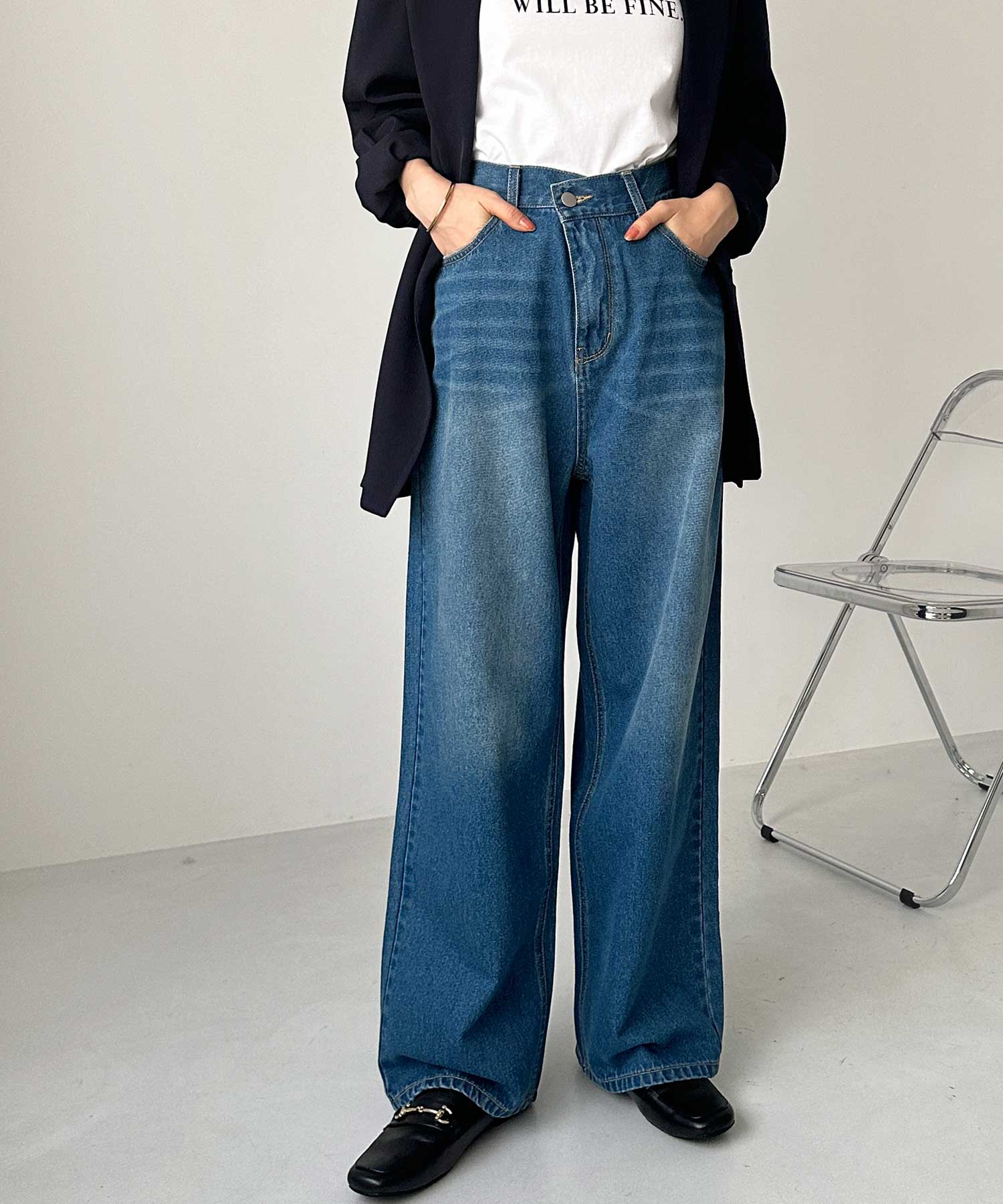 【ウエスト調節可】ウエスト2ボタンワイドストレートデニムパンツ