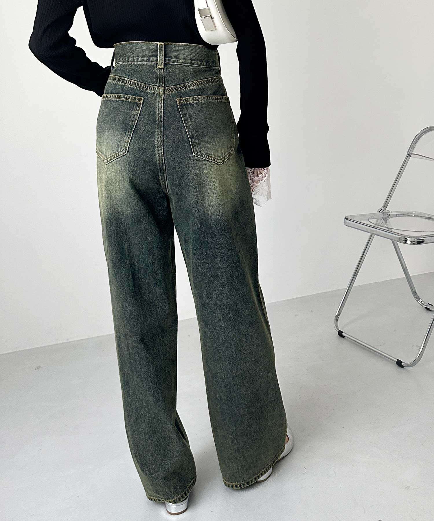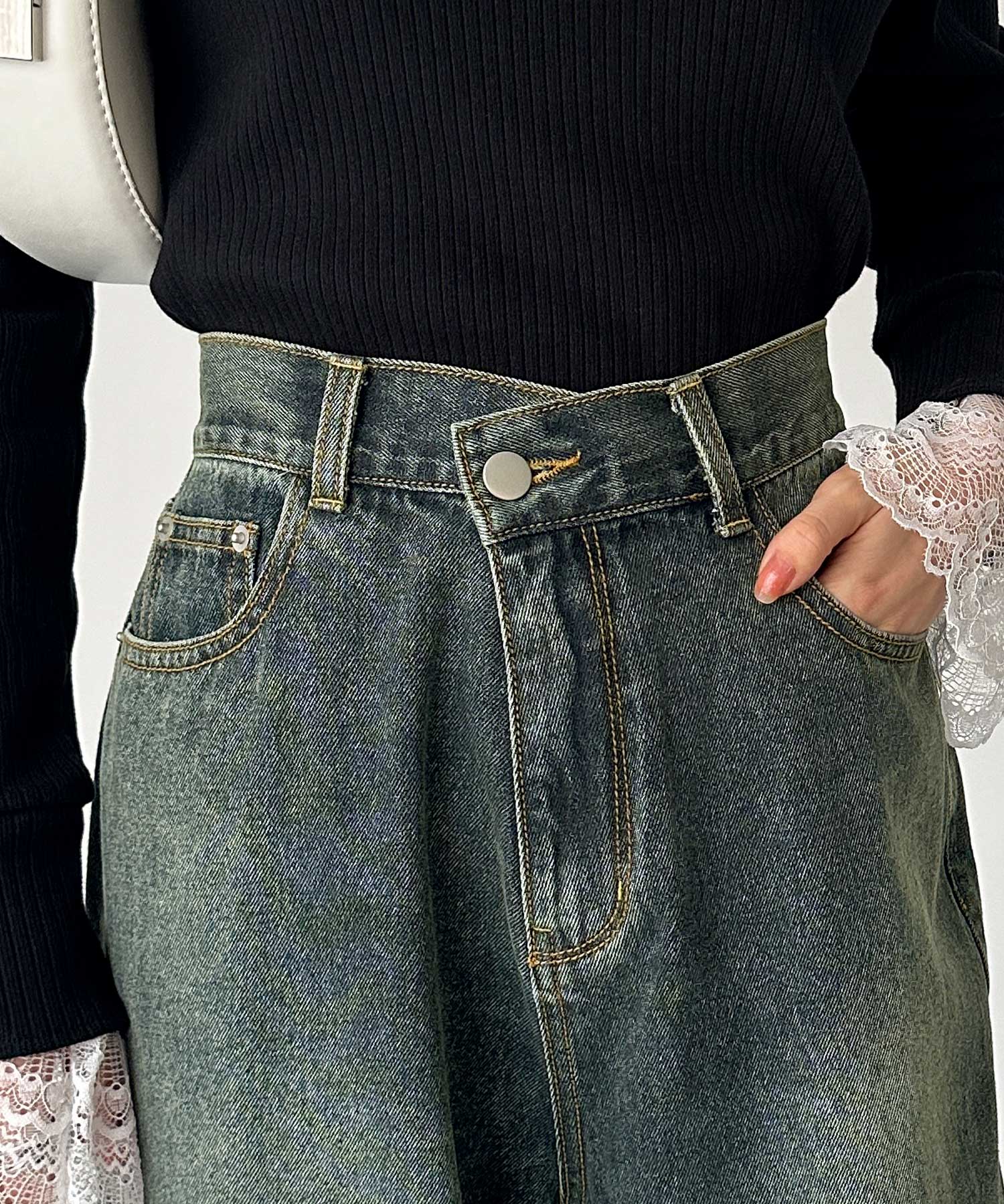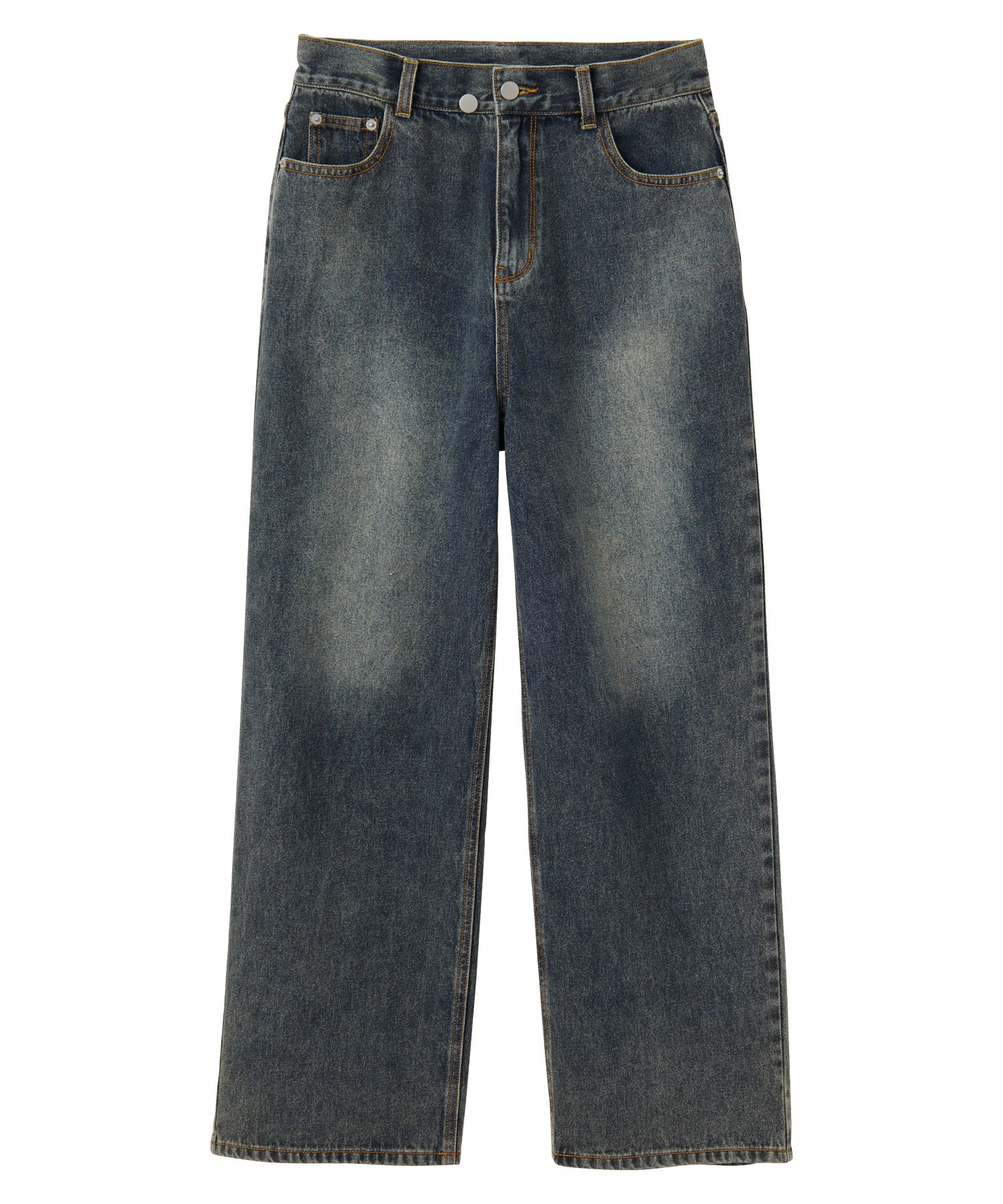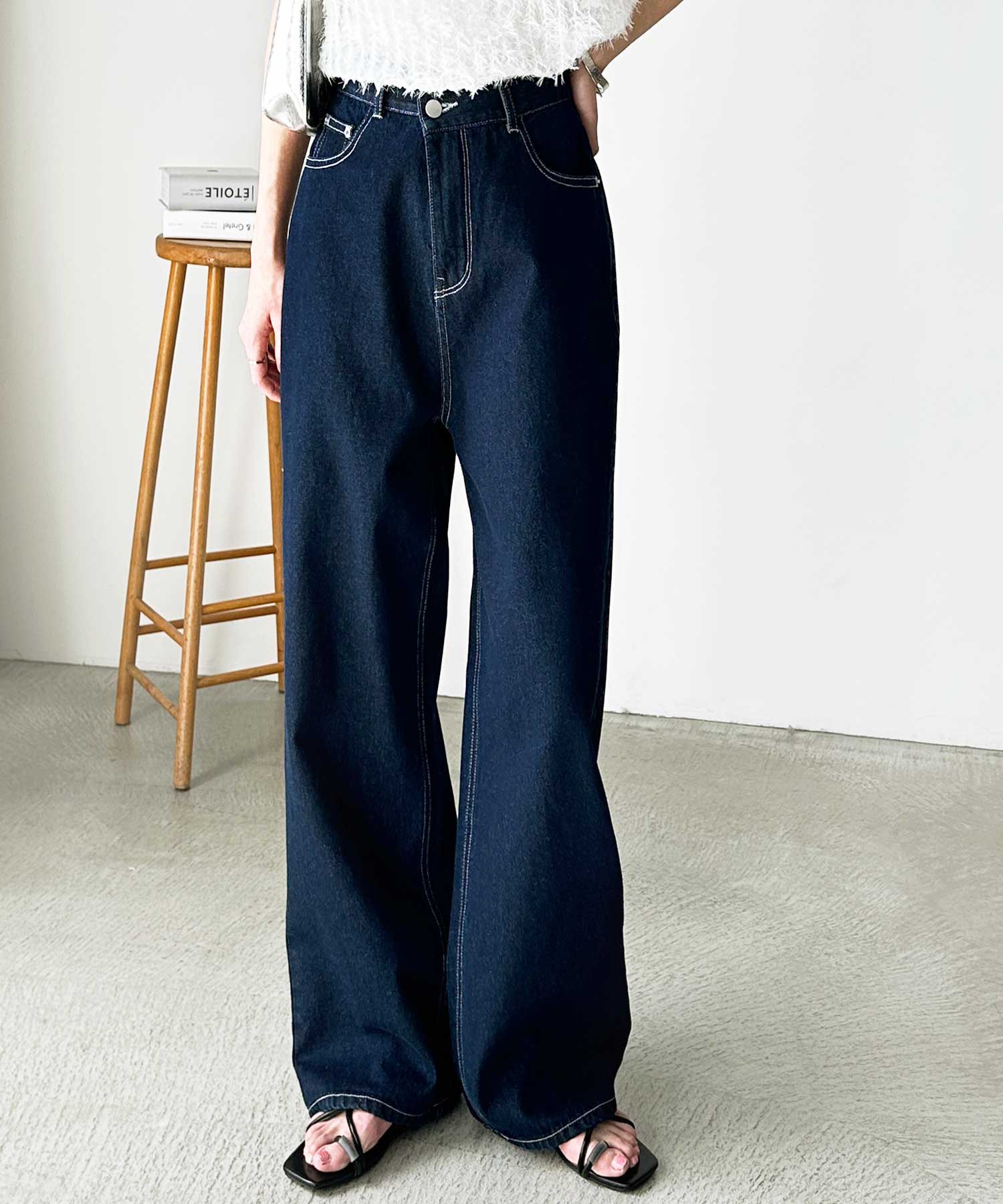 【ウエスト調節可】ウエスト2ボタンワイドストレートデニムパンツ