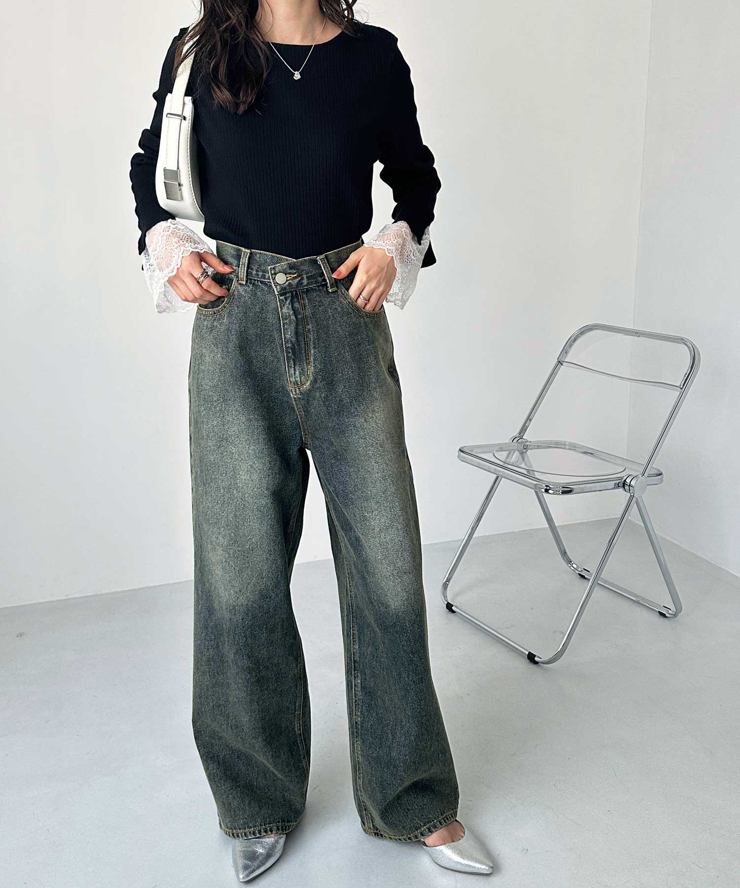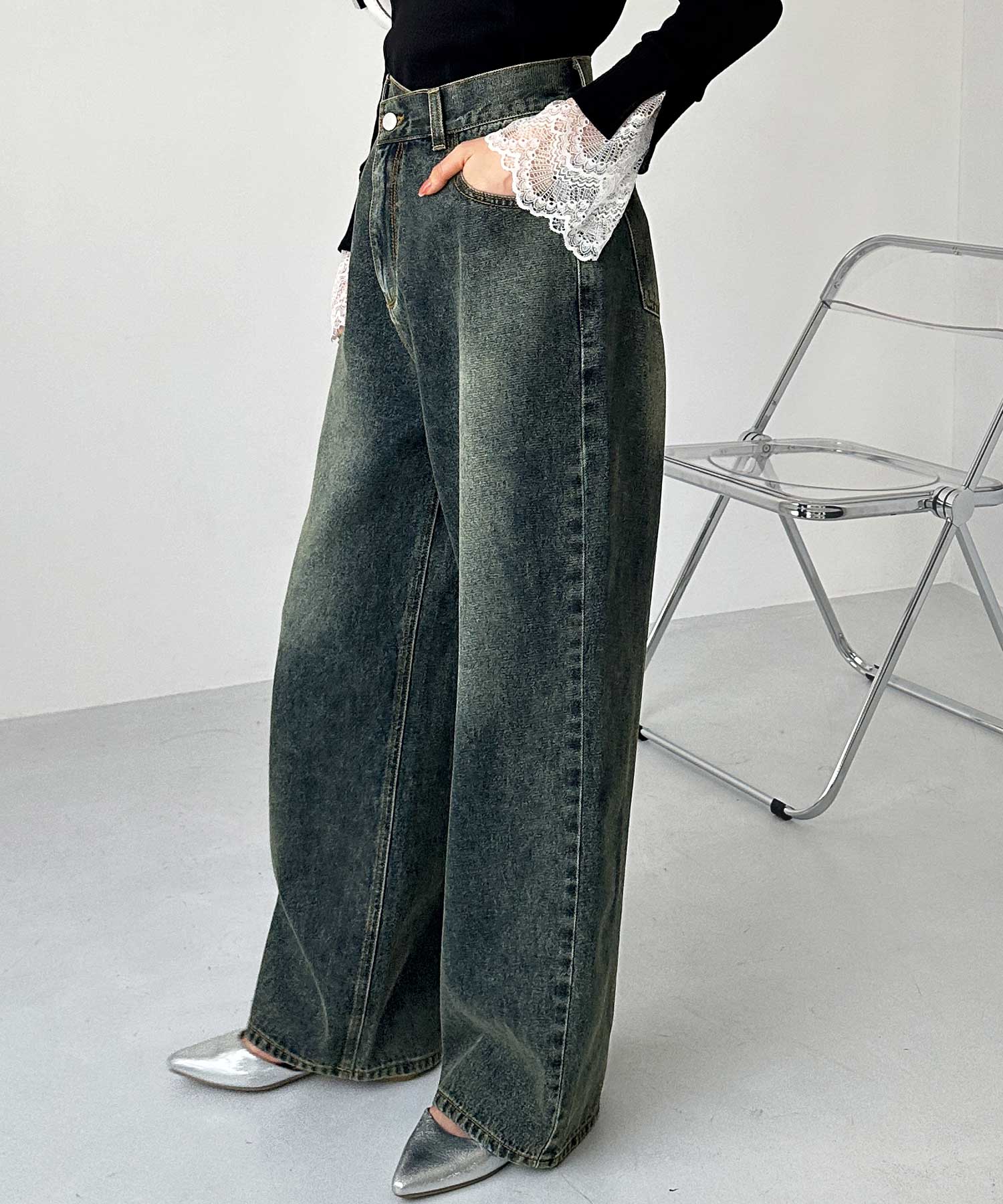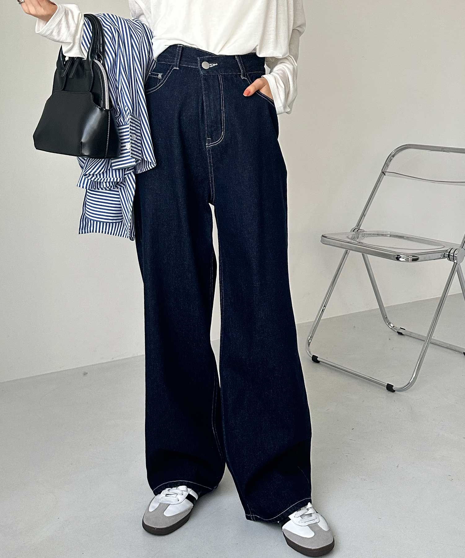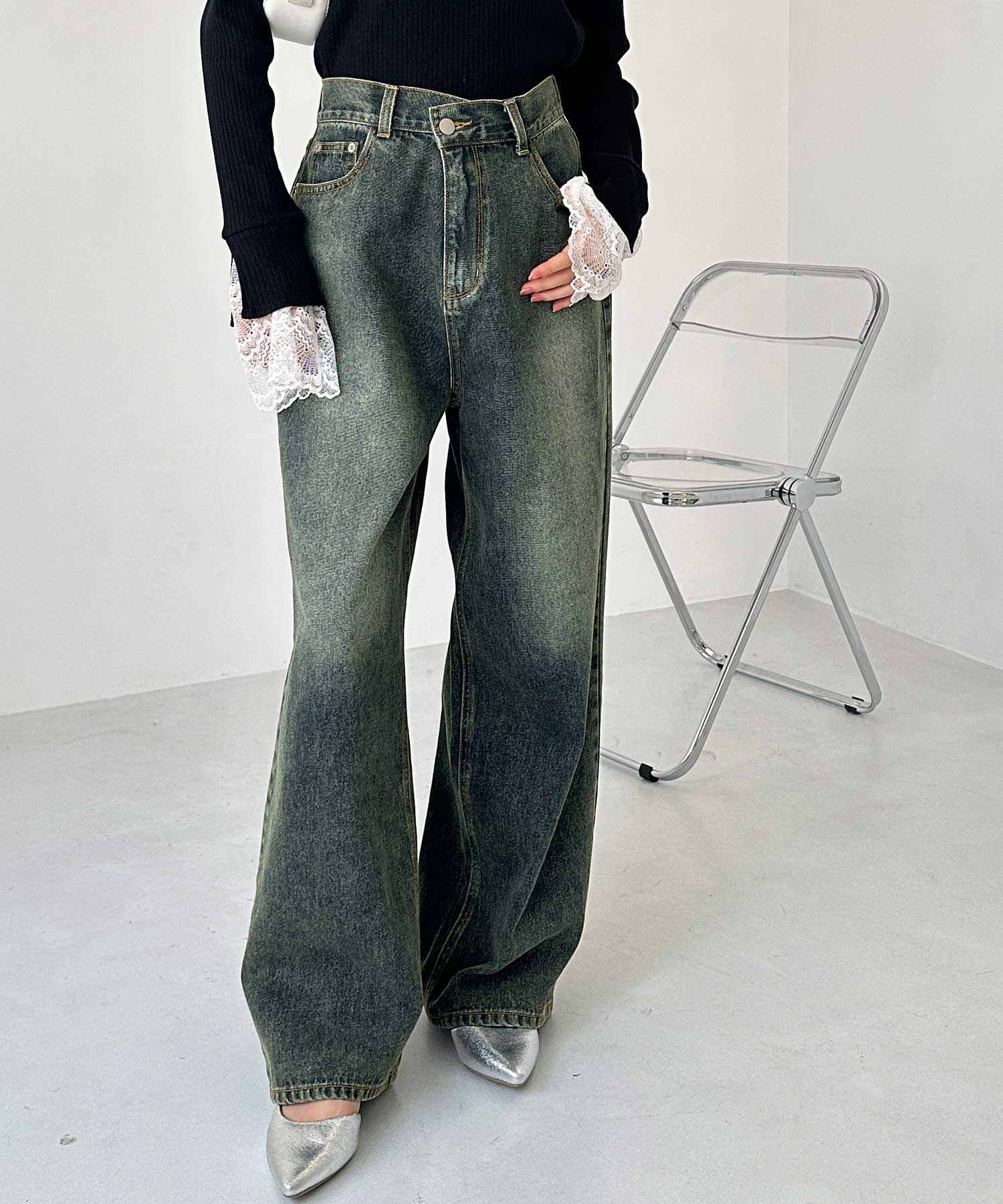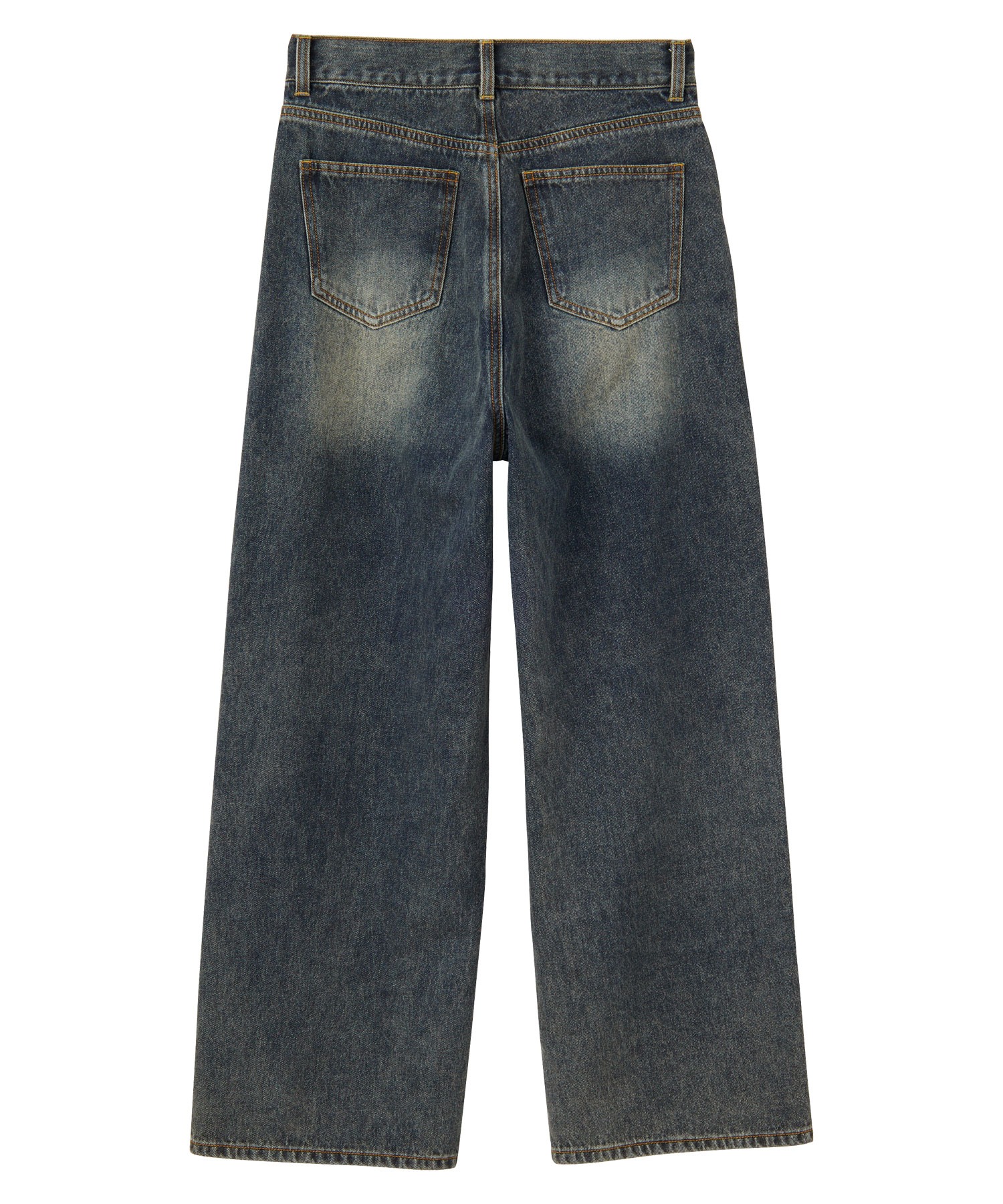 【ウエスト調節可】ウエスト2ボタンワイドストレートデニムパンツ