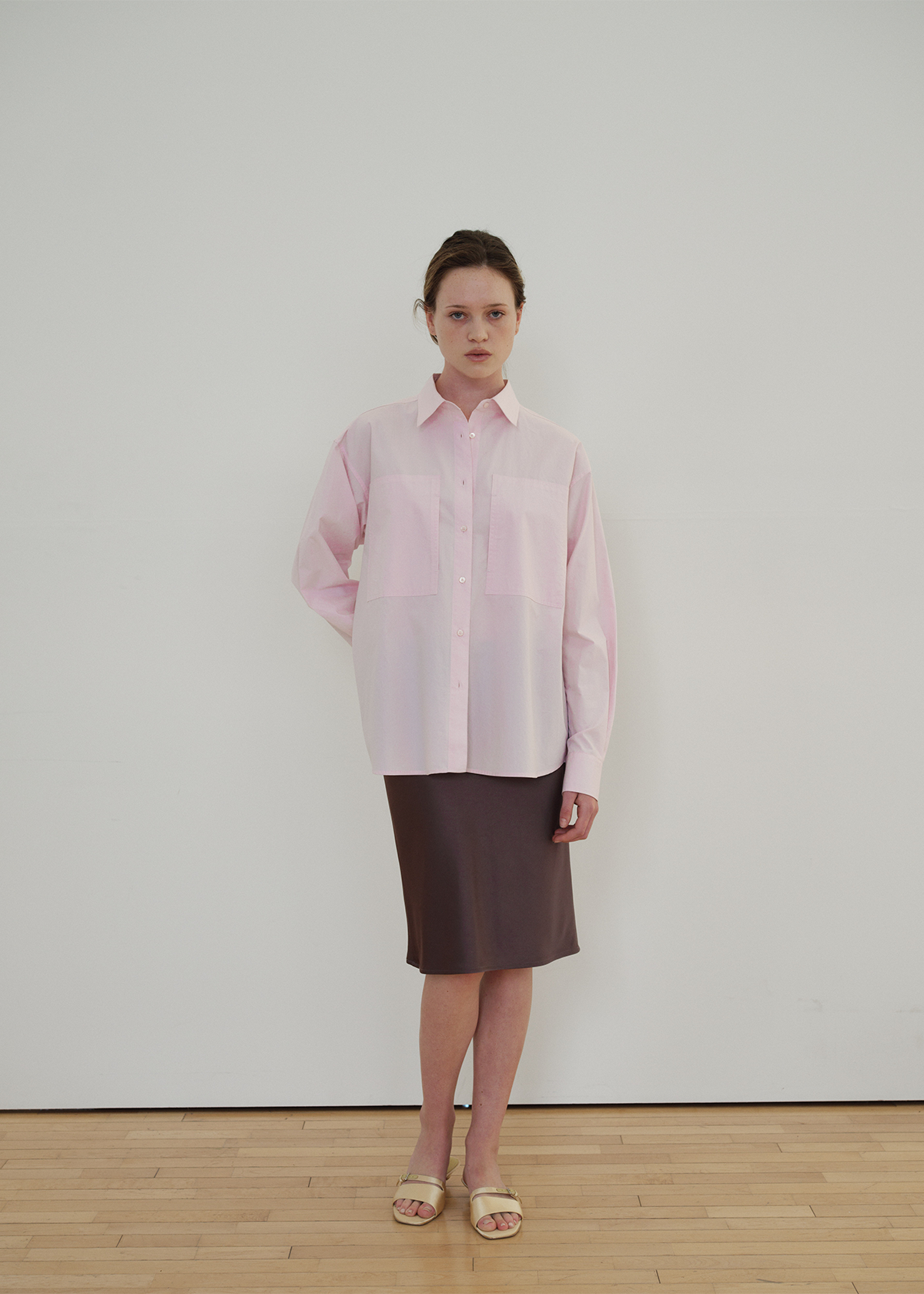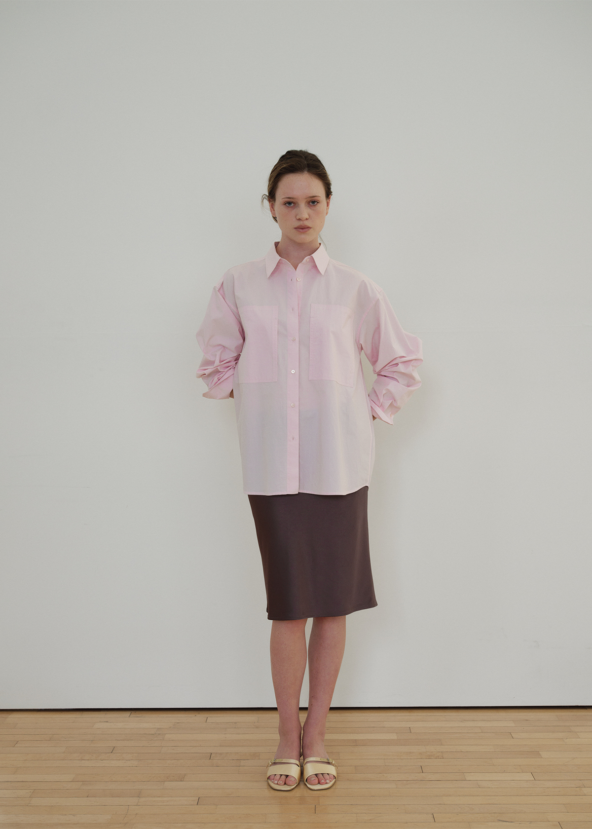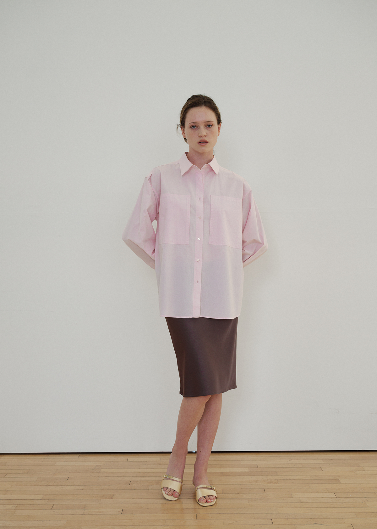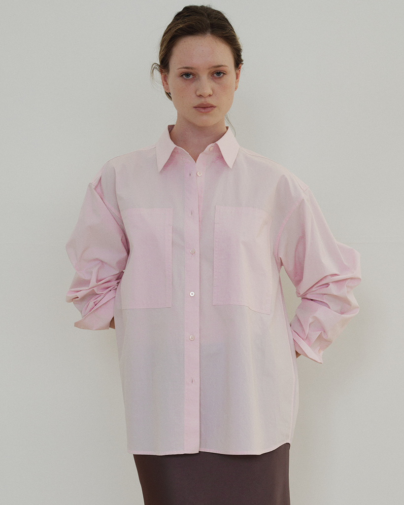 フロントには大きめのワイドチェストポケットを両側に配し、シャツ特有のフォーマルなムードにユーティリティ感をプラスしました。肩線が落ちるドロップショルダー構造と全体的にゆとりのあるシルエットが快適な着用感を与えます。袖はカフスボタンとスリットディテールで仕上げ、背面にはヨーク切り替えとピンタックを加えて立体的なシルエットを演出します。