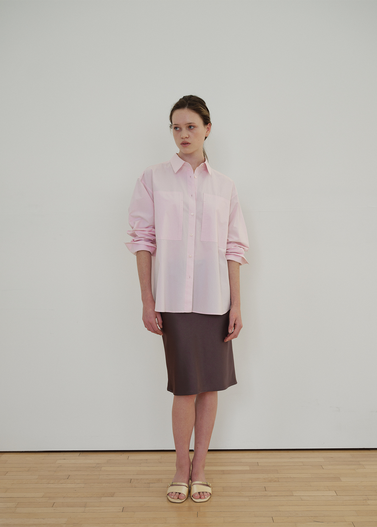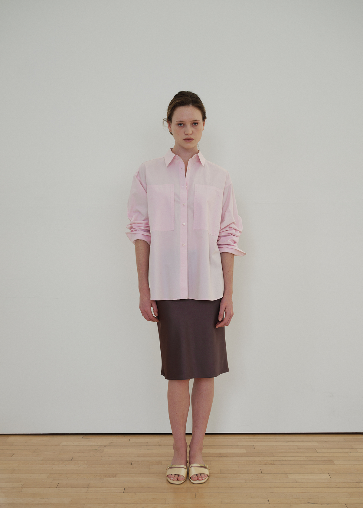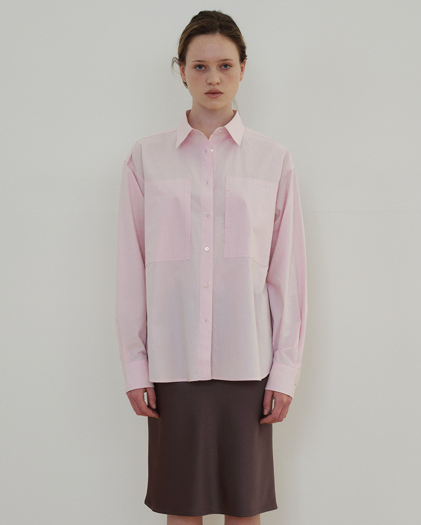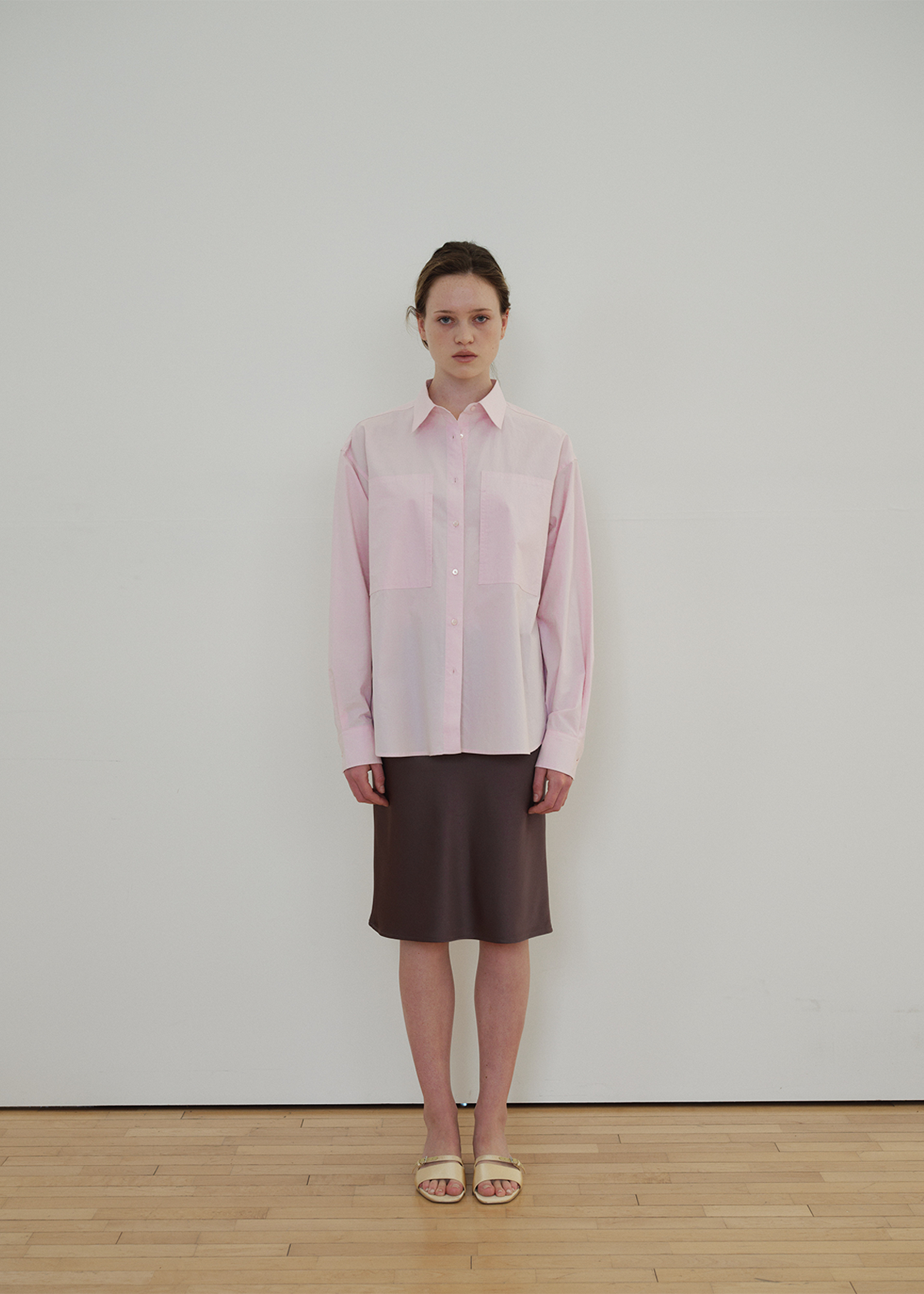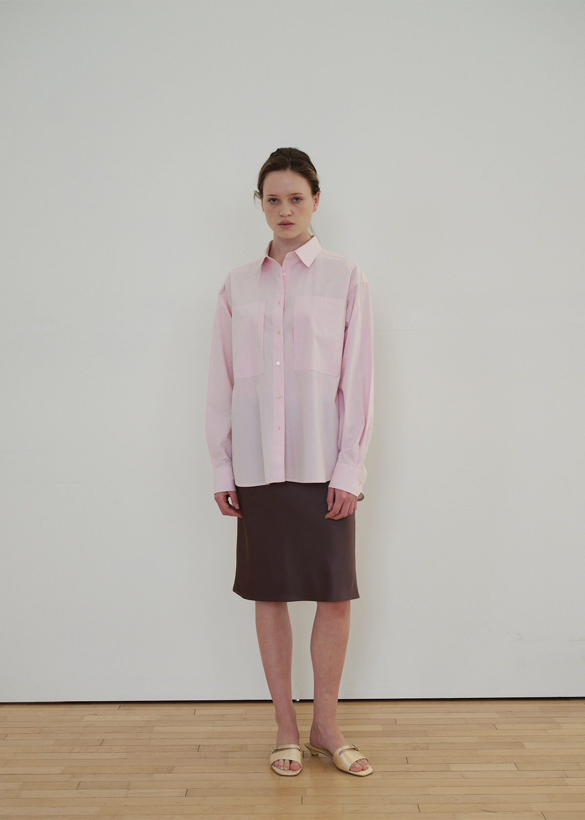 フロントには大きめのワイドチェストポケットを両側に配し、シャツ特有のフォーマルなムードにユーティリティ感をプラスしました。肩線が落ちるドロップショルダー構造と全体的にゆとりのあるシルエットが快適な着用感を与えます。袖はカフスボタンとスリットディテールで仕上げ、背面にはヨーク切り替えとピンタックを加えて立体的なシルエットを演出します。