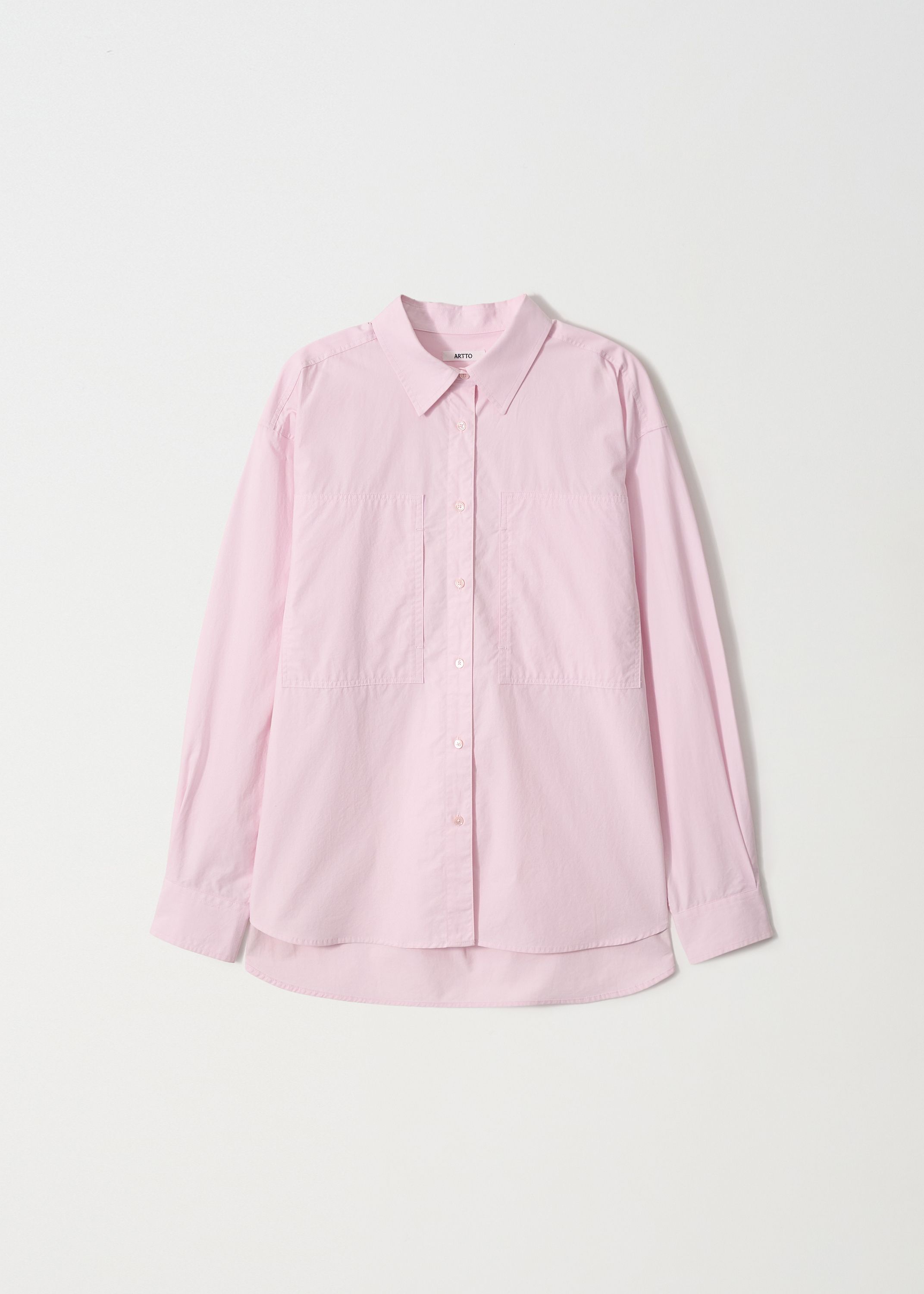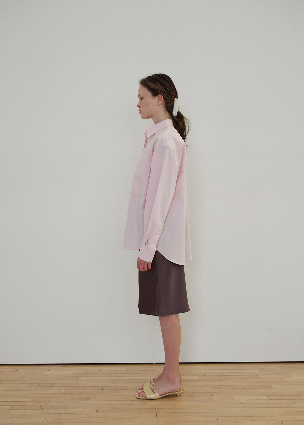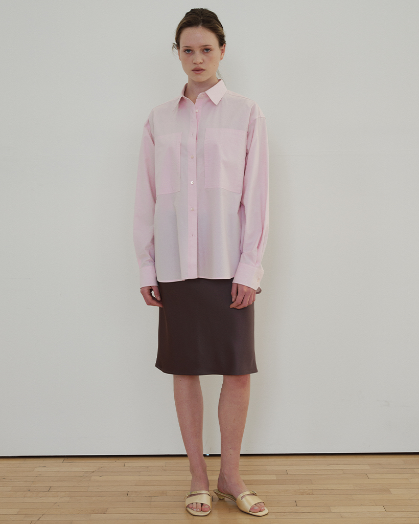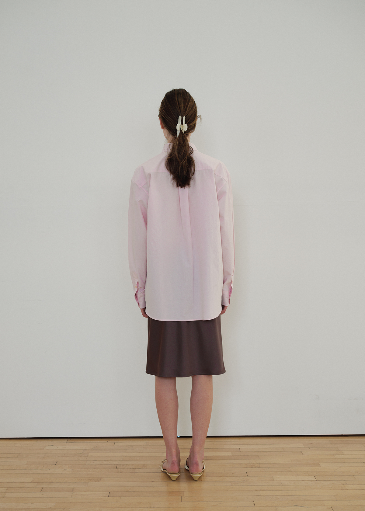 フロントには大きめのワイドチェストポケットを両側に配し、シャツ特有のフォーマルなムードにユーティリティ感をプラスしました。肩線が落ちるドロップショルダー構造と全体的にゆとりのあるシルエットが快適な着用感を与えます。袖はカフスボタンとスリットディテールで仕上げ、背面にはヨーク切り替えとピンタックを加えて立体的なシルエットを演出します。