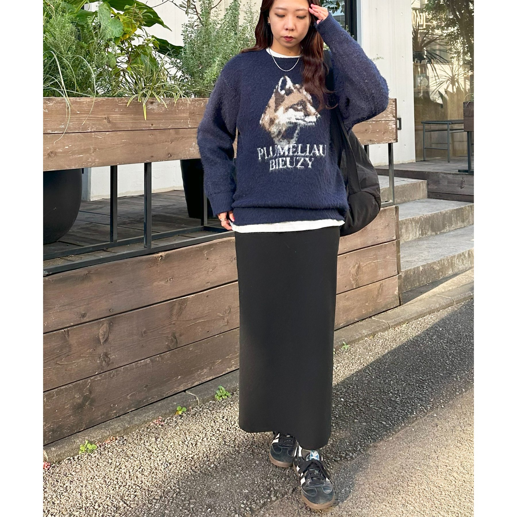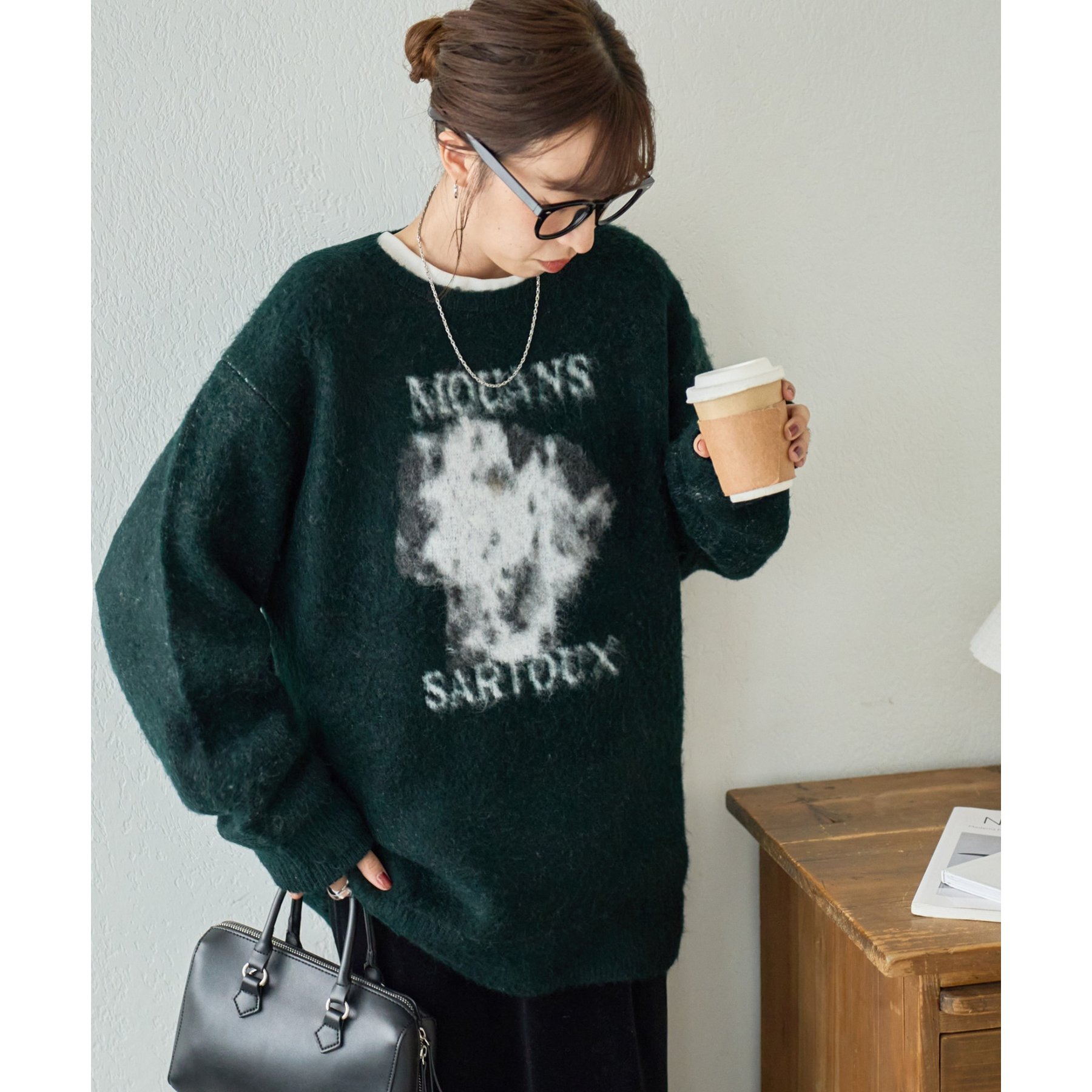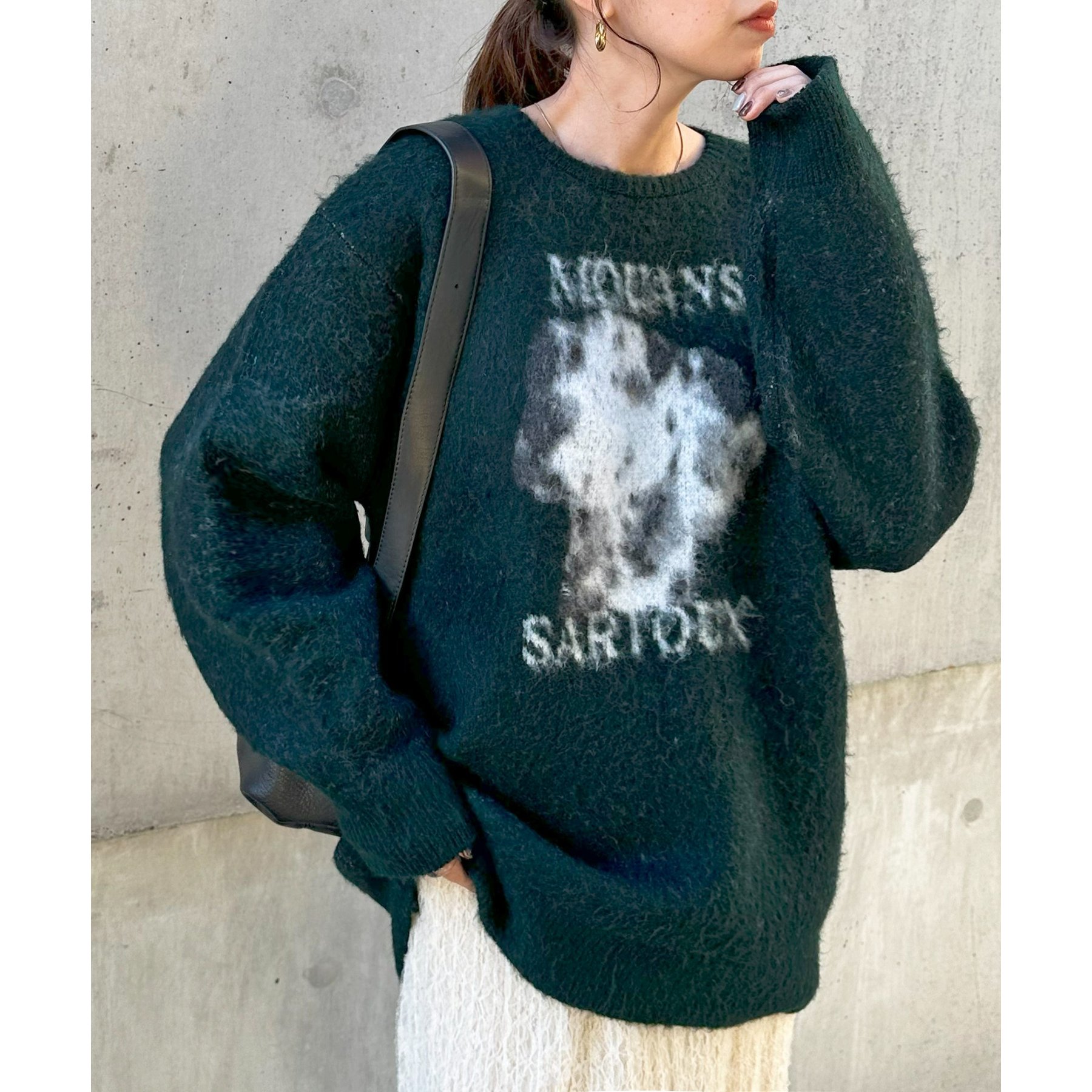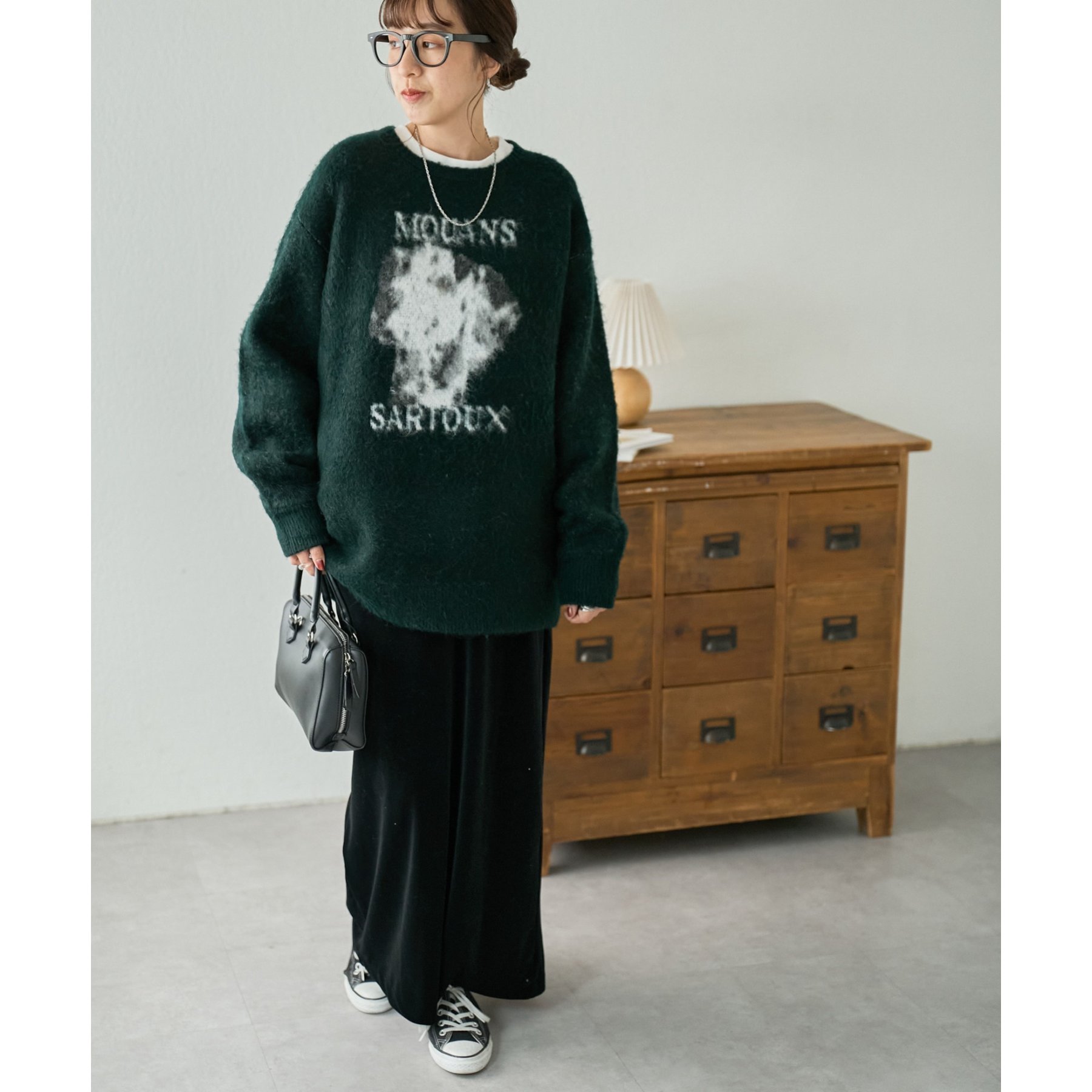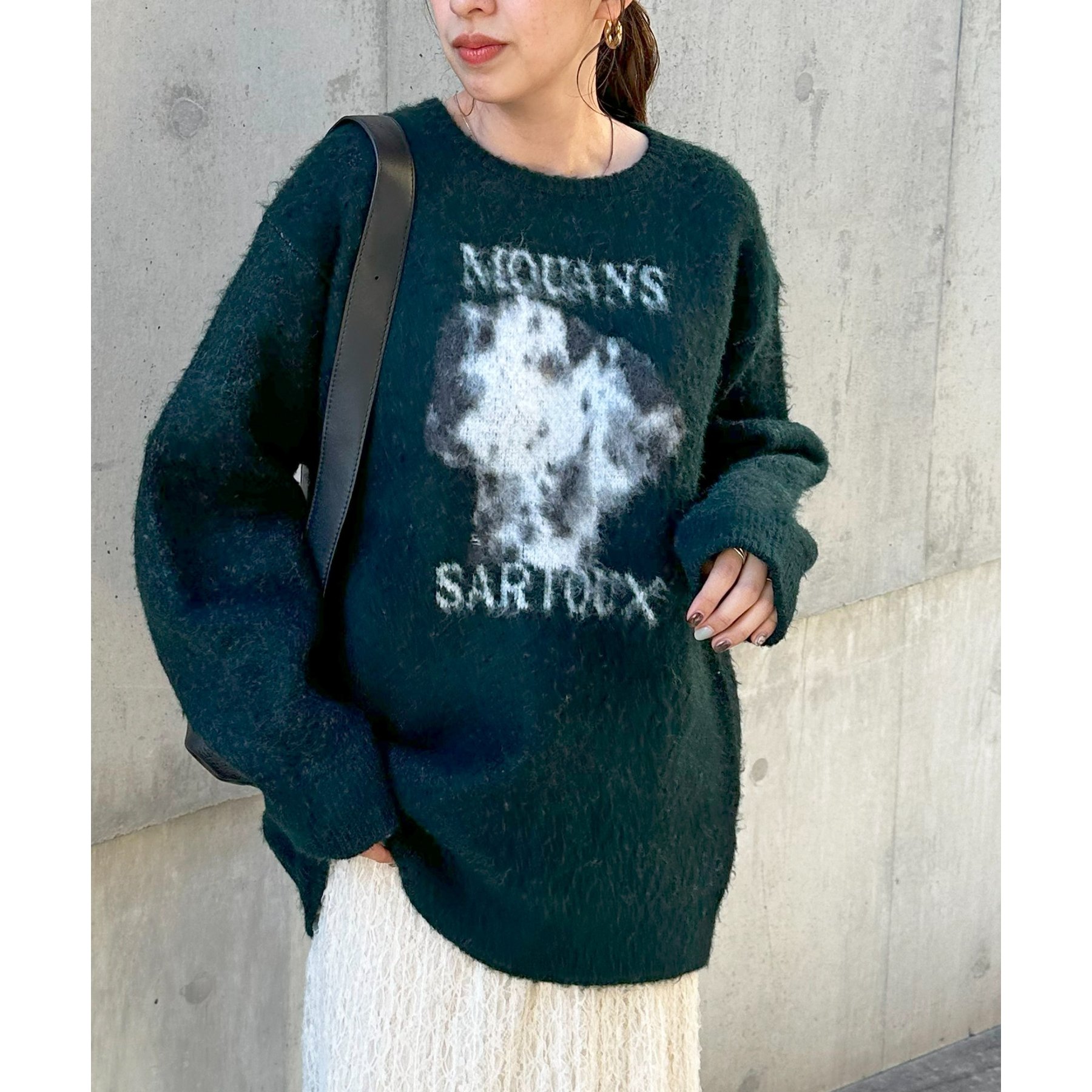 165㎝スタッフ(Fサイズ着用):オーバーサイズのニットですが、厚すぎない生地感で軽いので着心地が抜群です。柄のニットなので、一枚で雰囲気のあるコーデに決まります!