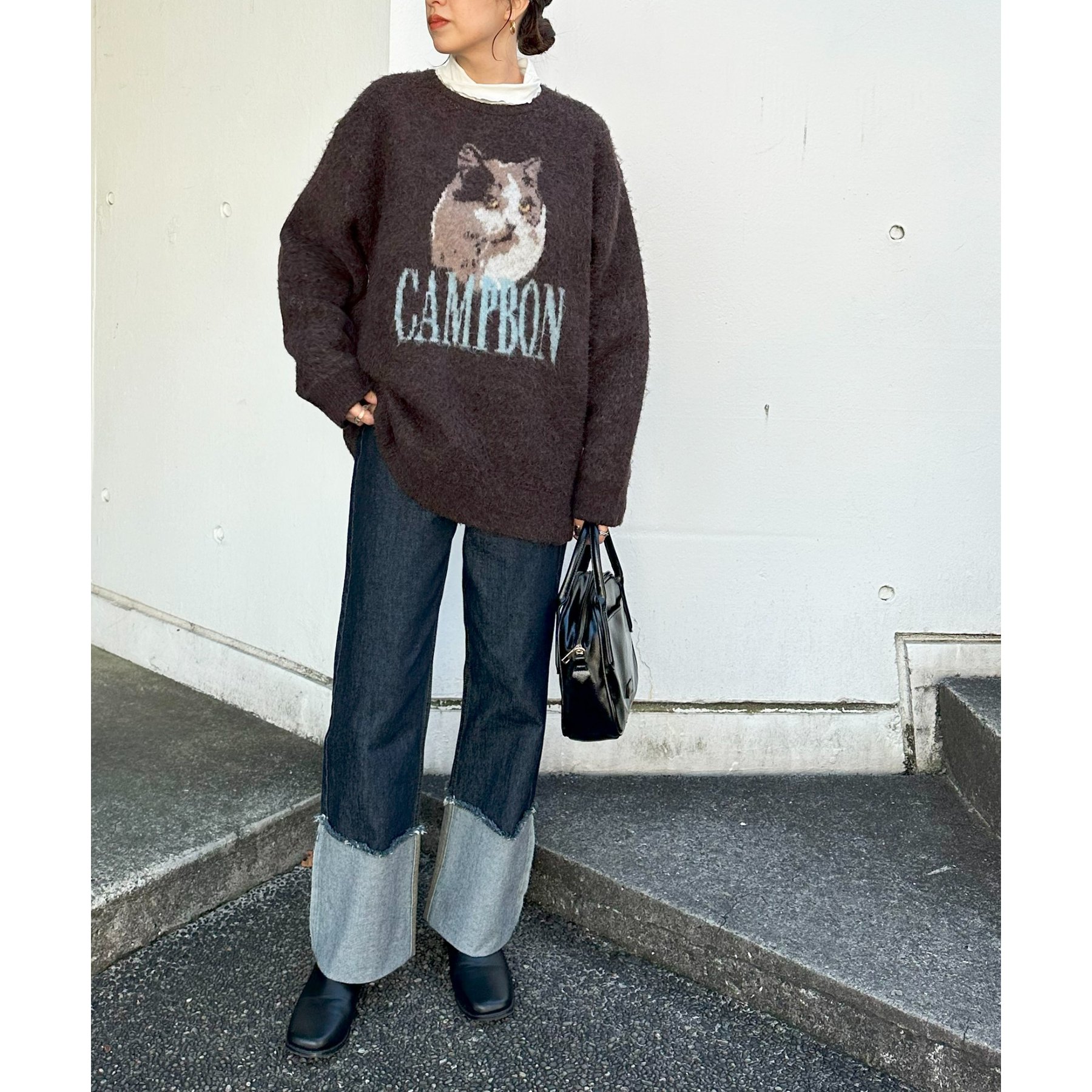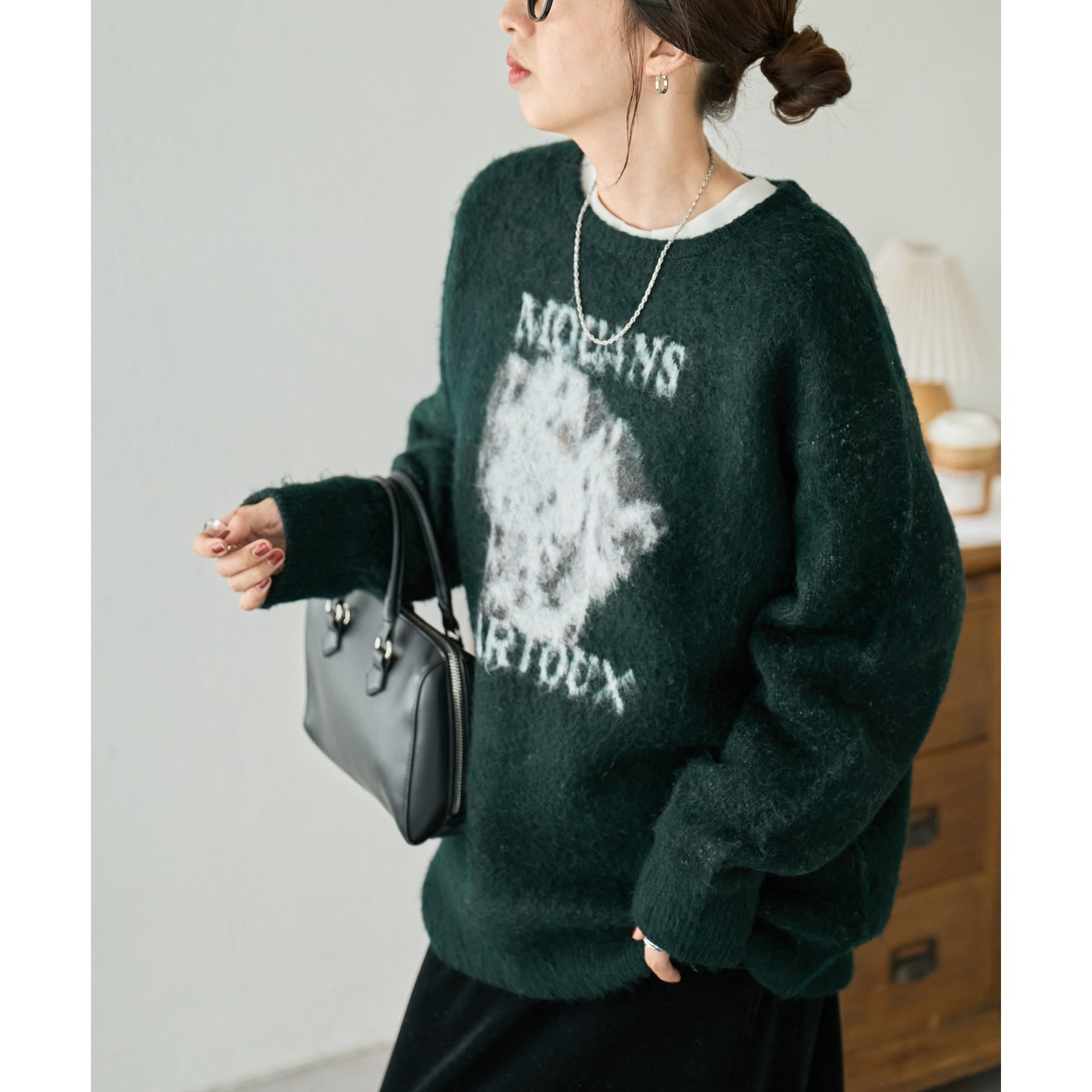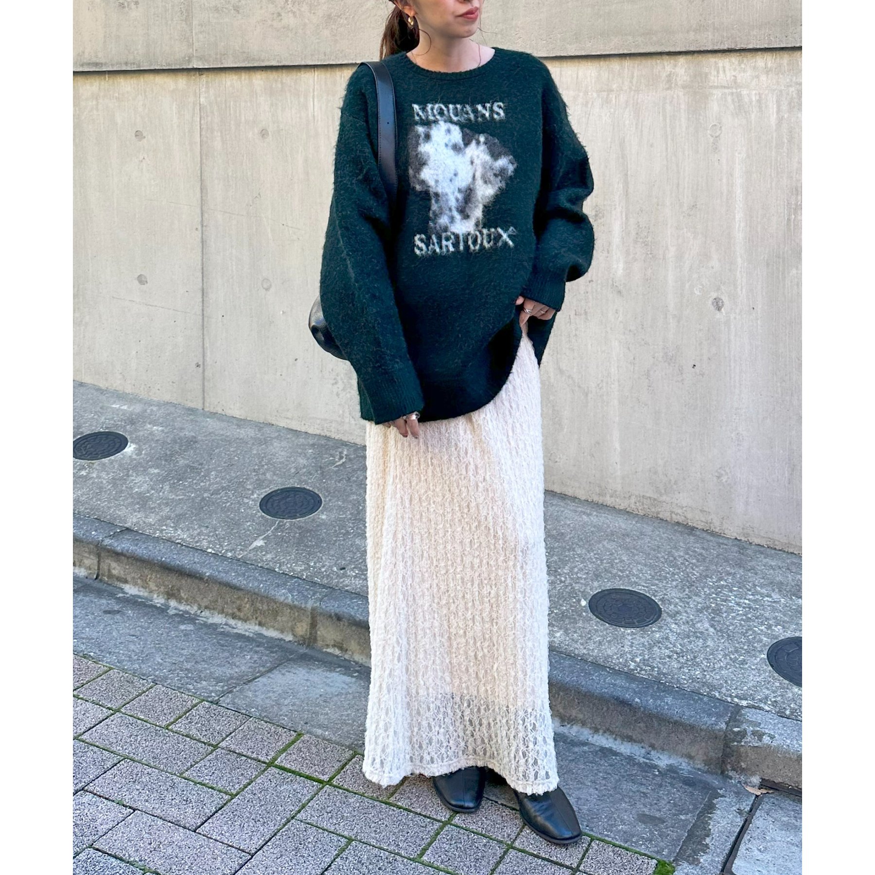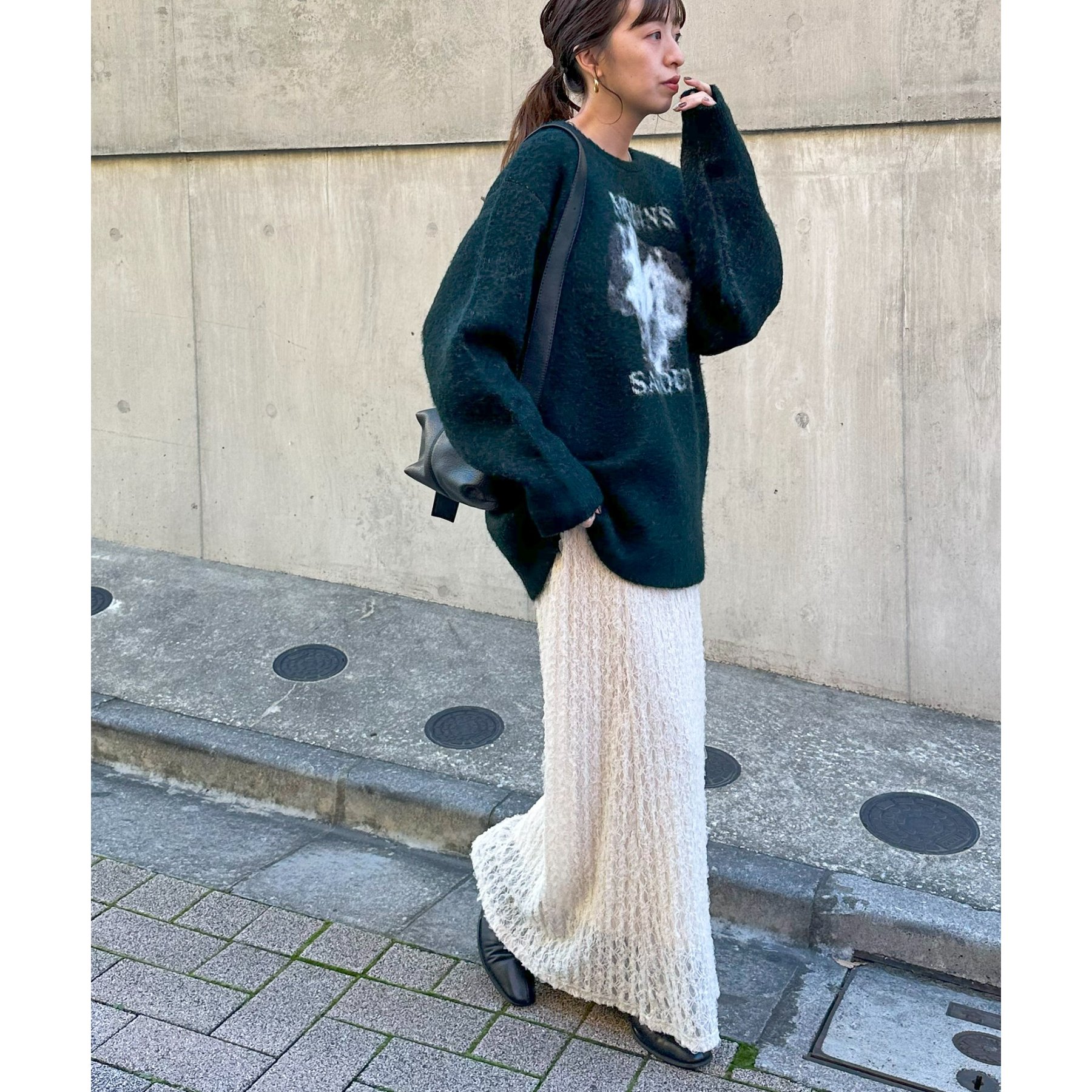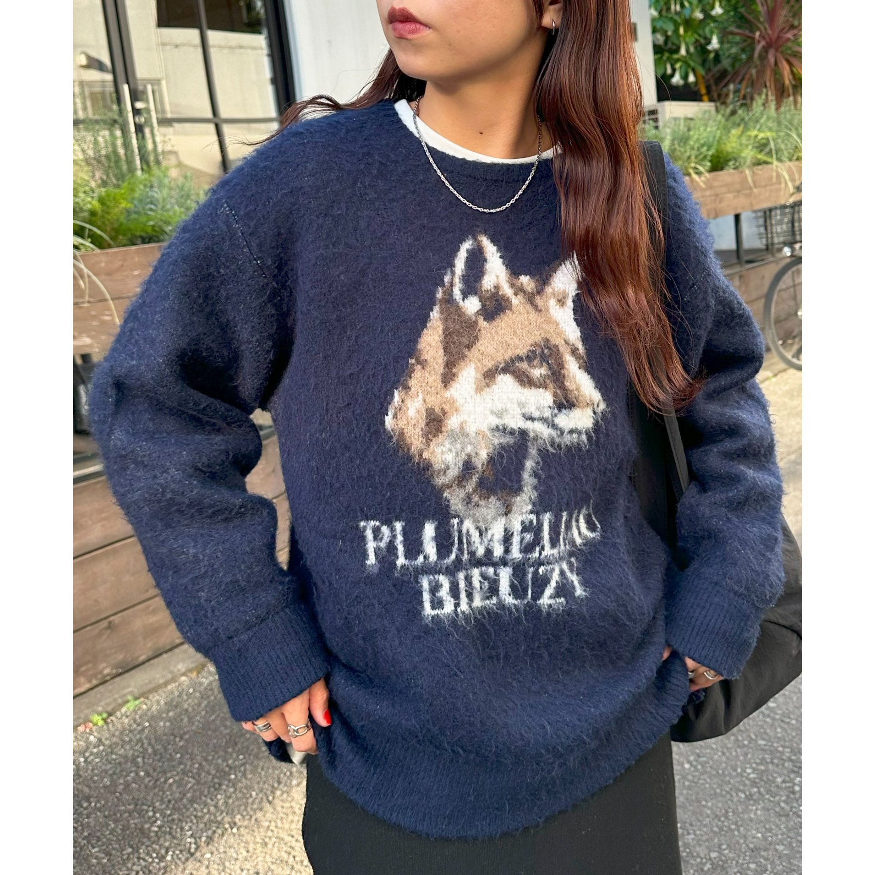 165㎝スタッフ(Fサイズ着用):オーバーサイズのニットですが、厚すぎない生地感で軽いので着心地が抜群です。柄のニットなので、一枚で雰囲気のあるコーデに決まります!