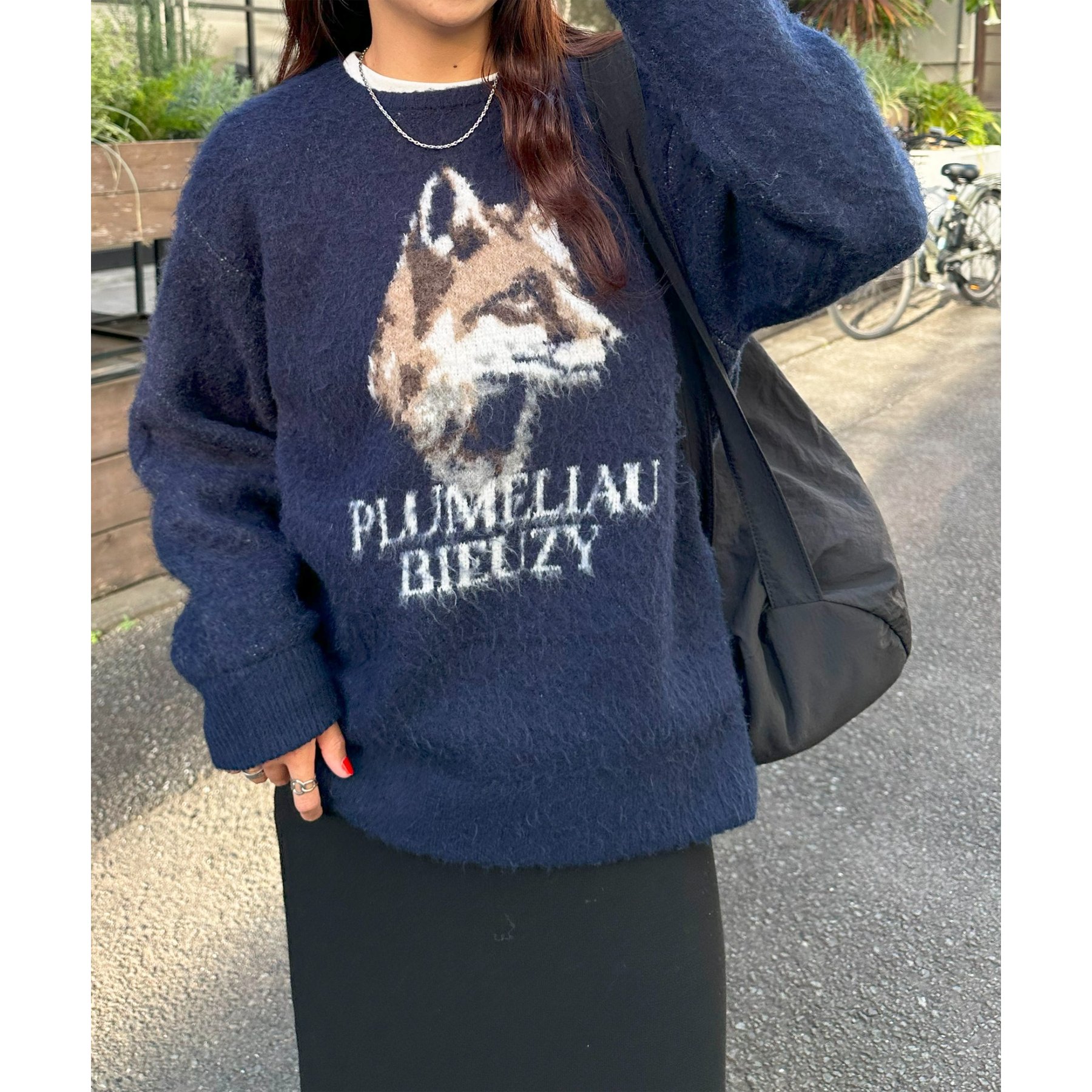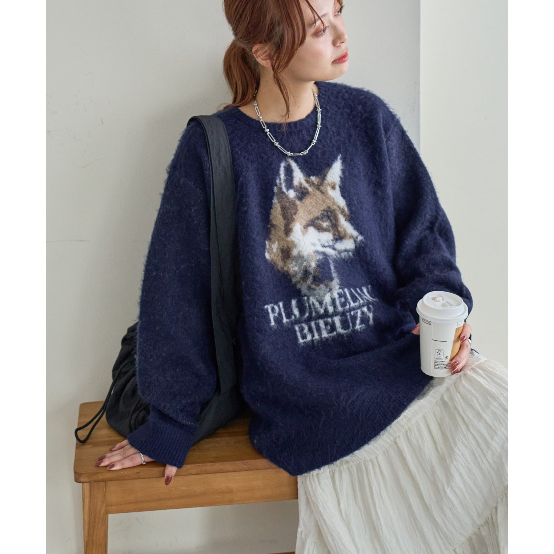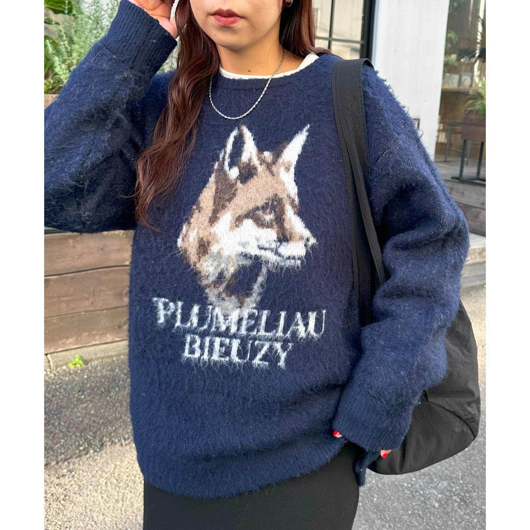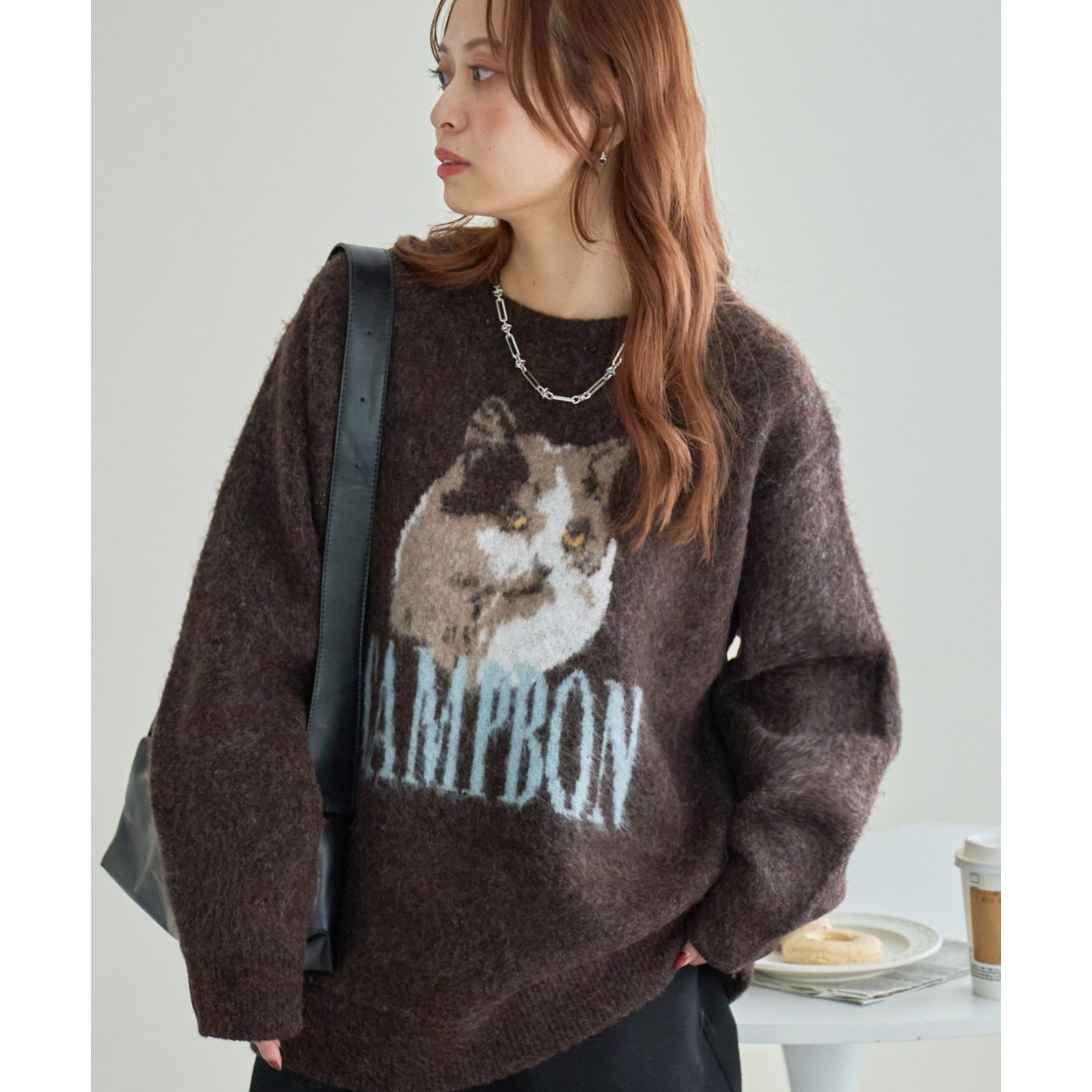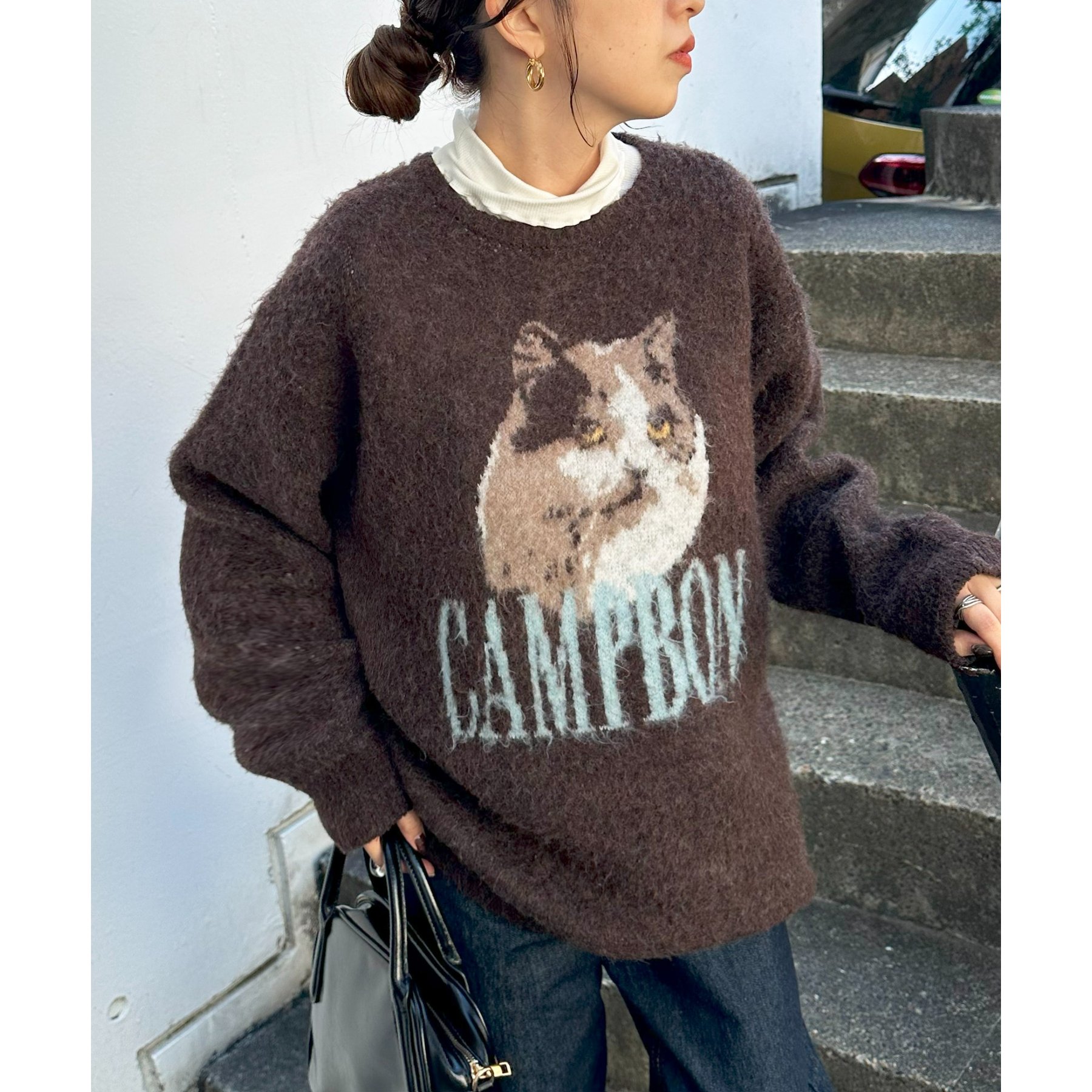 165㎝スタッフ(Fサイズ着用):オーバーサイズのニットですが、厚すぎない生地感で軽いので着心地が抜群です。柄のニットなので、一枚で雰囲気のあるコーデに決まります!