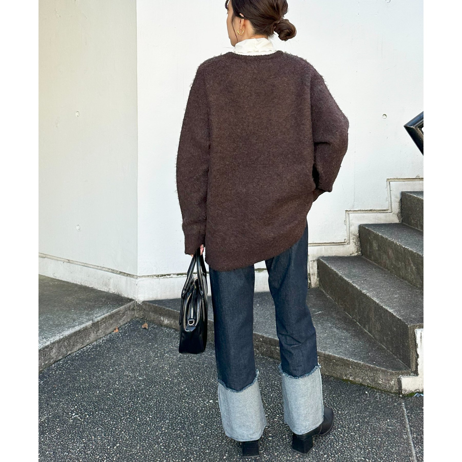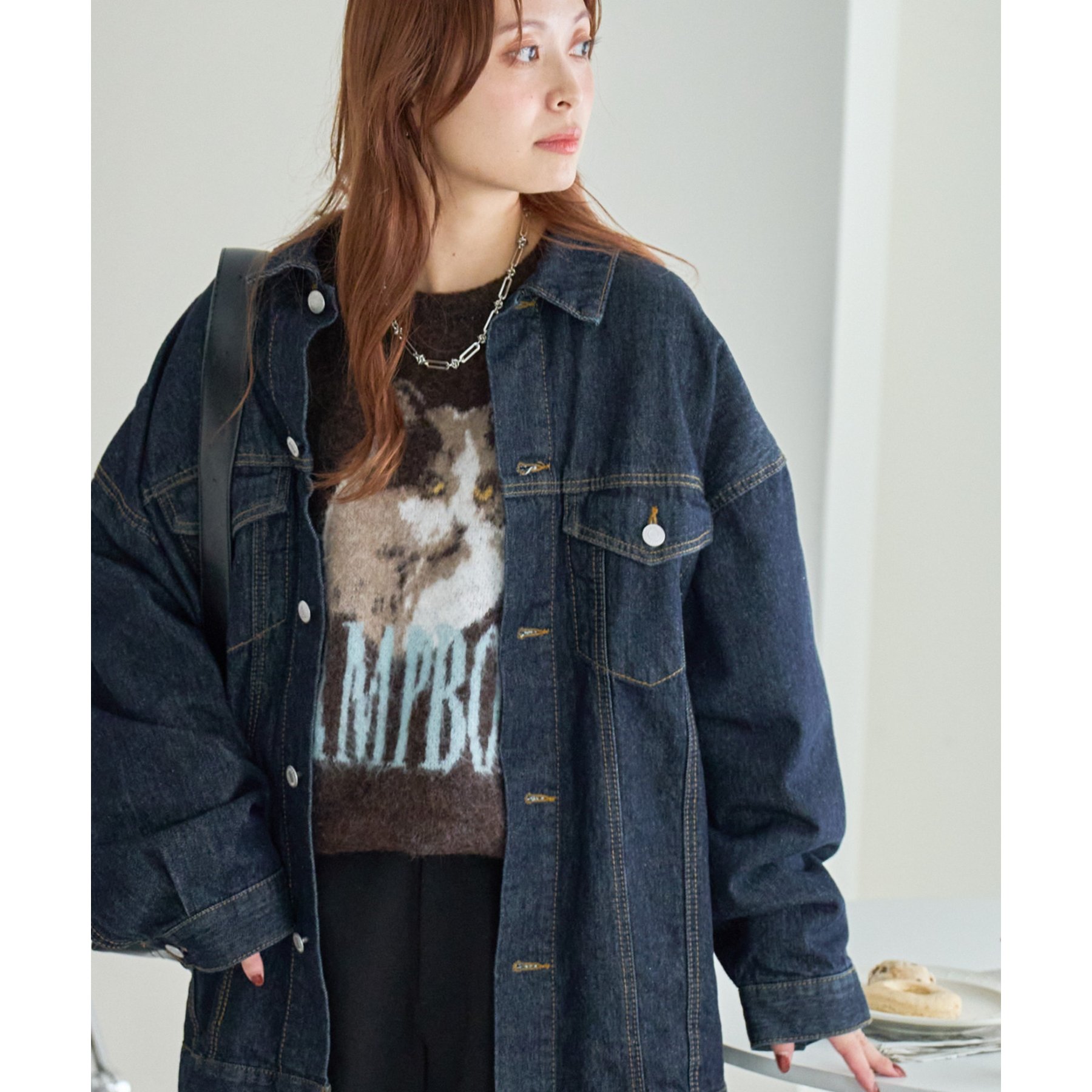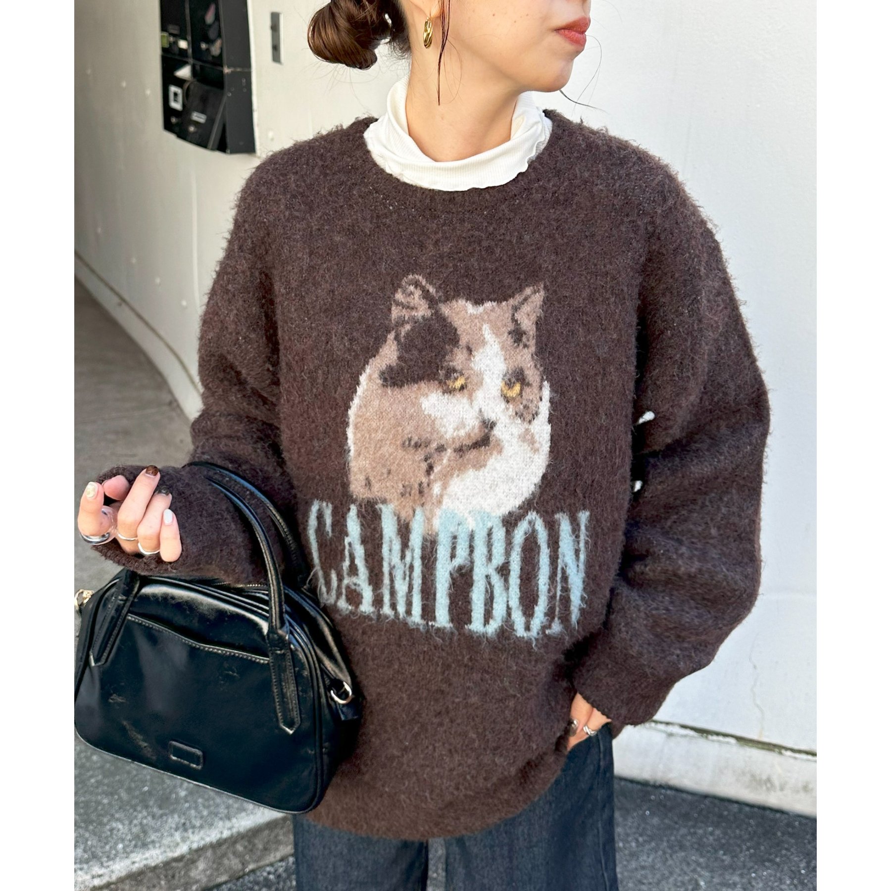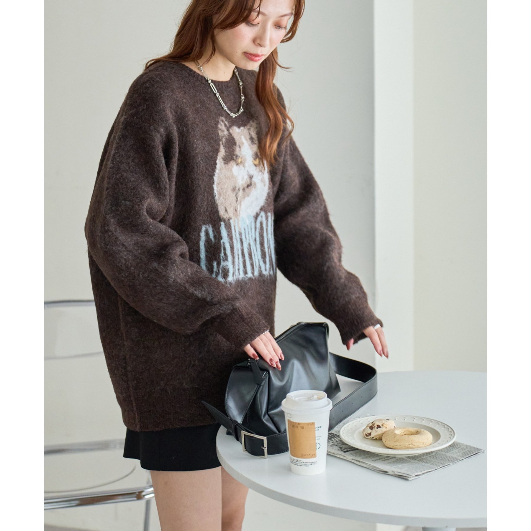 165㎝スタッフ(Fサイズ着用):オーバーサイズのニットですが、厚すぎない生地感で軽いので着心地が抜群です。柄のニットなので、一枚で雰囲気のあるコーデに決まります!