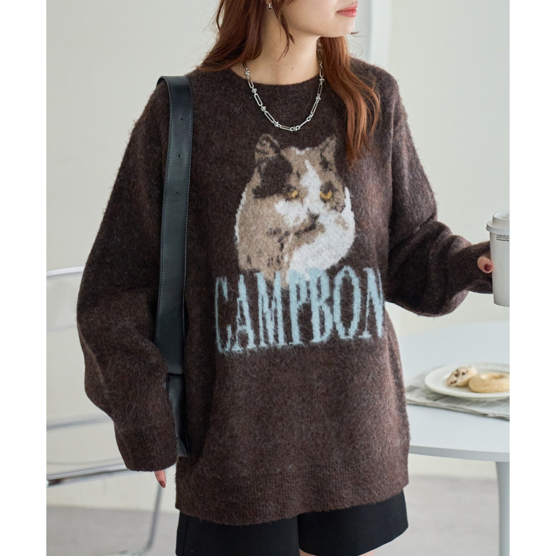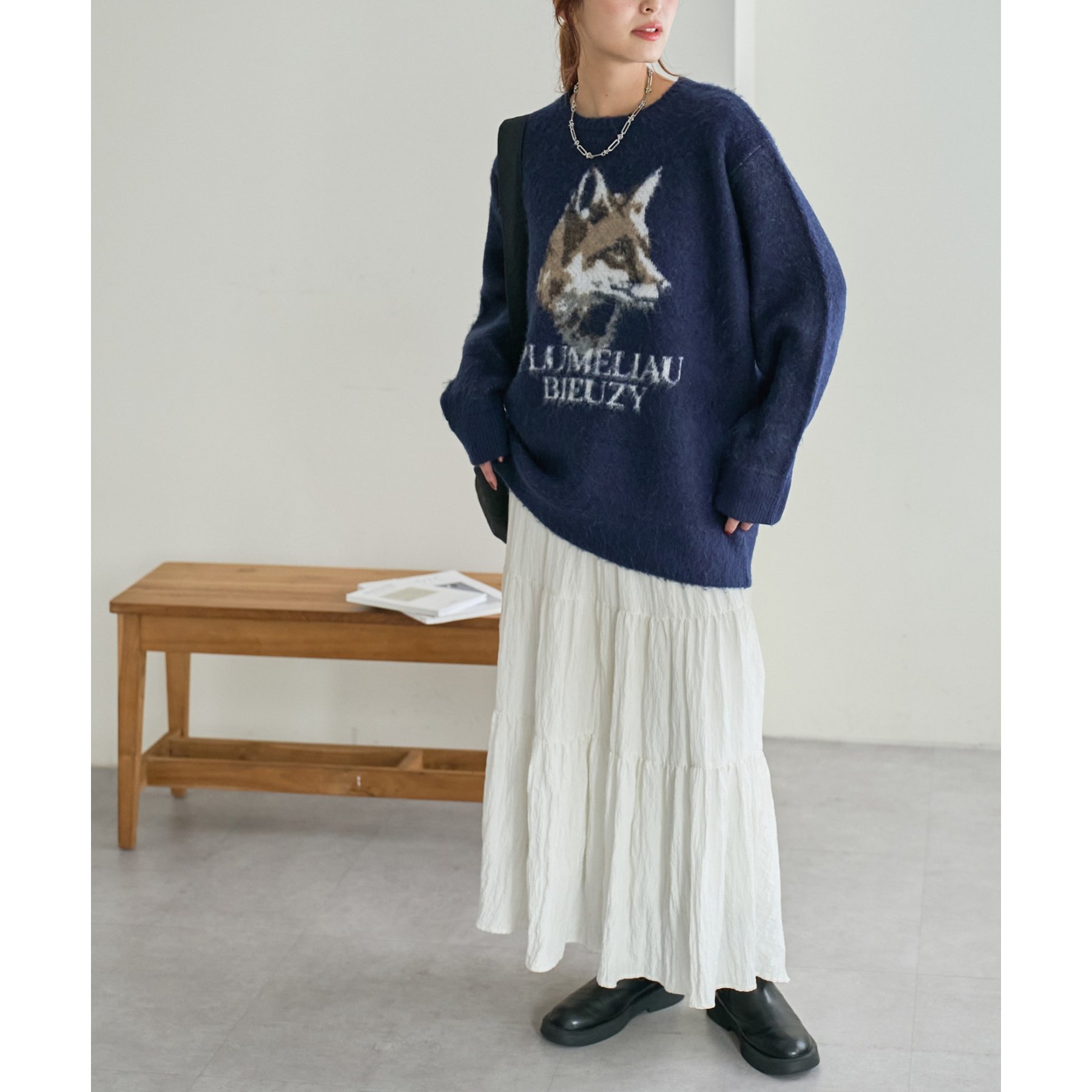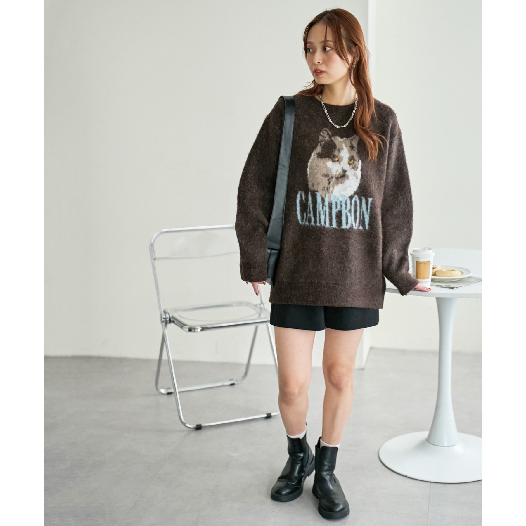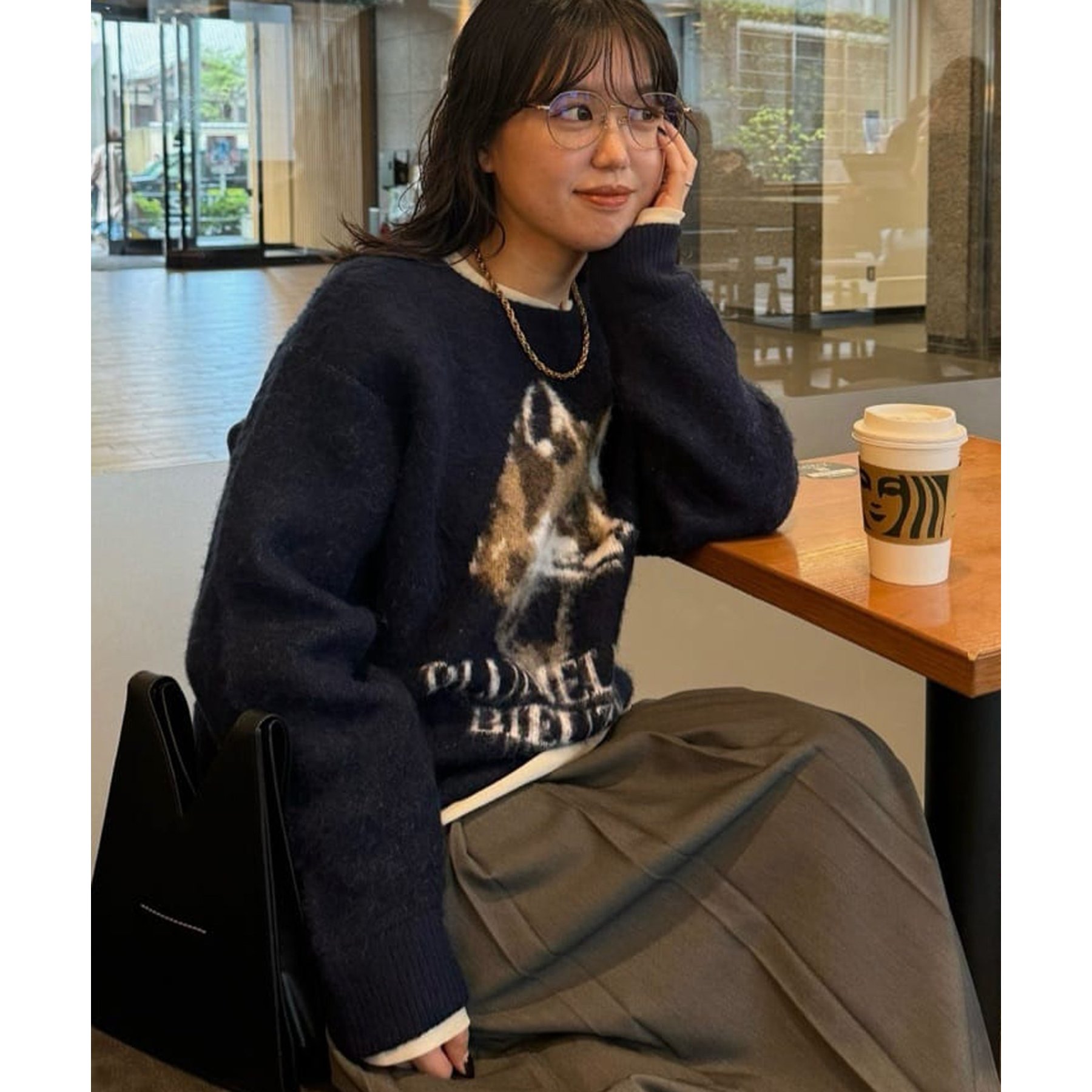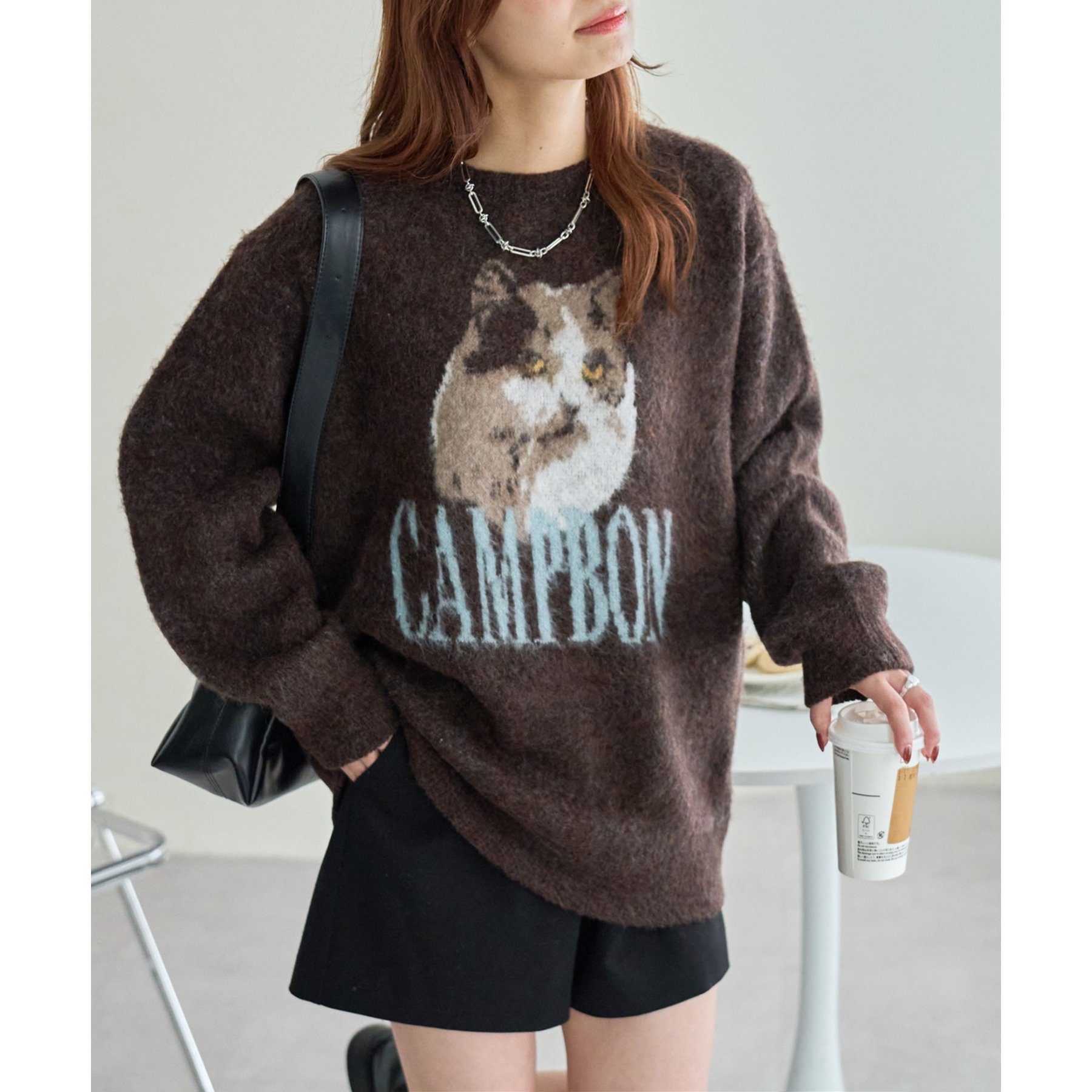 165㎝スタッフ(Fサイズ着用):オーバーサイズのニットですが、厚すぎない生地感で軽いので着心地が抜群です。柄のニットなので、一枚で雰囲気のあるコーデに決まります!