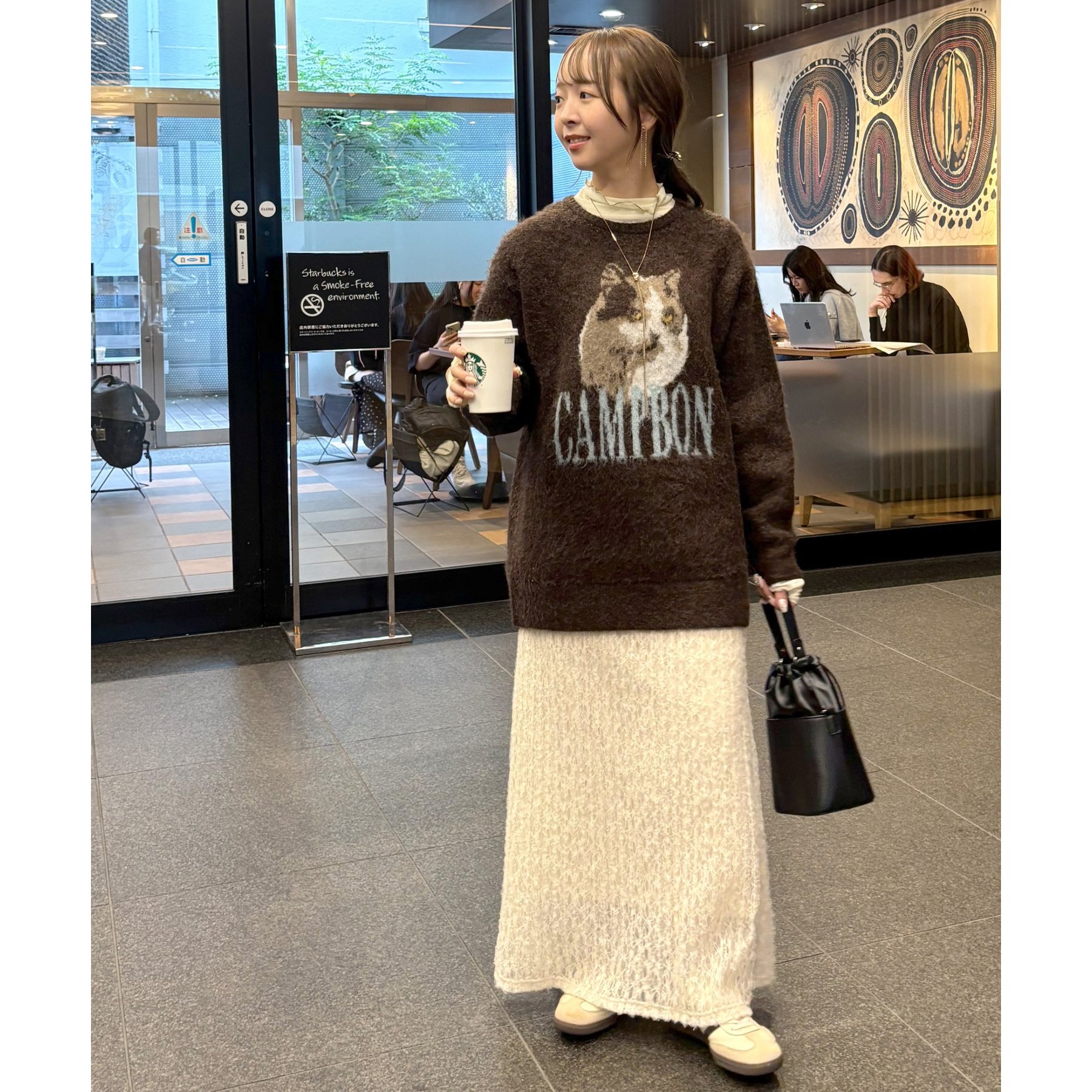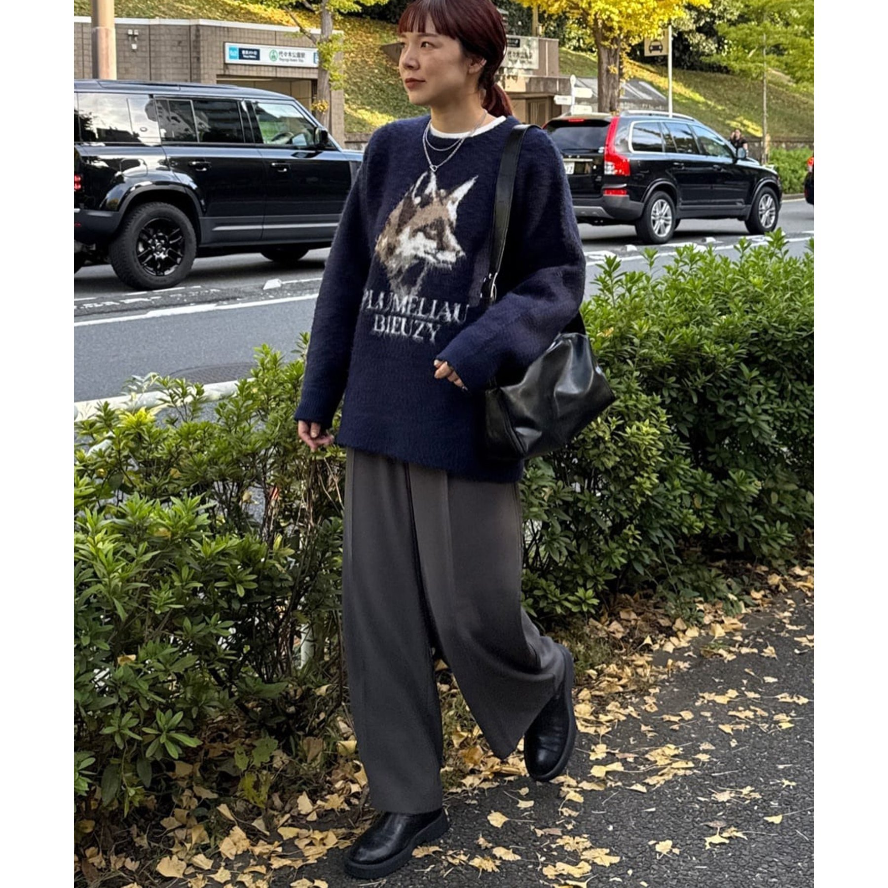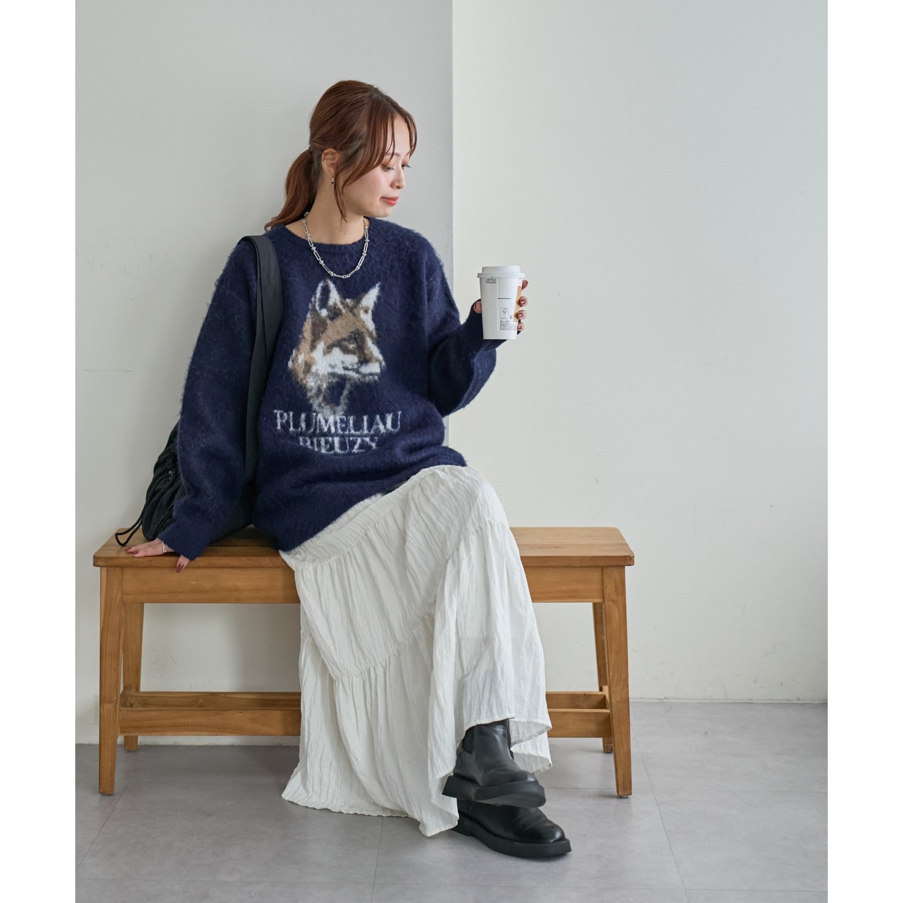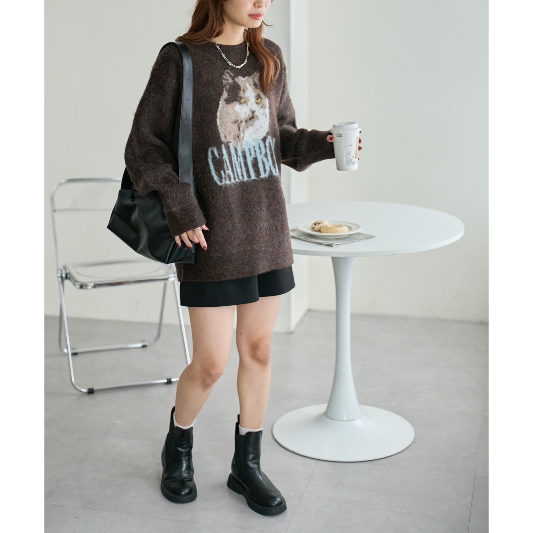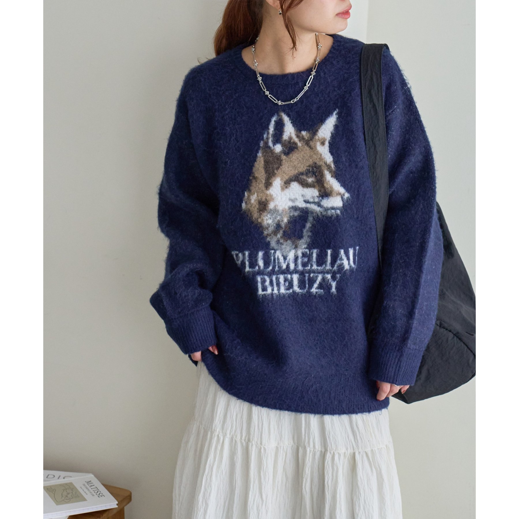165㎝スタッフ(Fサイズ着用):オーバーサイズのニットですが、厚すぎない生地感で軽いので着心地が抜群です。柄のニットなので、一枚で雰囲気のあるコーデに決まります!