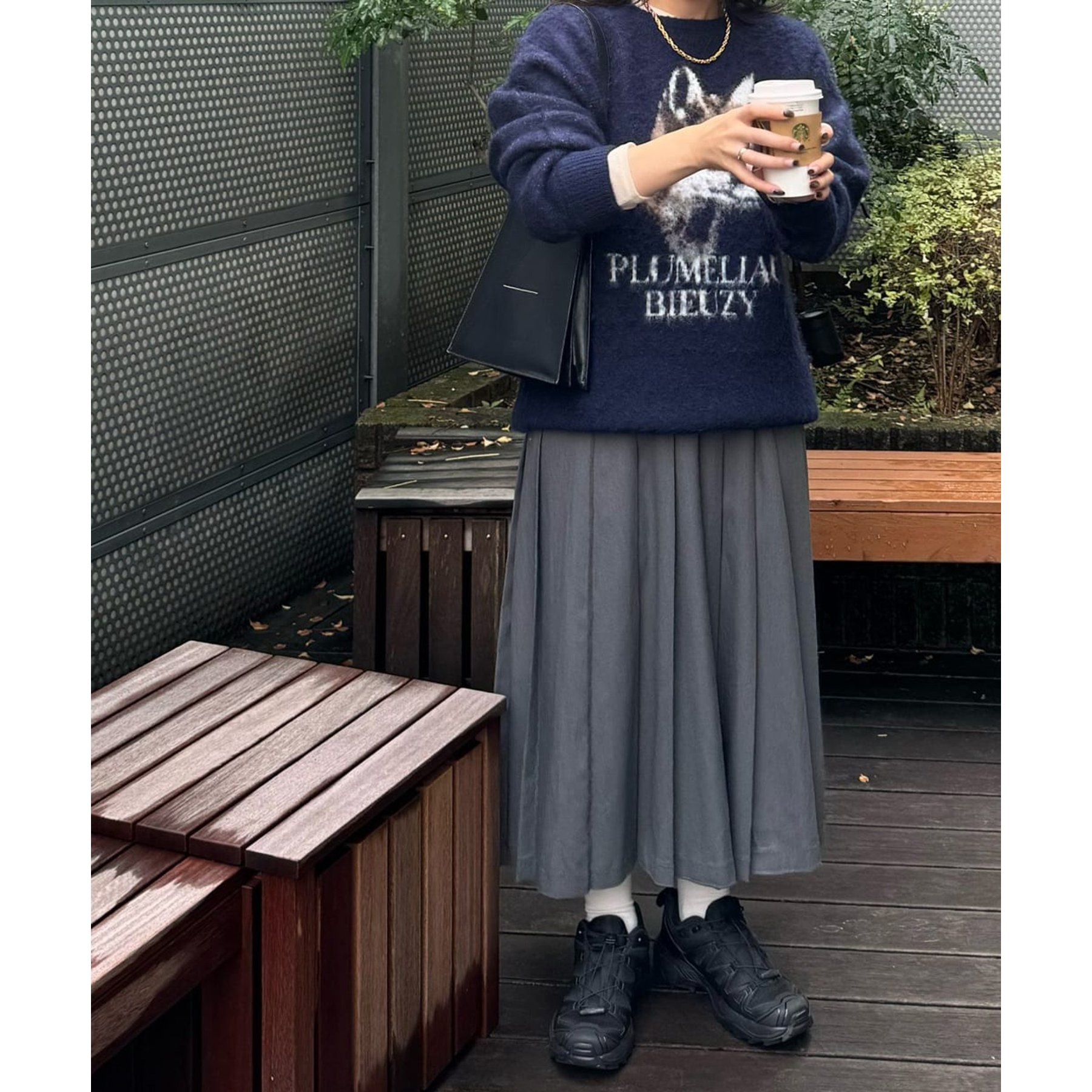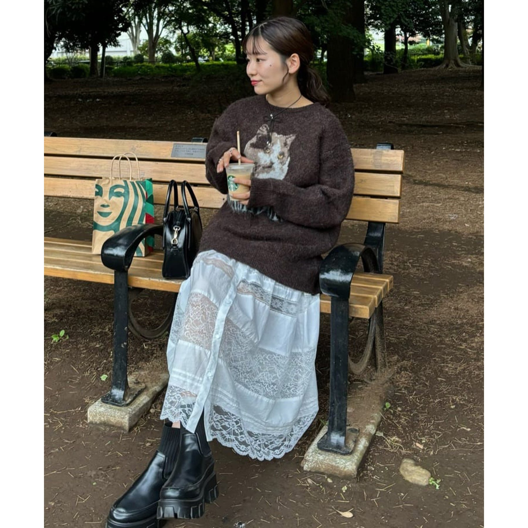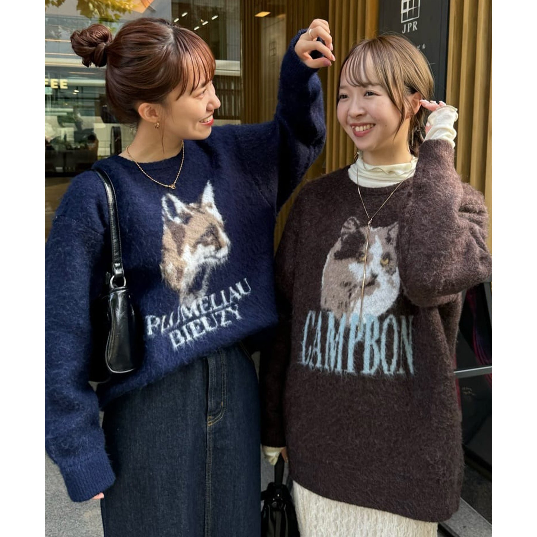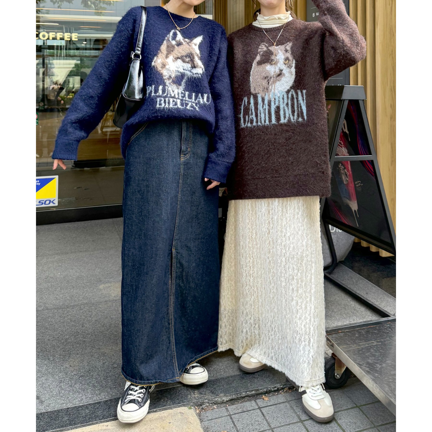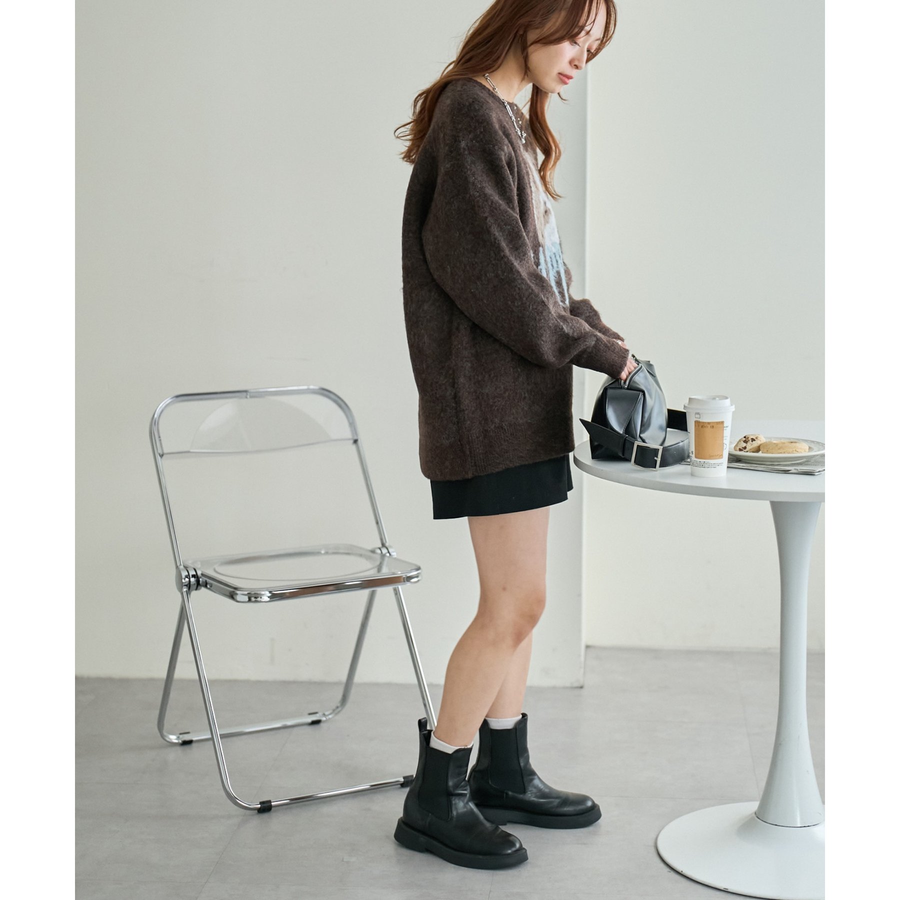165㎝スタッフ(Fサイズ着用):オーバーサイズのニットですが、厚すぎない生地感で軽いので着心地が抜群です。柄のニットなので、一枚で雰囲気のあるコーデに決まります!