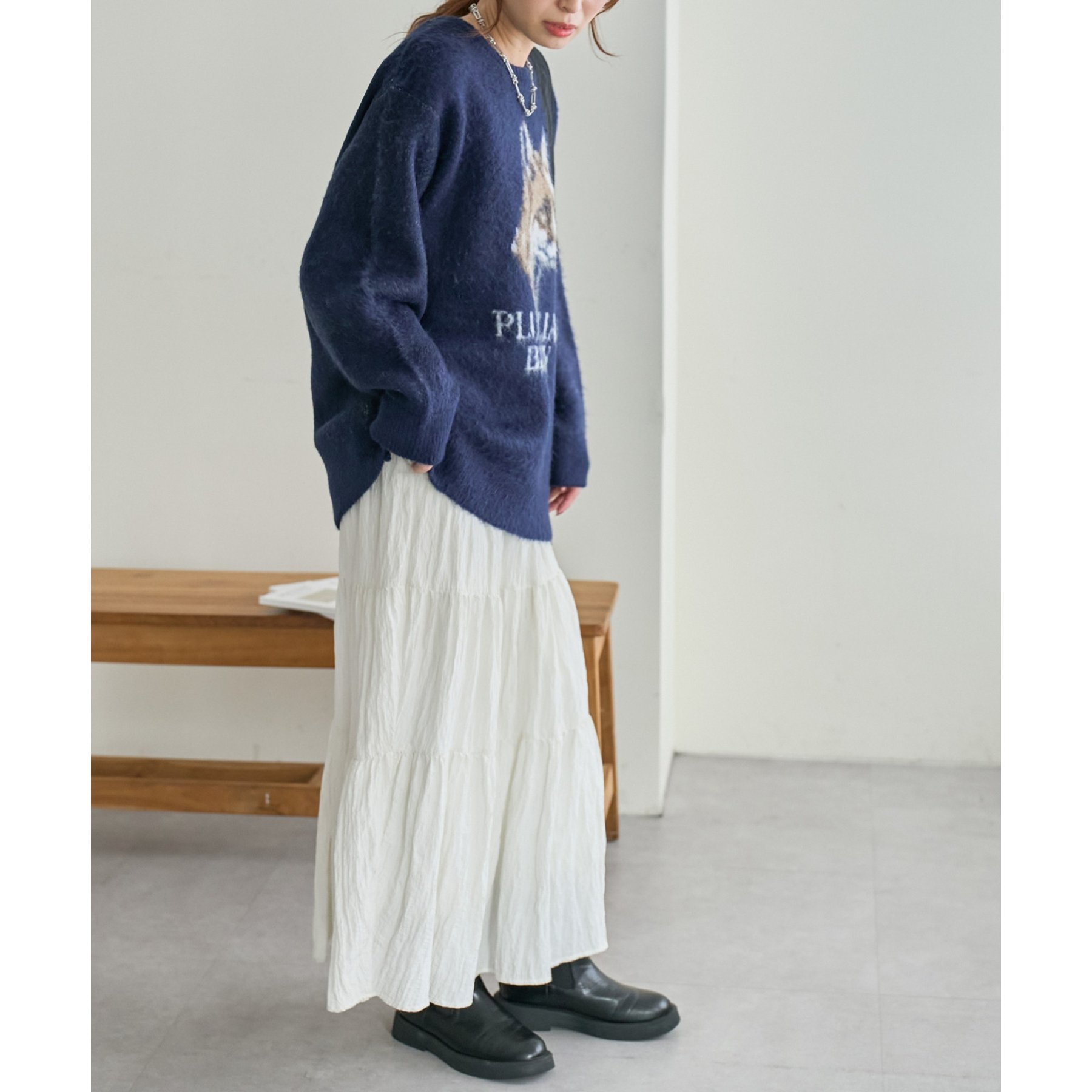 メンズライクなニットはパンツと合わせたカジュアルなコーデはもちろん、スカートと合わせたレディなコーデとも合わせられます。