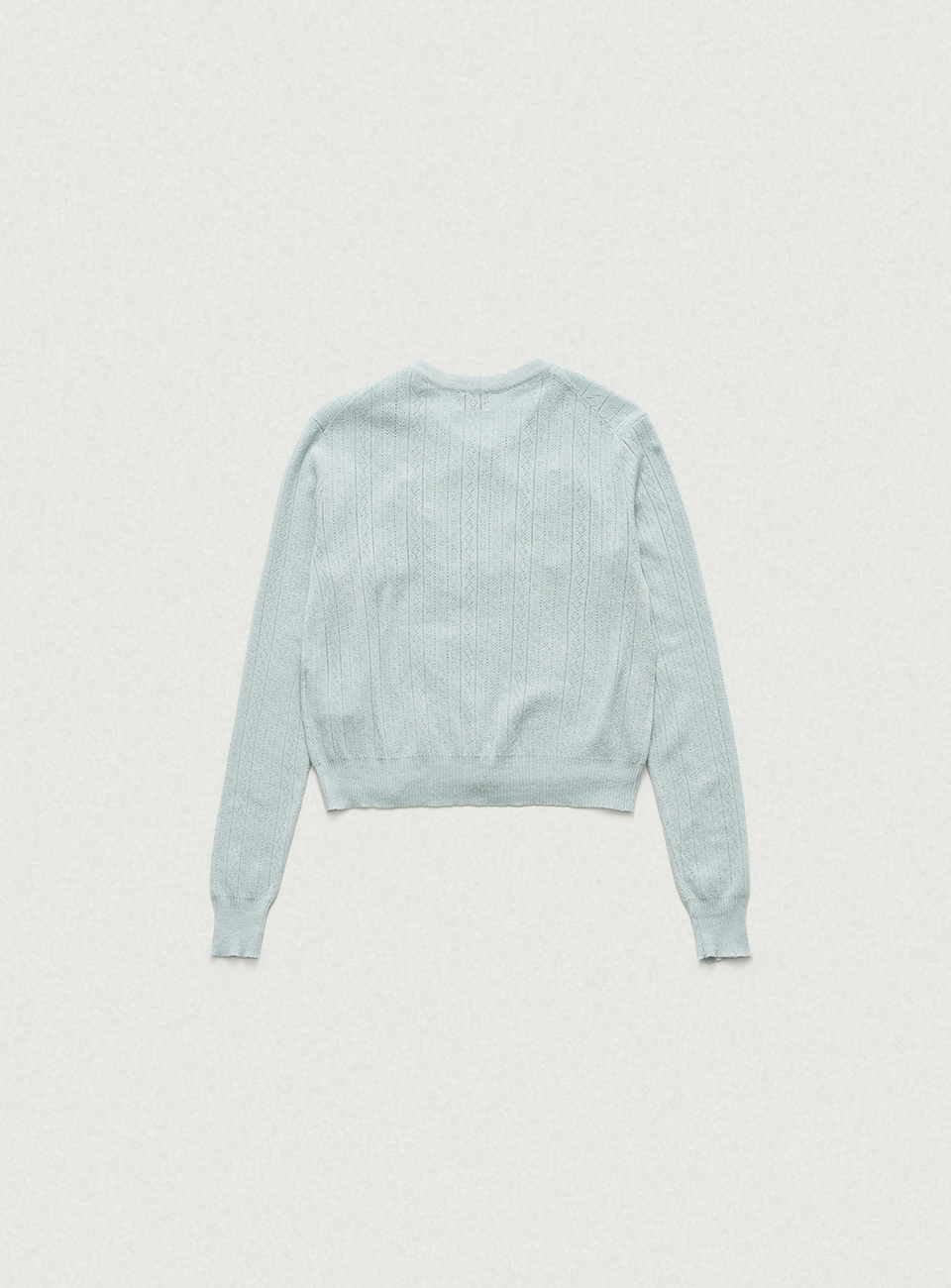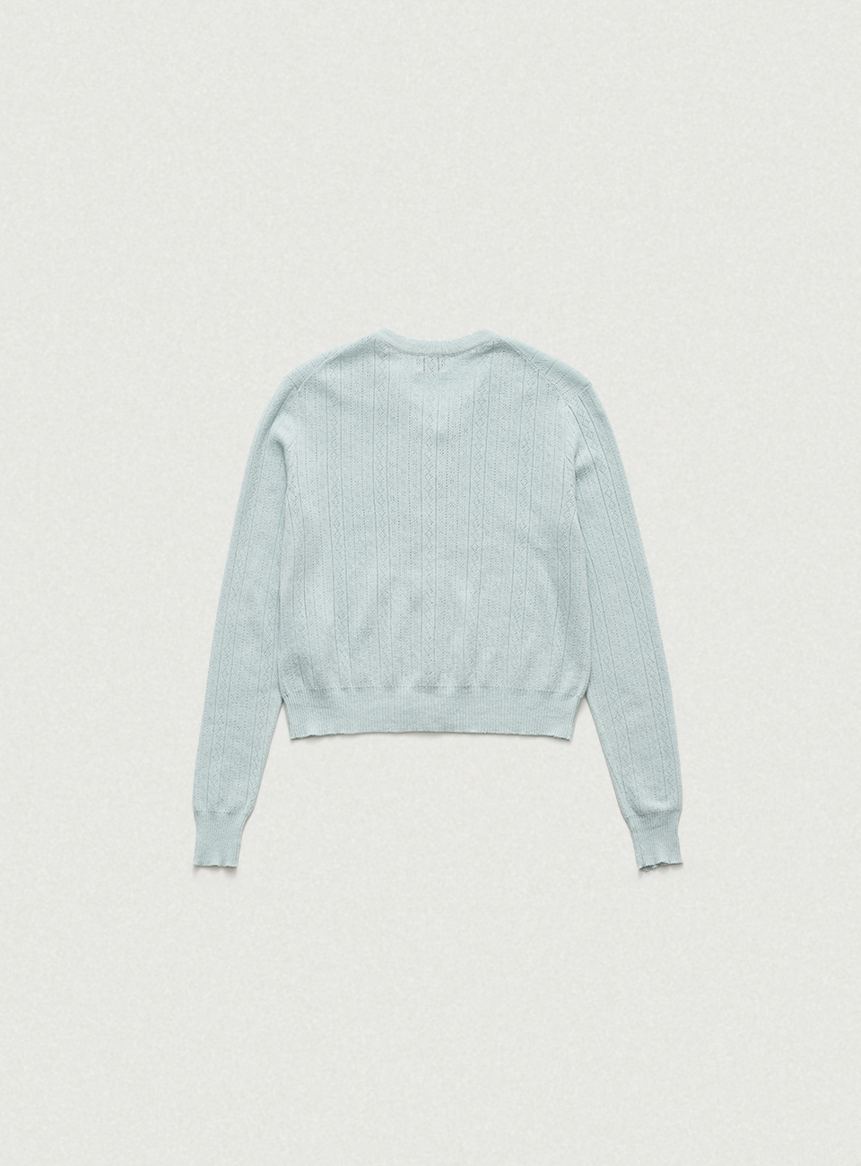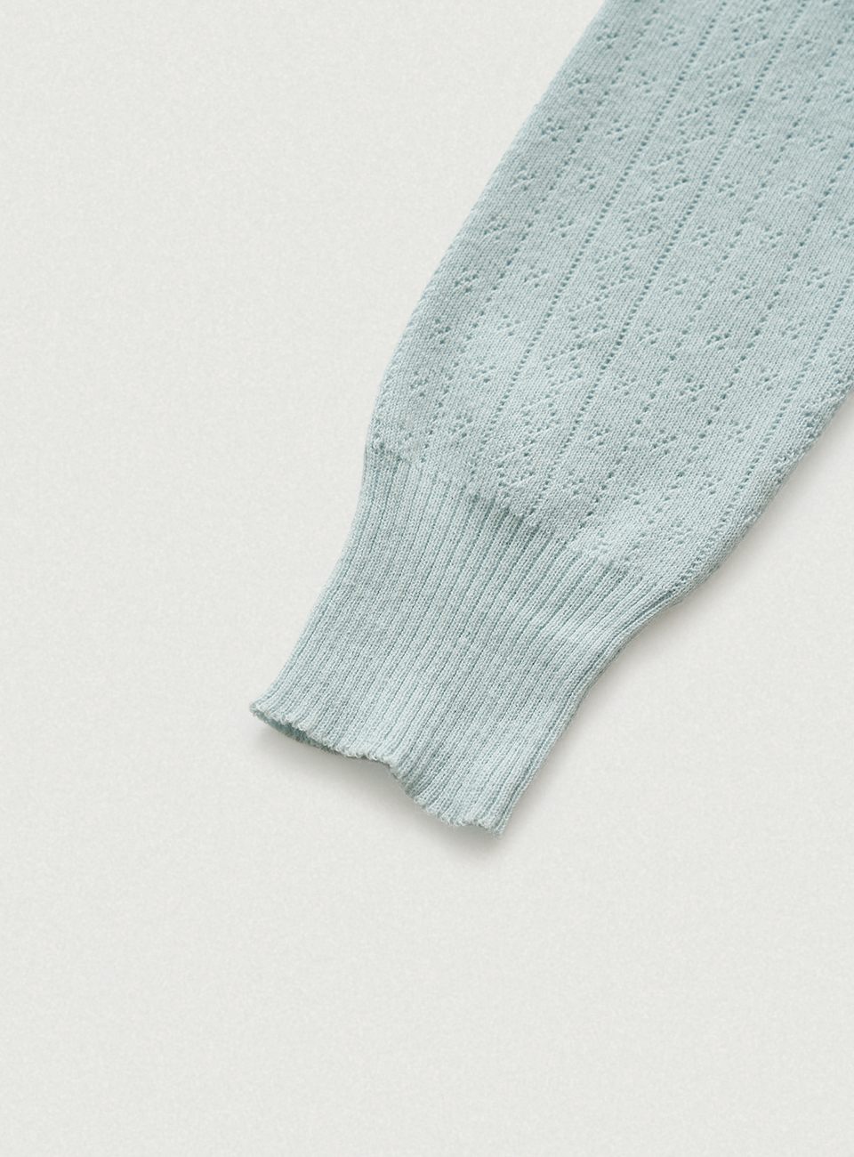 ペールミントの色味と柔らかなタッチが映えるポインテル柄のニットカーディガン&スリーブレスのセットアップ
