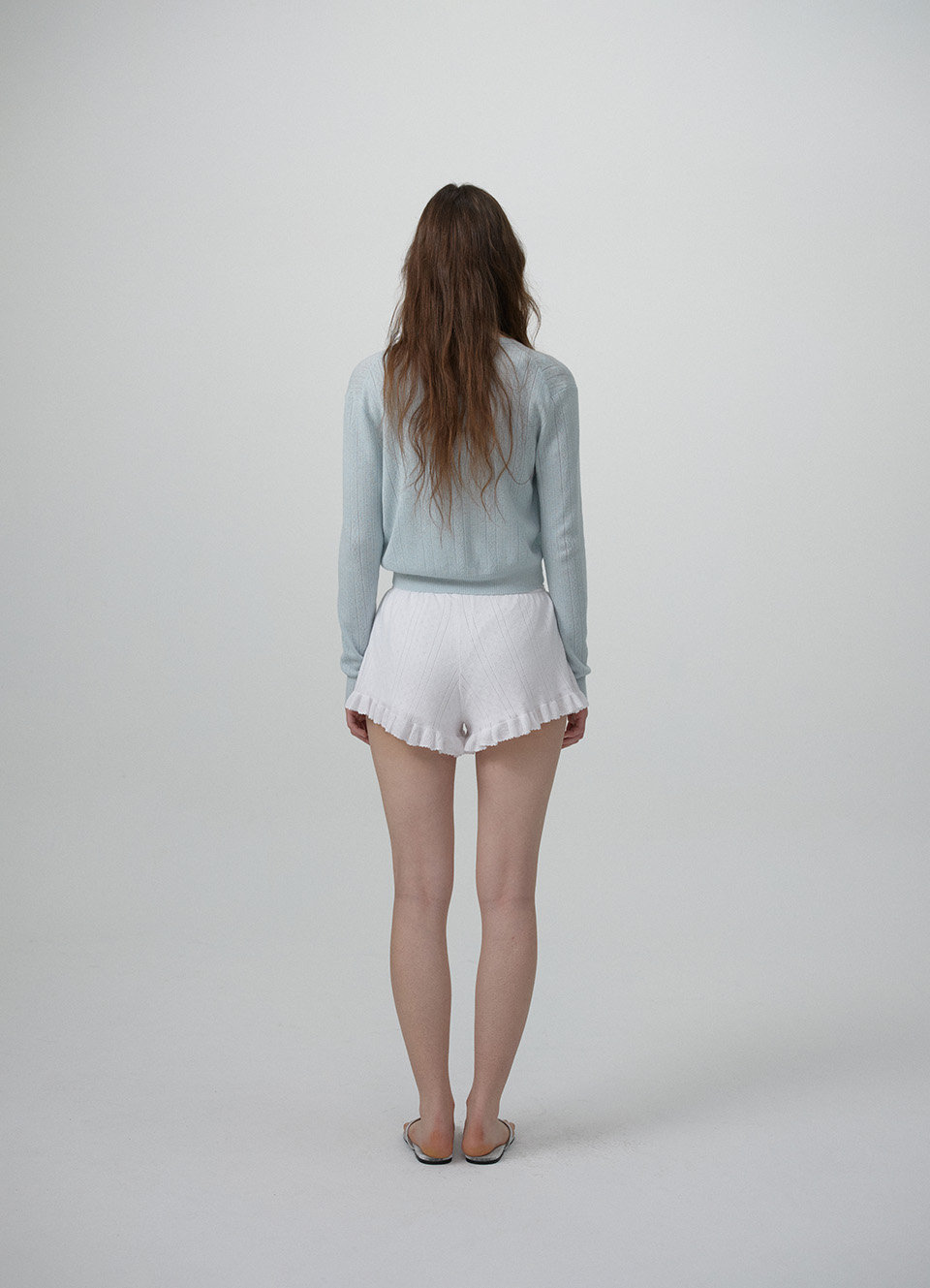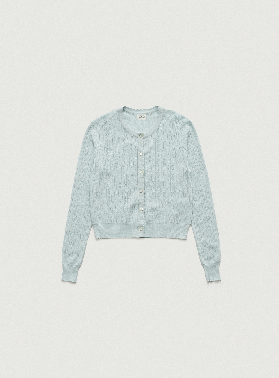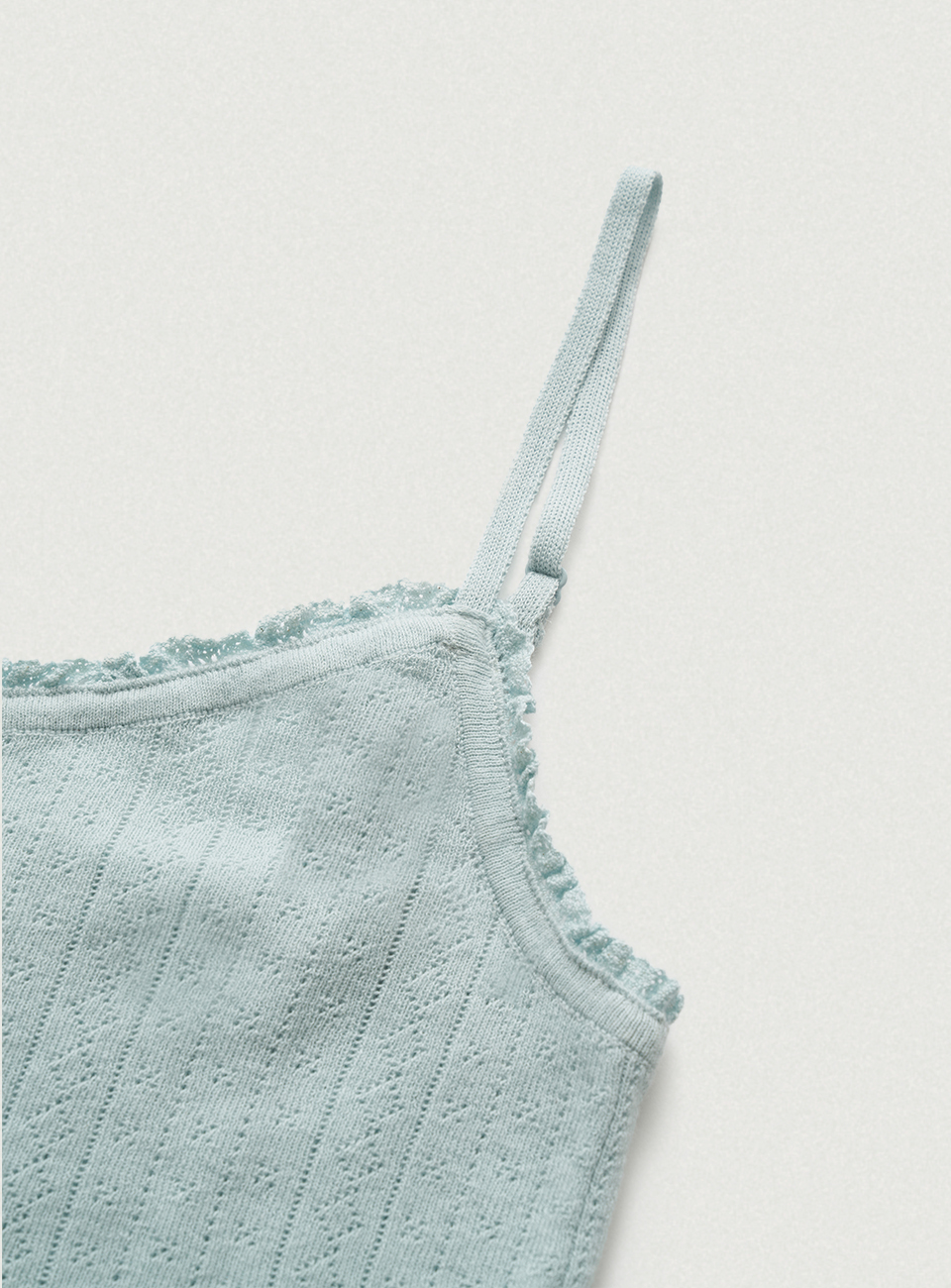 ペールミントの色味と柔らかなタッチが映えるポインテル柄のニットカーディガン&スリーブレスのセットアップ