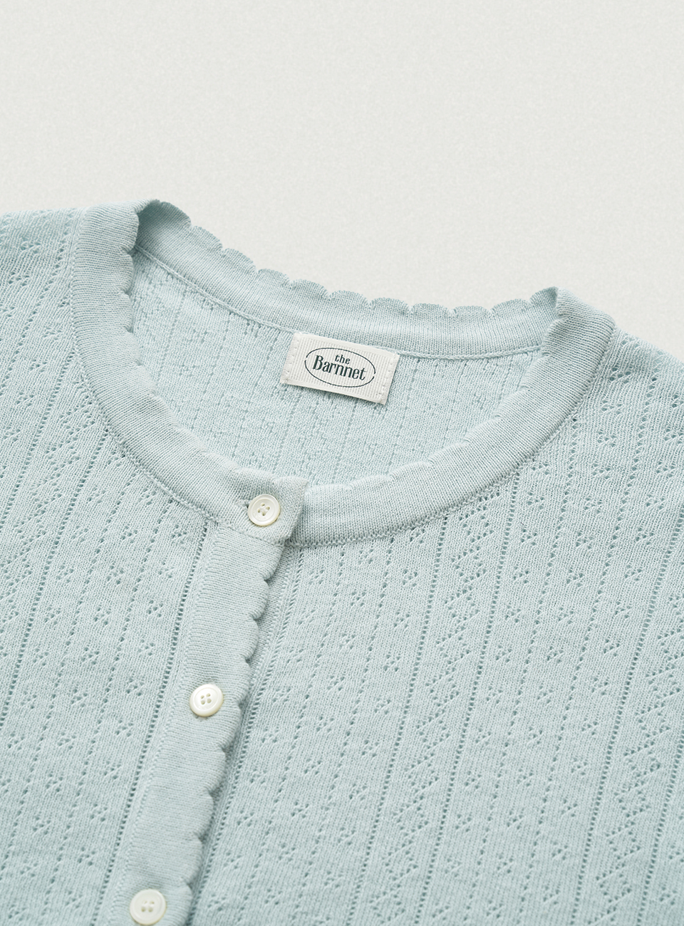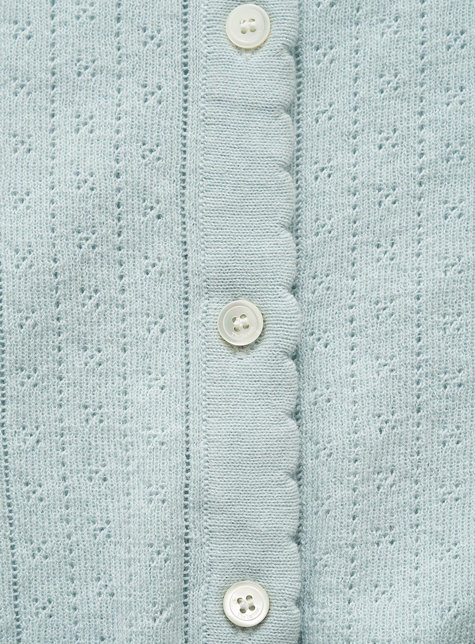 スカラップ編みの前立て仕上げディテール