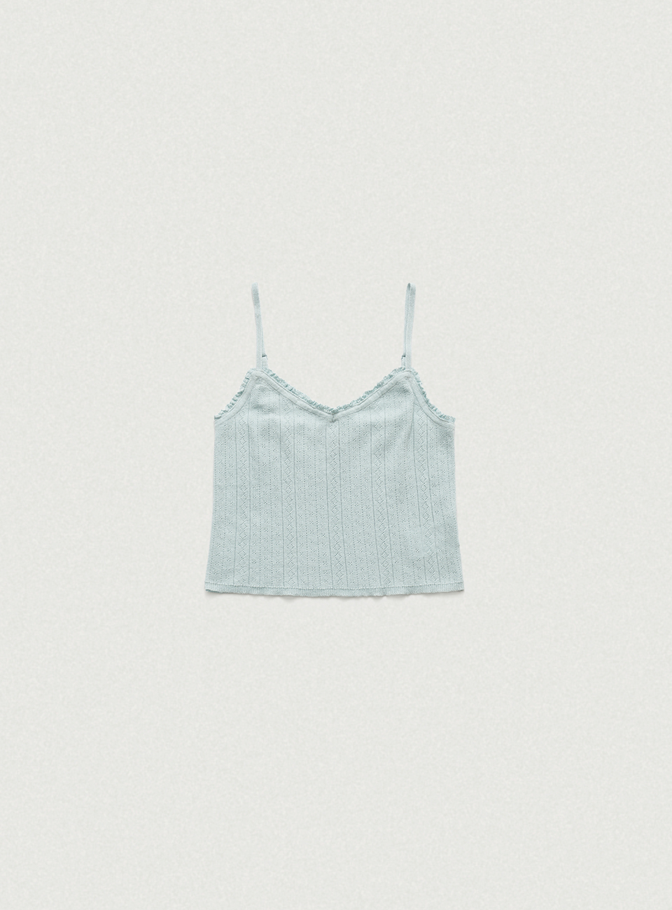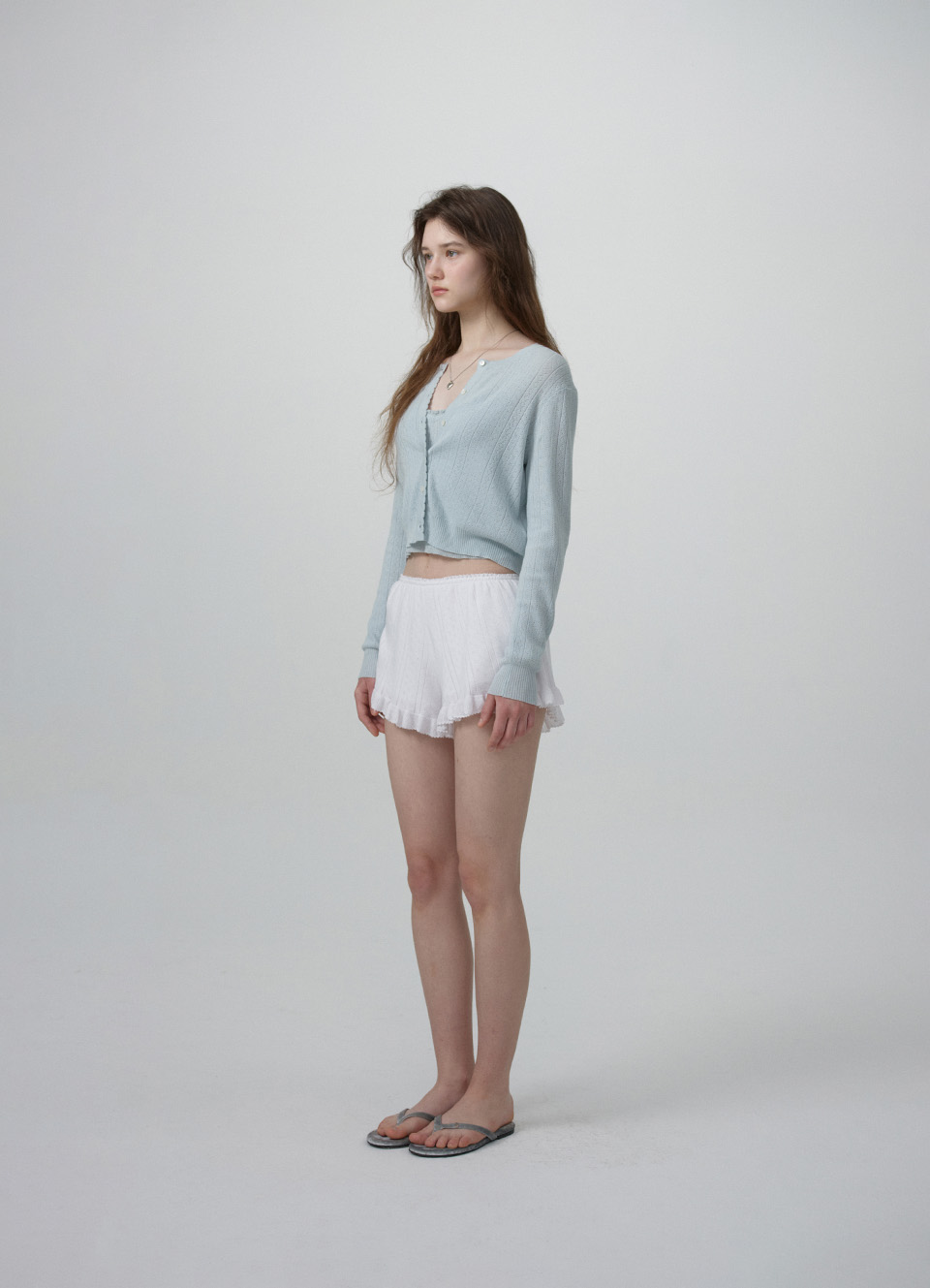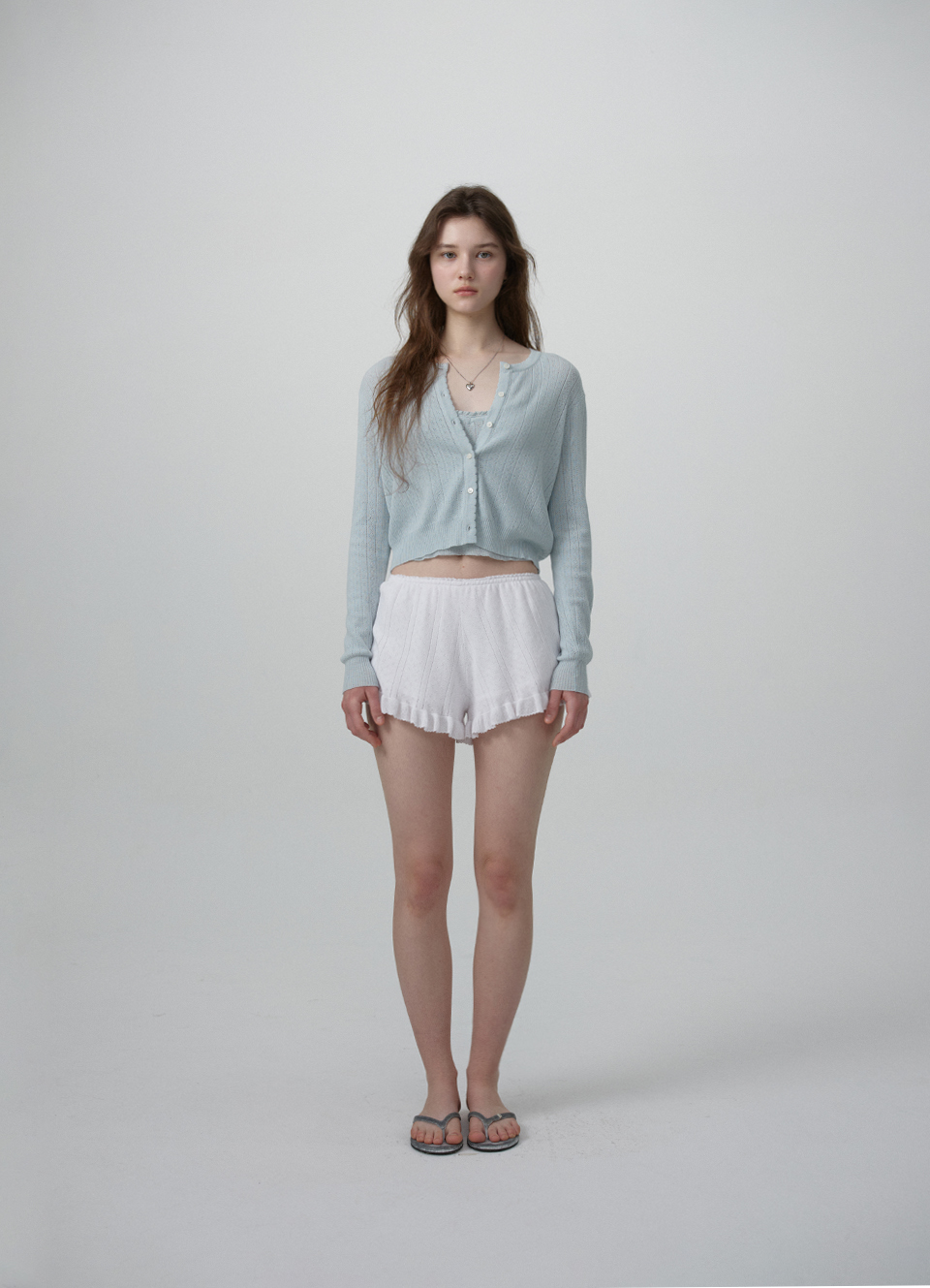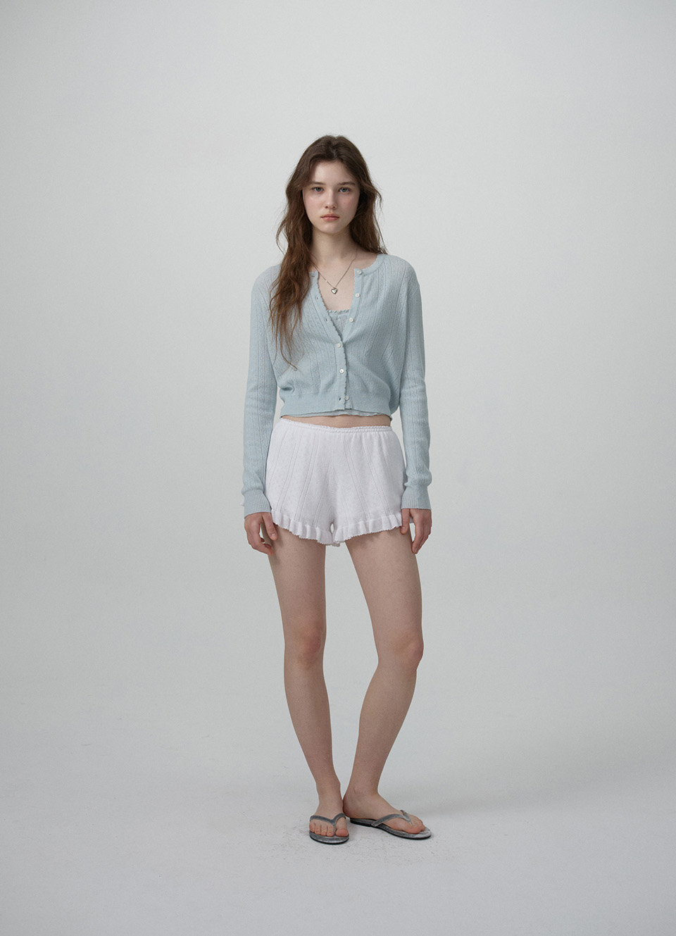 クロップド丈のカーディガンと、ストラップ長さ調節可能なスリーブレスで