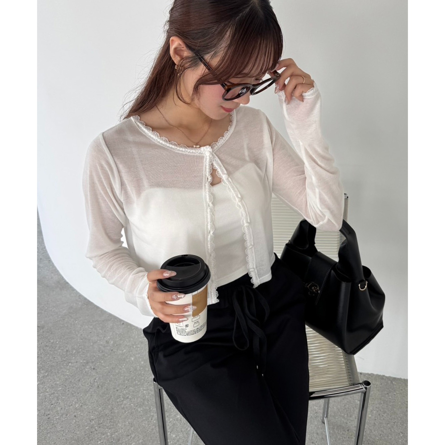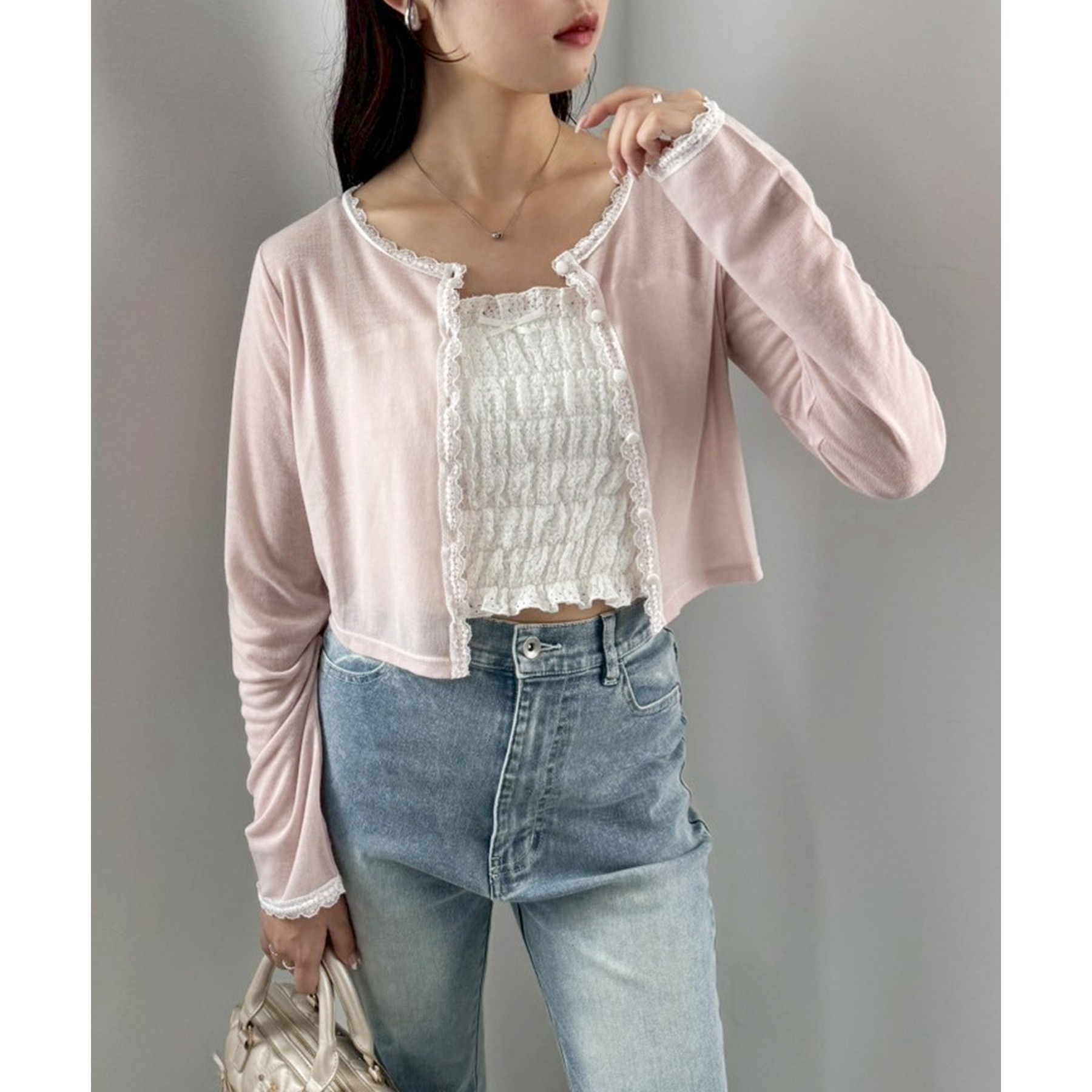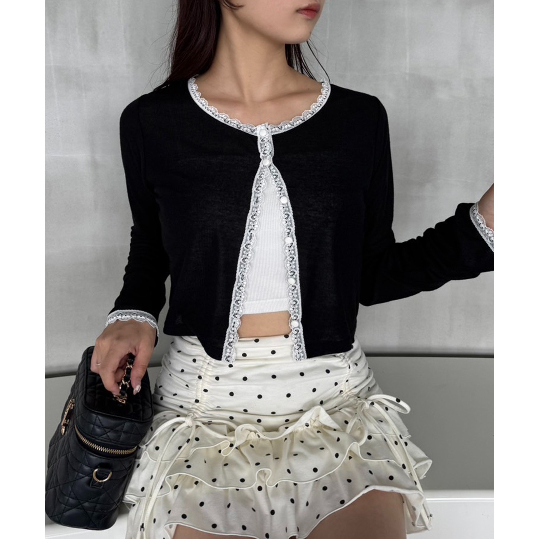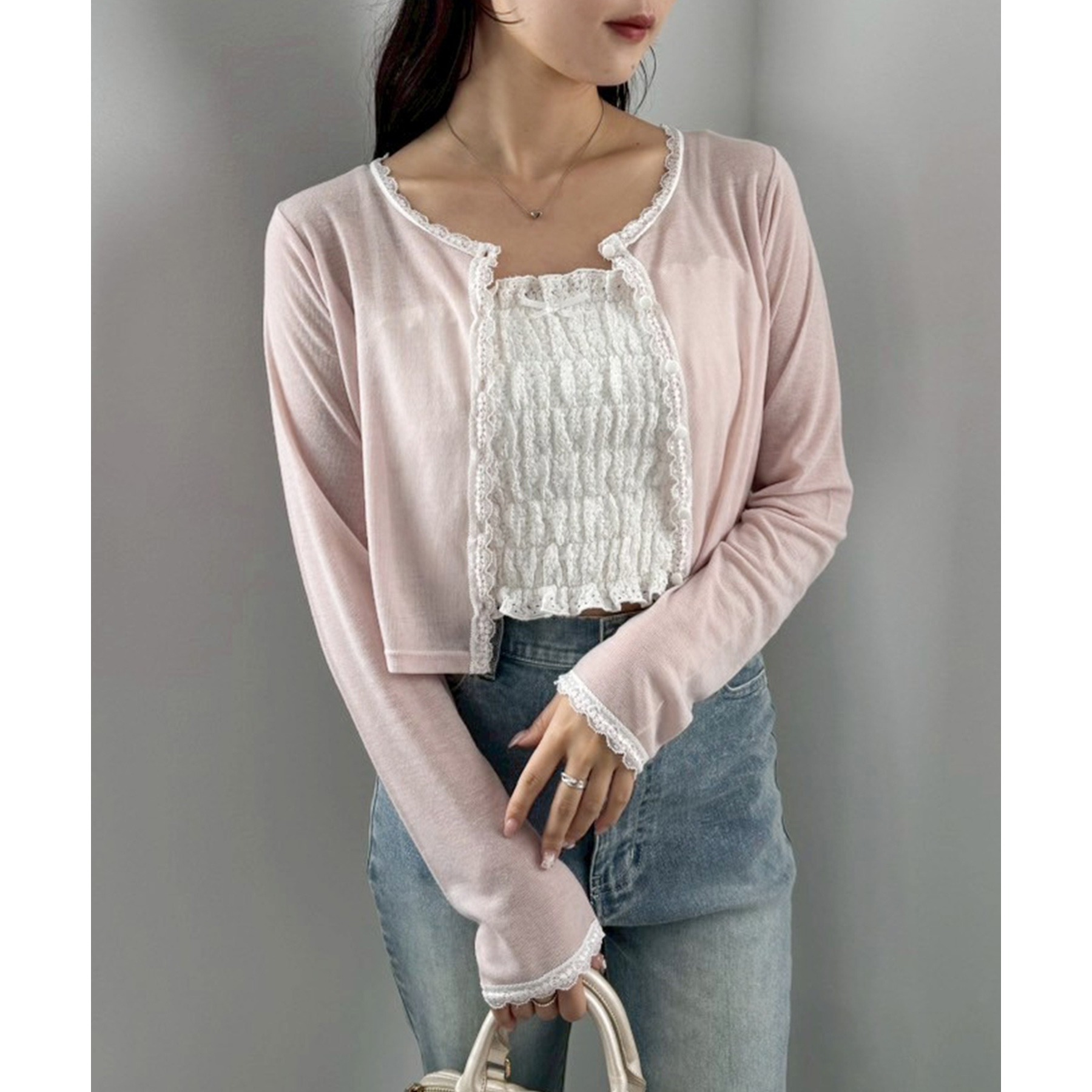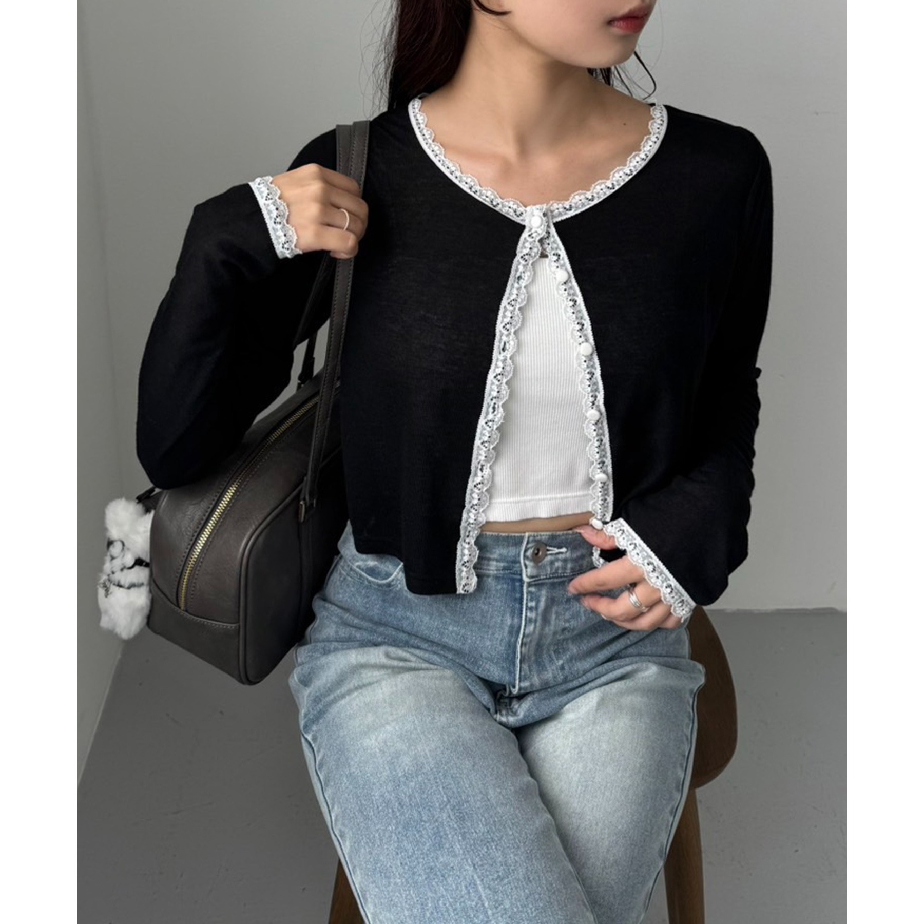 ショート丈でこなれ感があり、レースが華やかさをプラスしてくれるカット素材のカーディガン