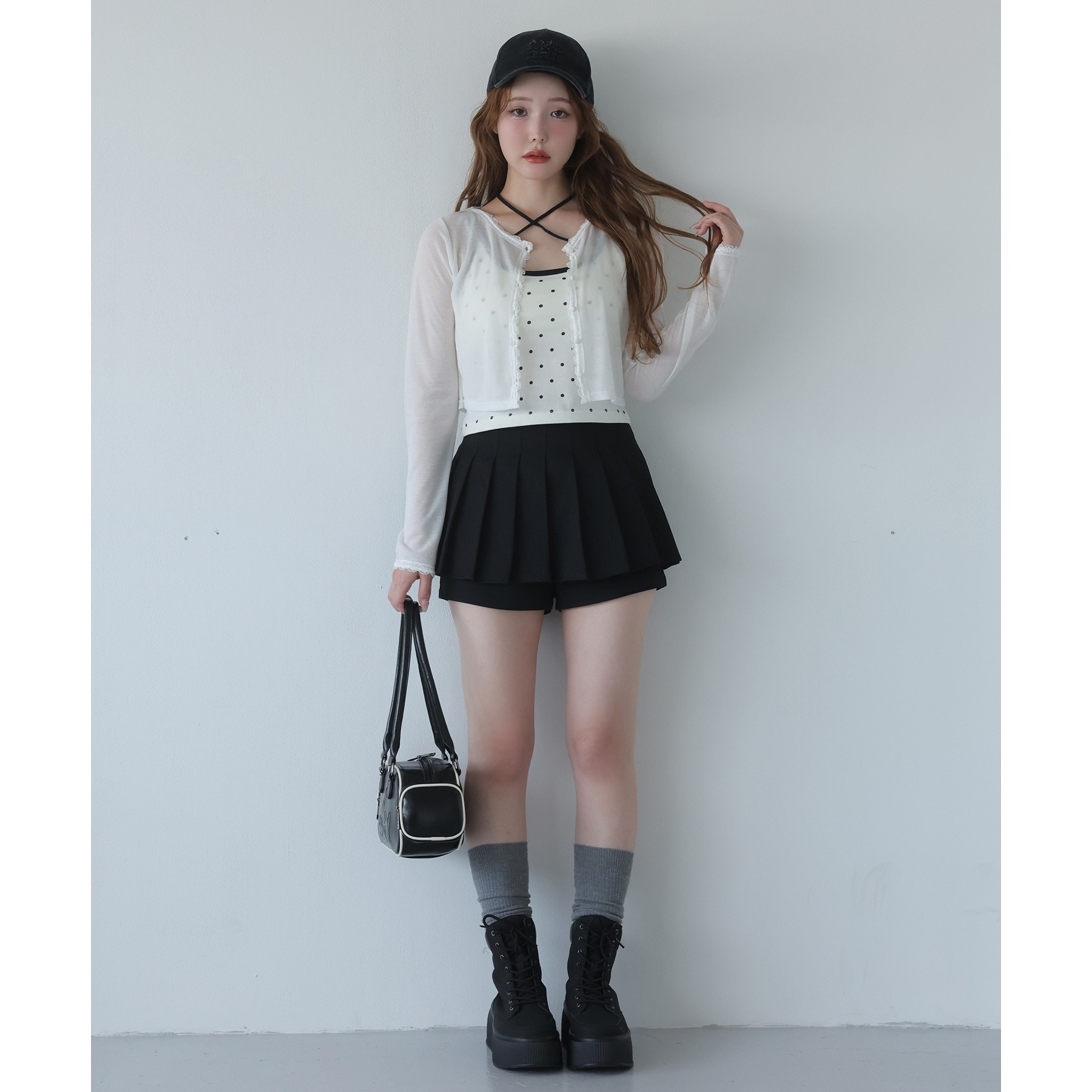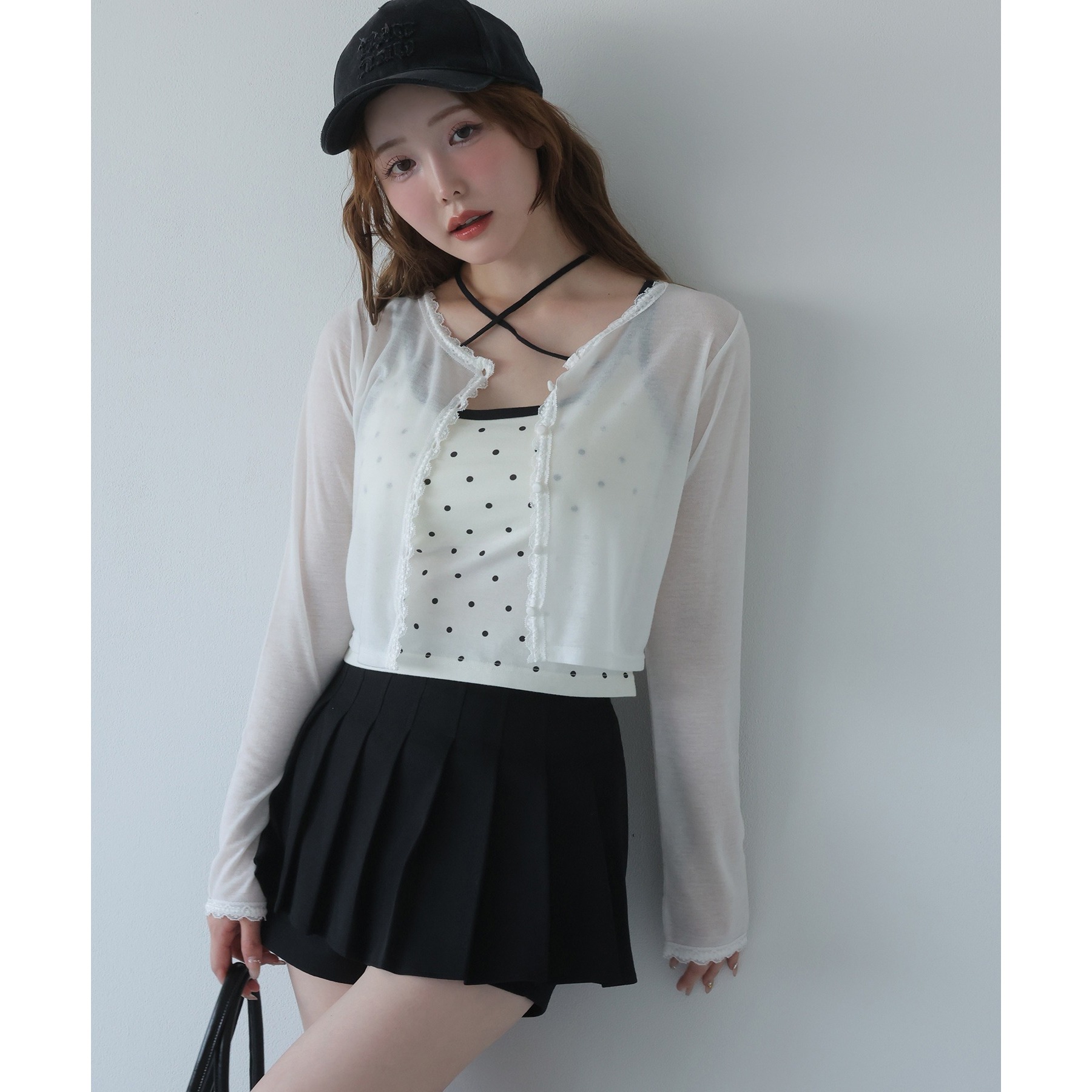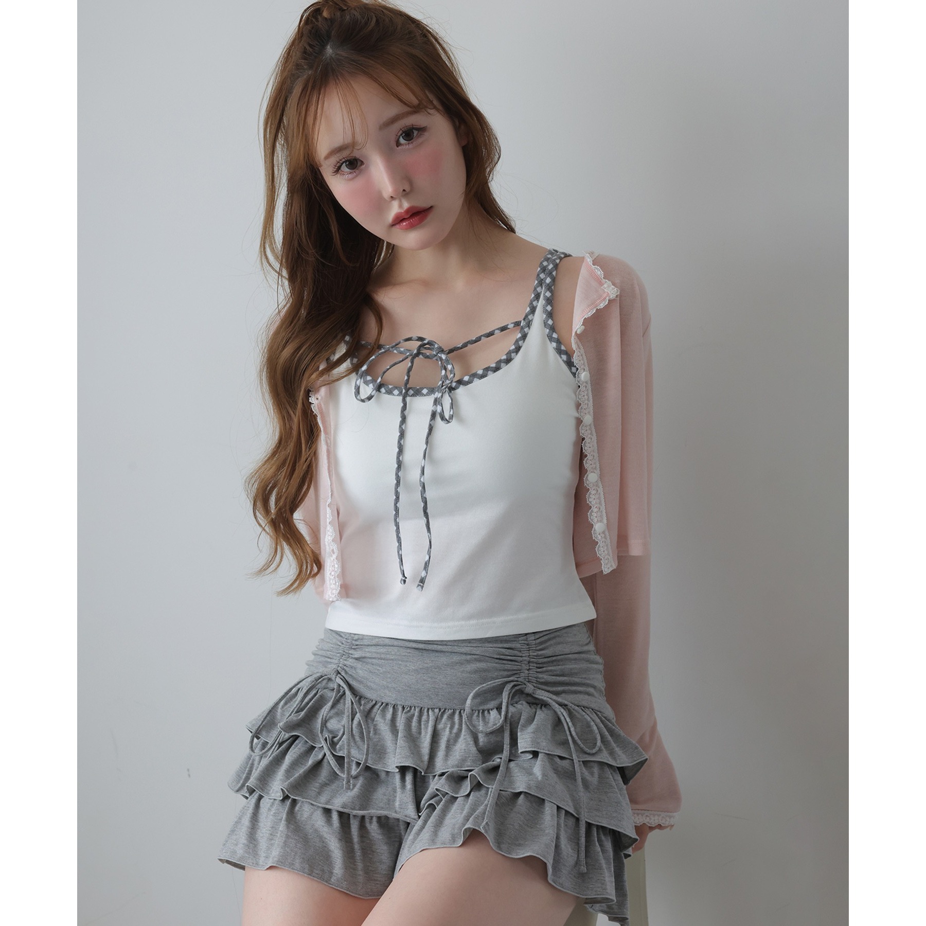 トップスとして着るときは前のボタンを閉じ、中にキャミソールを合わせるのがオススメ。