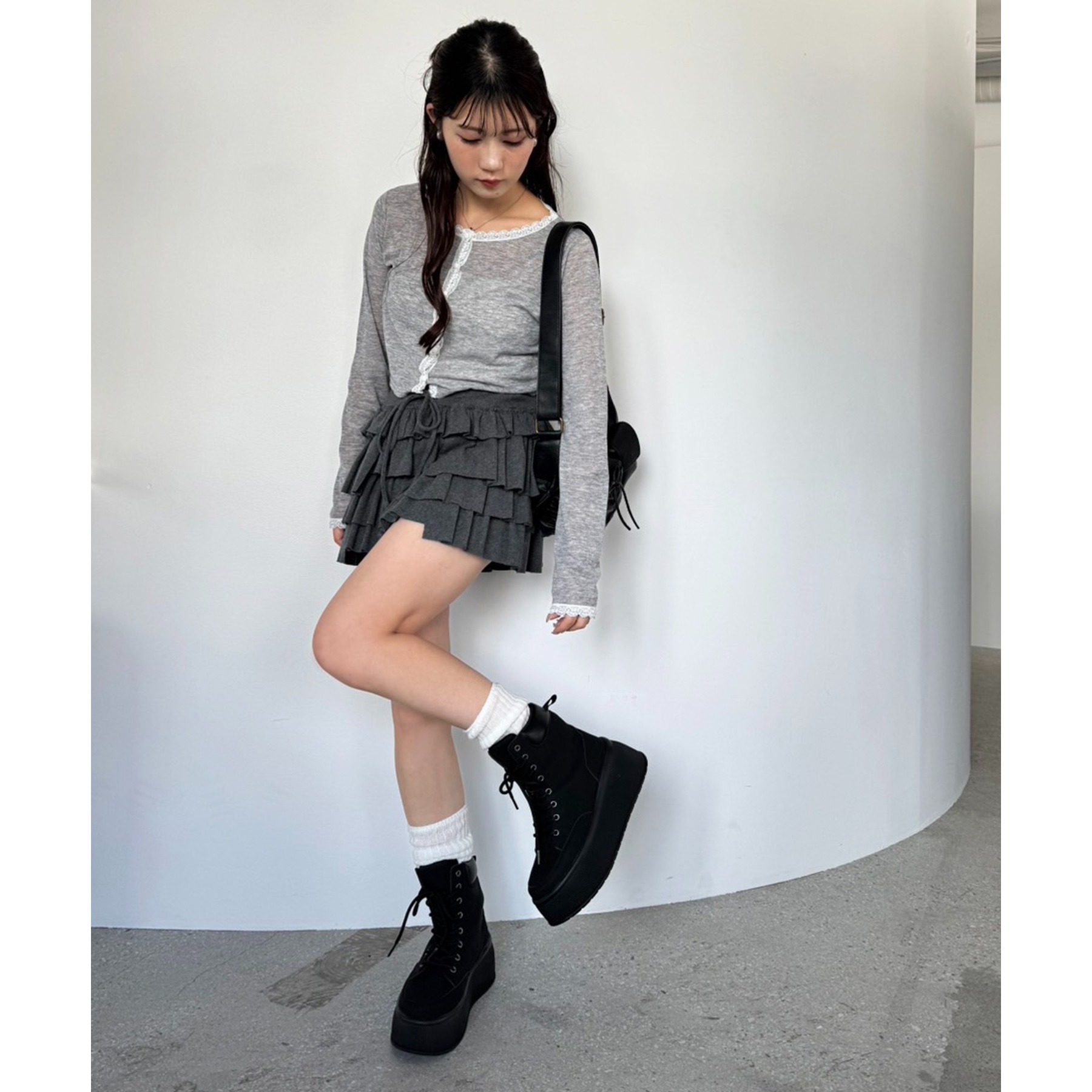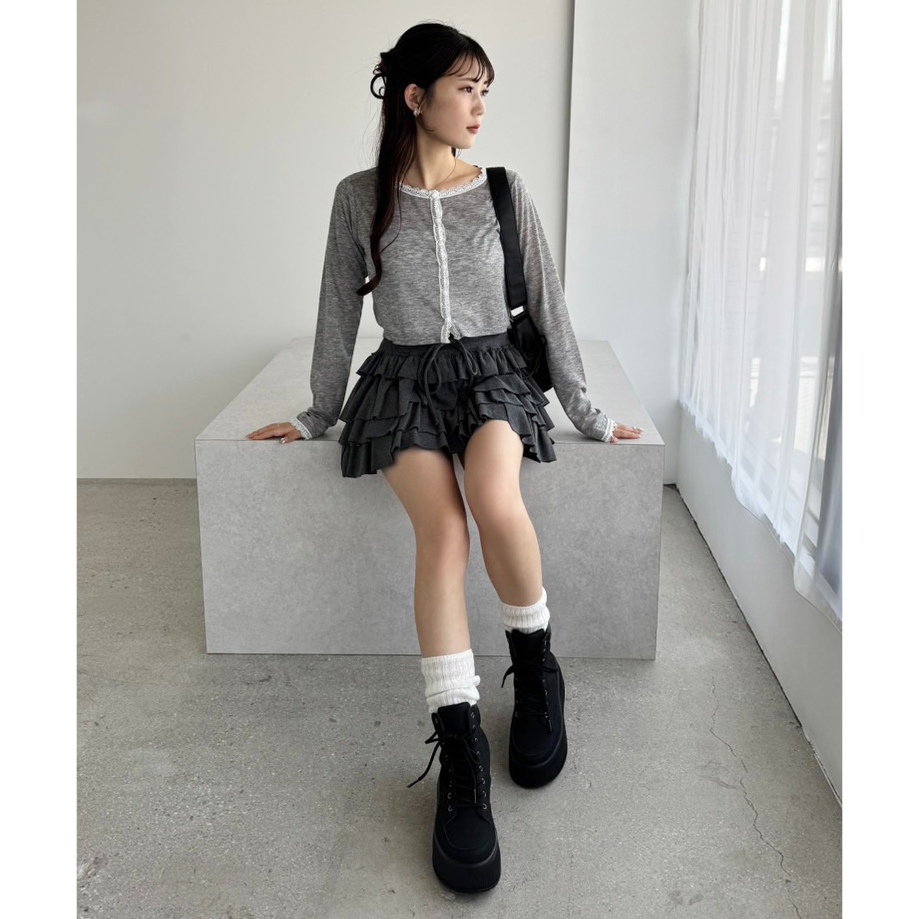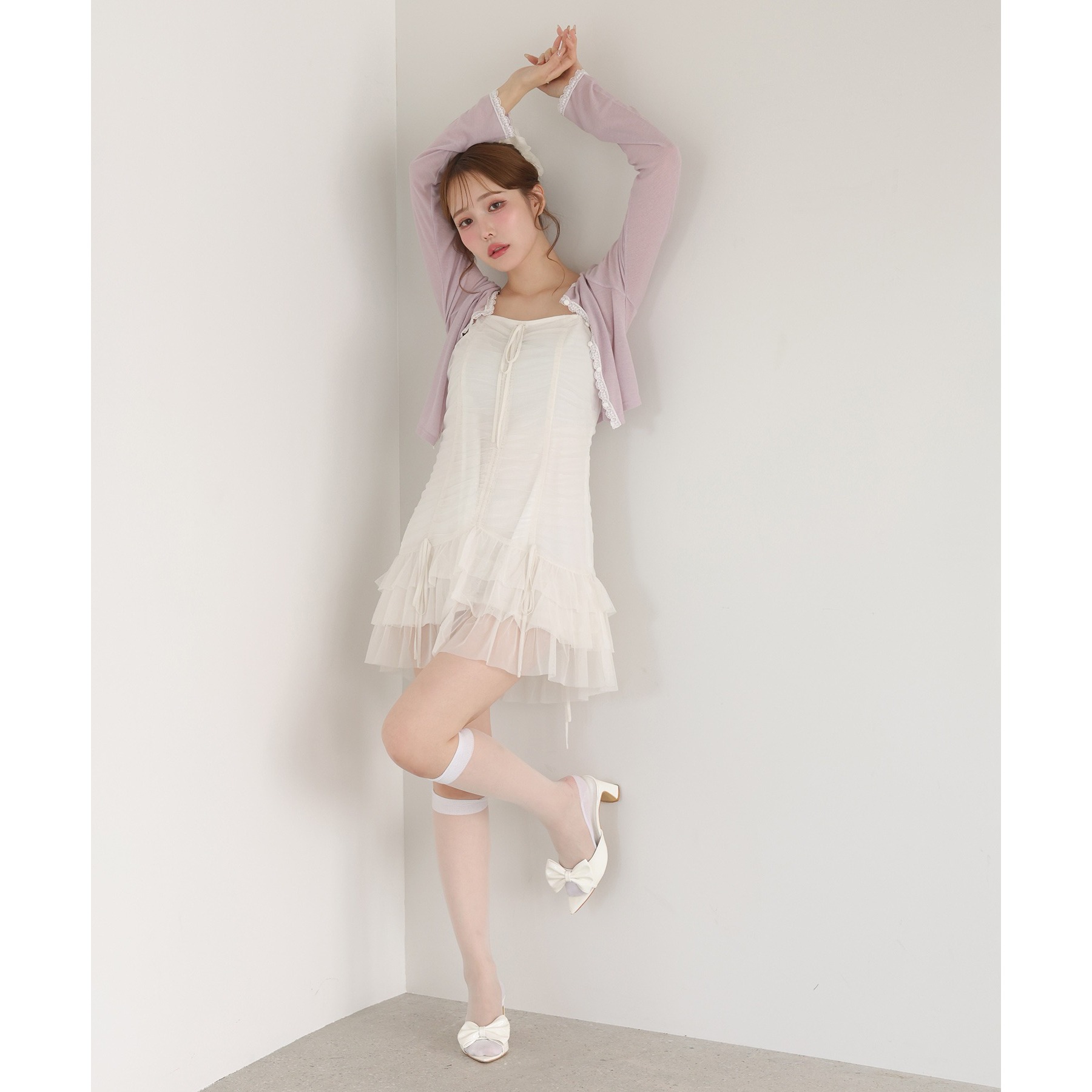 トップスとして着るときは前のボタンを閉じ、中にキャミソールを合わせるのがオススメ。