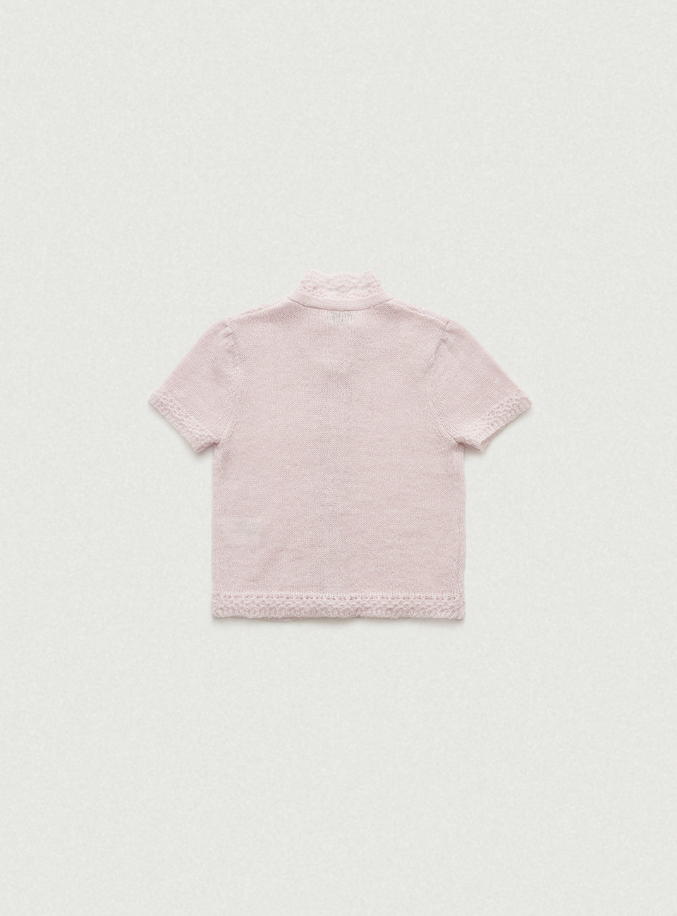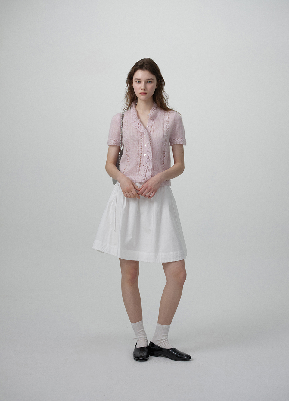 貝ボタンを使用したボタン留め仕様の半袖ニットカーディガン