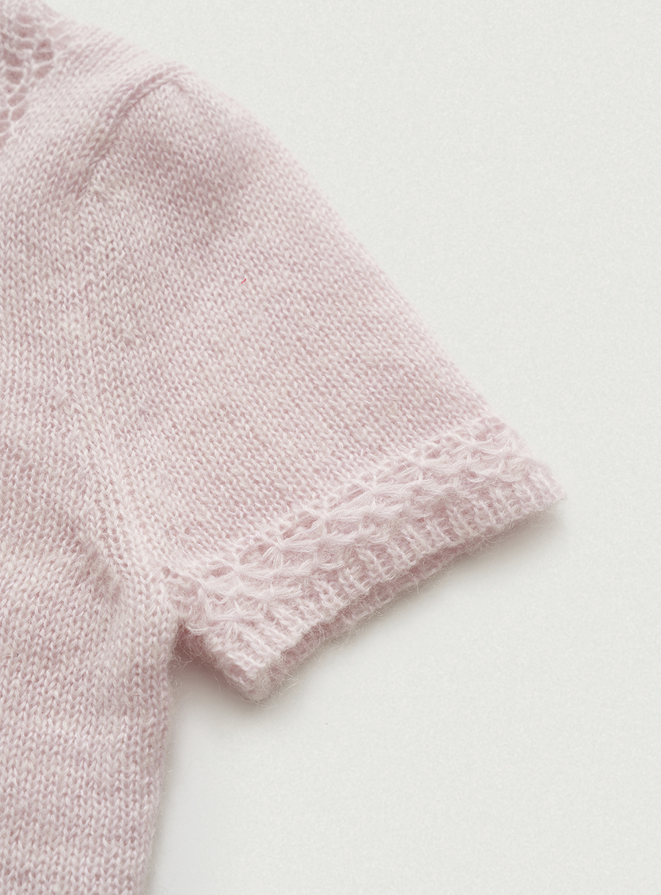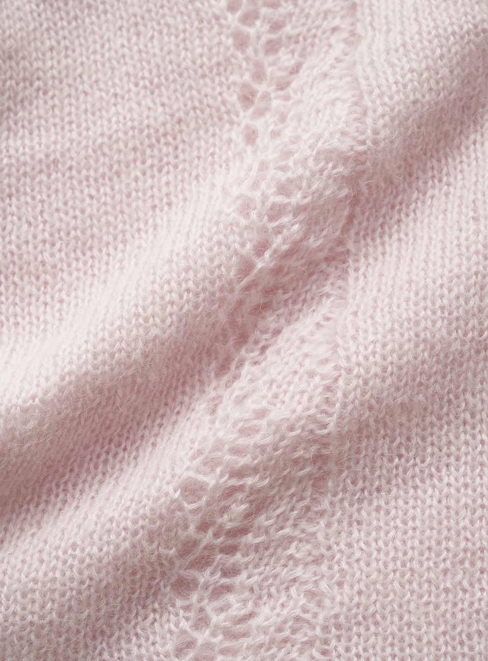 柔らかなラベンダーで、ヘアリーな糸が特徴のモヘア×ウール混ニット