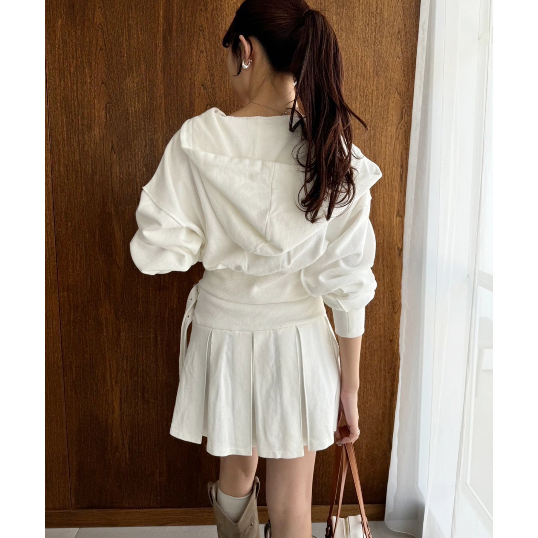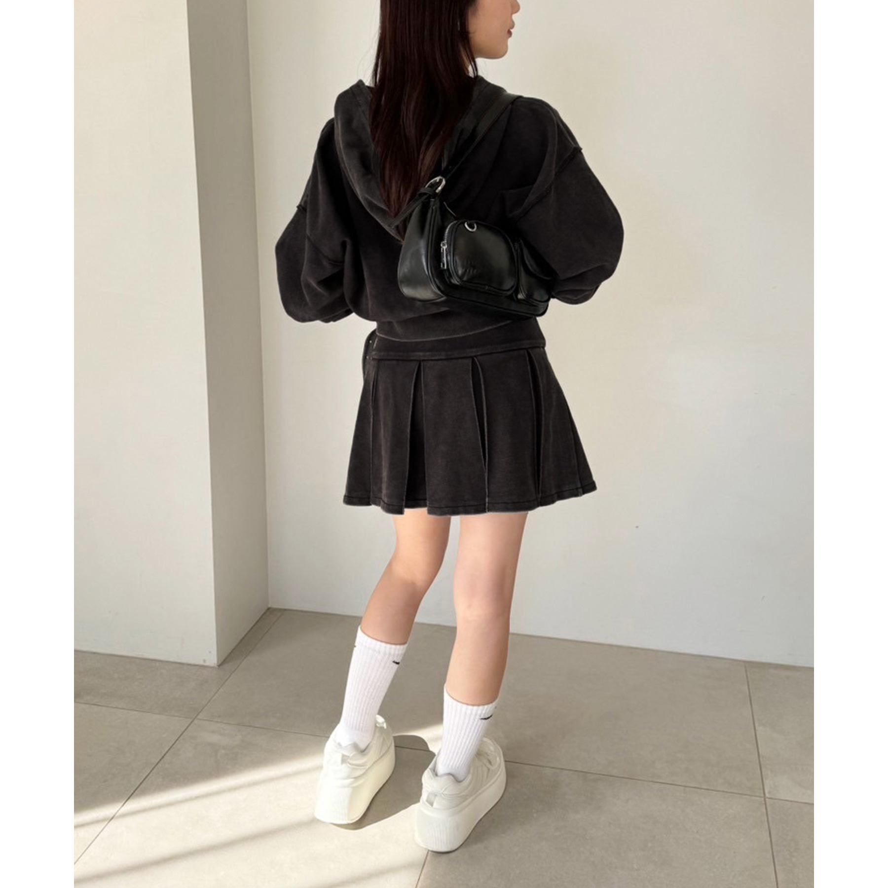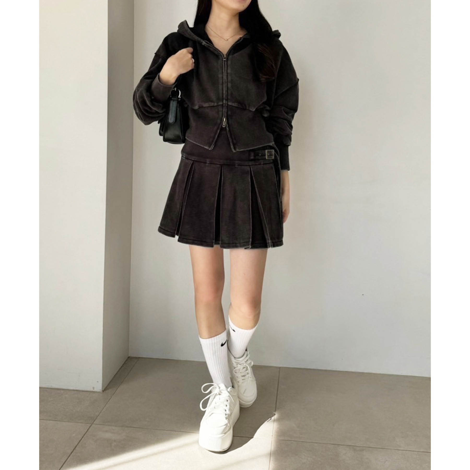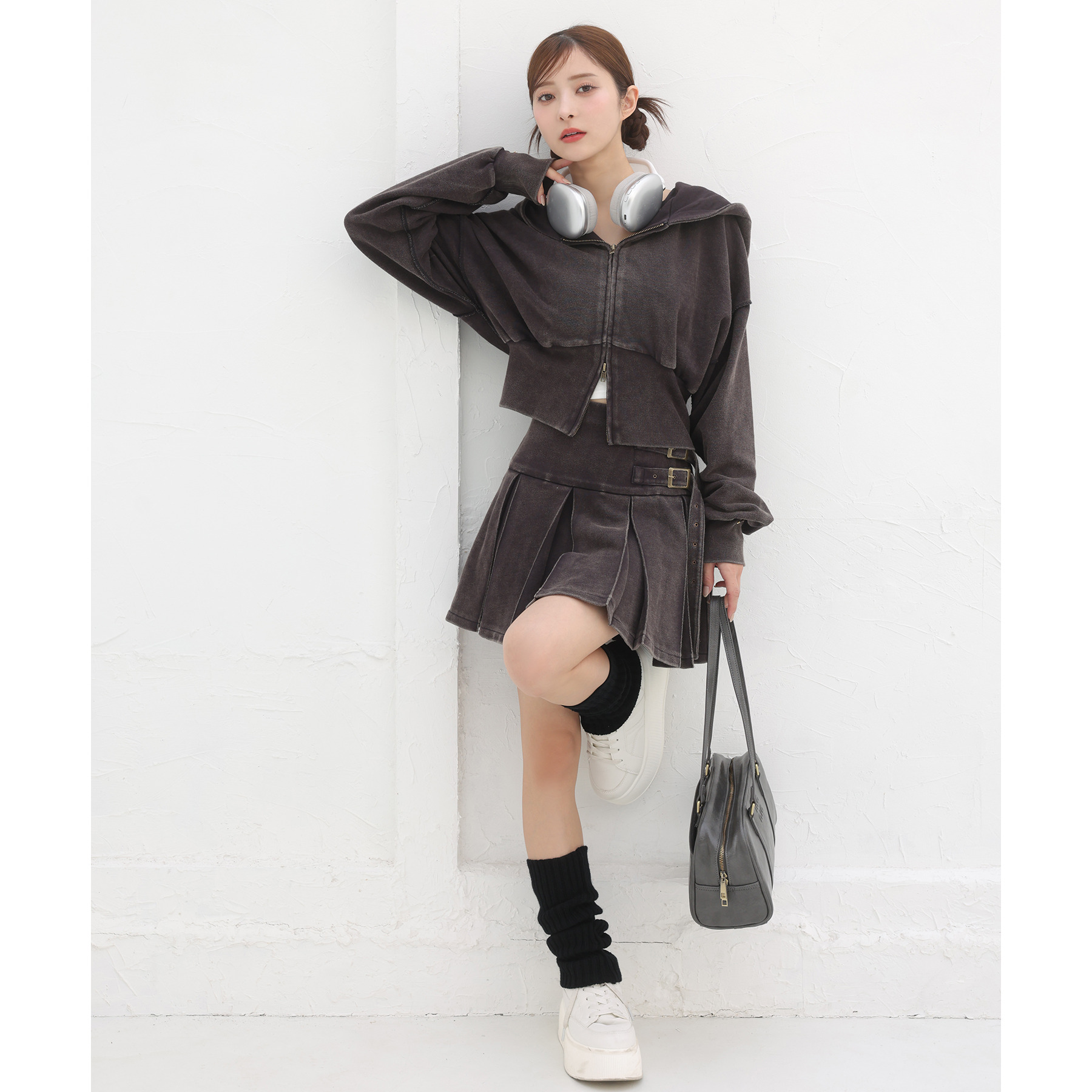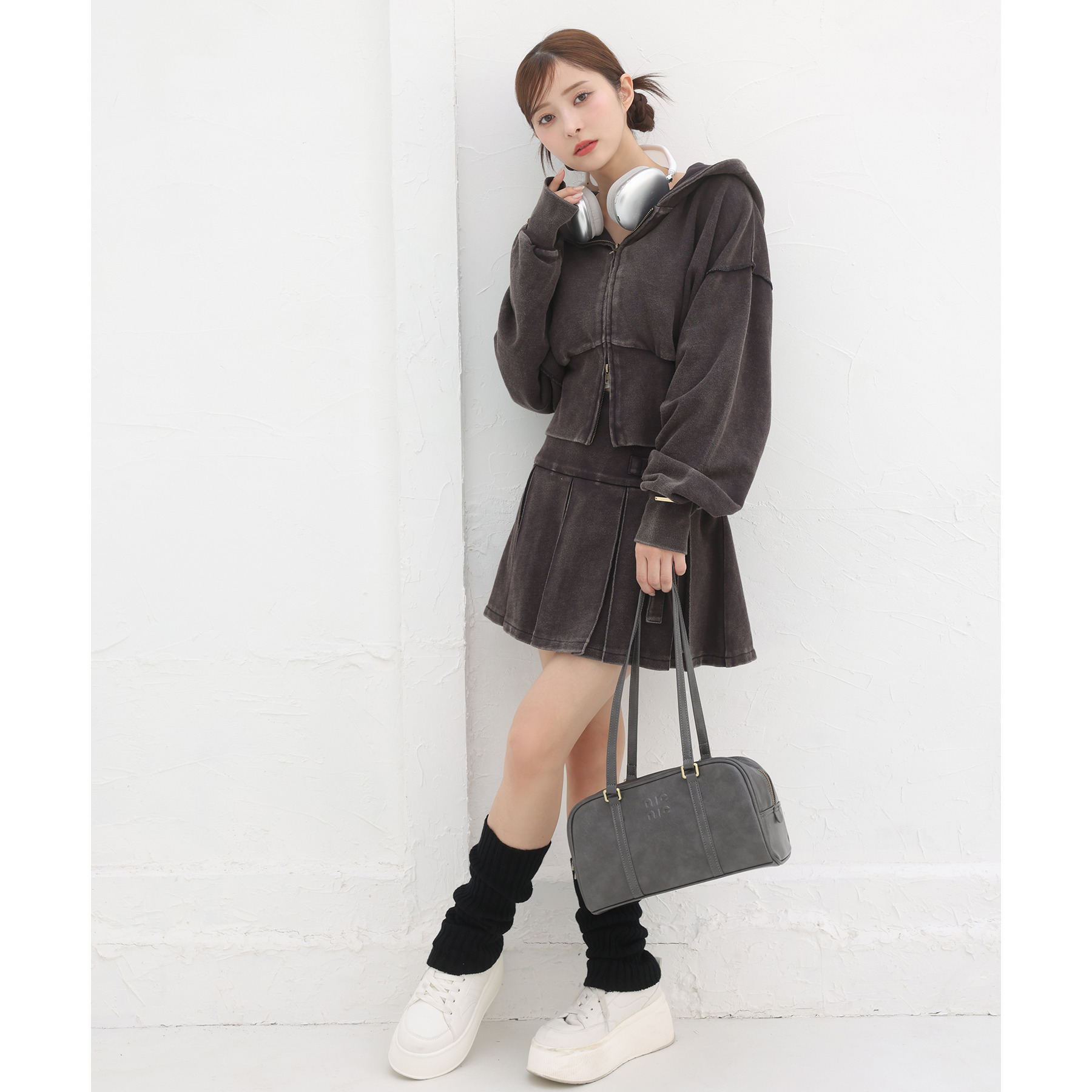 足元はハイソックス×スニーカーで、トレンド感溢れるスタイルに。