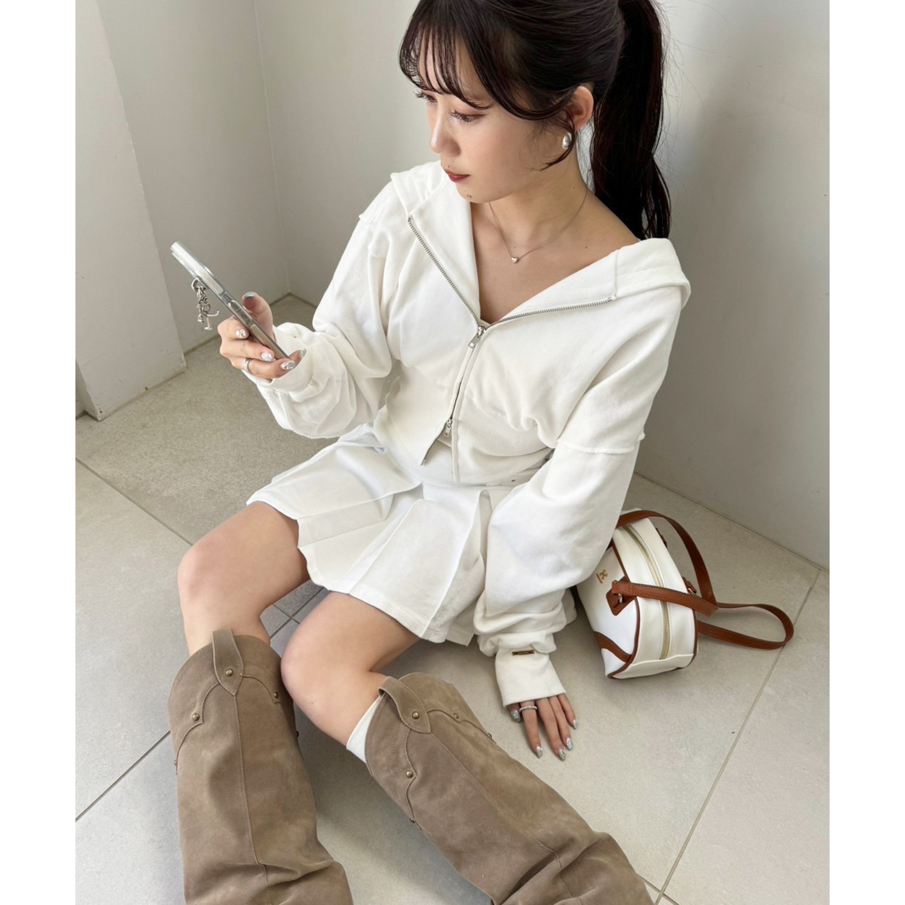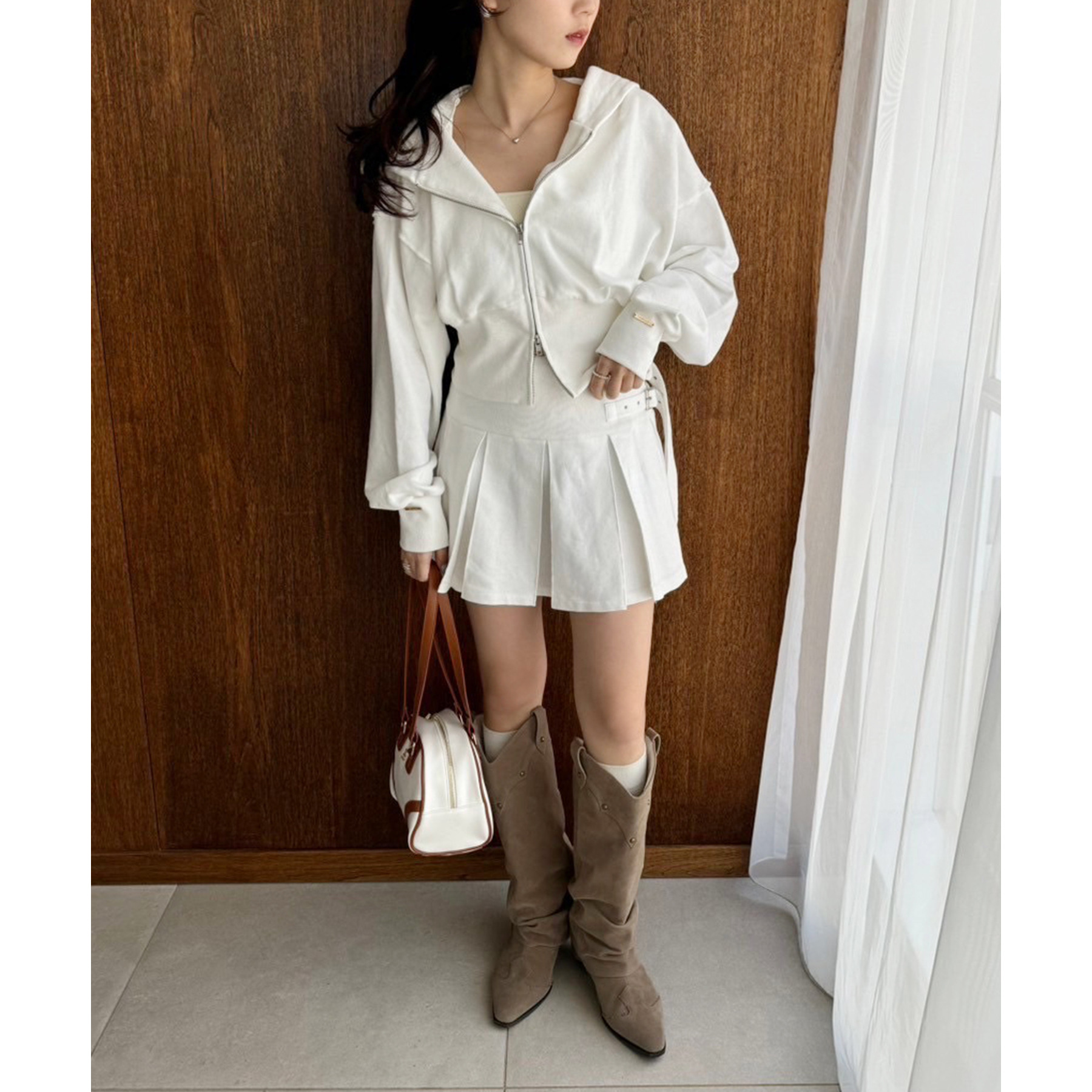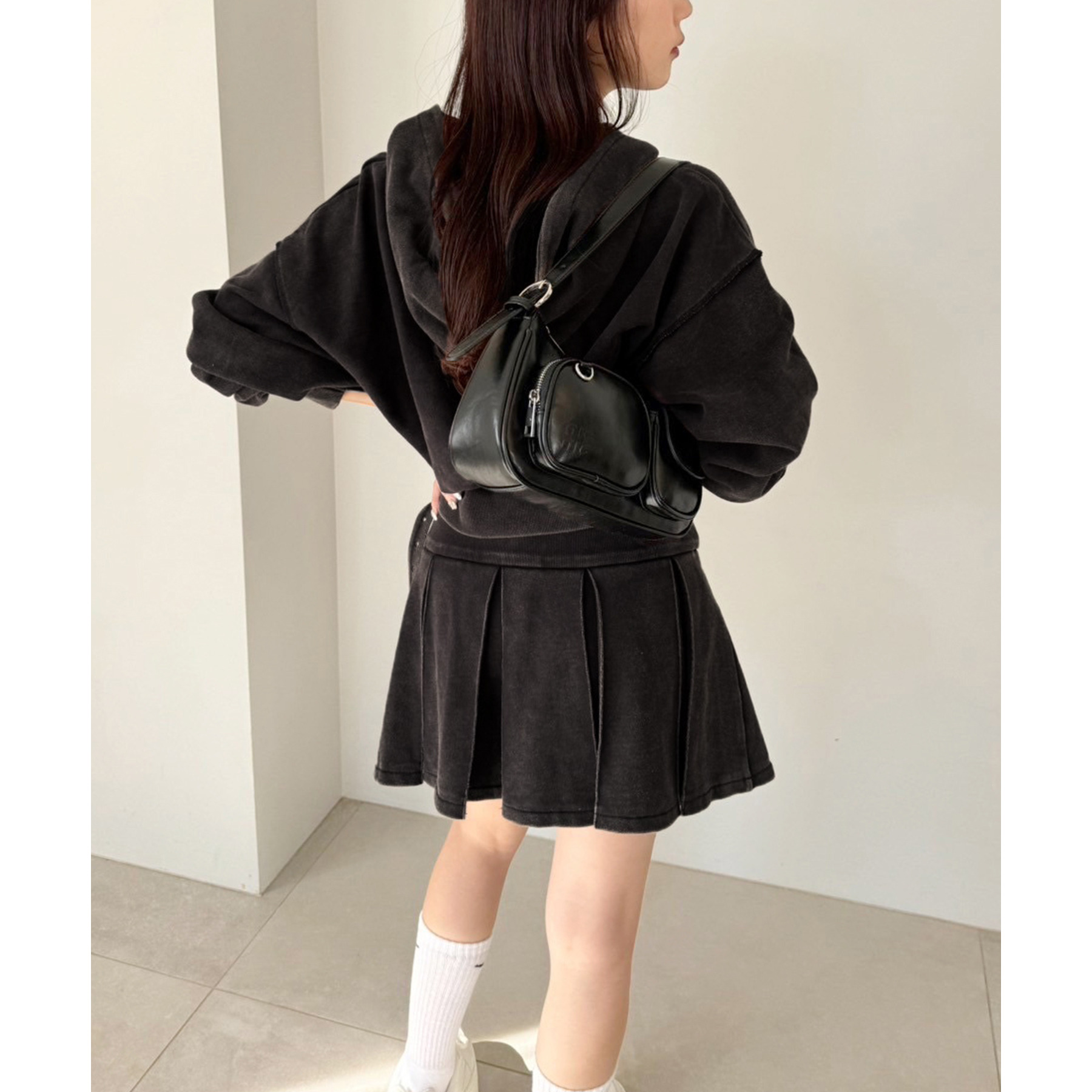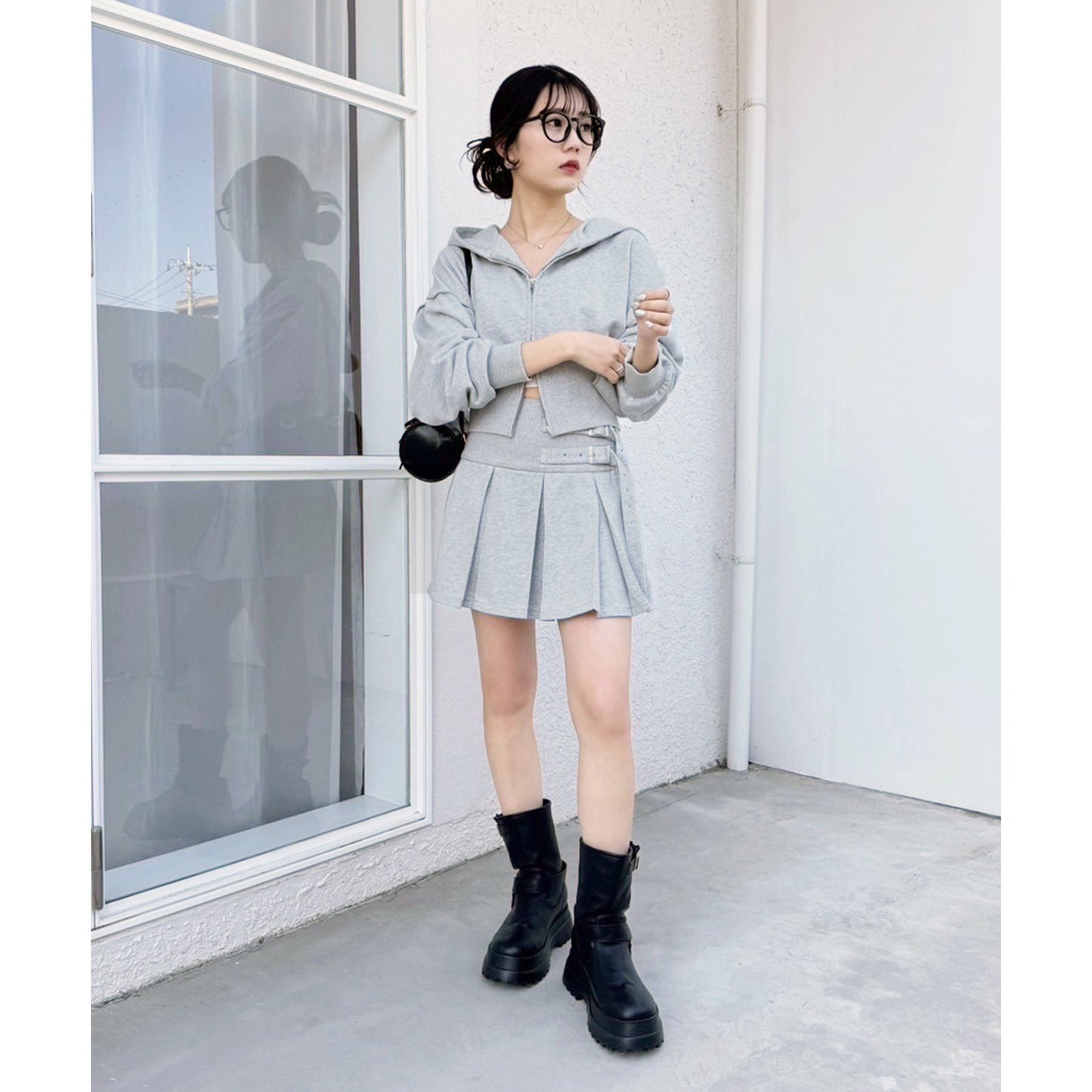 足元はハイソックス×スニーカーで、トレンド感溢れるスタイルに。