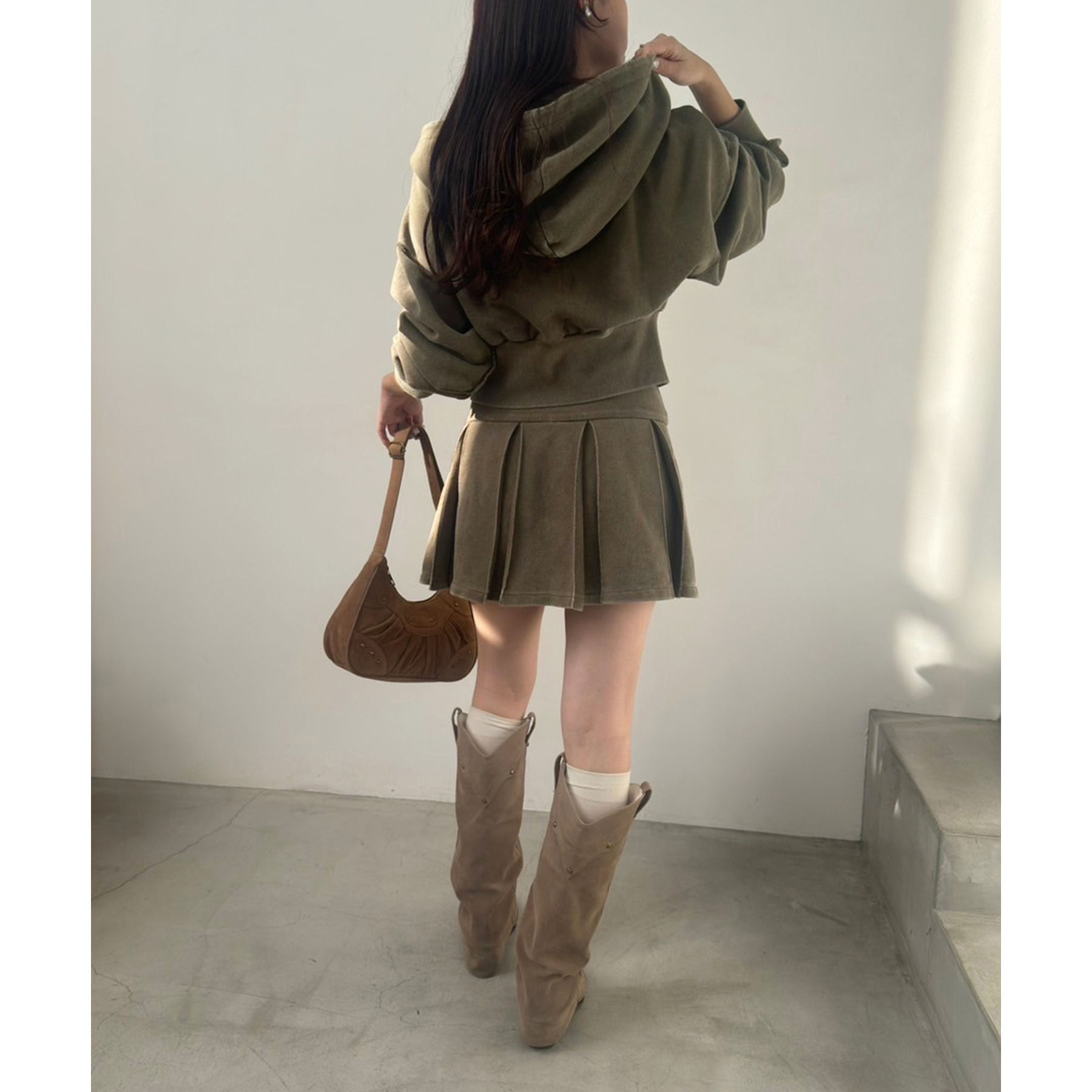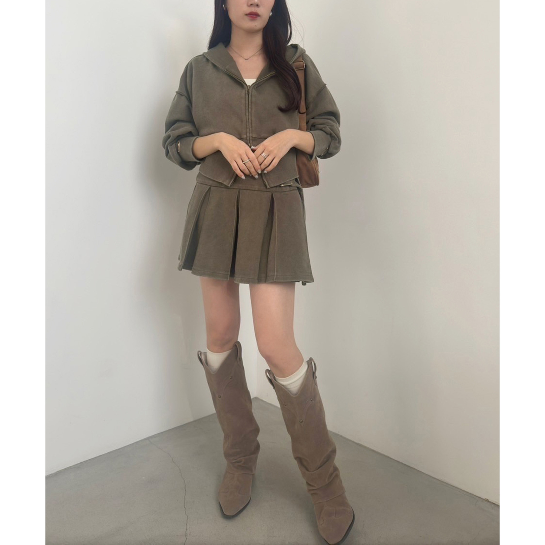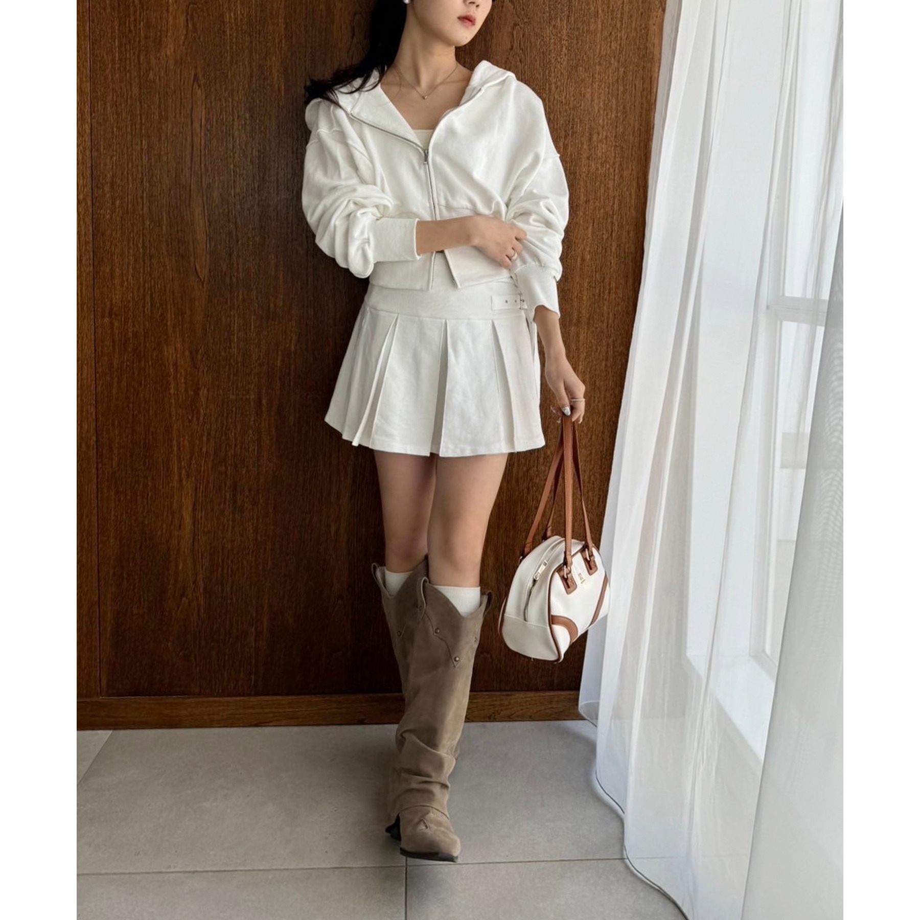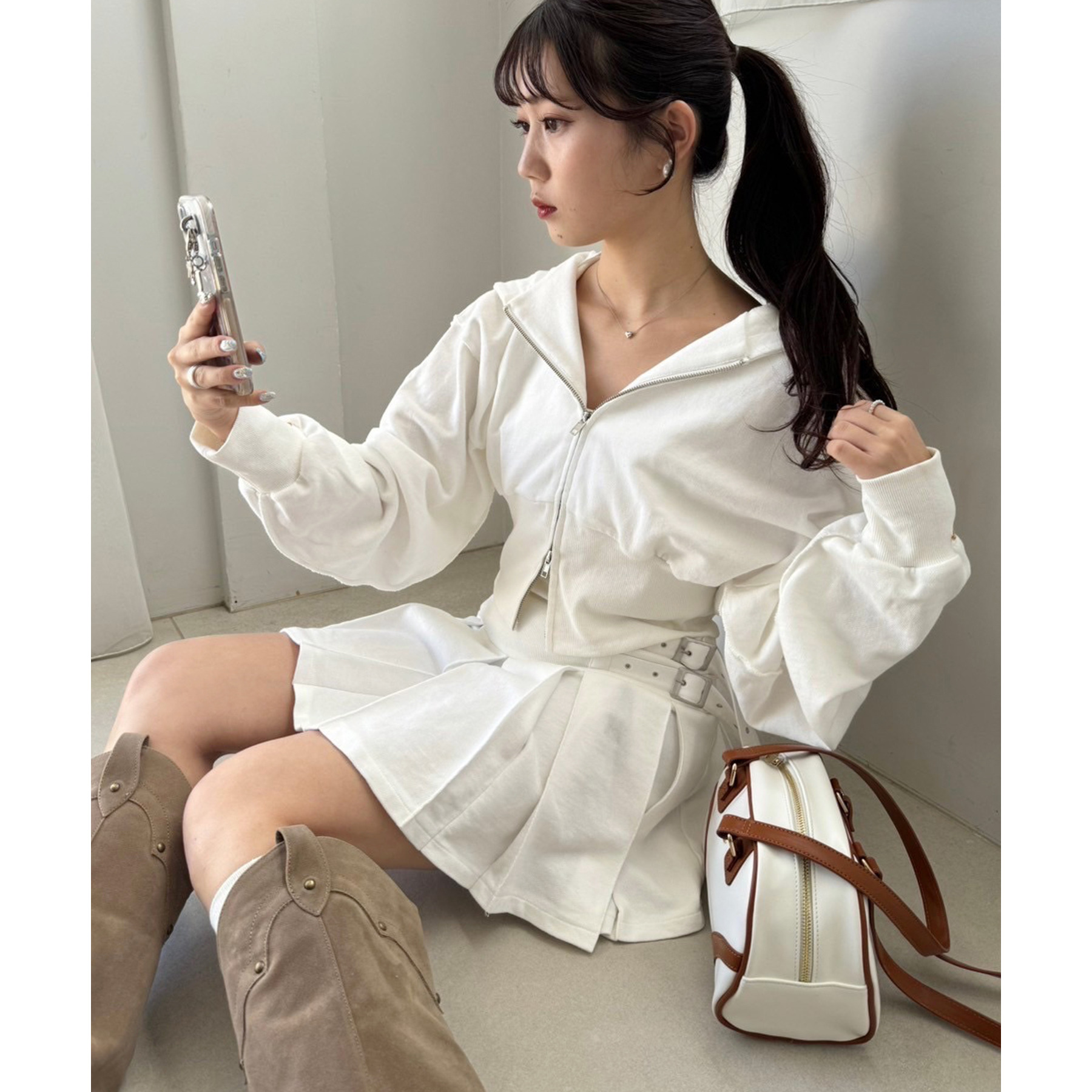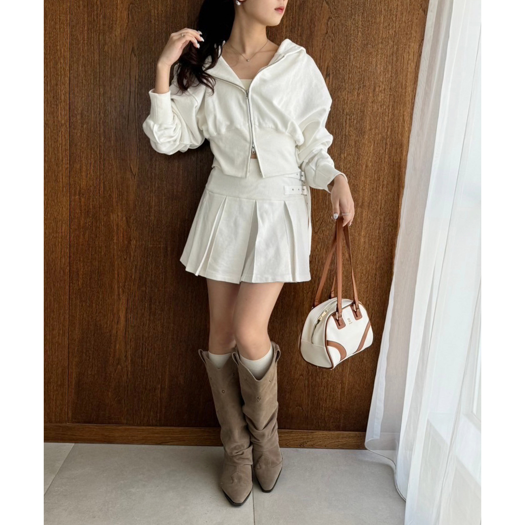 足元はハイソックス×スニーカーで、トレンド感溢れるスタイルに。