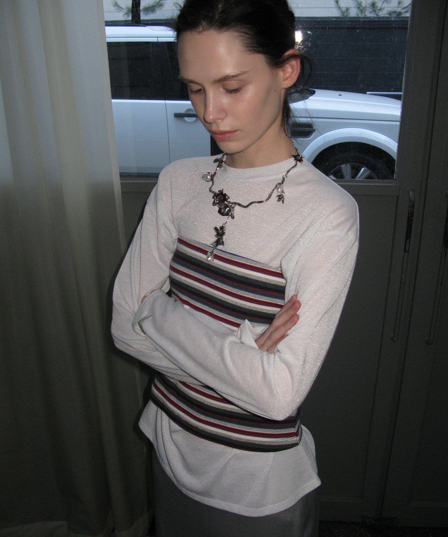 -単品でもレイヤードでも着用できて活用度が高く、セミクロップ丈で上半身の比率をバランスよく演出し、バストラインに内蔵されたコルセット中央バンドで安定した着用感を提供します。