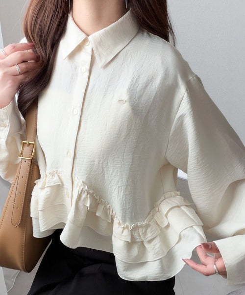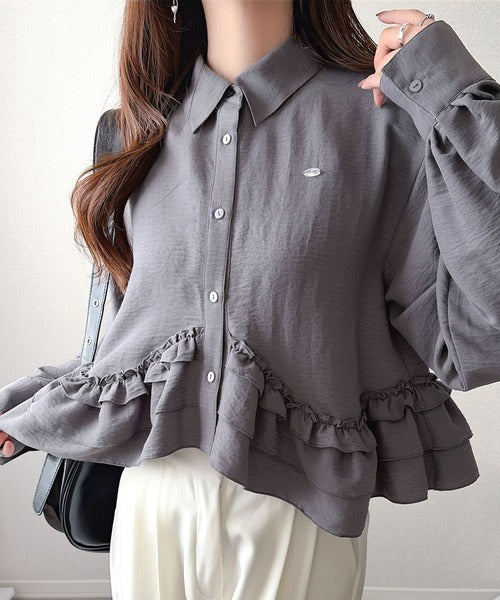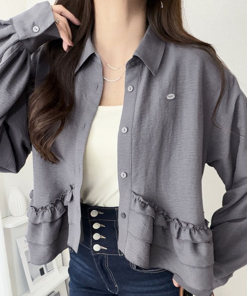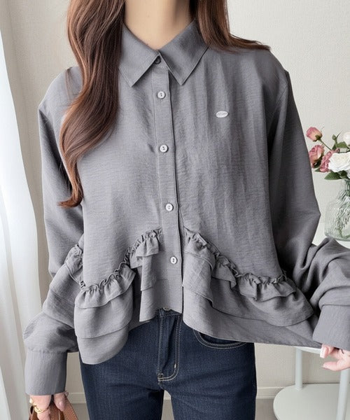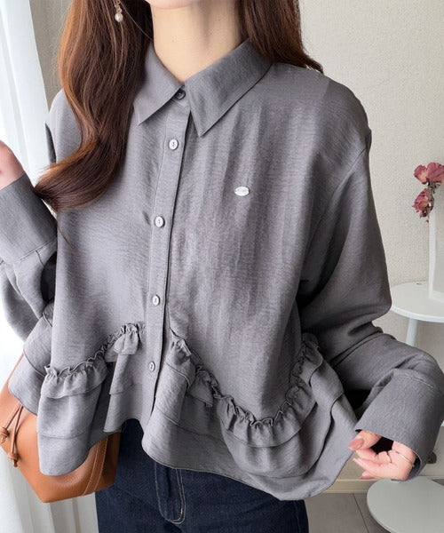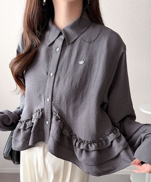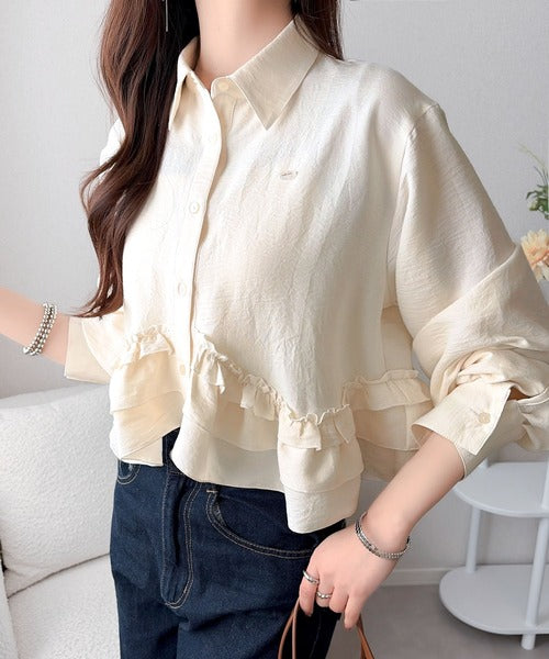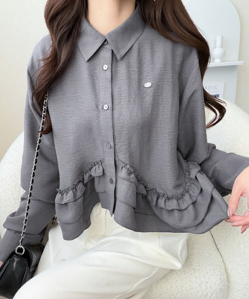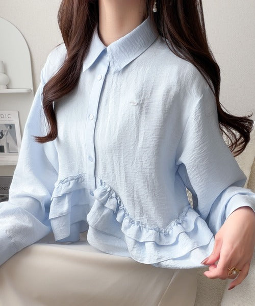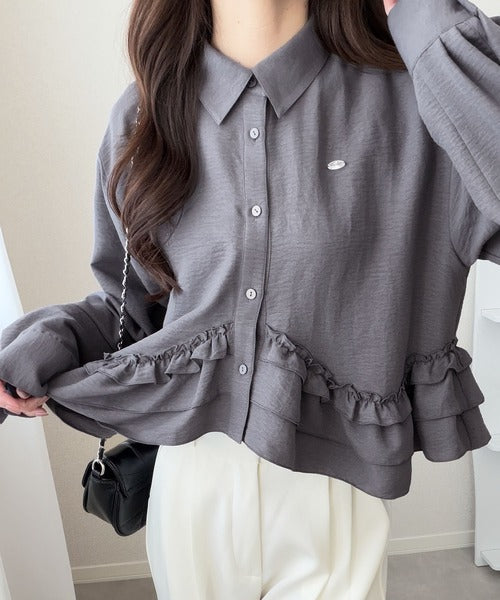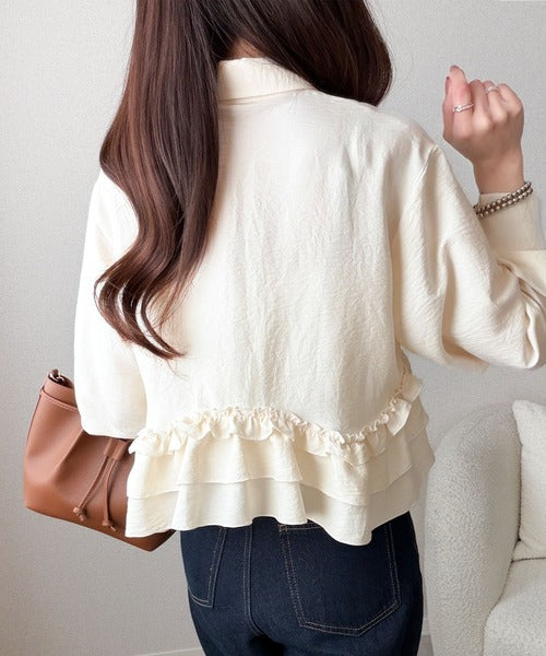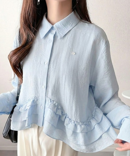 存在感のあるフリルが華やかで、一枚でサマになるシャツブラウス。