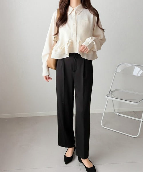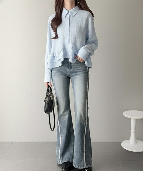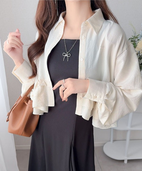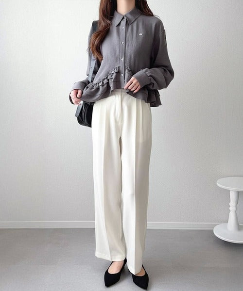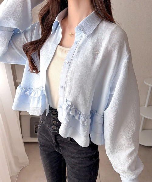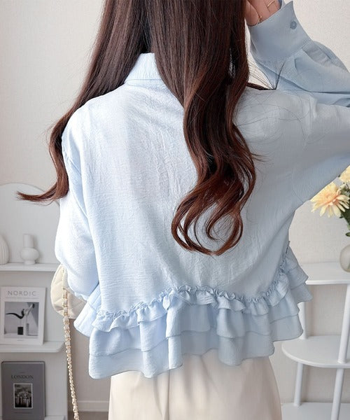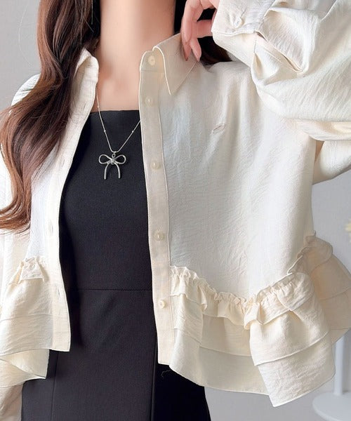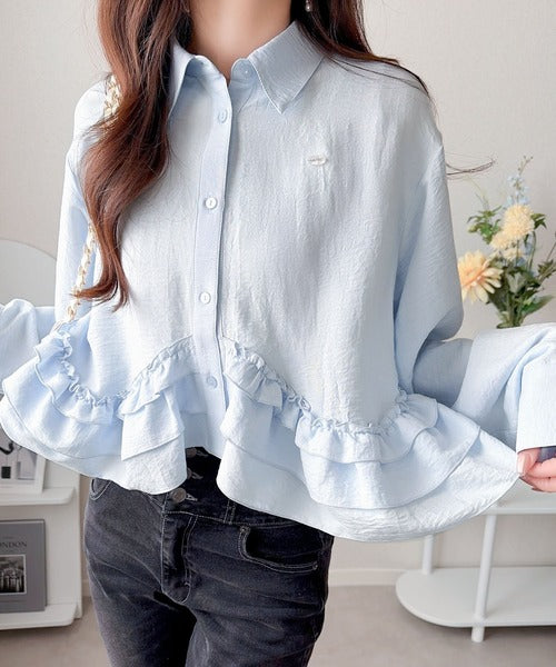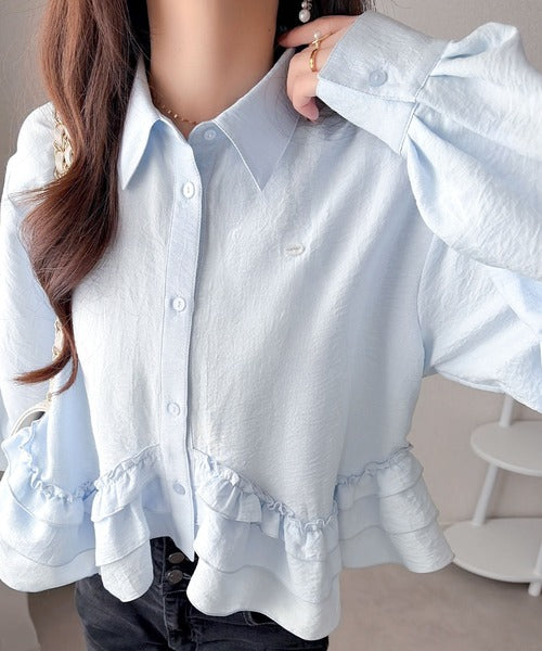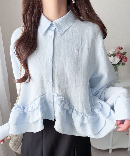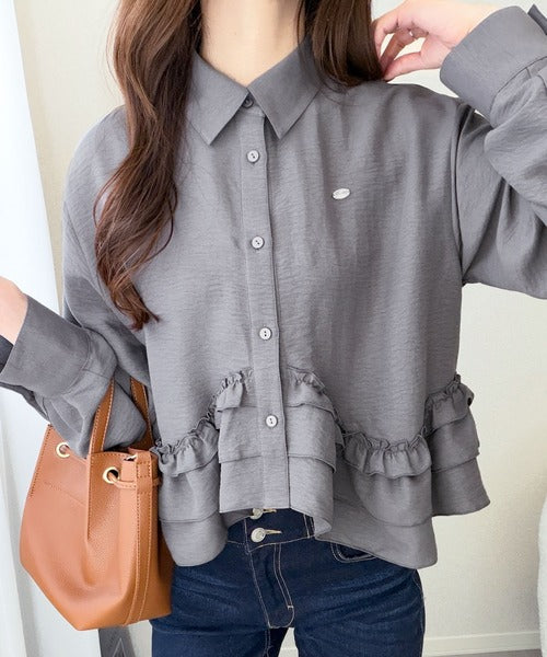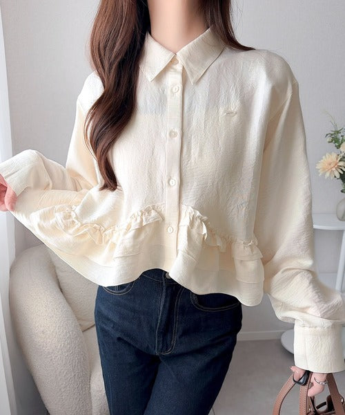存在感のあるフリルが華やかで、一枚でサマになるシャツブラウス。