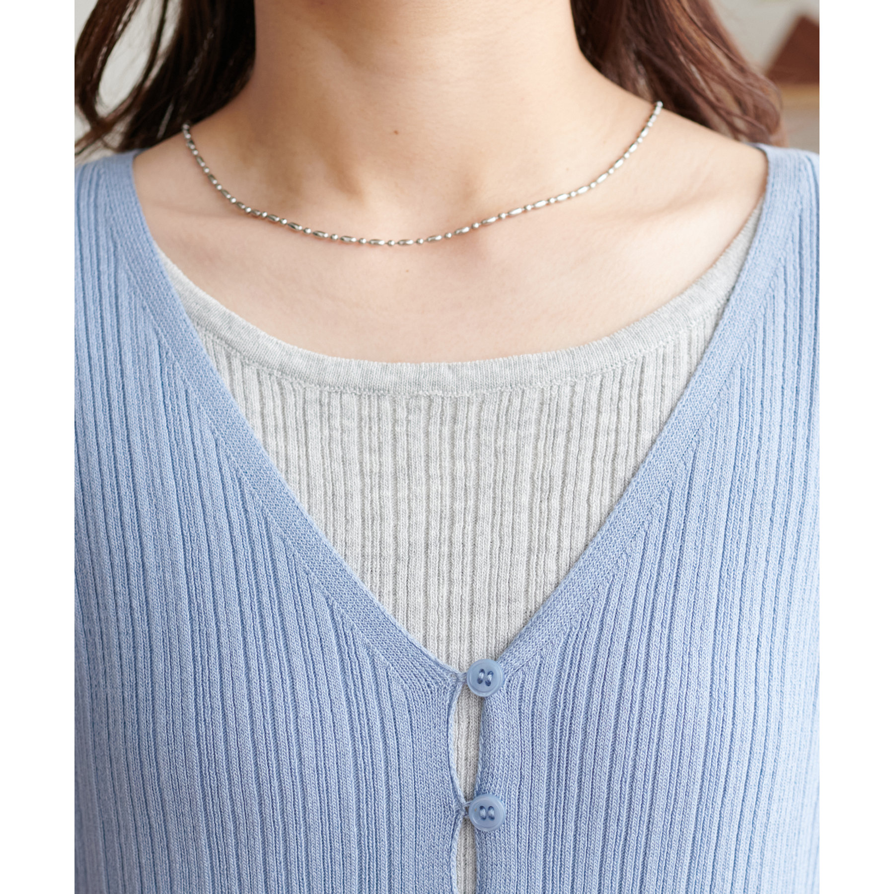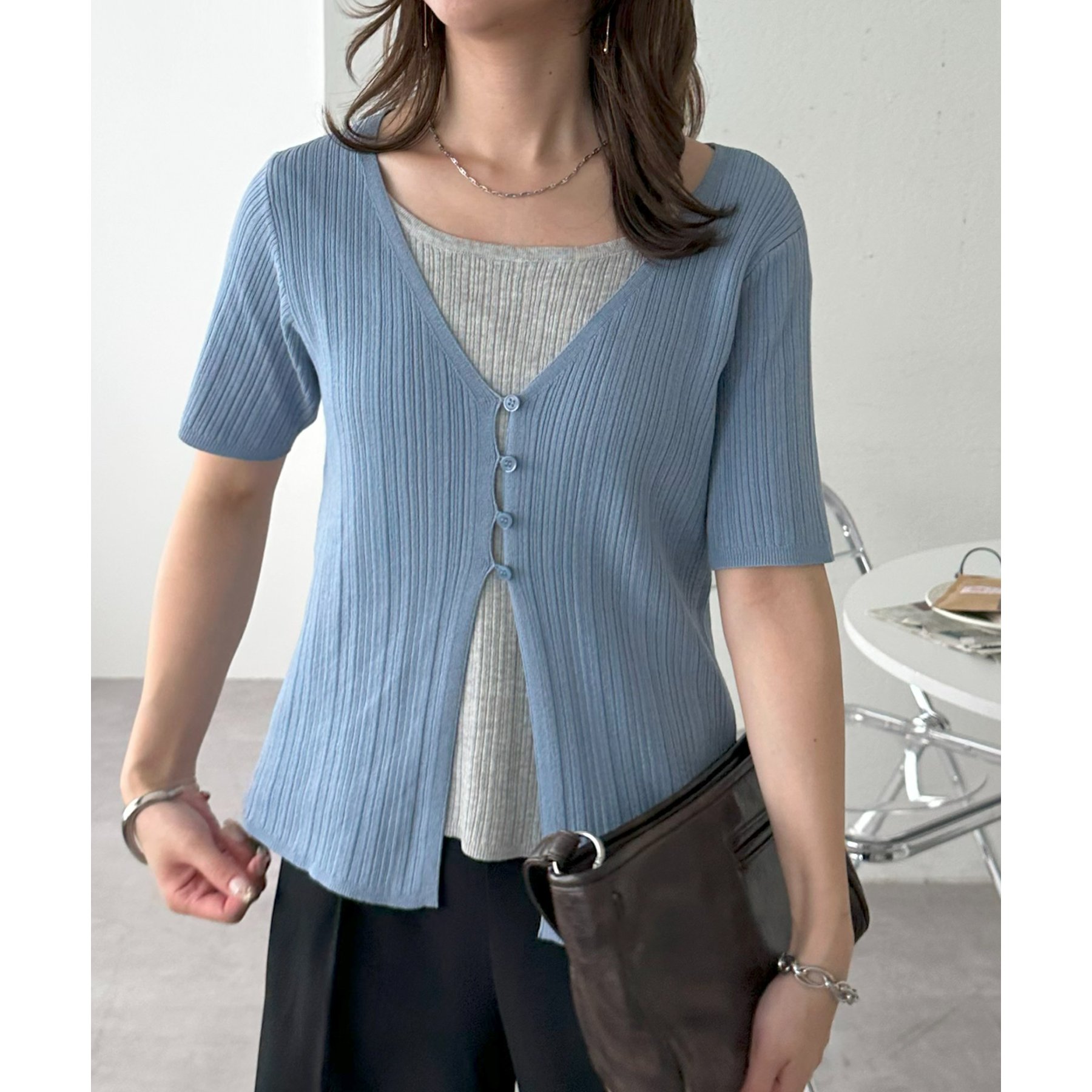 胸元に見えるインナーは実際には縫い付けられており、カットソー1枚で重ね着しているような見た目に。