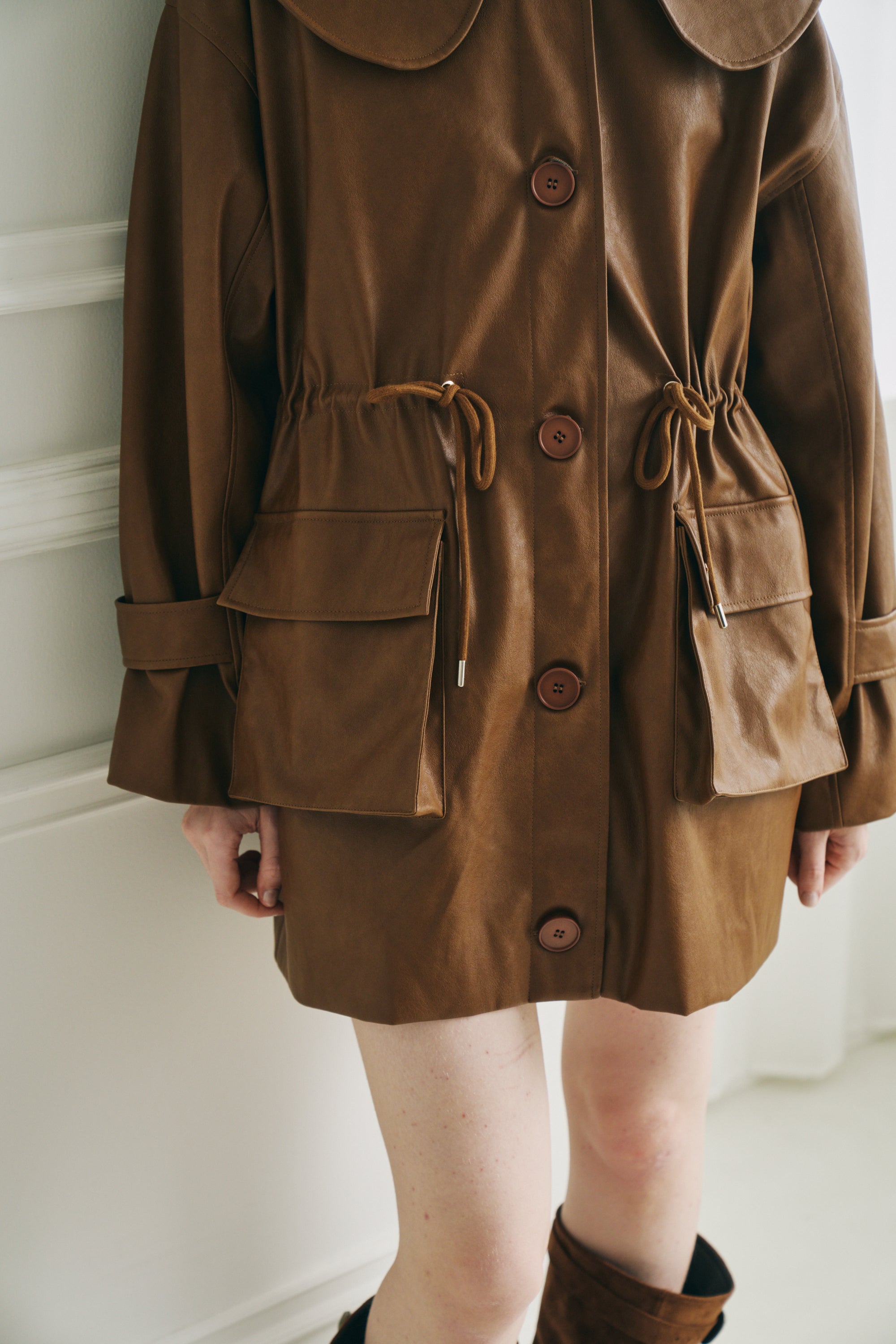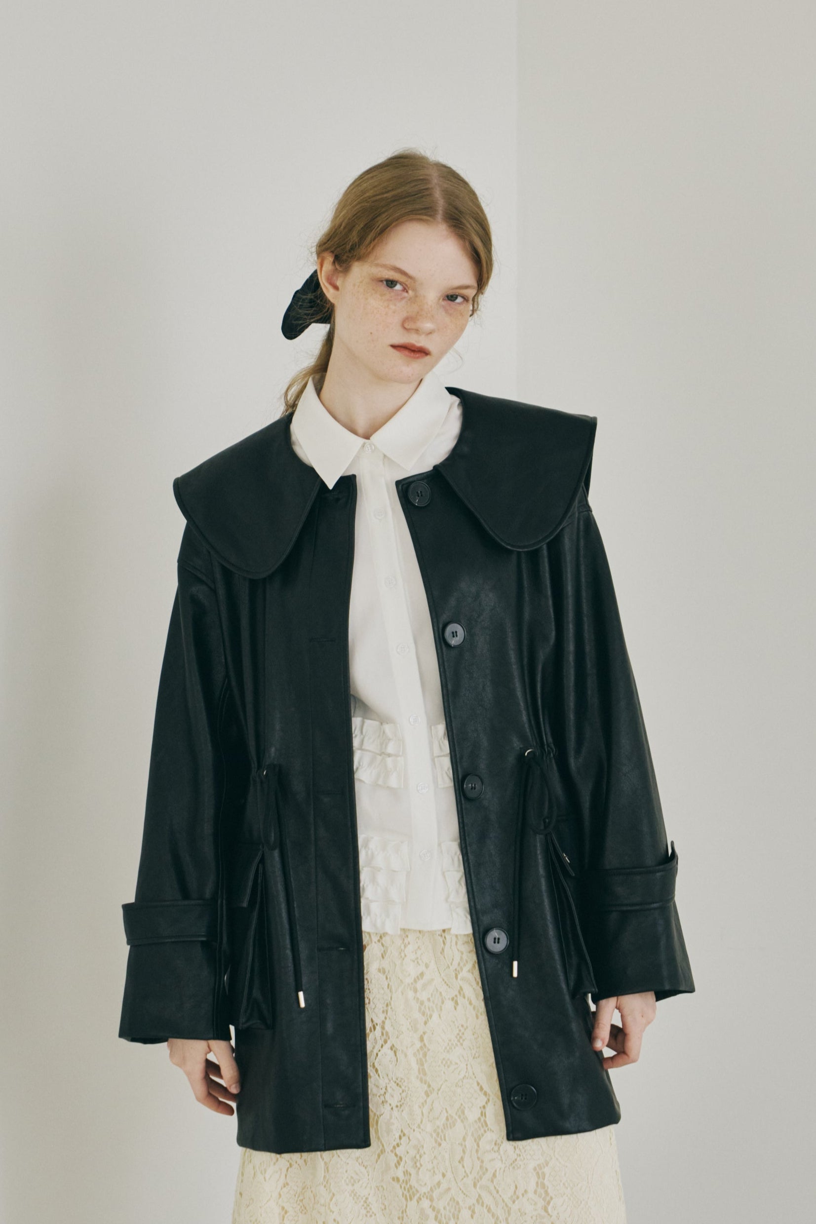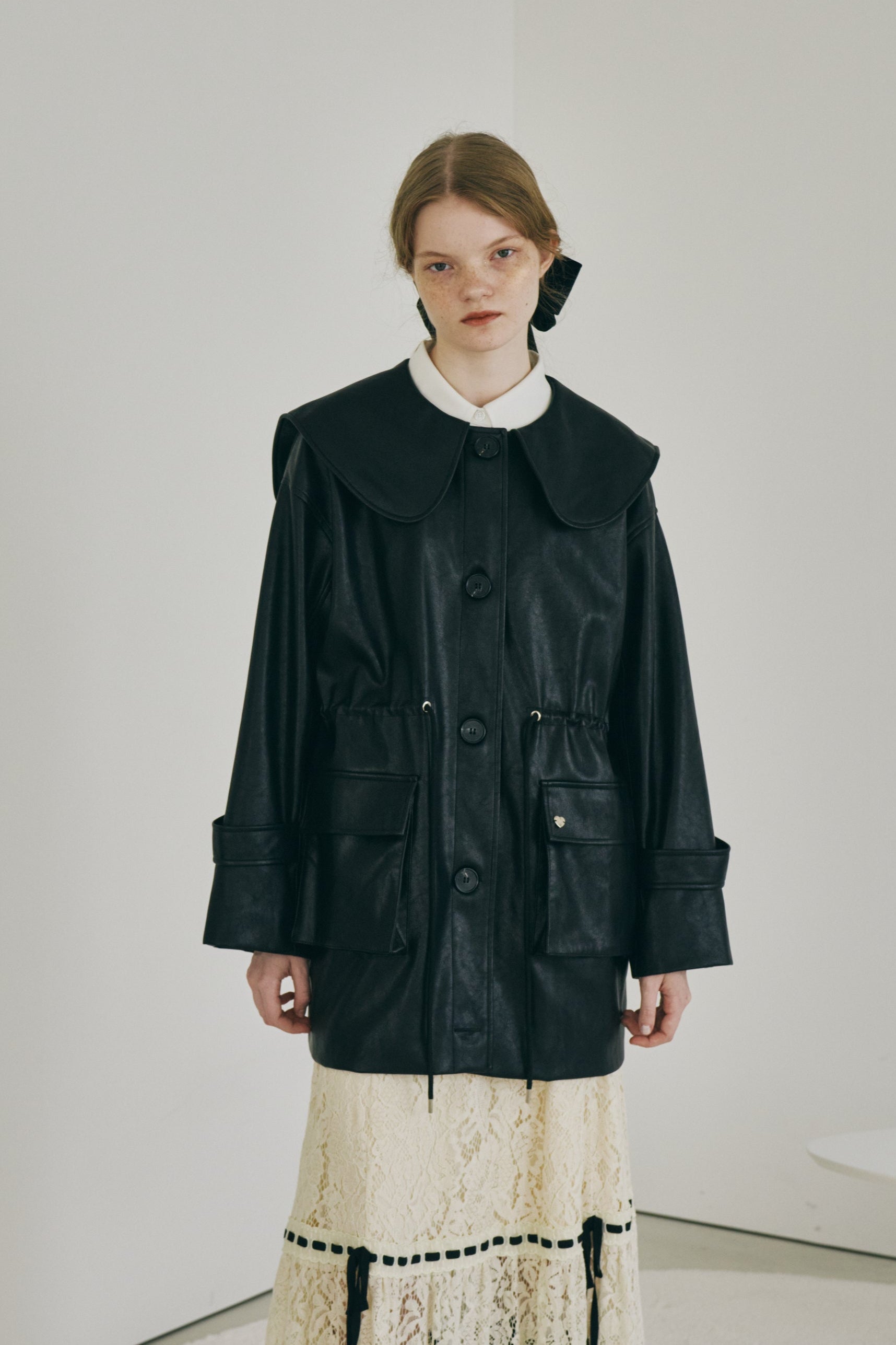 大きな衿が目を惹く、フェイクレザージャケット