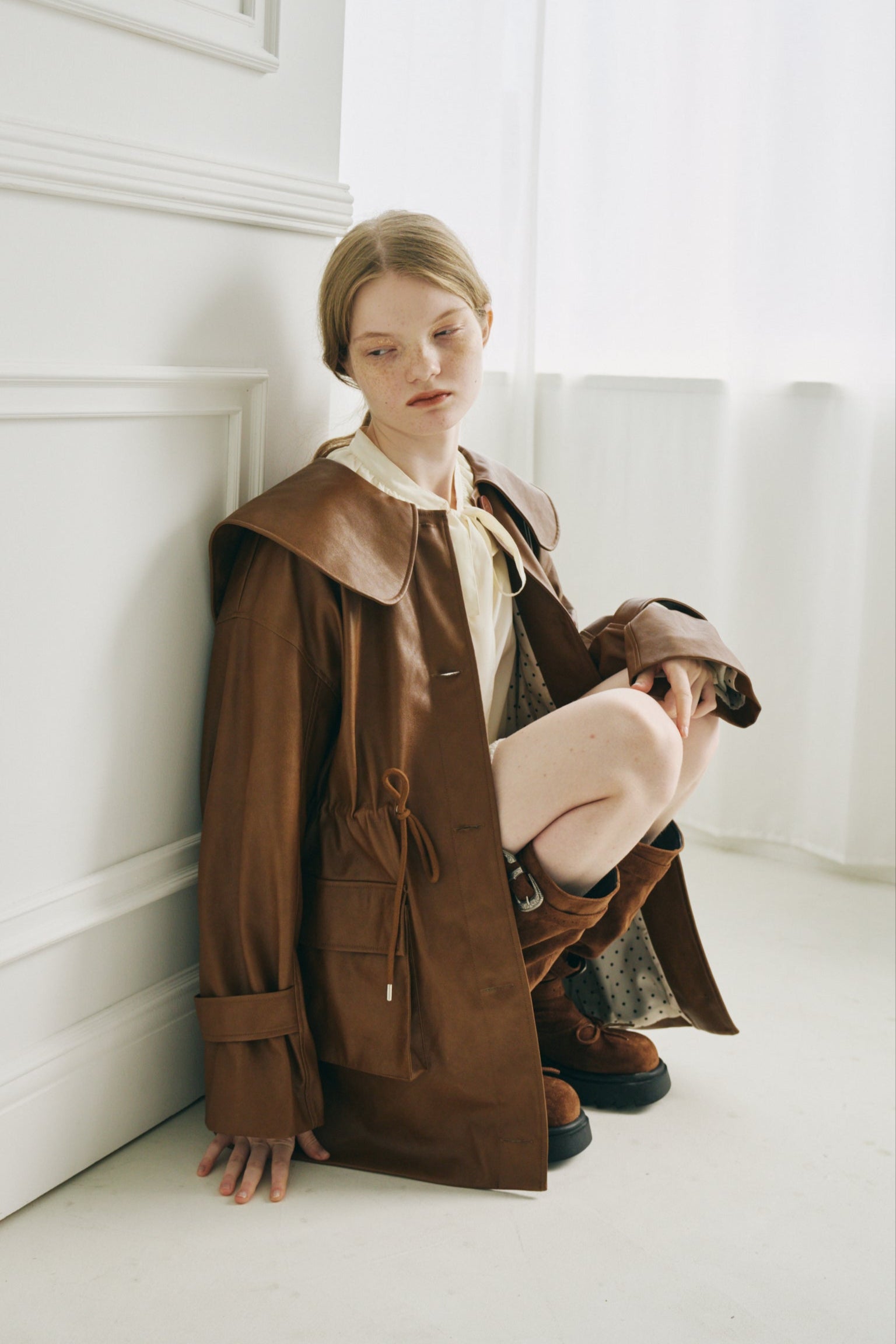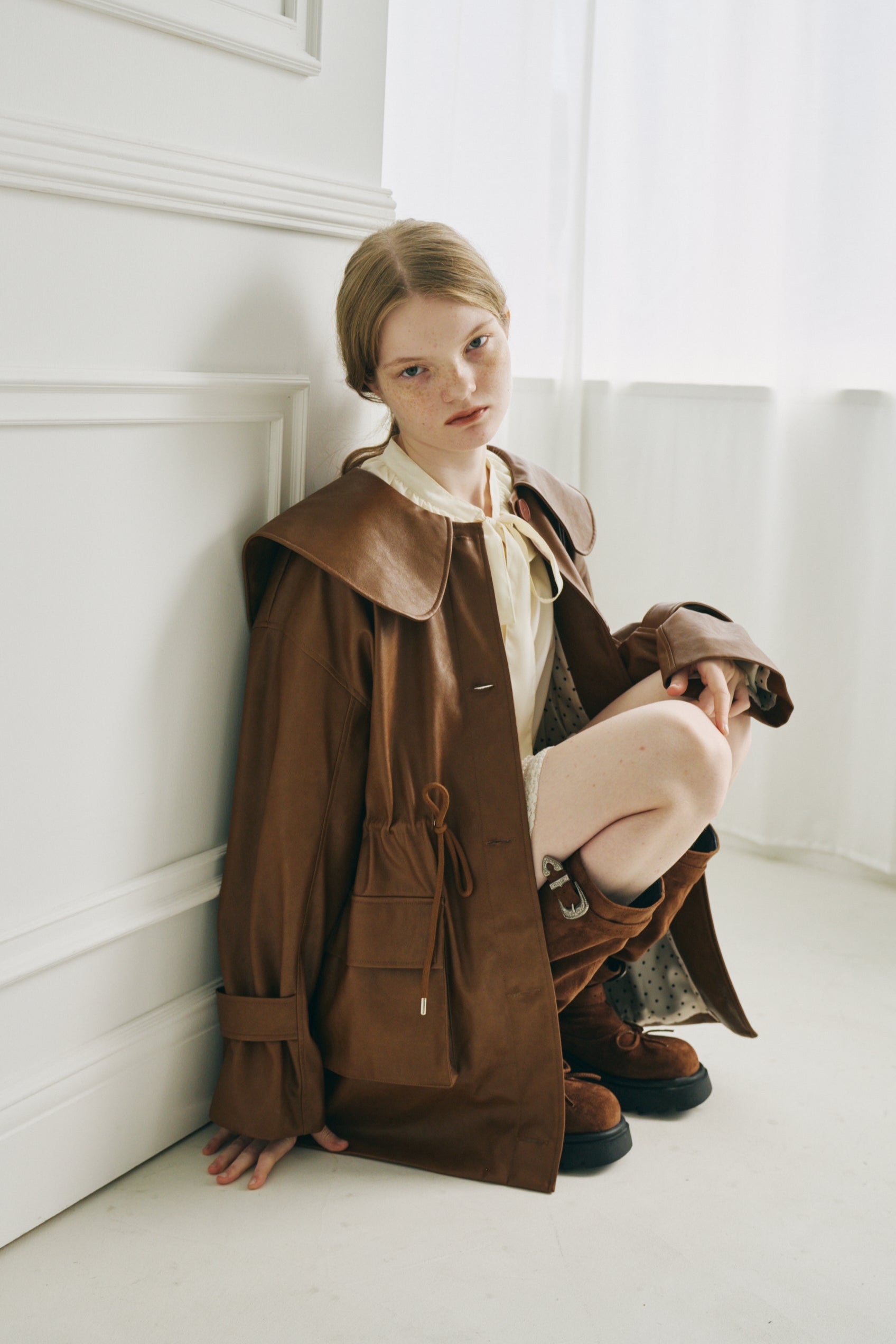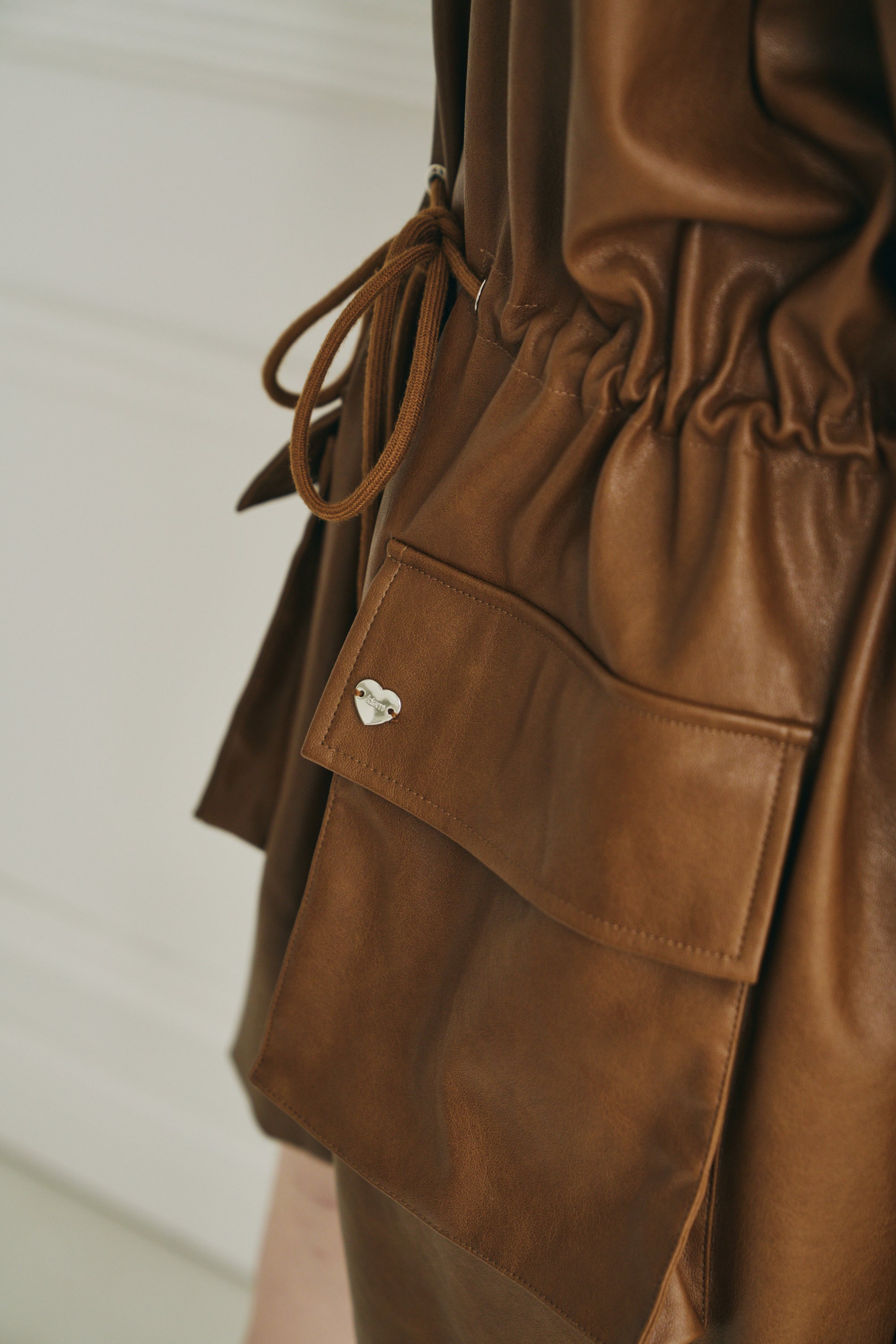 ウエストのドロスト紐を絞れば、女性らしいメリハリのあるシルエットに。