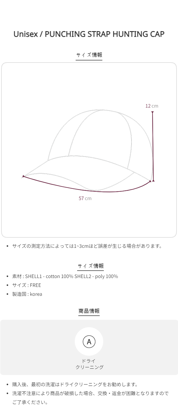 パンチングスウェード素材とスナップストラップがポイントのハンチングキャップです。ゆったりとしたフィット感を持ち、対照的な2つの素材を使用して配色切り替えラインを強調しました。ベルトストラップとマットなスナップボタンのディテールには、ウェスタンムードが感じられます。