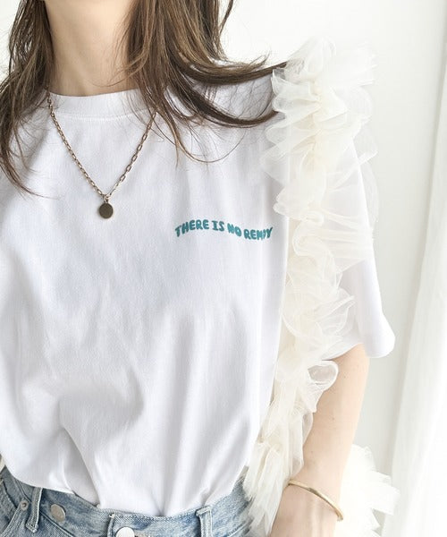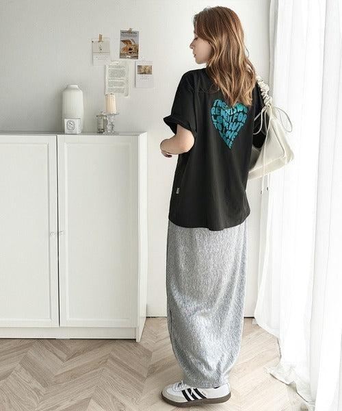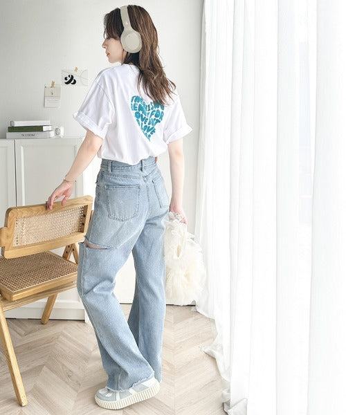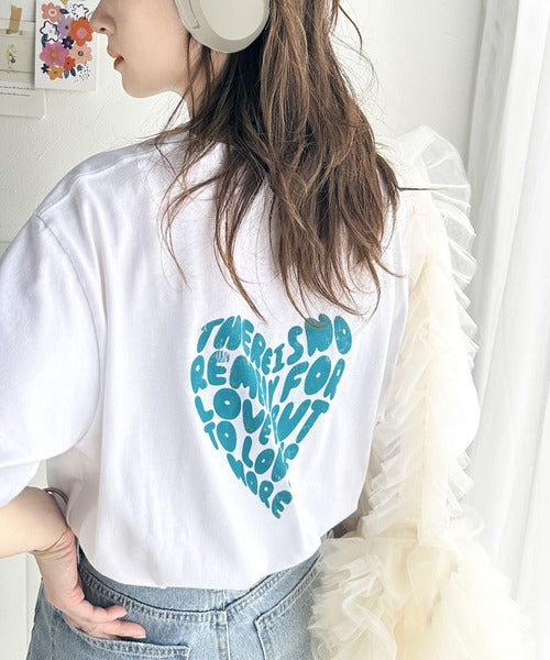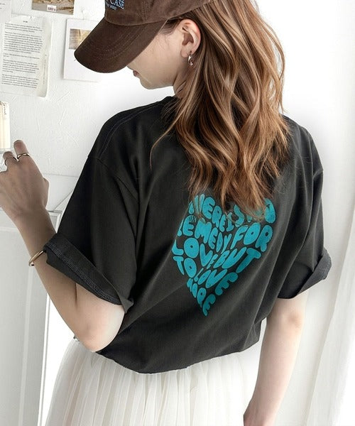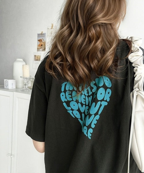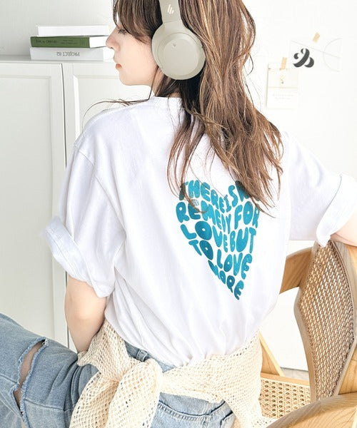 カジュアル可愛いが際立つ。綿100%バックハートロゴグラフィックプリントTシャツ mo1310046