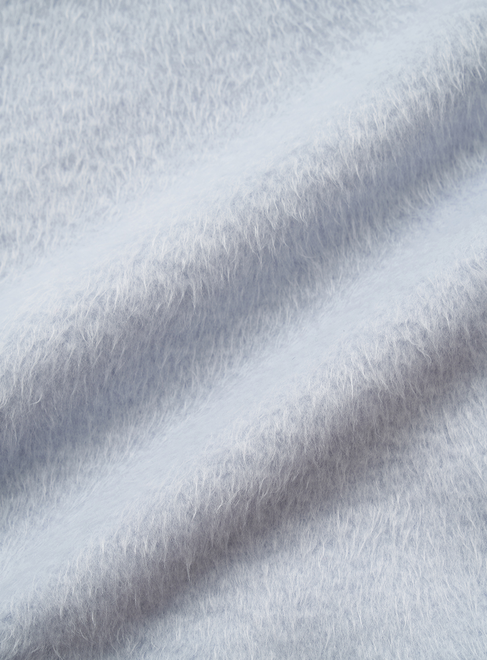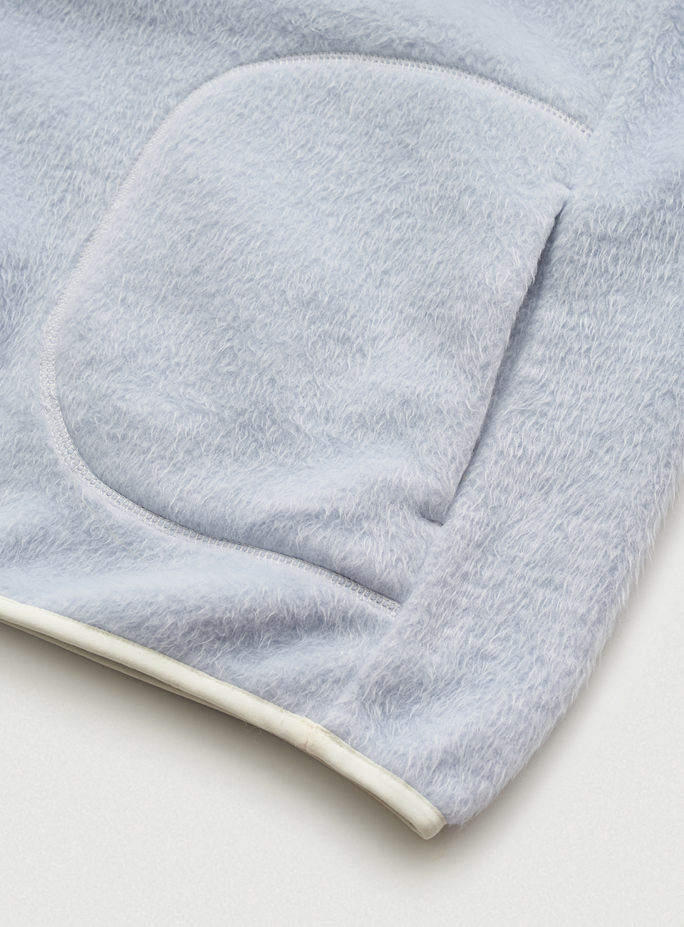 ライトブルーカラーで、柔らかくヘアリーなテクスチャーが特徴のフリースファブリック。